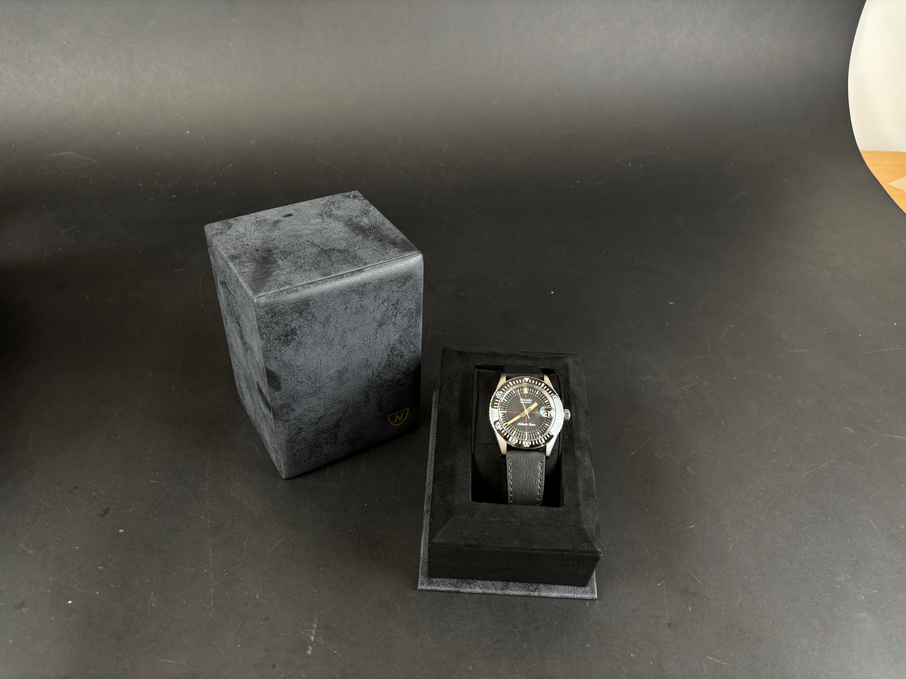 Presented in like-new condition, showing virtually no signs of wear. This modern re-edition of the historic Antarctic Diver is fitted with a black leather strap, offering a vintage-inspired look while remaining versatile for daily wear. Powered by an automatic movement and featuring a rotating dive bezel, date display at 3 o’clock, and robust stainless steel case, the watch delivers classic tool-watch charm with modern reliability. Complete with its original box, warranty card and accessories. A great opportunity to own a like-new example of this popular Nivada model, combining heritage design and contemporary build quality.