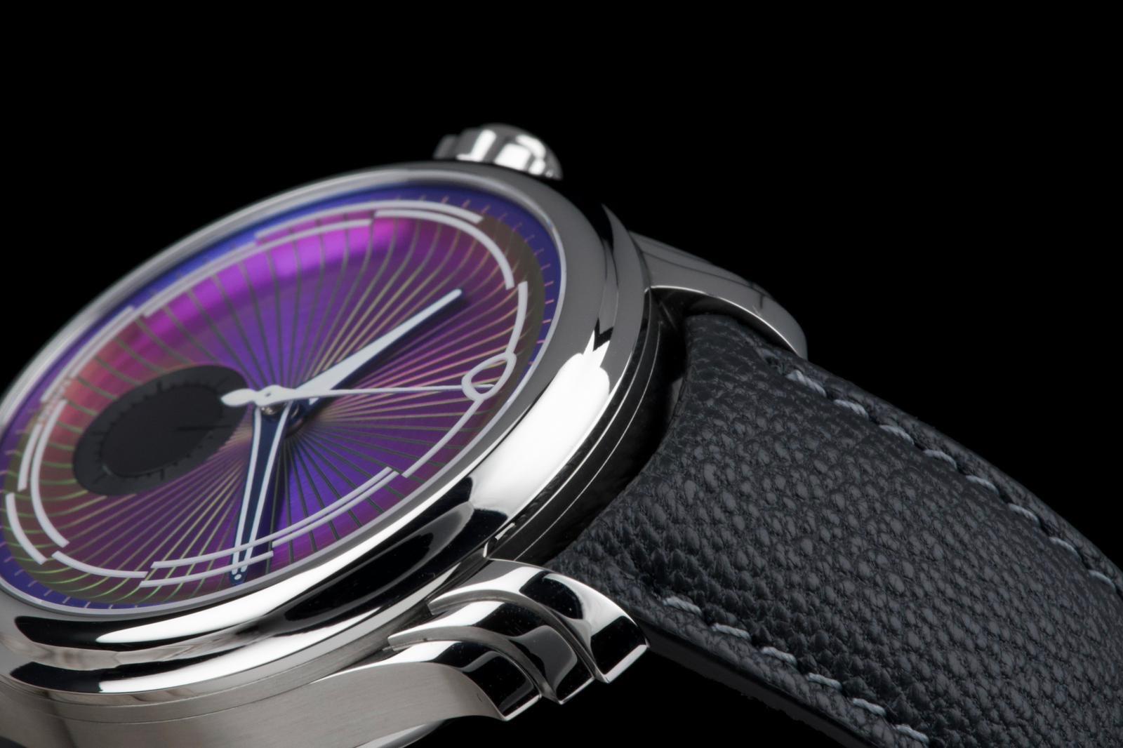 The present MING Iris is a striking and technically engaging example of the brand’s contemporary watchmaking philosophy, combining avant-garde design with classical chronograph mechanics. Conceived as a refined yet expressive monopusher chronograph, the Iris showcases MING’s distinctive approach to form, material, and light. Housed in a 40 mm stainless-steel case measuring just 11.85 mm in thickness and 47.8 mm lug-to-lug, the watch offers elegant proportions and excellent wearability. The 316L steel case features MING’s signature three-step lugs and a carefully executed polished and brushed finish. Both the front and rear sapphire crystals are fitted with double-sided anti-reflective coating, while the top crystal is laser-cut with indices filled with MING Polar White, creating a subtle yet highly legible display. The case is water-resistant to 100 meters and fitted with a 20 mm lug width. The metallic deep-dish dial is finished with a multiphasic colour-shift coating, producing remarkable depth and dynamic visual effects as the light changes. Diamond-cut hands, coated in blue and filled with Super-LumiNova X1, ensure clarity and contrast, while the chronograph minute counter disc is executed in a sandwich construction, also luminous, reinforcing the technical and functional character of the watch. Powering the Iris is the manually wound Sellita for MING calibre SW562.M1, offering approximately 60 hours of power reserve when fully wound. The movement features an anthracite mainplate contrasted by a 4N-coloured three-quarter plate, visible through the sapphire caseback and finished to reflect MING’s contemporary aesthetic. The watch is delivered with both the stainless-steel Universal Bracelet and an anthracite goat leather strap, fitted with MING’s stainless-steel tuck buckle, offering versatility between a more technical or understated look. Combining a monopusher chronograph, refined manual-wind mechanics, and MING’s unmistakable design language, the Iris stands as a compelling expression of modern independent watchmaking—distinctive, thoughtfully engineered, and visually captivating.