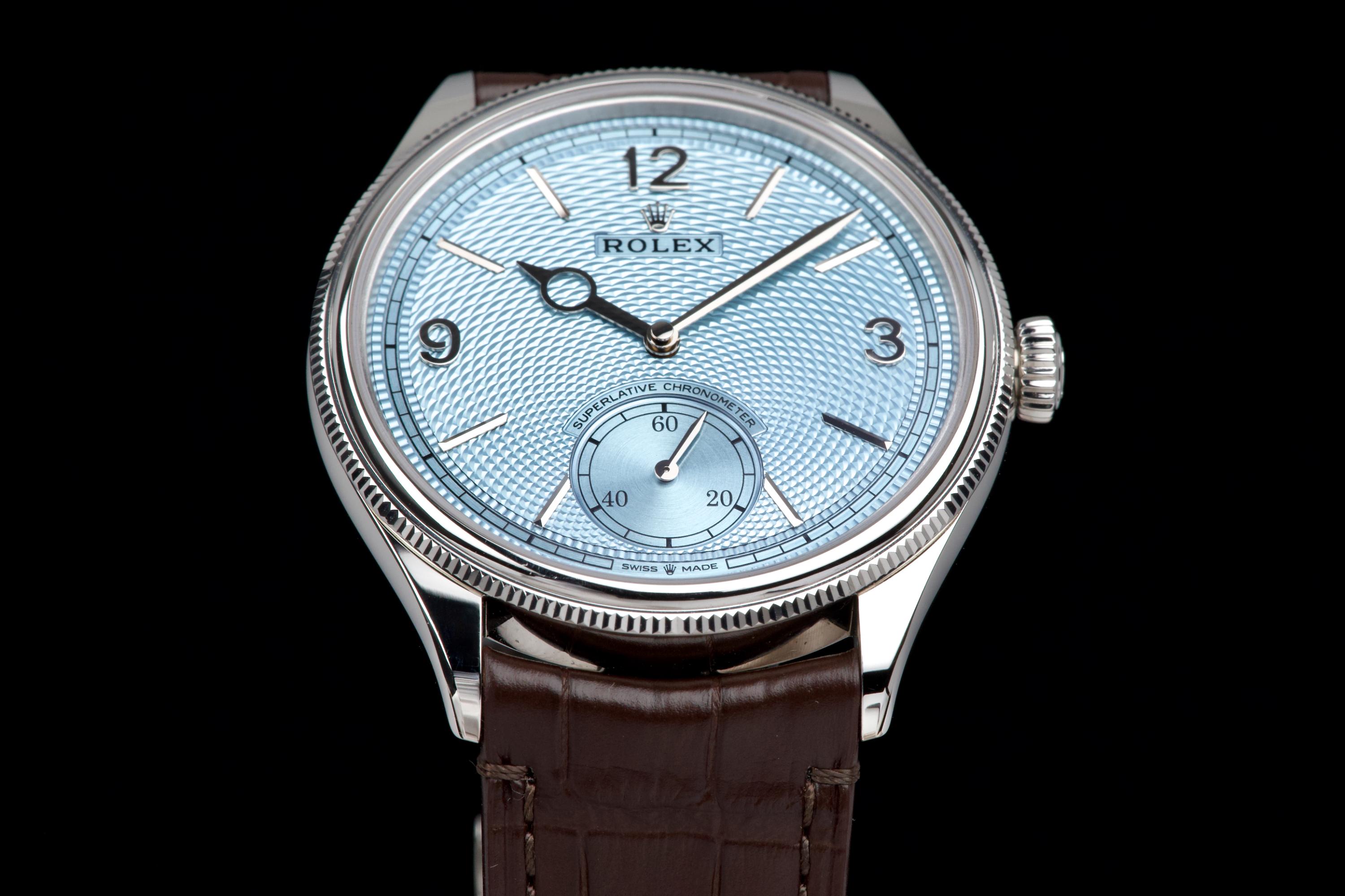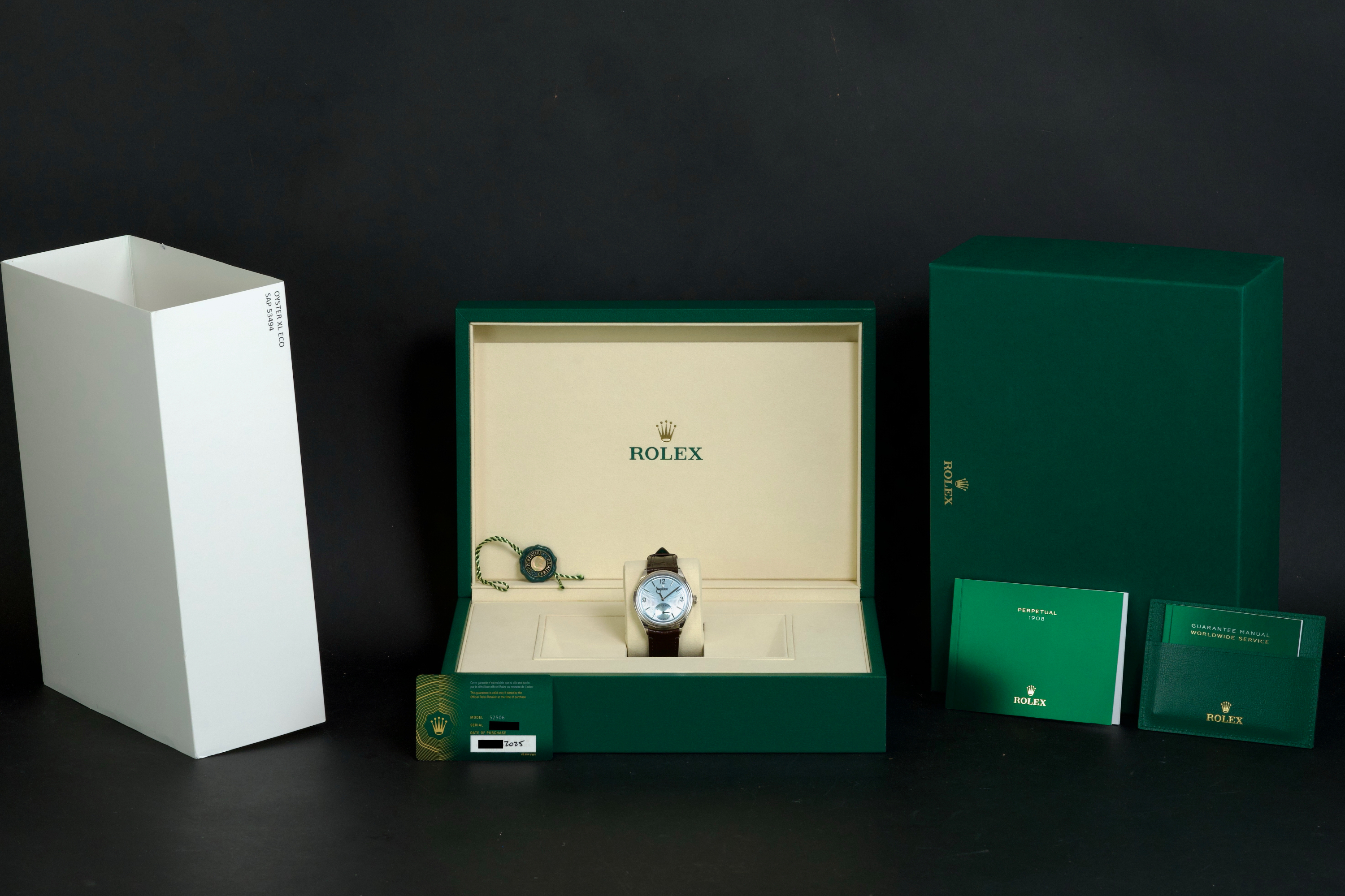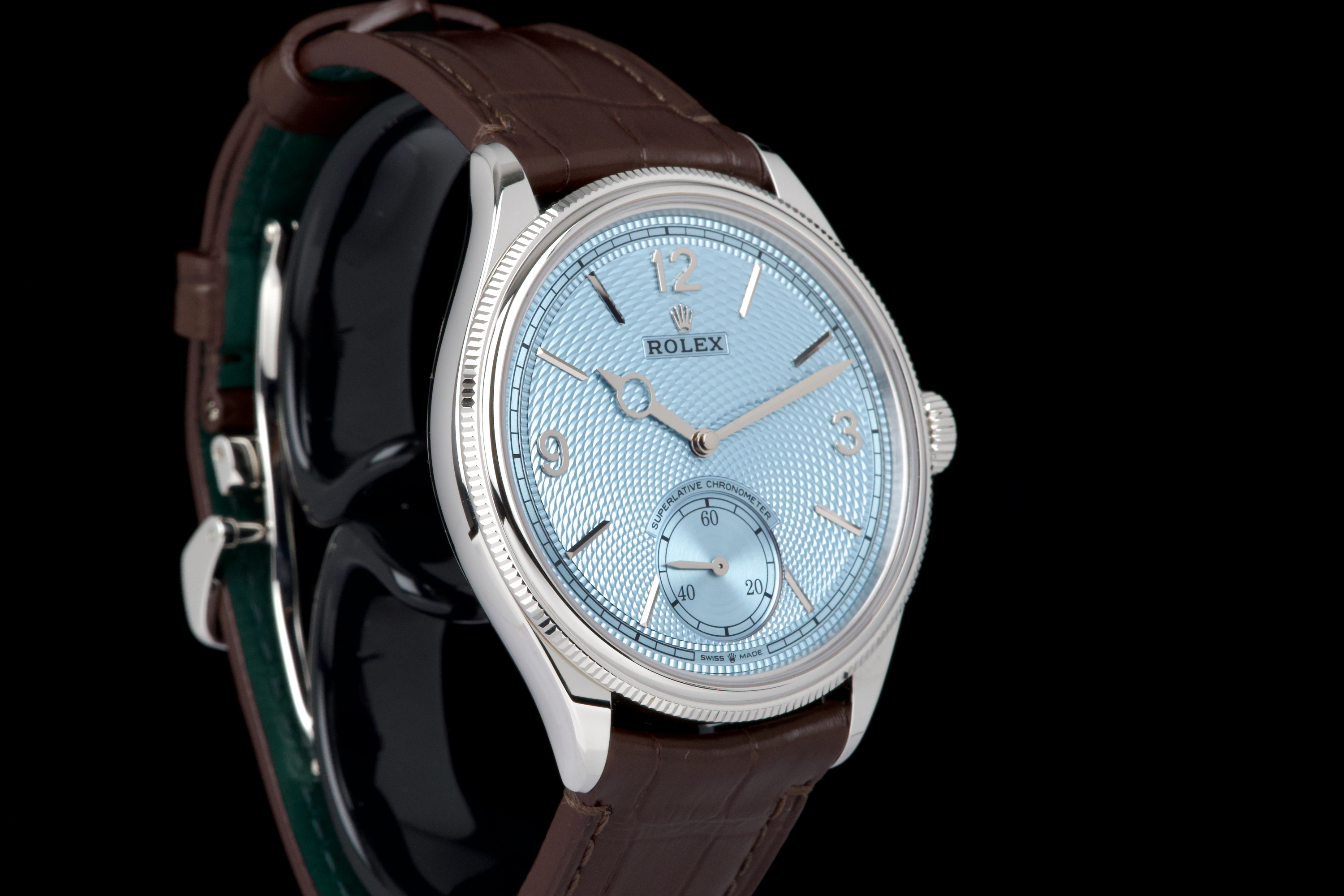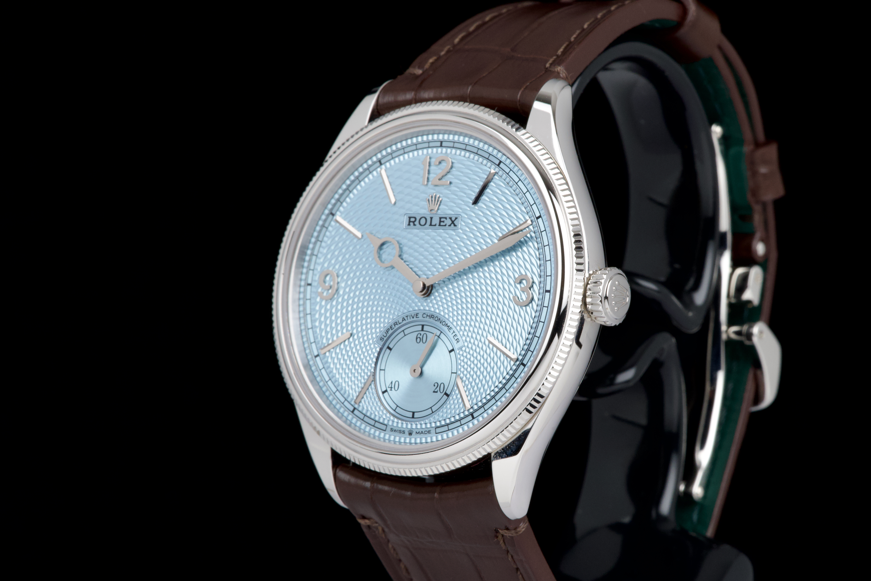 A stunning example of Rolex’s modern dress watch, crafted in 950 platinum and featuring the exclusive ice-blue dial reserved for platinum models. This watch is presented in mint condition, showing virtually no signs of wear. Measuring 39 mm in diameter, the 1908 features a slim case with transparent sapphire caseback revealing the automatic caliber 7140, boasting Rolex’s Chronergy escapement and an impressive 66-hour power reserve. Complete with its original box, warranty card, booklets, and accessories. An elegant and highly desirable modern Rolex reference, combining discreet luxury with the exclusivity of platinum and the signature ice-blue dial.