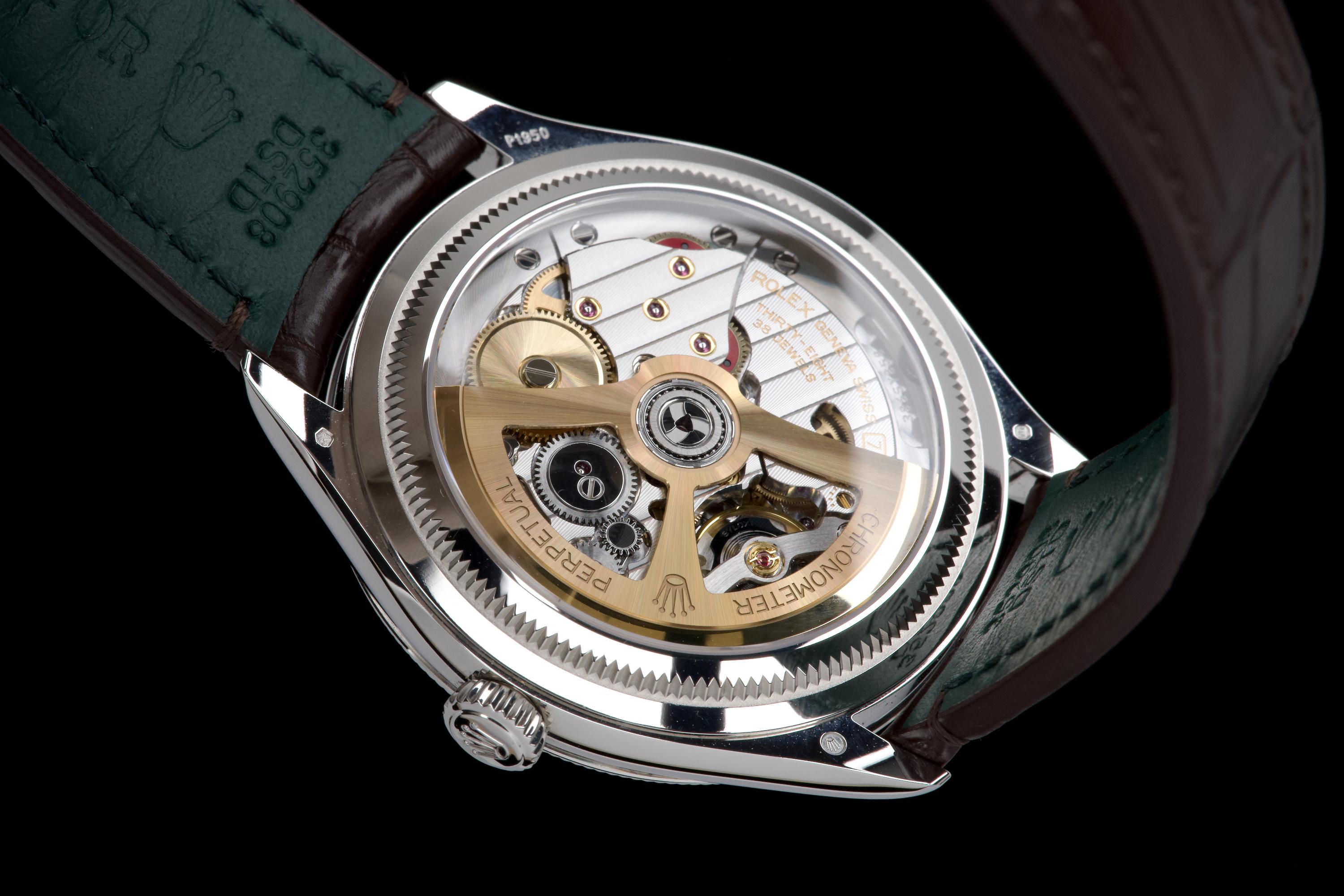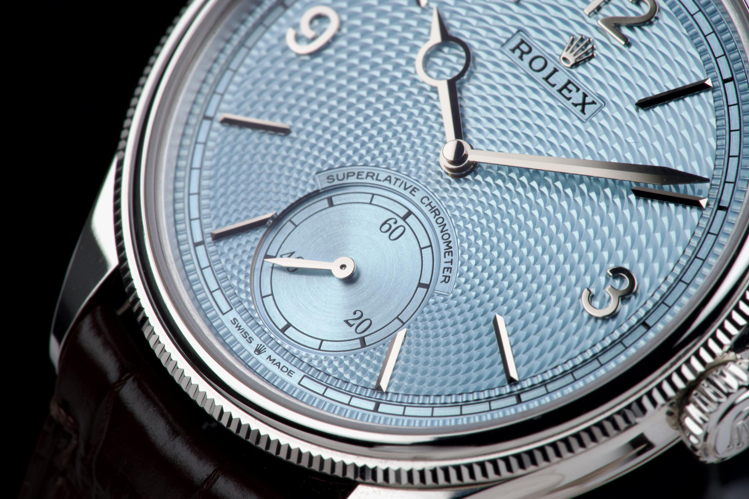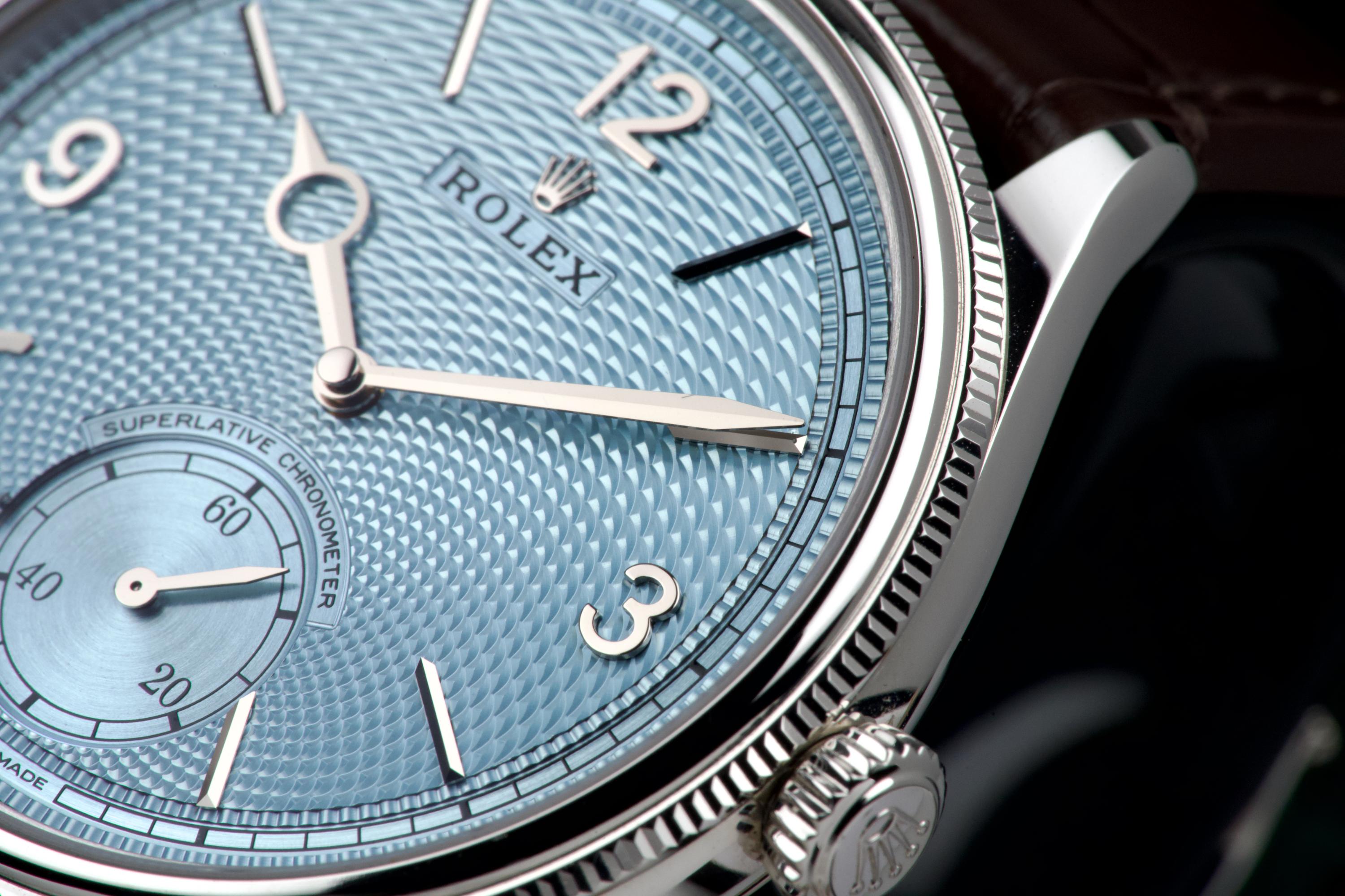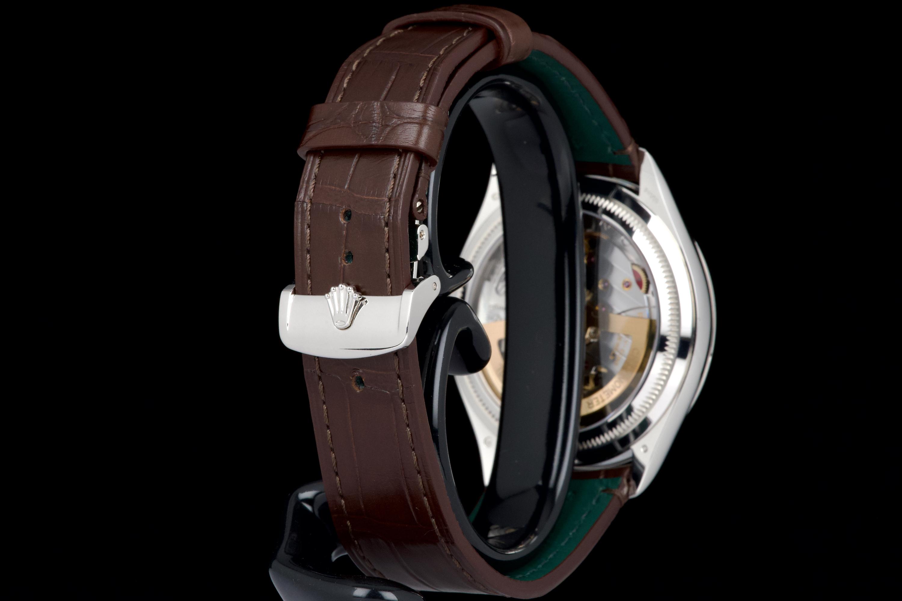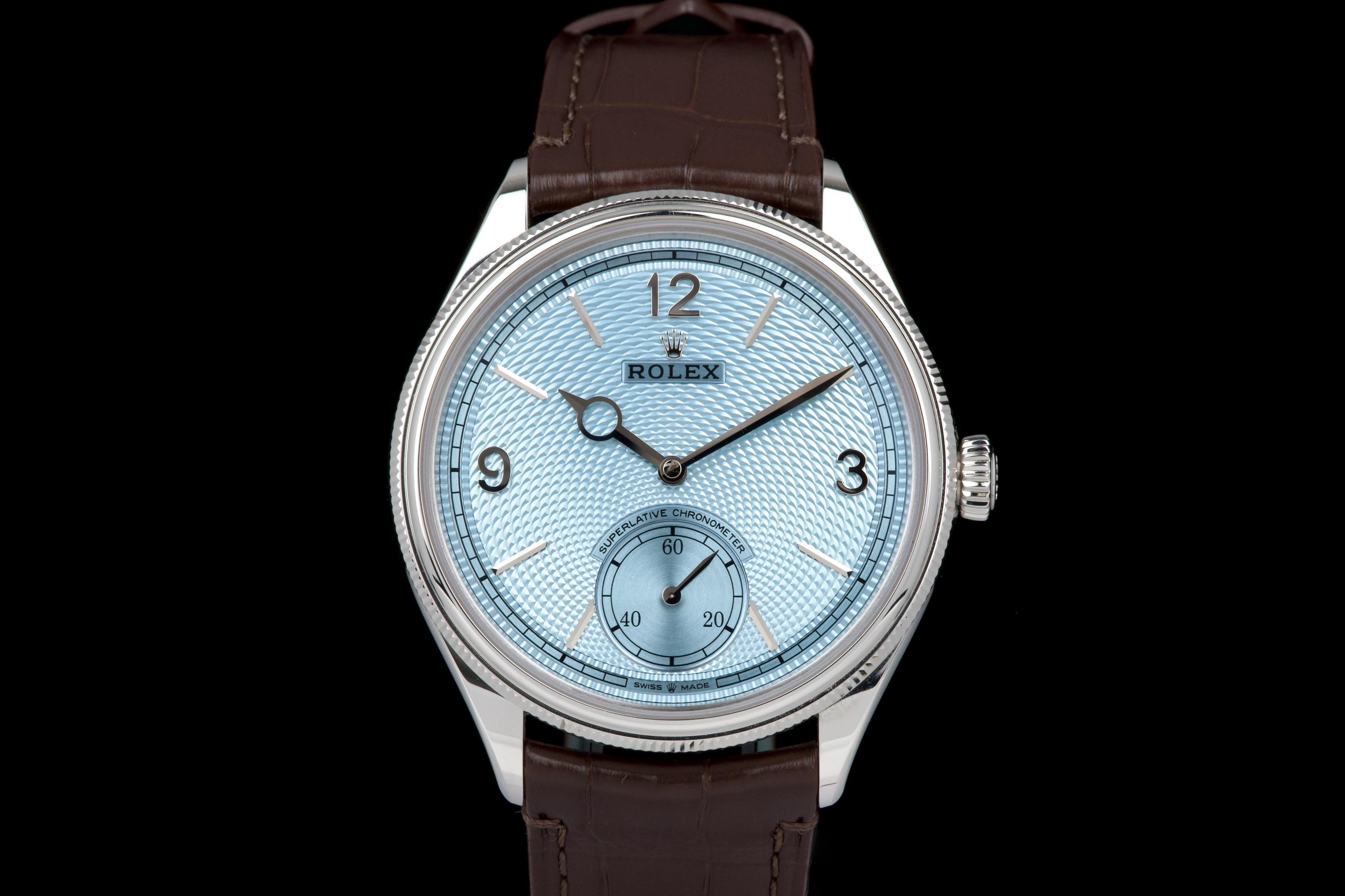 A stunning example of Rolex’s modern dress watch, crafted in 950 platinum and featuring the exclusive ice-blue dial reserved for platinum models. This watch is presented in mint condition, showing virtually no signs of wear. Measuring 39 mm in diameter, the 1908 features a slim case with transparent sapphire caseback revealing the automatic caliber 7140, boasting Rolex’s Chronergy escapement and an impressive 66-hour power reserve. Complete with its original box, warranty card, booklets, and accessories. An elegant and highly desirable modern Rolex reference, combining discreet luxury with the exclusivity of platinum and the signature ice-blue dial.