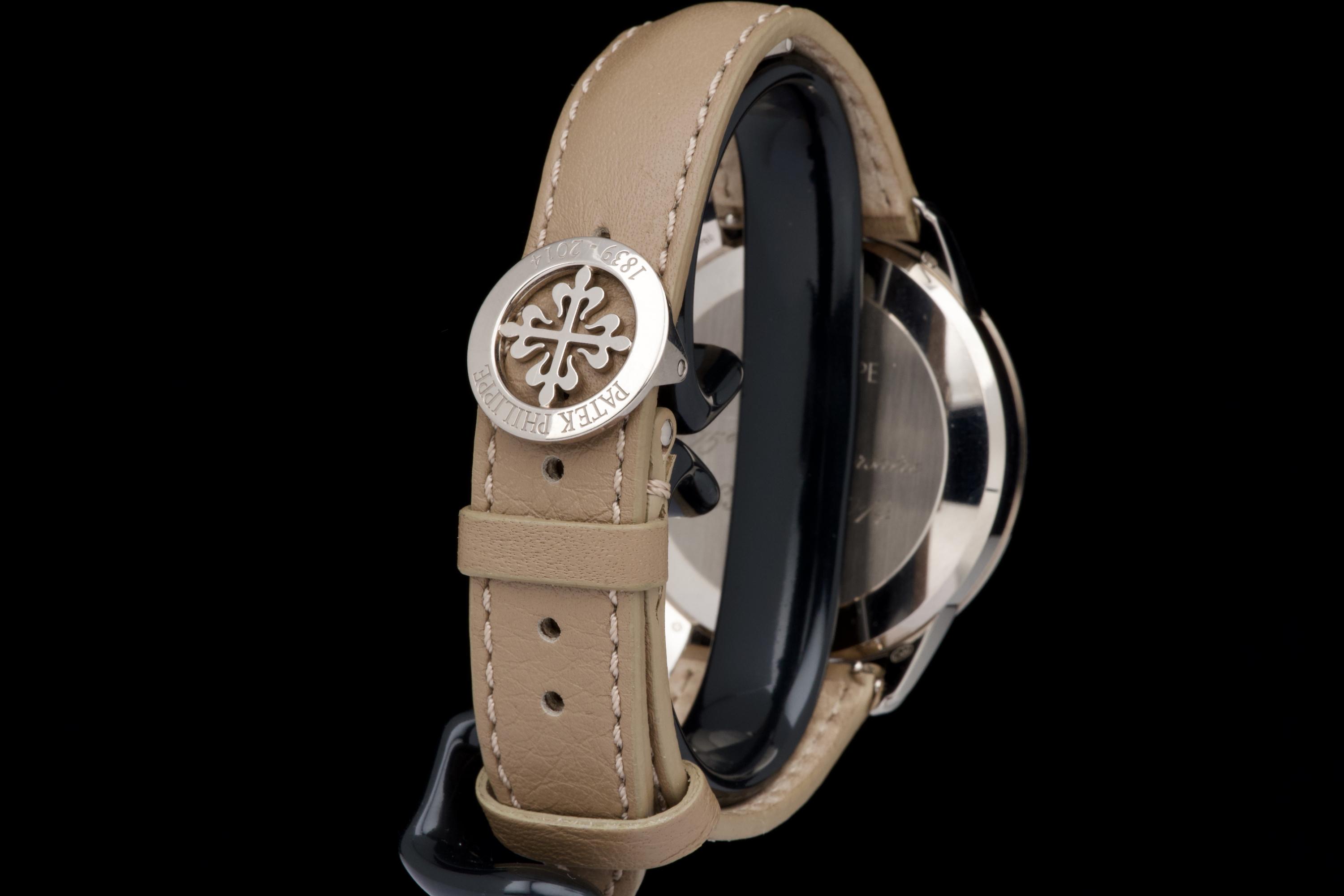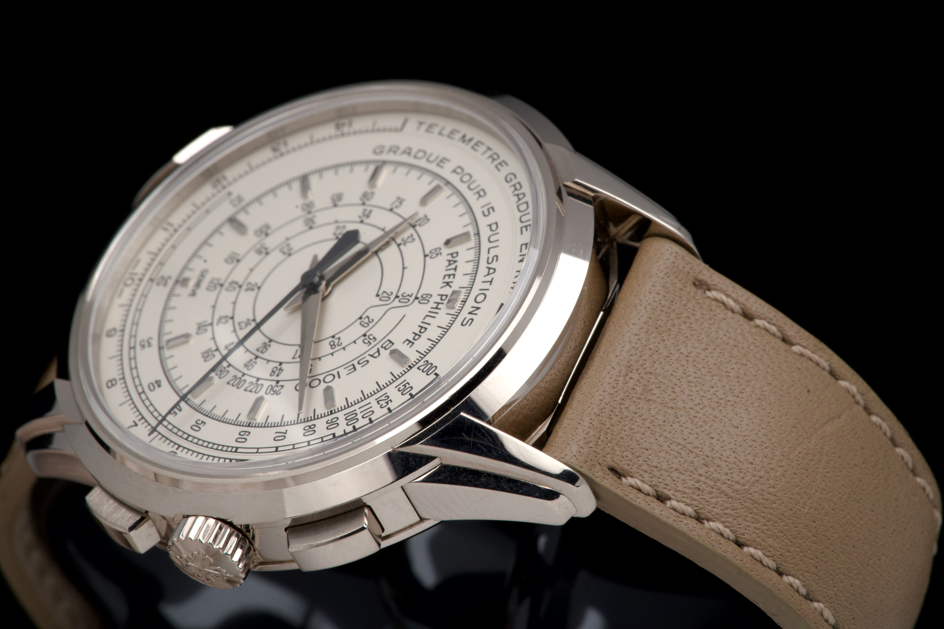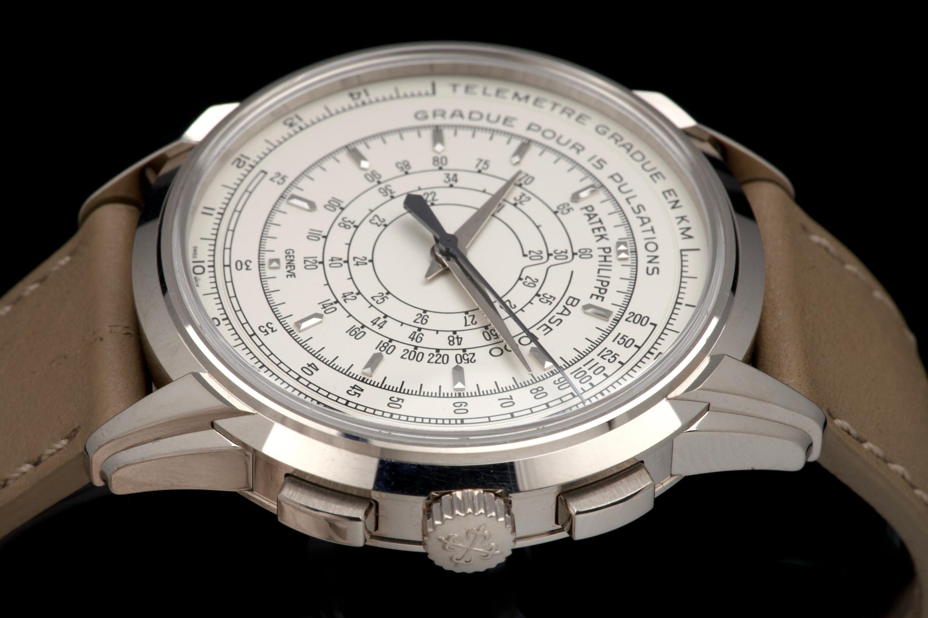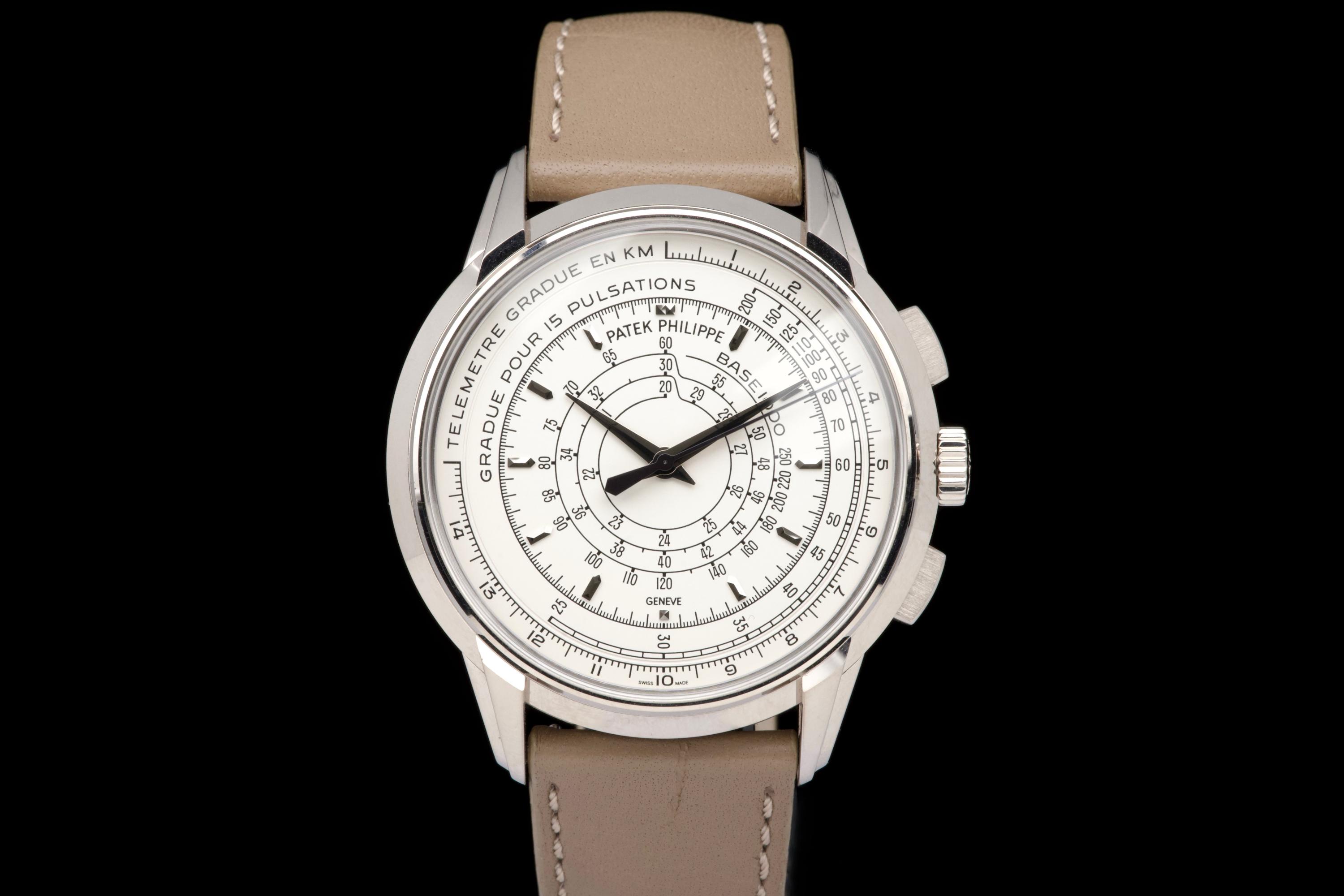 A beautiful example of the highly collectible Patek Philippe 5975G, released in 2014 to commemorate the brand’s 175th anniversary. This limited-edition multi-scale chronograph is offered here as a full set, originally sold in Los Angeles in 2014. The white-gold case remains unpolished, preserving its original factory lines. It shows normal signs of wear consistent with a watch from 2014, with no major marks. The iconic multi-scale dial is in excellent condition, perfectly preserved, and the watch retains its original Patek Philippe white-gold deployant clasp, paired with a high-quality non-Patek taupe calfskin strap. There is no service history, but the movement has been fully checked and validated by our watchmaker, running perfectly. A rare and historically significant Patek Philippe anniversary reference, offered here in very good overall condition with its complete set.