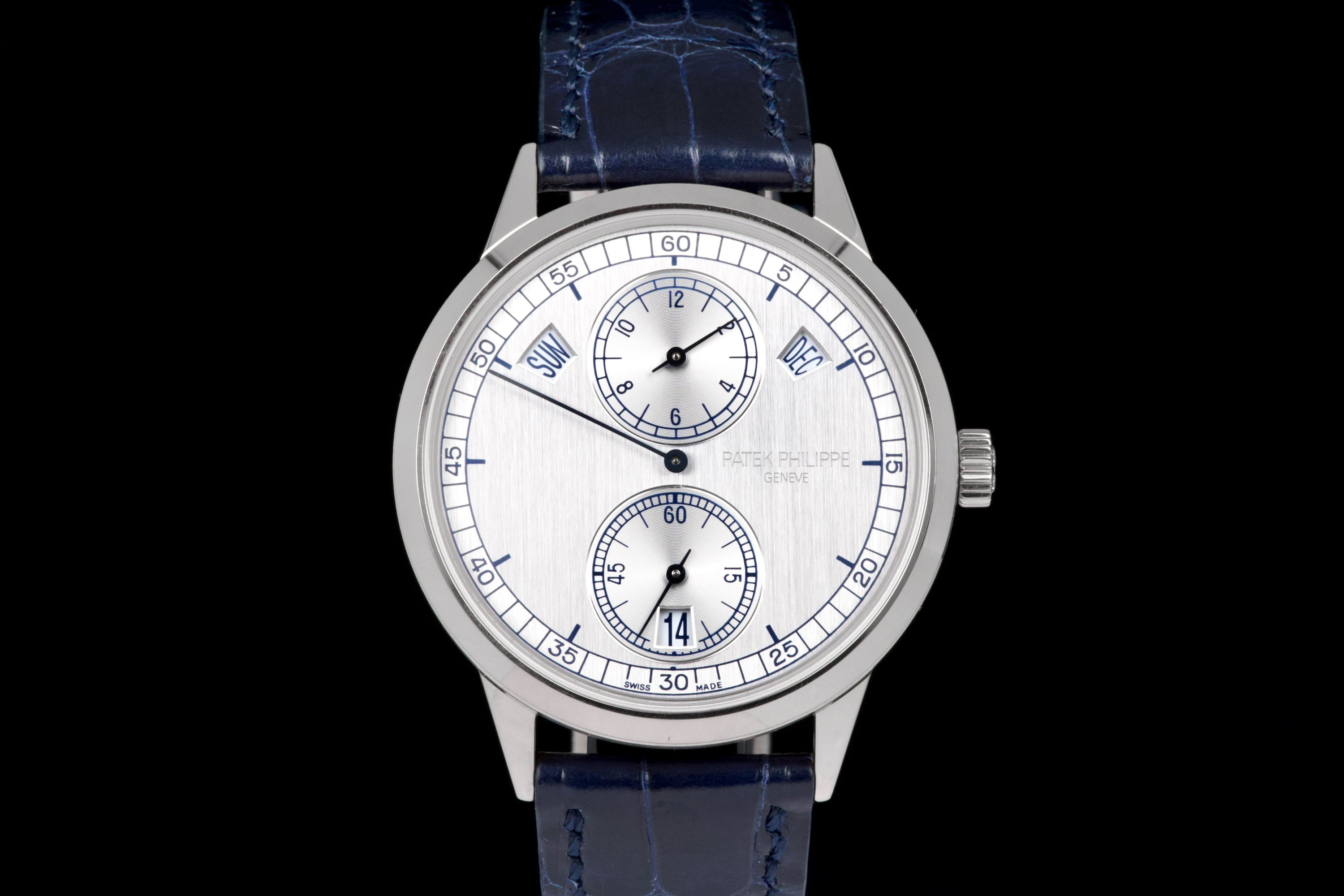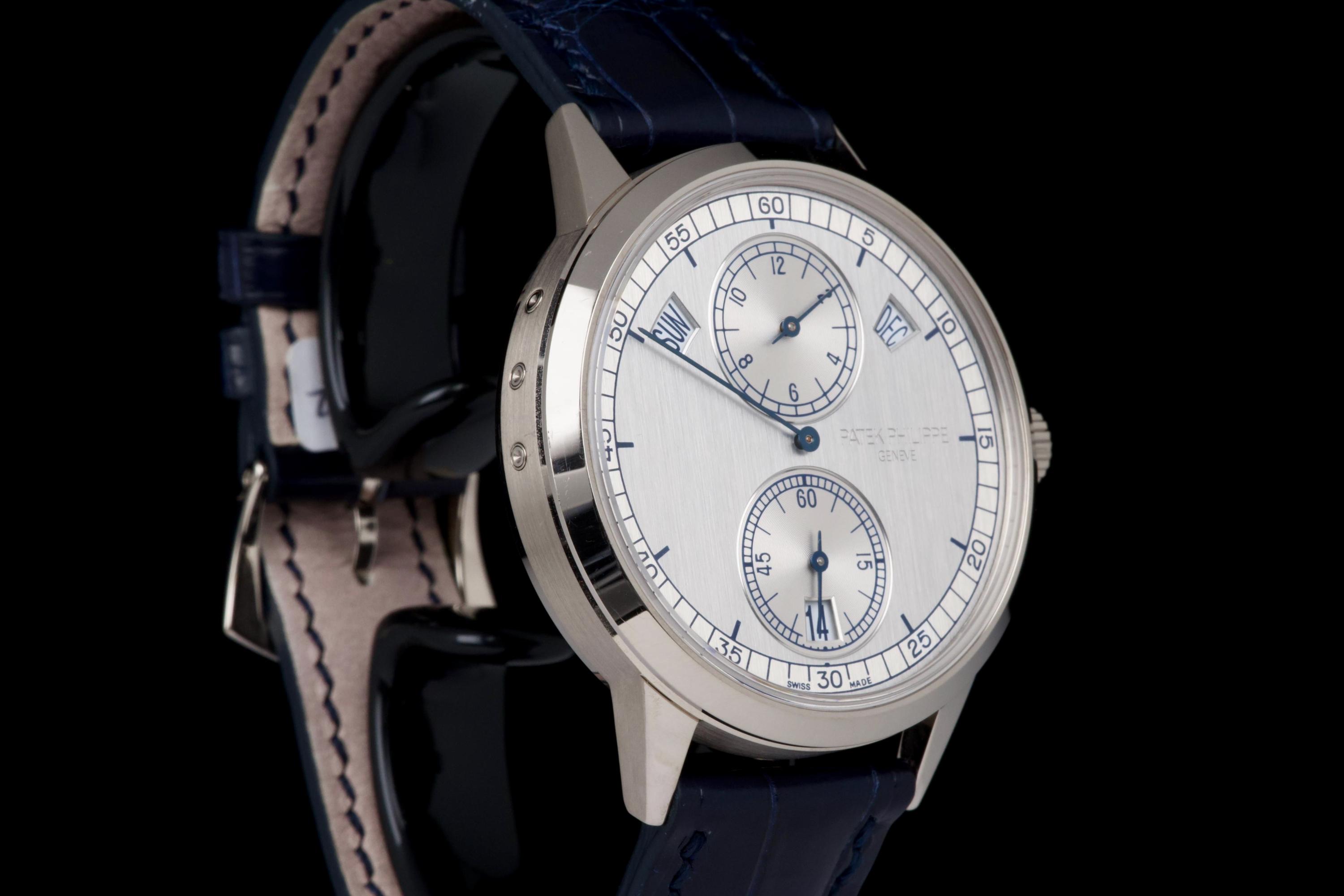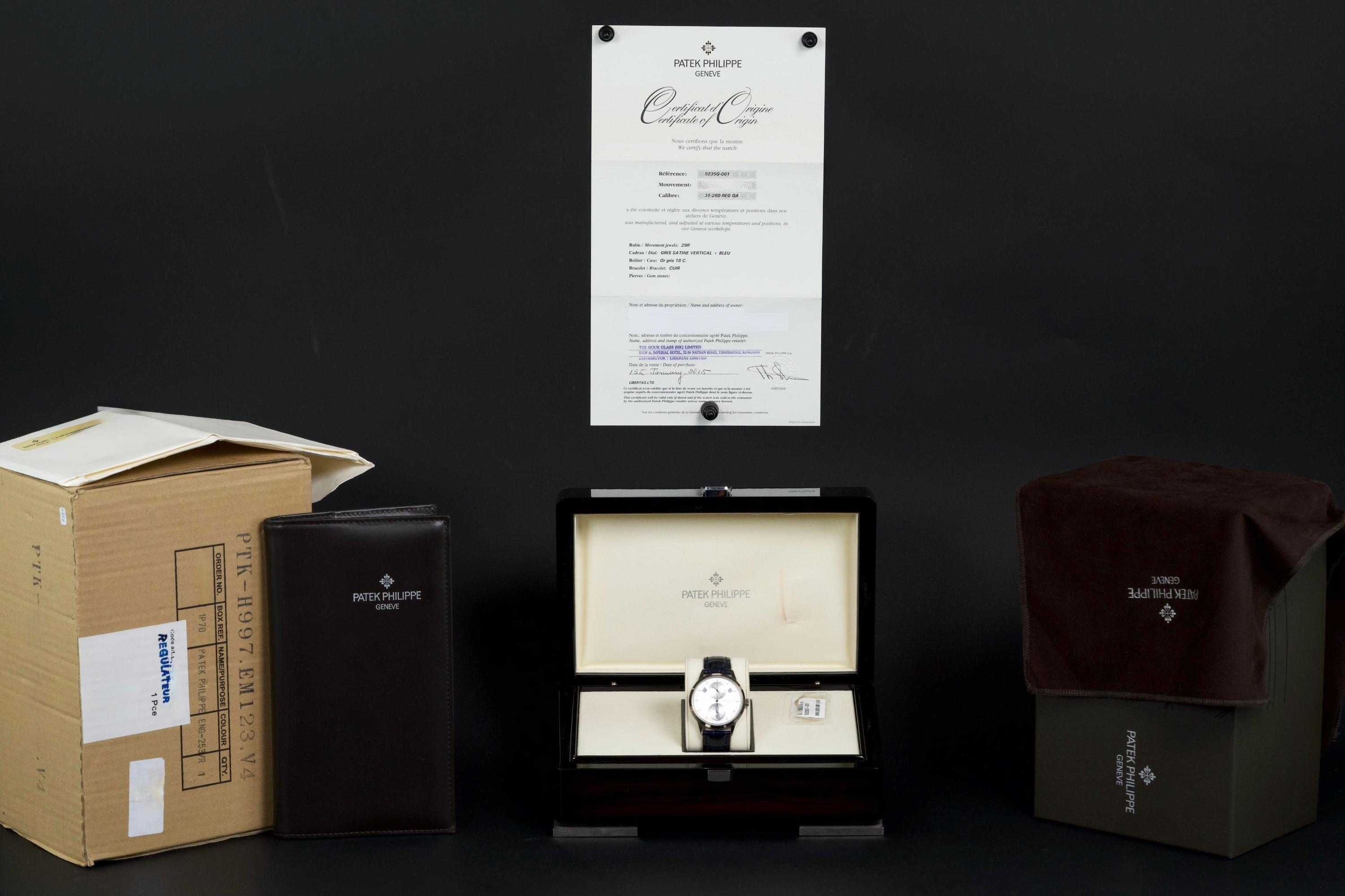 The present Patek Philippe Annual Calendar Regulator reference 5235G, offered here as a complete full set and dating to 2015, is a technically innovative and visually distinctive example of the manufacture’s modern high watchmaking. Originally sold new in Hong Kong in 2015, this watch represents Patek Philippe’s contemporary reinterpretation of the traditional regulator display, combined with an annual calendar complication. Housed in a white-gold case measuring 40.5 mm in diameter, the watch offers a modern yet elegant presence on the wrist. The case appears to have been lightly polished once in the past and is preserved in excellent overall condition, with the bezel remaining nicely flat and well defined. The overall proportions and finishing remain crisp and well balanced. The dial is one of the defining elements of the reference, executed in a vertical satin-finished silver-grey tone with applied white-gold indexes. It features a regulator layout, with separate indications for hours, minutes, and seconds, lending the watch a technical and architectural appearance. The annual calendar indications for day and month are displayed through apertures at 10 and 2 o’clock, with a discreet date indication at 6 o’clock, creating a harmonious and highly legible composition. Powering the watch is the Patek Philippe calibre 31-260 REG QA, an automatic movement developed specifically for this model. Notable for its use of a micro-rotor in 22K gold and advanced construction, the movement incorporates modern technical solutions while maintaining traditional finishing standards. It offers the practicality of an annual calendar, requiring correction only once per year at the end of February. While no service history accompanies the watch, it is running well at the time of cataloguing. The watch is fitted with a blue Patek Philippe alligator leather strap in like-new condition, secured by its original white-gold Patek Philippe ardillon buckle. It is delivered with the set as shown in the accompanying photographs. Combining contemporary design, technical innovation, and refined execution, this Annual Calendar Regulator 5235G represents a compelling opportunity to acquire a distinctive modern Patek Philippe with strong visual identity and practical complication, presented in excellent overall condition and complete with its original accessories.