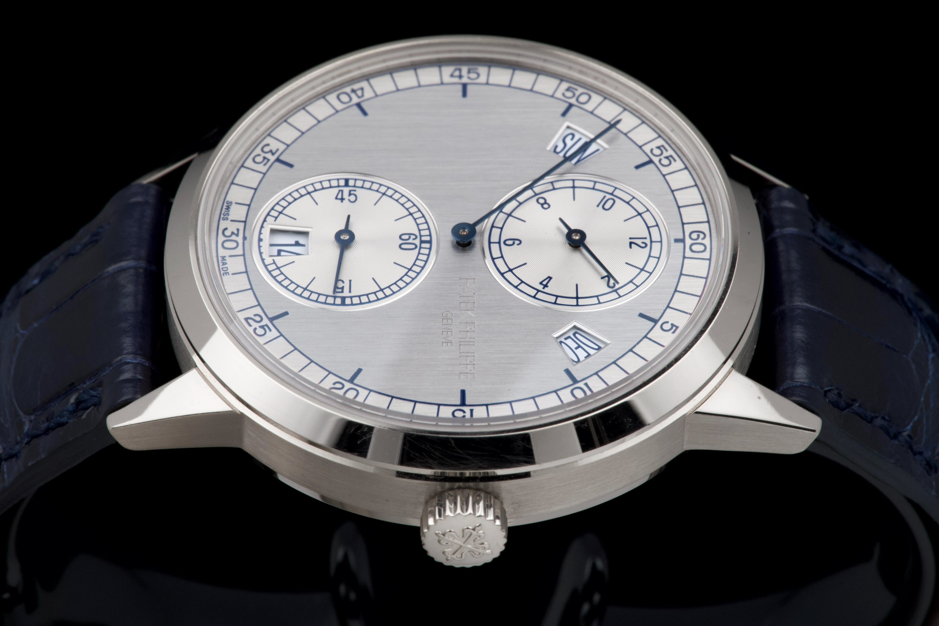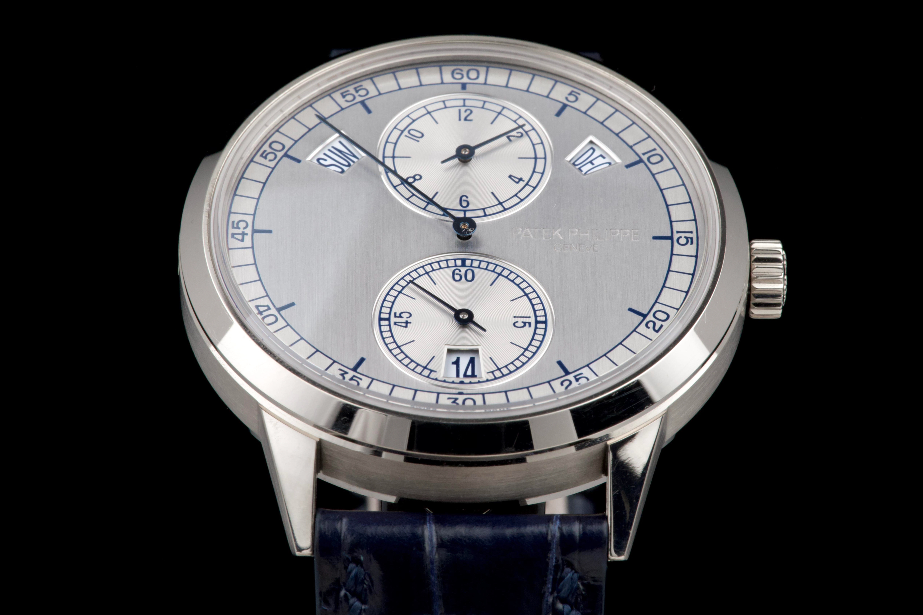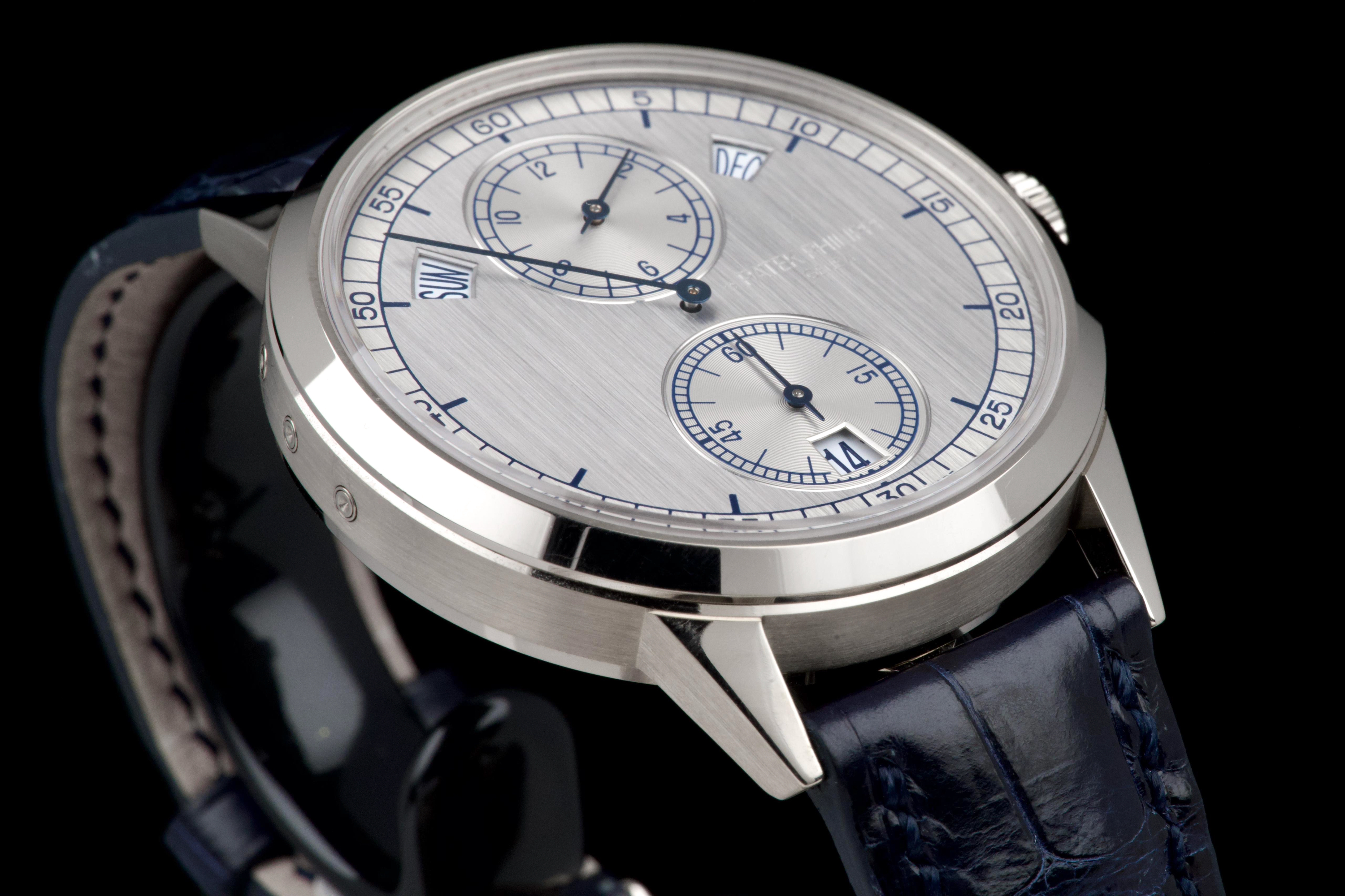 The present Patek Philippe Annual Calendar Regulator reference 5235G, offered here as a complete full set and dating to 2015, is a technically innovative and visually distinctive example of the manufacture’s modern high watchmaking. Originally sold new in Hong Kong in 2015, this watch represents Patek Philippe’s contemporary reinterpretation of the traditional regulator display, combined with an annual calendar complication. Housed in a white-gold case measuring 40.5 mm in diameter, the watch offers a modern yet elegant presence on the wrist. The case appears to have been lightly polished once in the past and is preserved in excellent overall condition, with the bezel remaining nicely flat and well defined. The overall proportions and finishing remain crisp and well balanced. The dial is one of the defining elements of the reference, executed in a vertical satin-finished silver-grey tone with applied white-gold indexes. It features a regulator layout, with separate indications for hours, minutes, and seconds, lending the watch a technical and architectural appearance. The annual calendar indications for day and month are displayed through apertures at 10 and 2 o’clock, with a discreet date indication at 6 o’clock, creating a harmonious and highly legible composition. Powering the watch is the Patek Philippe calibre 31-260 REG QA, an automatic movement developed specifically for this model. Notable for its use of a micro-rotor in 22K gold and advanced construction, the movement incorporates modern technical solutions while maintaining traditional finishing standards. It offers the practicality of an annual calendar, requiring correction only once per year at the end of February. While no service history accompanies the watch, it is running well at the time of cataloguing. The watch is fitted with a blue Patek Philippe alligator leather strap in like-new condition, secured by its original white-gold Patek Philippe ardillon buckle. It is delivered with the set as shown in the accompanying photographs. Combining contemporary design, technical innovation, and refined execution, this Annual Calendar Regulator 5235G represents a compelling opportunity to acquire a distinctive modern Patek Philippe with strong visual identity and practical complication, presented in excellent overall condition and complete with its original accessories.