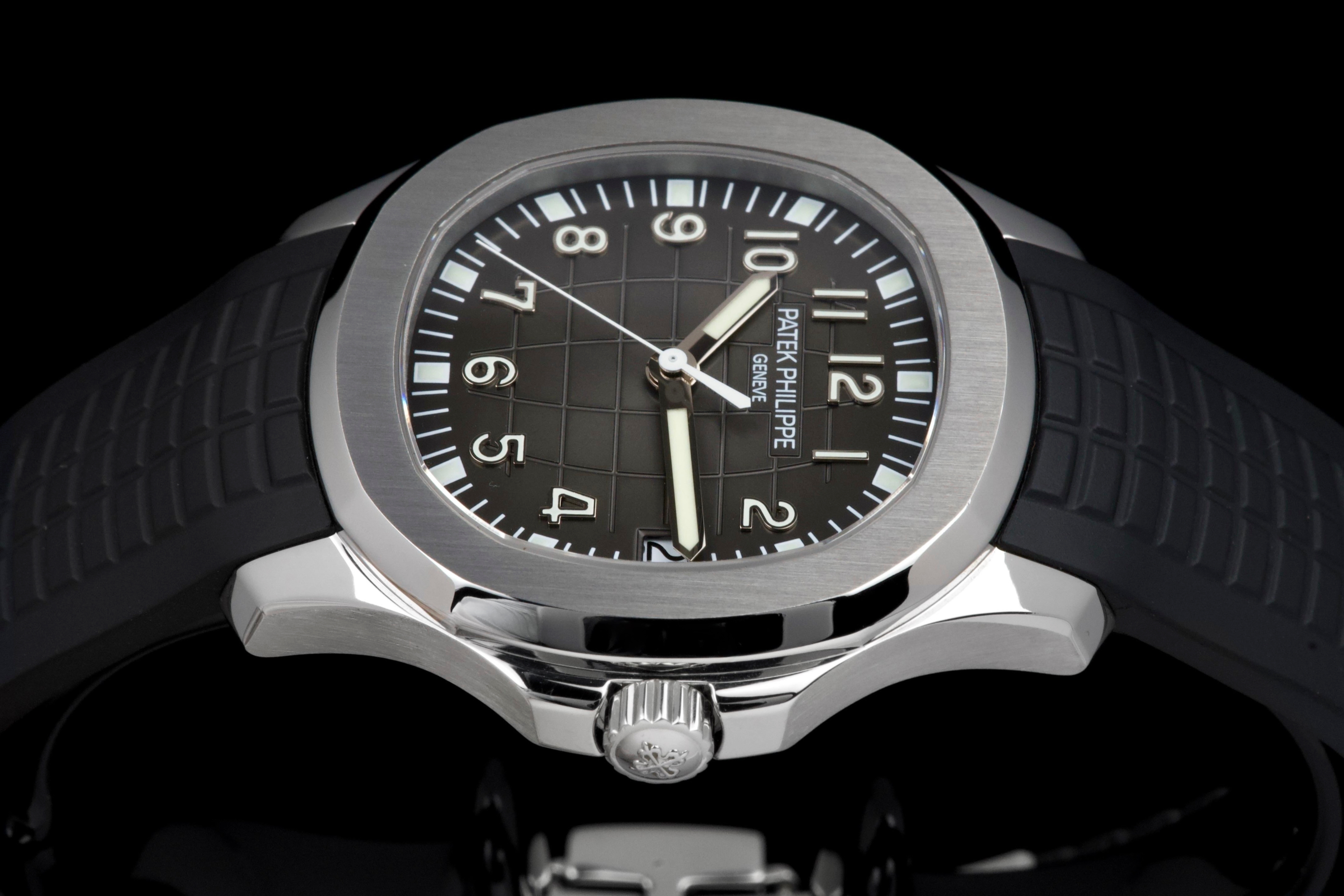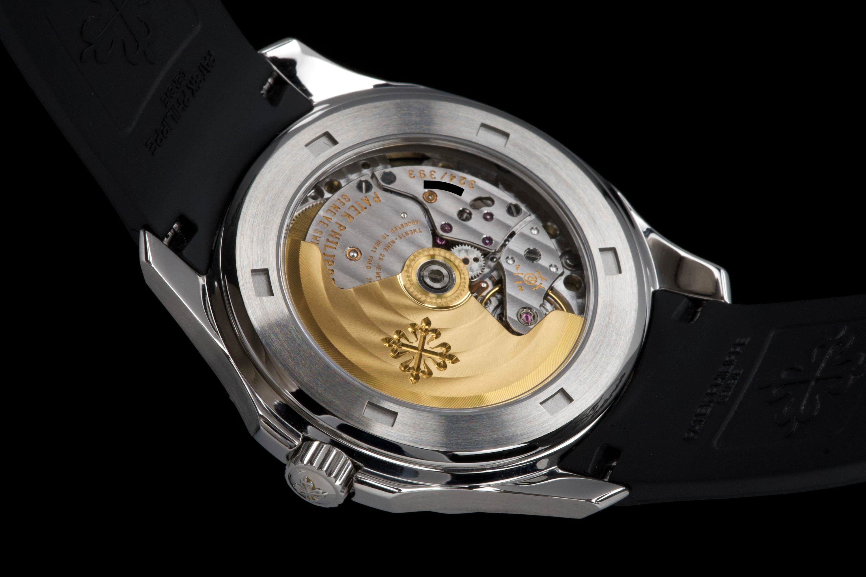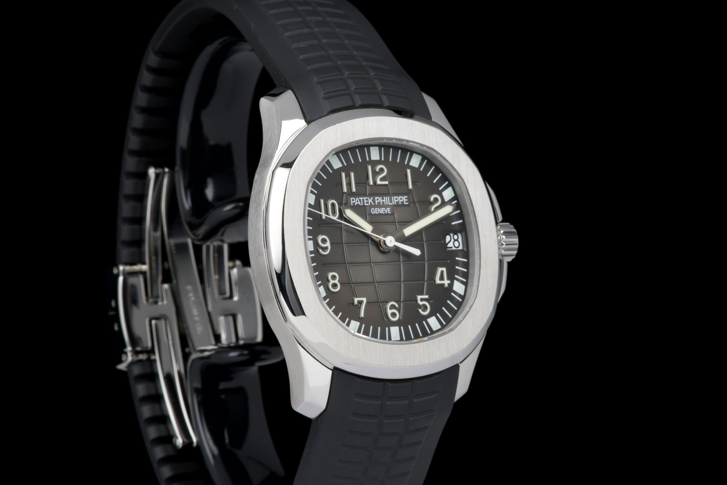 Presented here is a rare and highly appealing example of the Patek Philippe Aquanaut reference 5165, the so-called “Jumbo” Aquanaut, distinguished by its elegant 38mm case. Produced in 2009, this short-lived reference is particularly sought after for its balanced proportions, bridging the gap between the original Aquanaut and later, larger iterations. The watch has been professionally polished by our watchmaker and today presents in very clean overall condition. The movement has been checked and is in proper working order. Accompanied by its original papers, booklets, and leather document holder, this example is offered without the original box. A refined and wearable expression of the Aquanaut line, this reference 5165 offers understated sport elegance and increasing collectability, making it an attractive opportunity for collectors seeking a rare and well-presented Patek Philippe sports watch.
