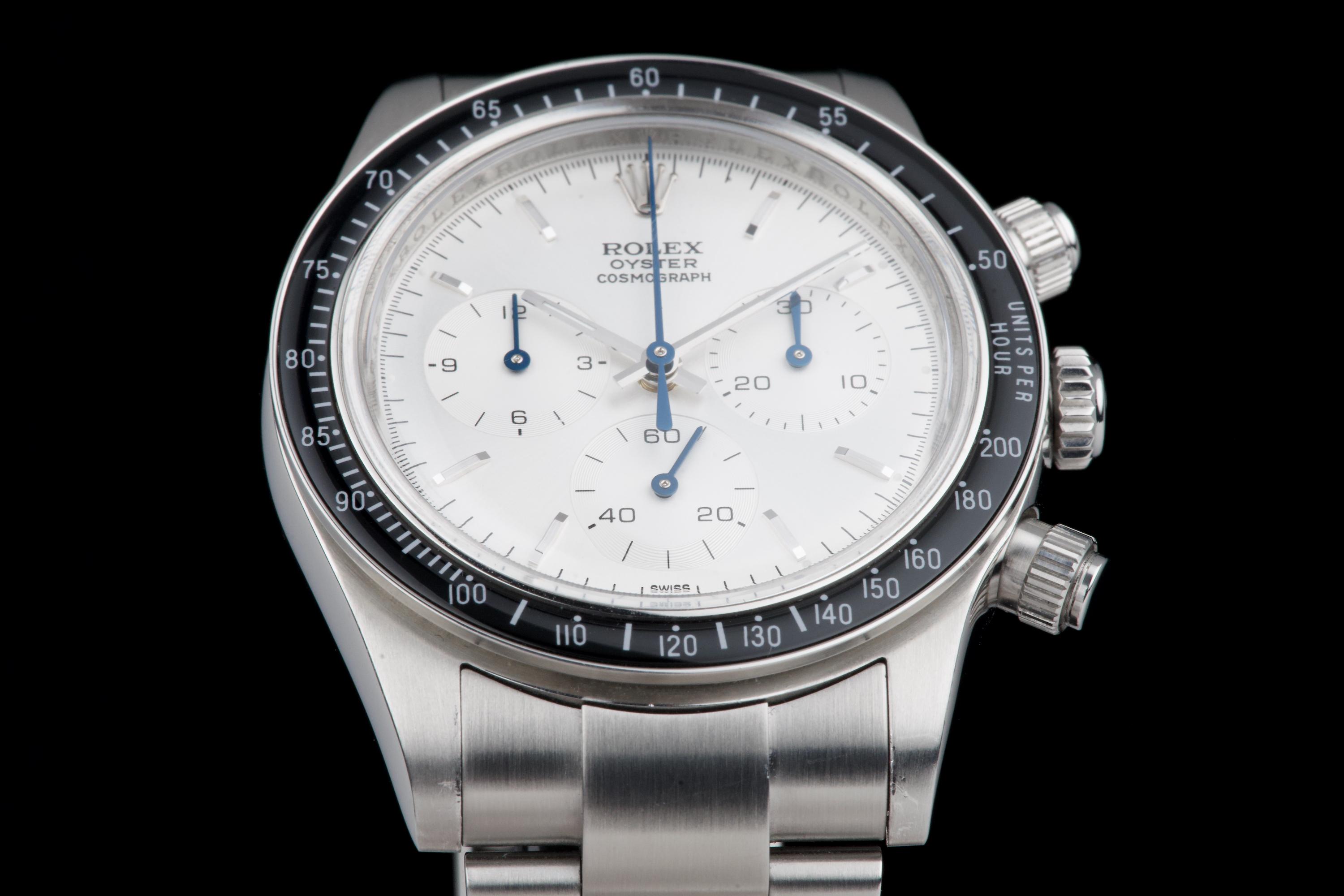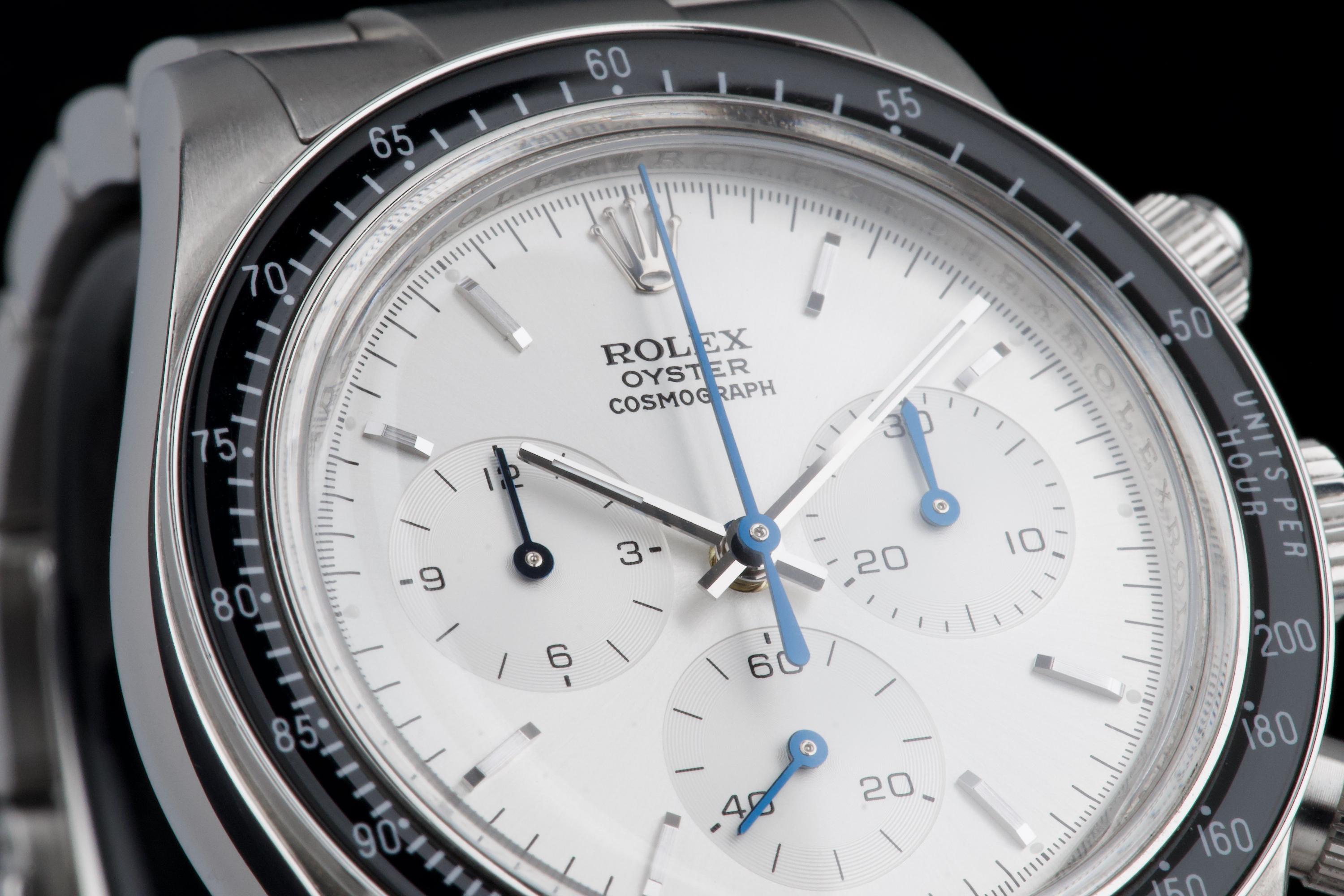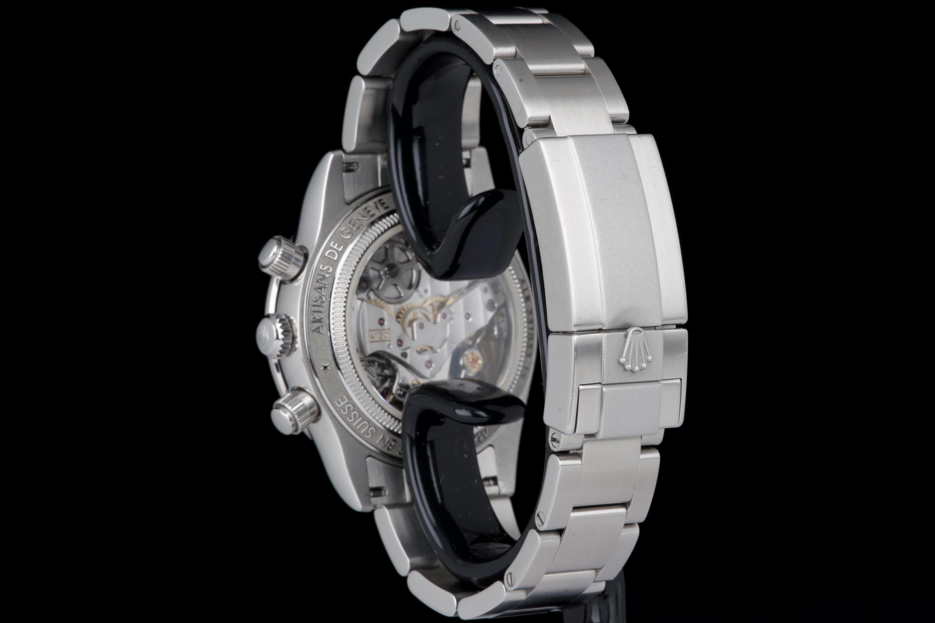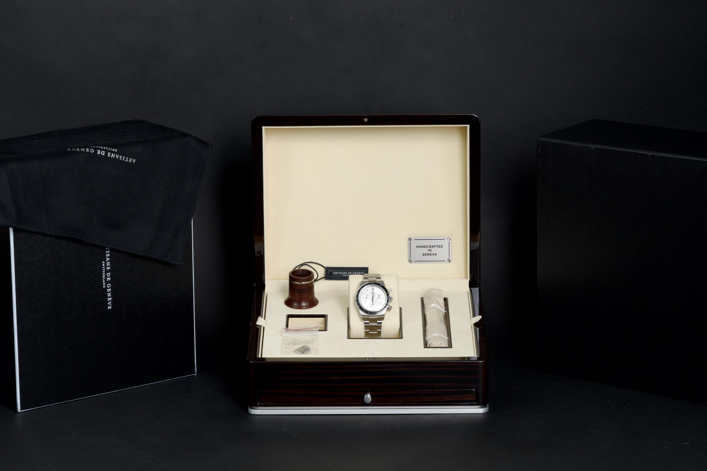 This remarkable piece started life as a Rolex Daytona 116520 and was completely reimagined by Artisans de Genève as part of their “Tribute to 6263 Albino” project. Inspired by the legendary 6263 albino Daytona, this transformation features a hand-finished matte white dial with contrasting subdials, redesigned pushers, and a fully modified caliber 4130 that has been expertly converted to manual winding. The case remains in excellent condition, showing light wear from use. The caseback is engraved with the initials of the original owner, as is customary in these exclusive bespoke commissions. Each project by Artisans de Genève is a one-off, and no two pieces are exactly alike. A highly collectible, technically impressive reinterpretation of a modern Daytona, paying homage to a vintage icon through independent craftsmanship.