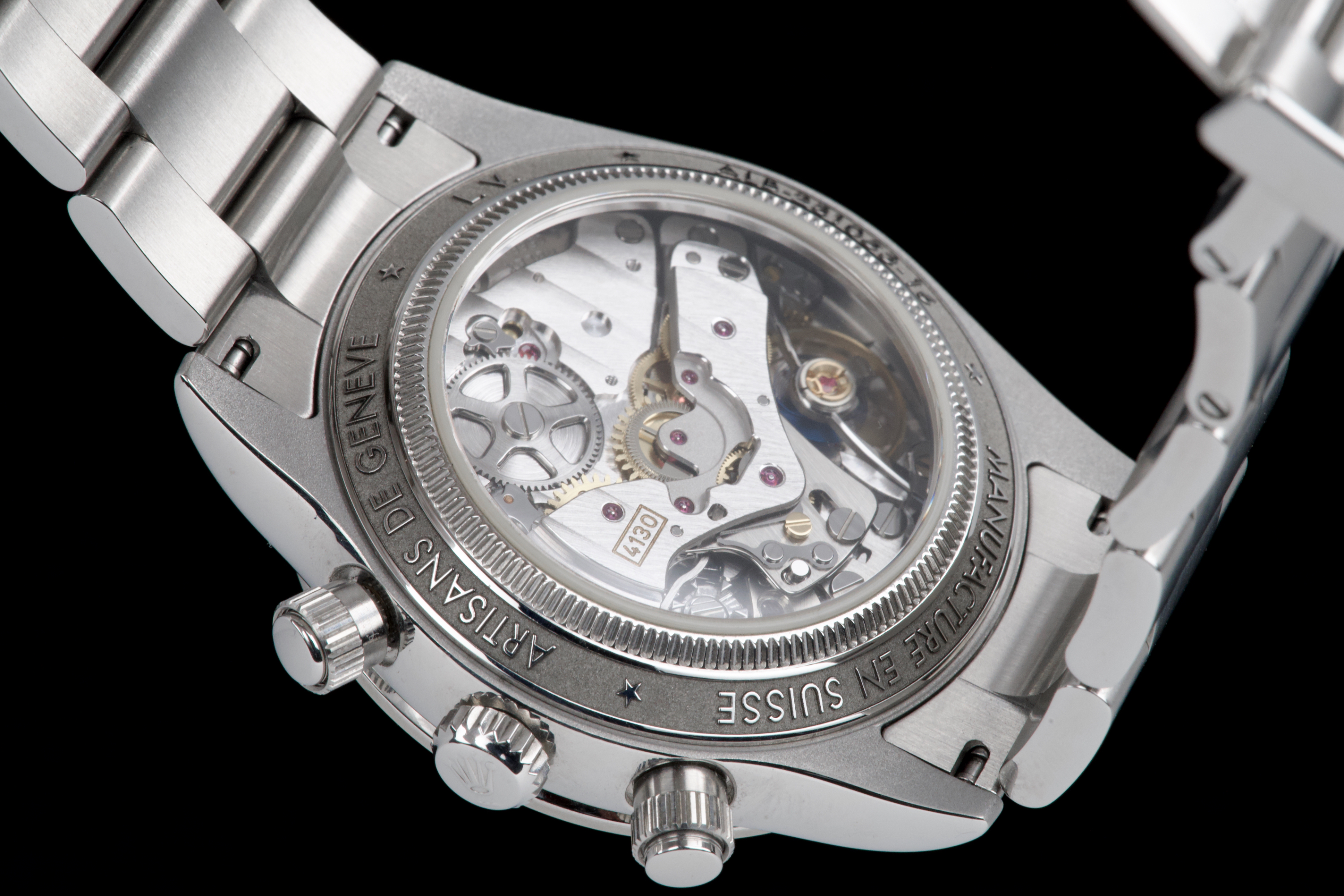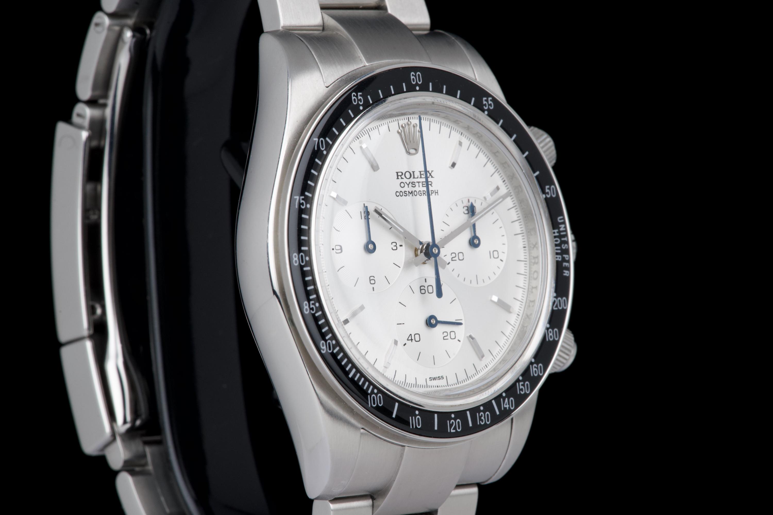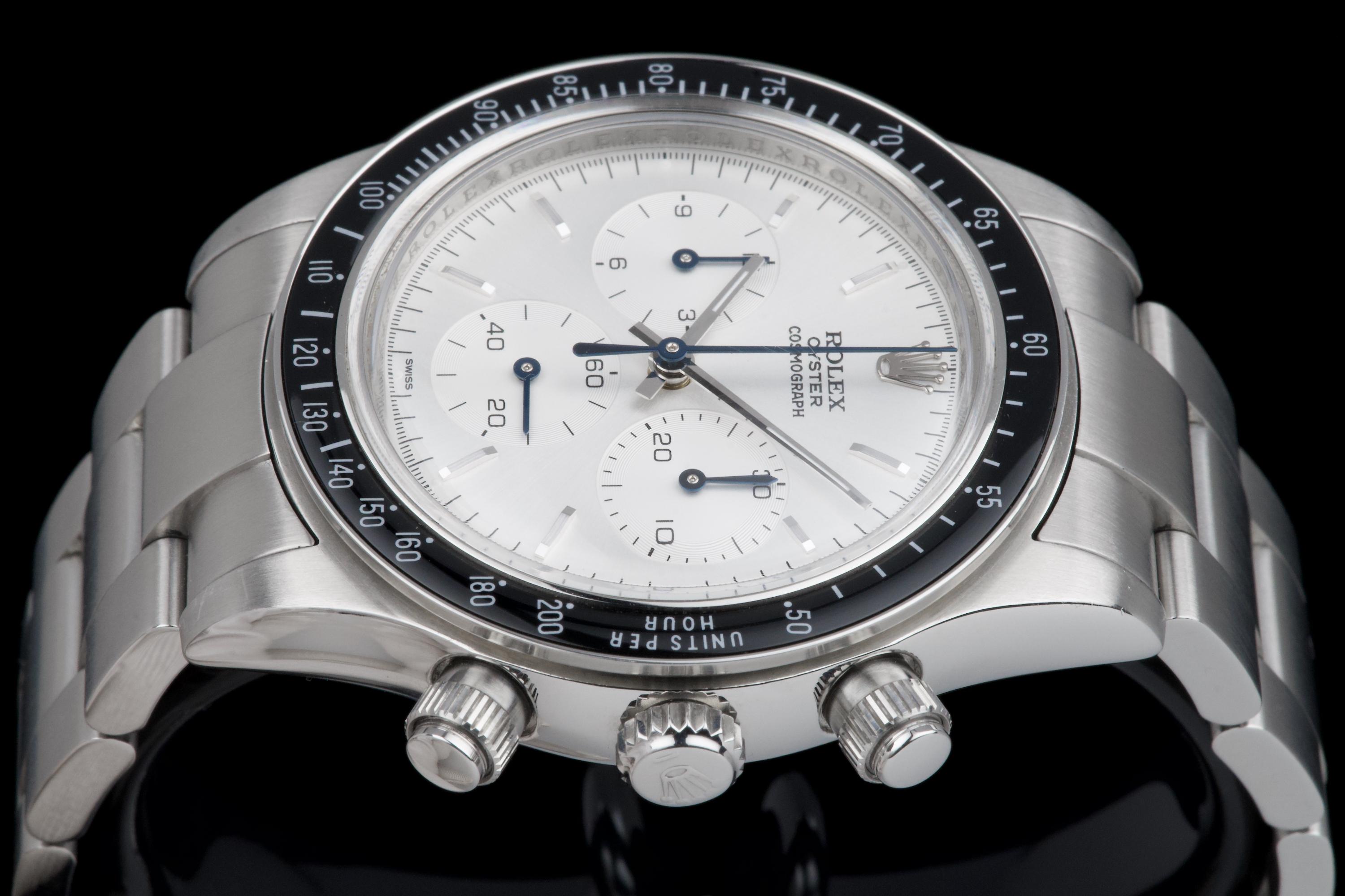 This remarkable piece started life as a Rolex Daytona 116520 and was completely reimagined by Artisans de Genève as part of their “Tribute to 6263 Albino” project. Inspired by the legendary 6263 albino Daytona, this transformation features a hand-finished matte white dial with contrasting subdials, redesigned pushers, and a fully modified caliber 4130 that has been expertly converted to manual winding. The case remains in excellent condition, showing light wear from use. The caseback is engraved with the initials of the original owner, as is customary in these exclusive bespoke commissions. Each project by Artisans de Genève is a one-off, and no two pieces are exactly alike. A highly collectible, technically impressive reinterpretation of a modern Daytona, paying homage to a vintage icon through independent craftsmanship.