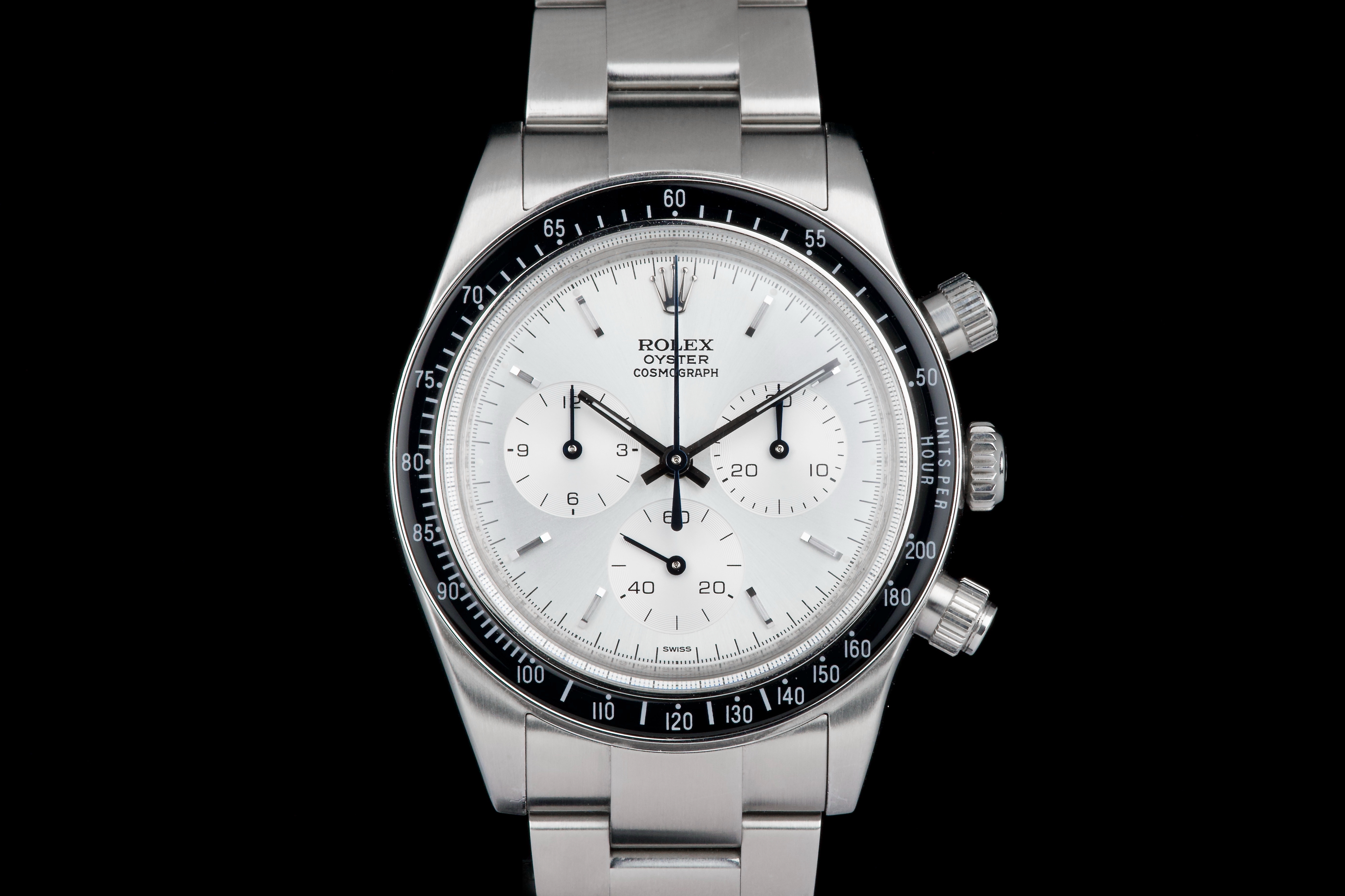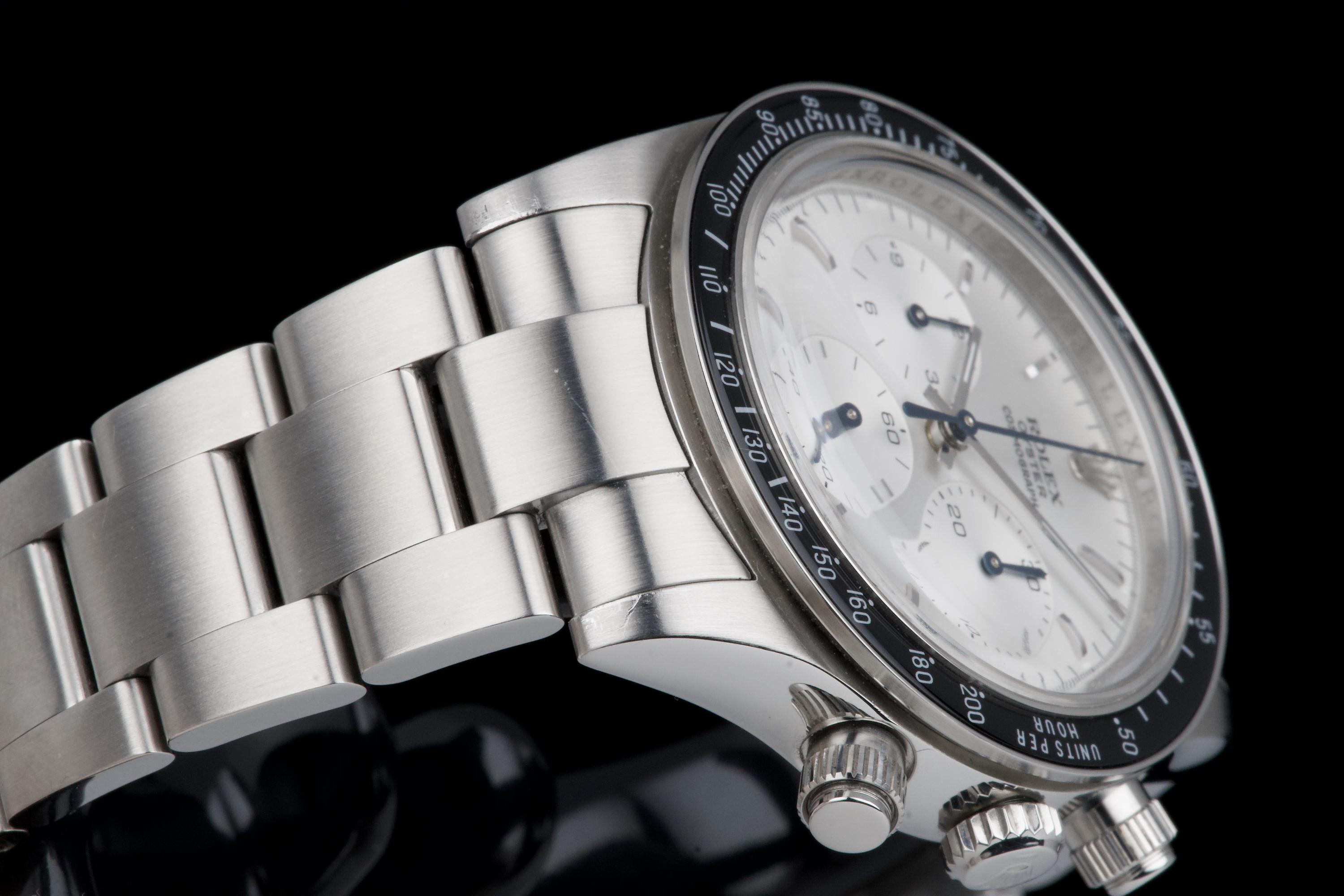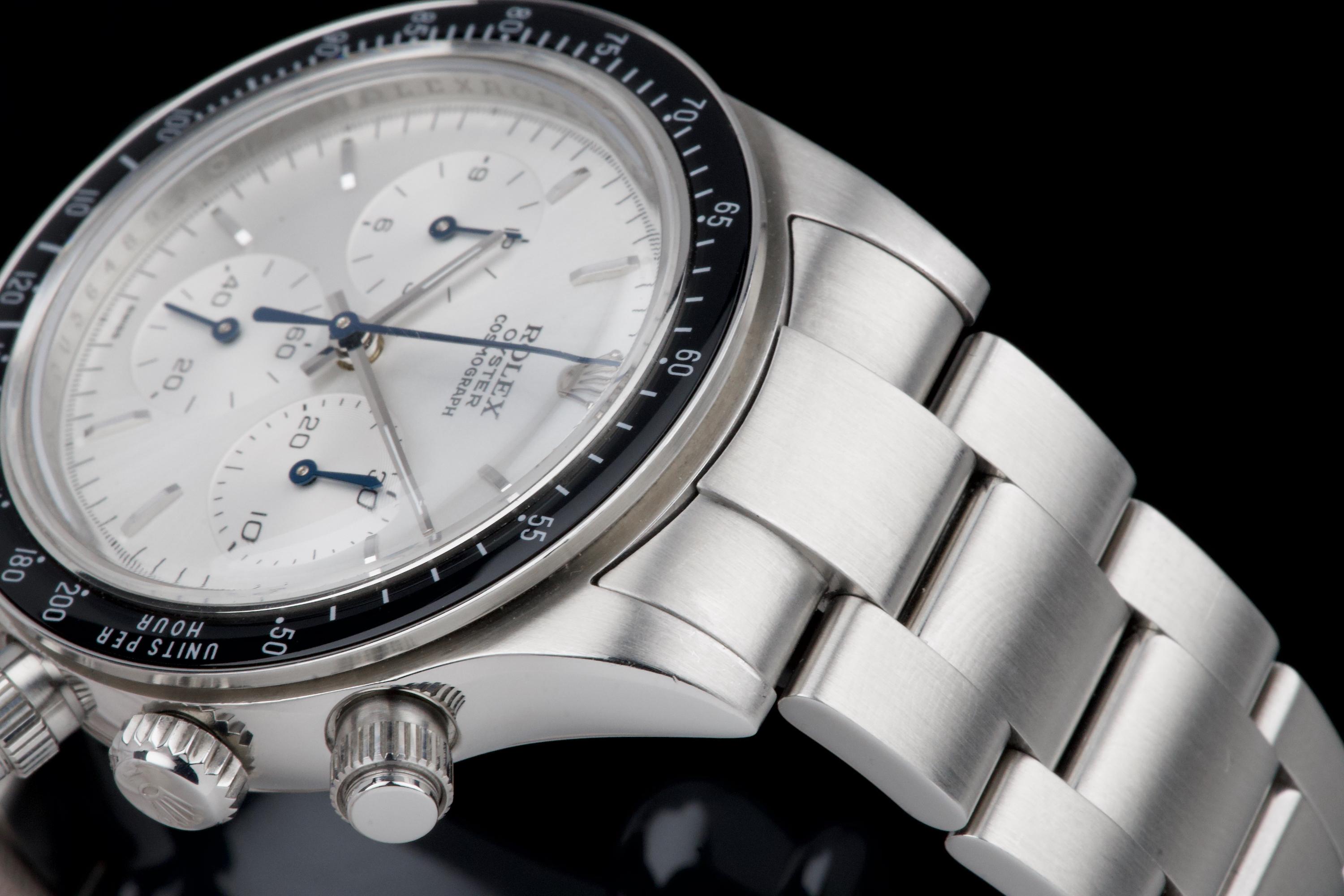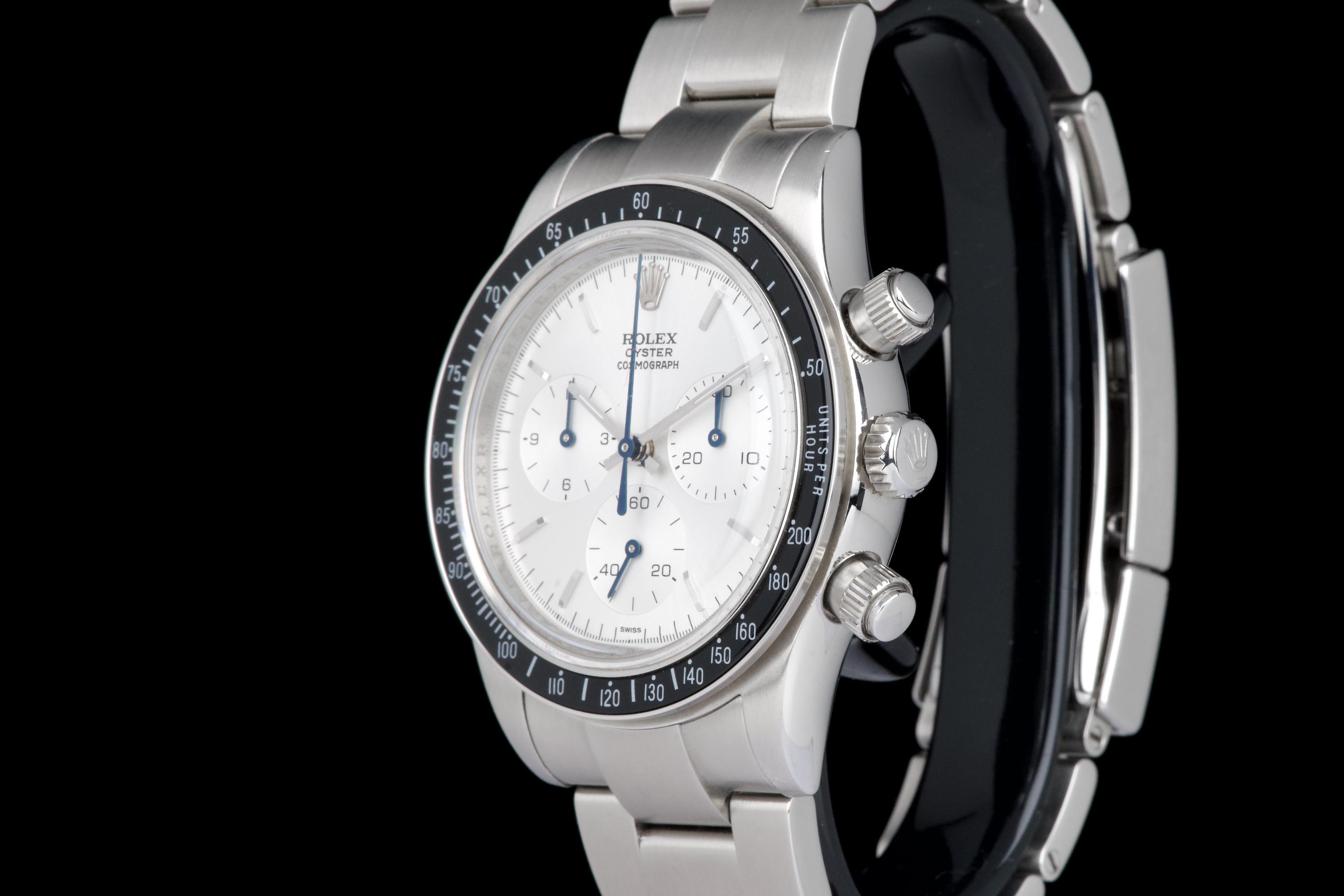 This remarkable piece started life as a Rolex Daytona 116520 and was completely reimagined by Artisans de Genève as part of their “Tribute to 6263 Albino” project. Inspired by the legendary 6263 albino Daytona, this transformation features a hand-finished matte white dial with contrasting subdials, redesigned pushers, and a fully modified caliber 4130 that has been expertly converted to manual winding. The case remains in excellent condition, showing light wear from use. The caseback is engraved with the initials of the original owner, as is customary in these exclusive bespoke commissions. Each project by Artisans de Genève is a one-off, and no two pieces are exactly alike. A highly collectible, technically impressive reinterpretation of a modern Daytona, paying homage to a vintage icon through independent craftsmanship.