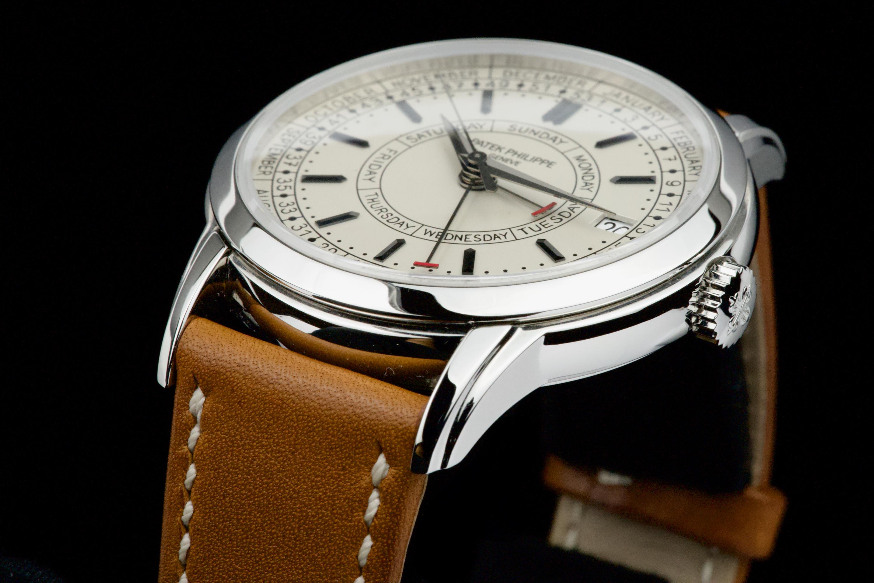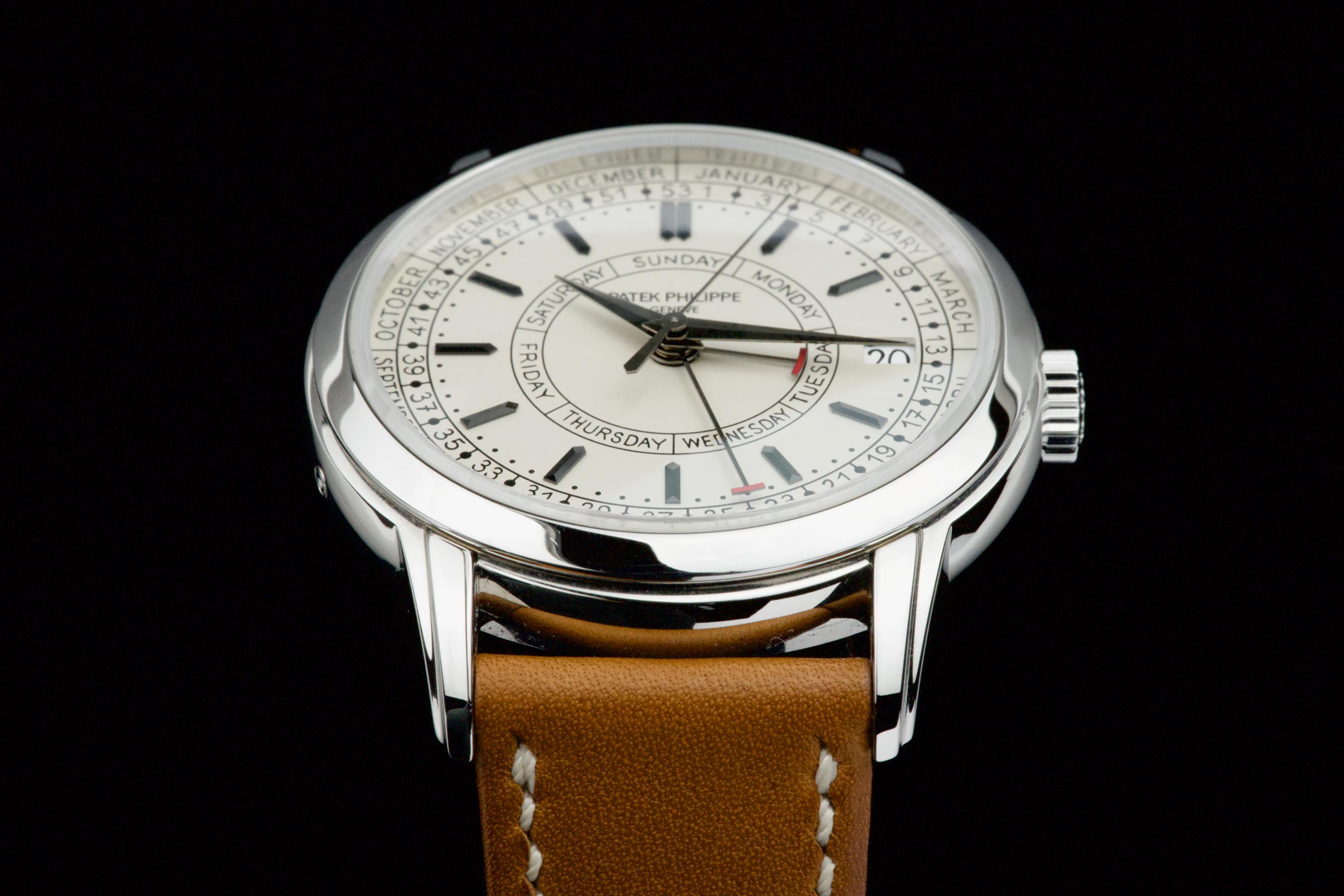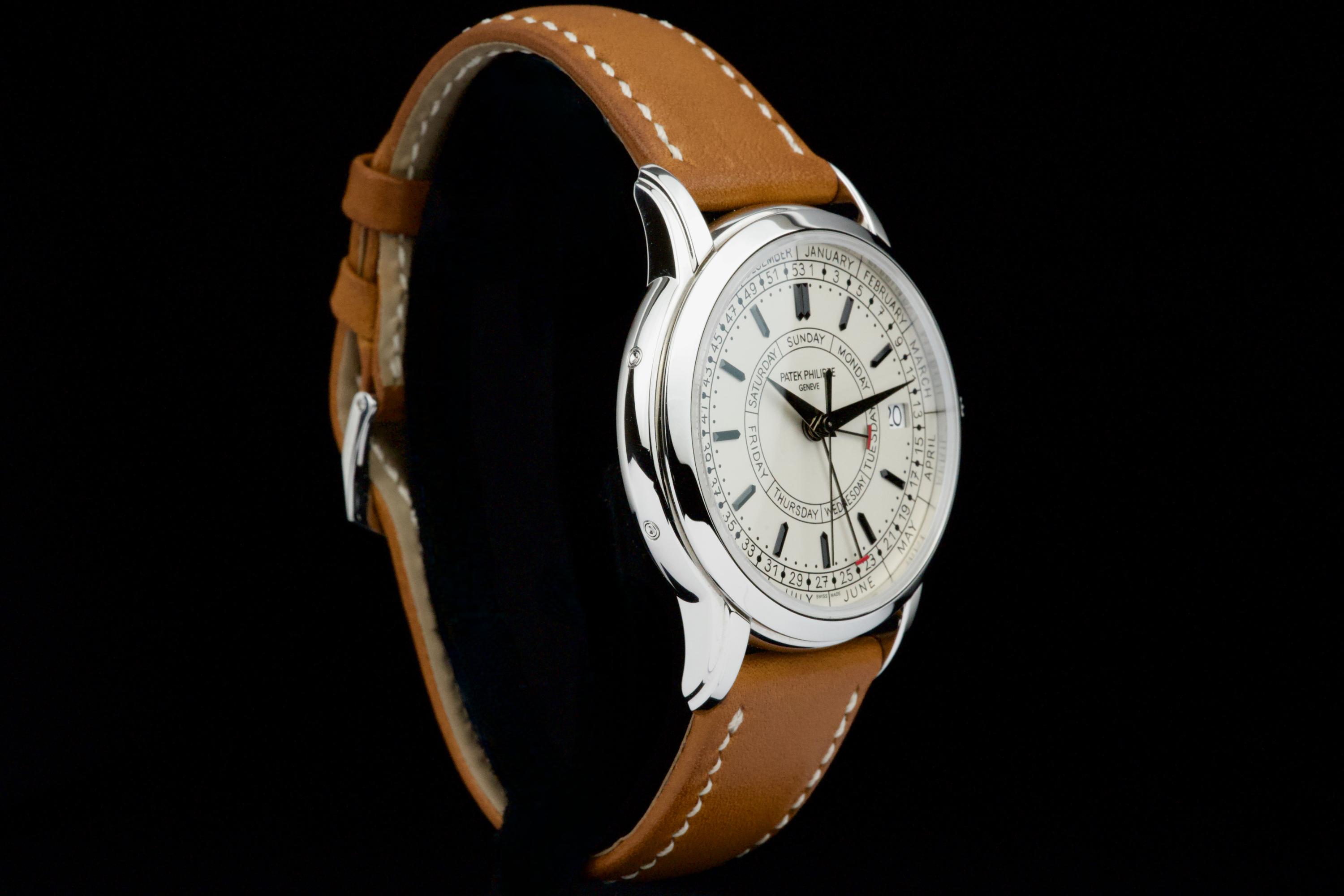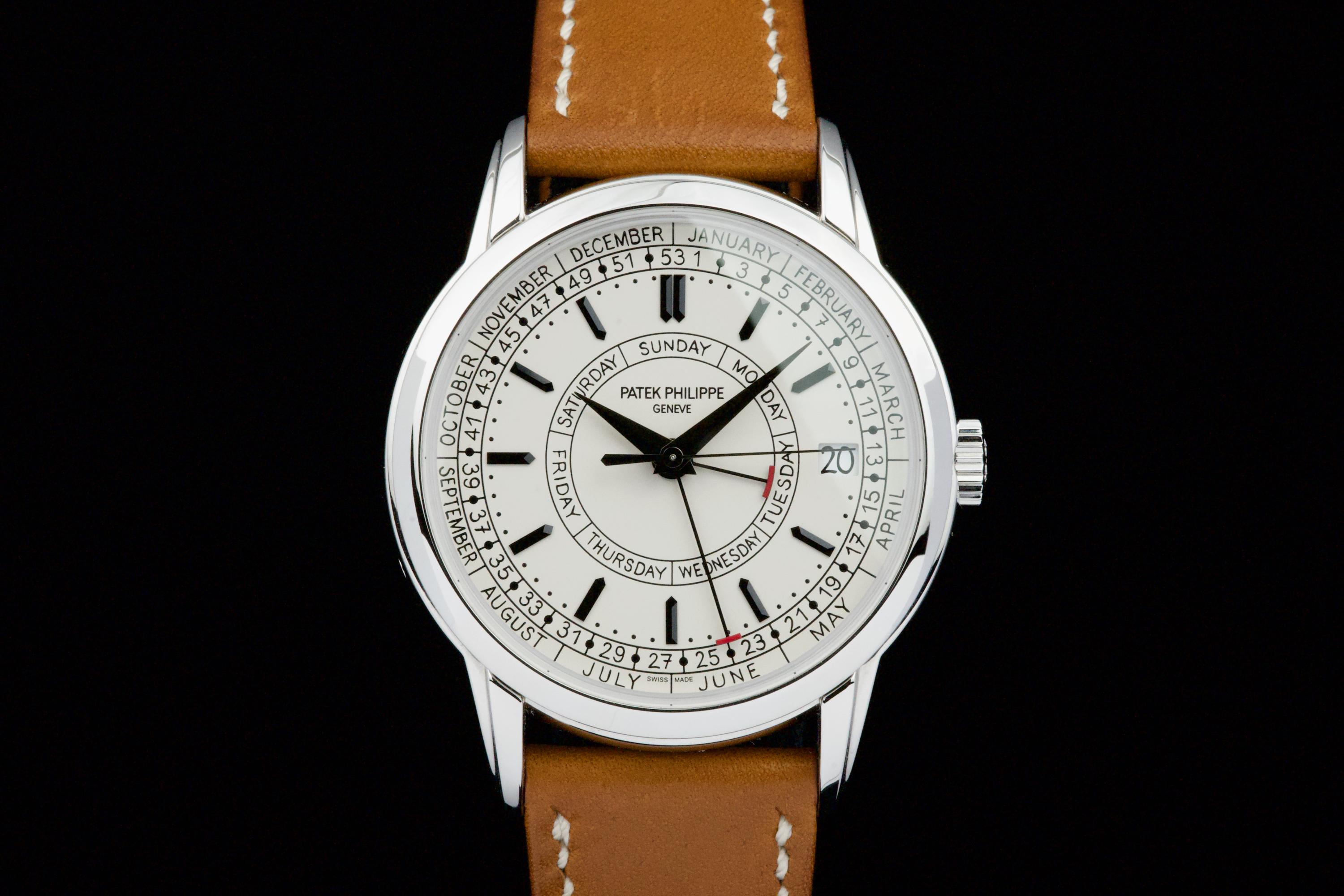 Presented here is a refined and highly distinctive example of the Patek Philippe Calatrava Weekly Calendar reference 5212A. Crafted in stainless steel, this contemporary Calatrava stands apart for its technical originality and unique aesthetic, featuring the handwritten-style typography that has made the reference instantly recognizable among modern Patek Philippe creations. This example dates to 2020 and is accompanied by its full set, including original box and Swiss papers. The watch remains unpolished and presents in excellent overall condition, showing only light signs of wear consistent with careful use. It is fitted with its original beige calfskin strap, preserving the watch’s intended character and visual balance. With no recorded service history, the watch is nonetheless in perfect working condition. A highly attractive opportunity to acquire a well-preserved example of one of Patek Philippe’s most original modern Calatrava references, combining technical ingenuity, everyday wearability, and strong collector interest.