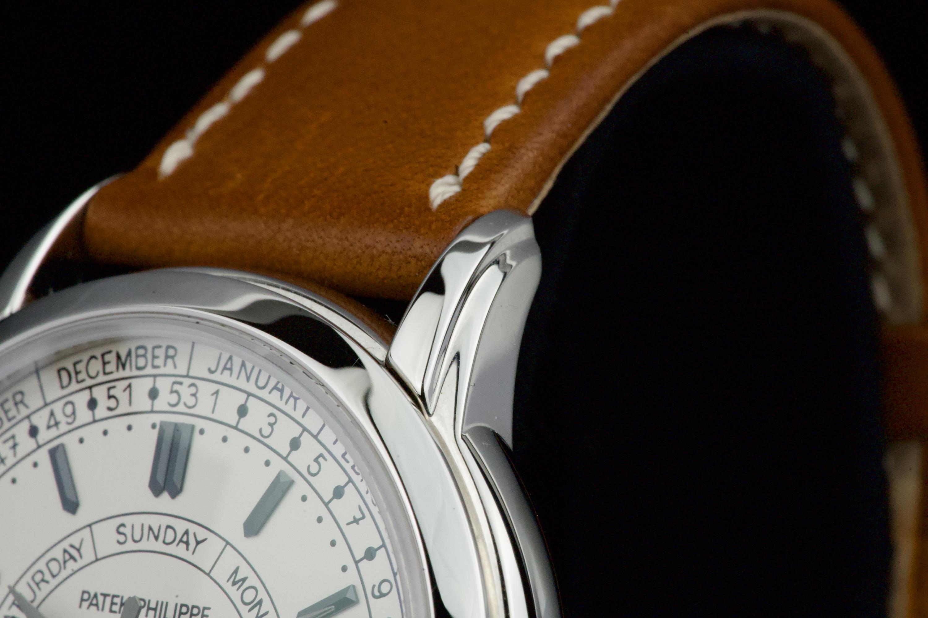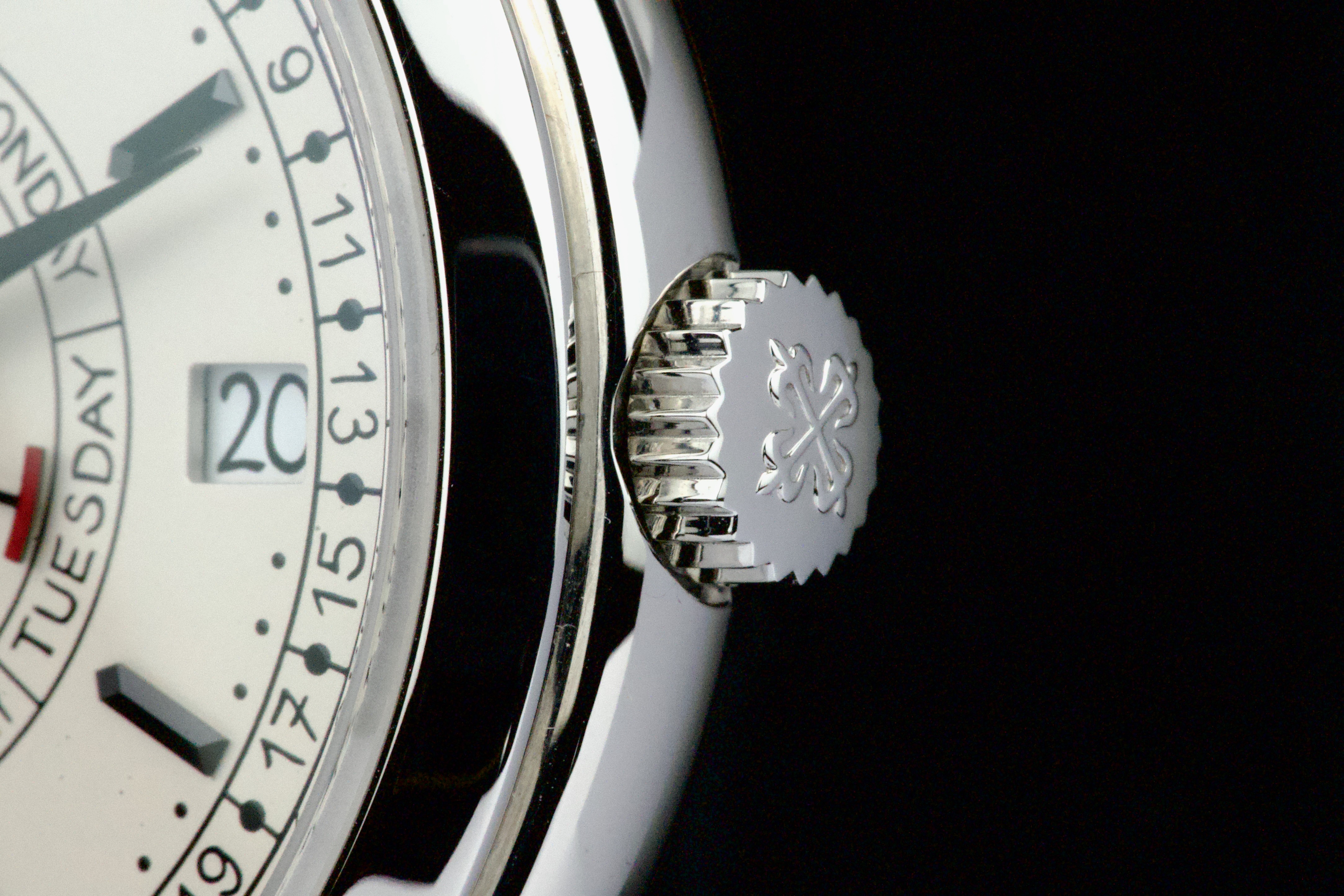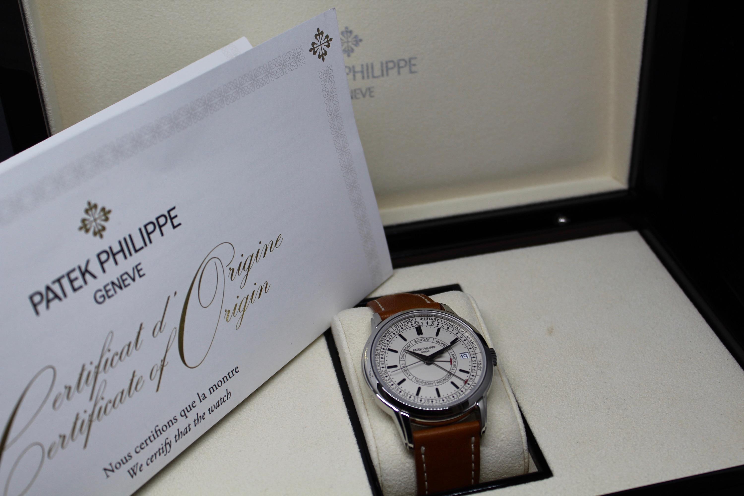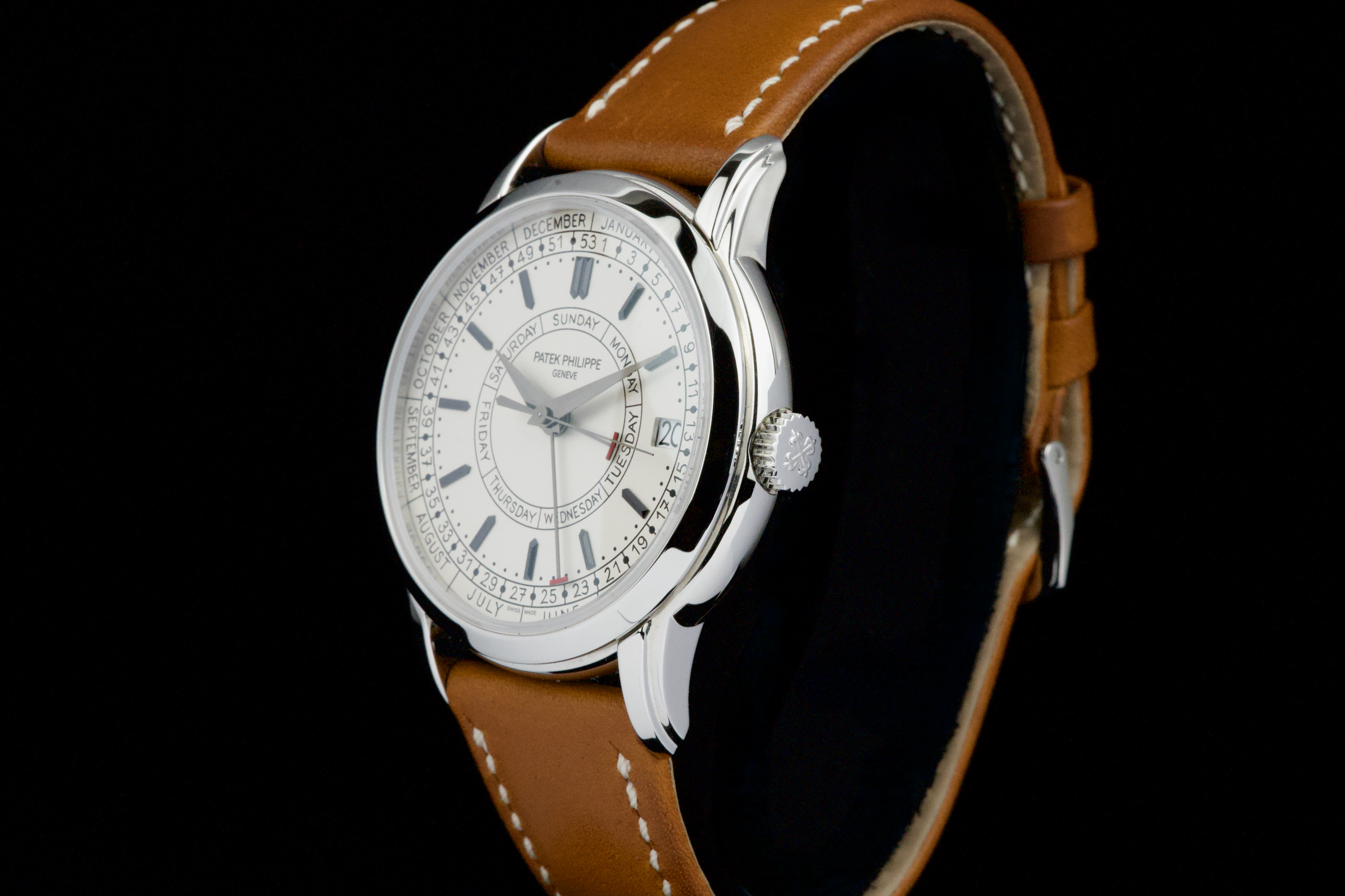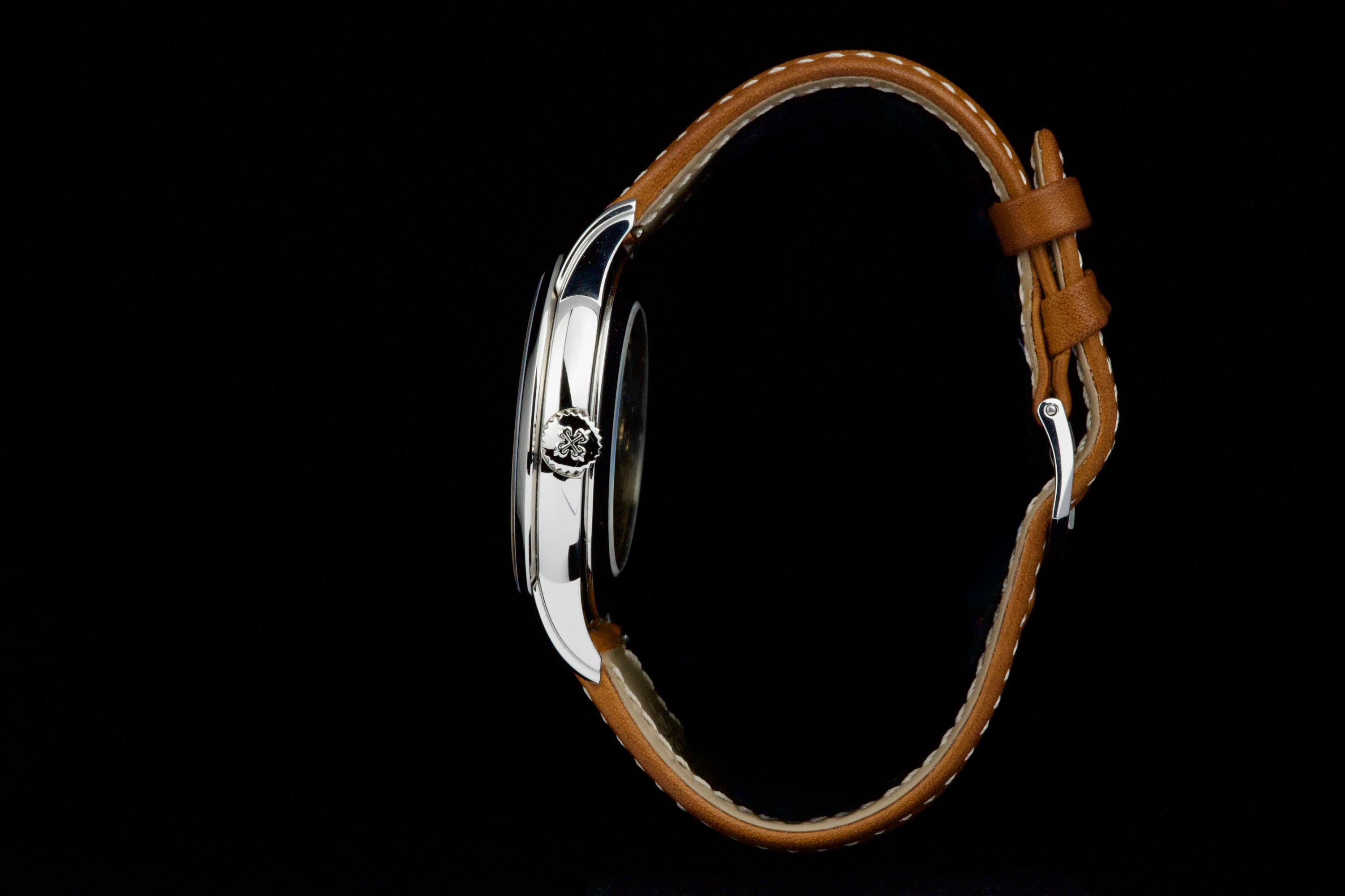 Presented here is a refined and highly distinctive example of the Patek Philippe Calatrava Weekly Calendar reference 5212A. Crafted in stainless steel, this contemporary Calatrava stands apart for its technical originality and unique aesthetic, featuring the handwritten-style typography that has made the reference instantly recognizable among modern Patek Philippe creations. This example dates to 2020 and is accompanied by its full set, including original box and Swiss papers. The watch remains unpolished and presents in excellent overall condition, showing only light signs of wear consistent with careful use. It is fitted with its original beige calfskin strap, preserving the watch’s intended character and visual balance. With no recorded service history, the watch is nonetheless in perfect working condition. A highly attractive opportunity to acquire a well-preserved example of one of Patek Philippe’s most original modern Calatrava references, combining technical ingenuity, everyday wearability, and strong collector interest.