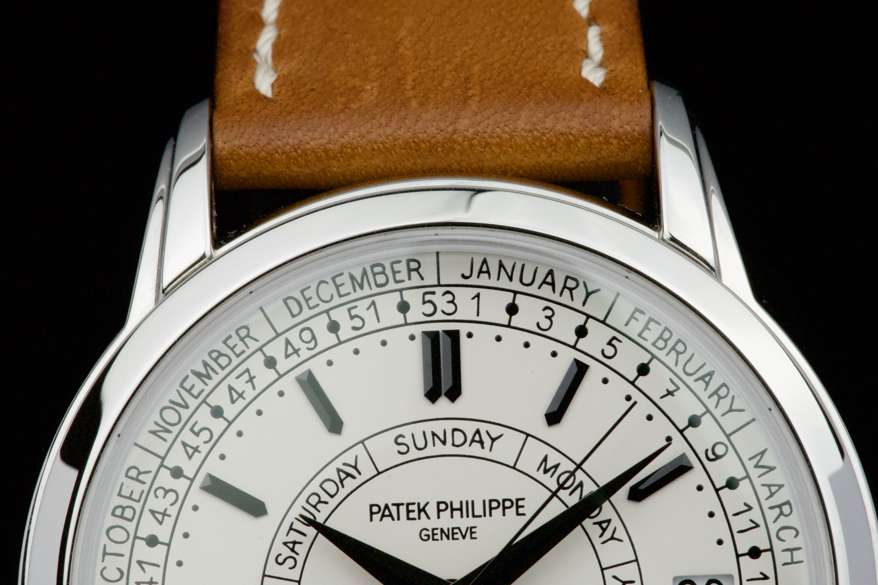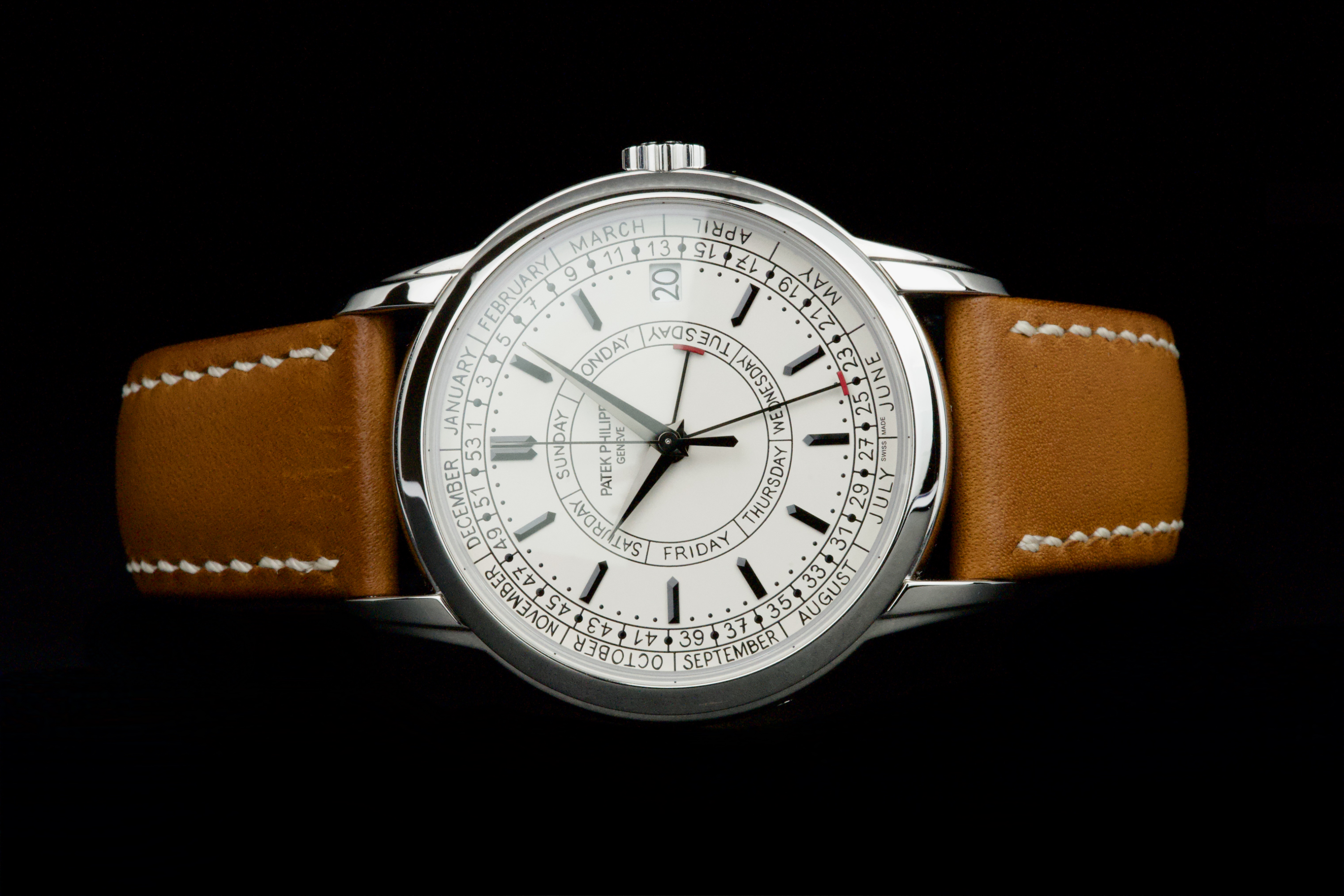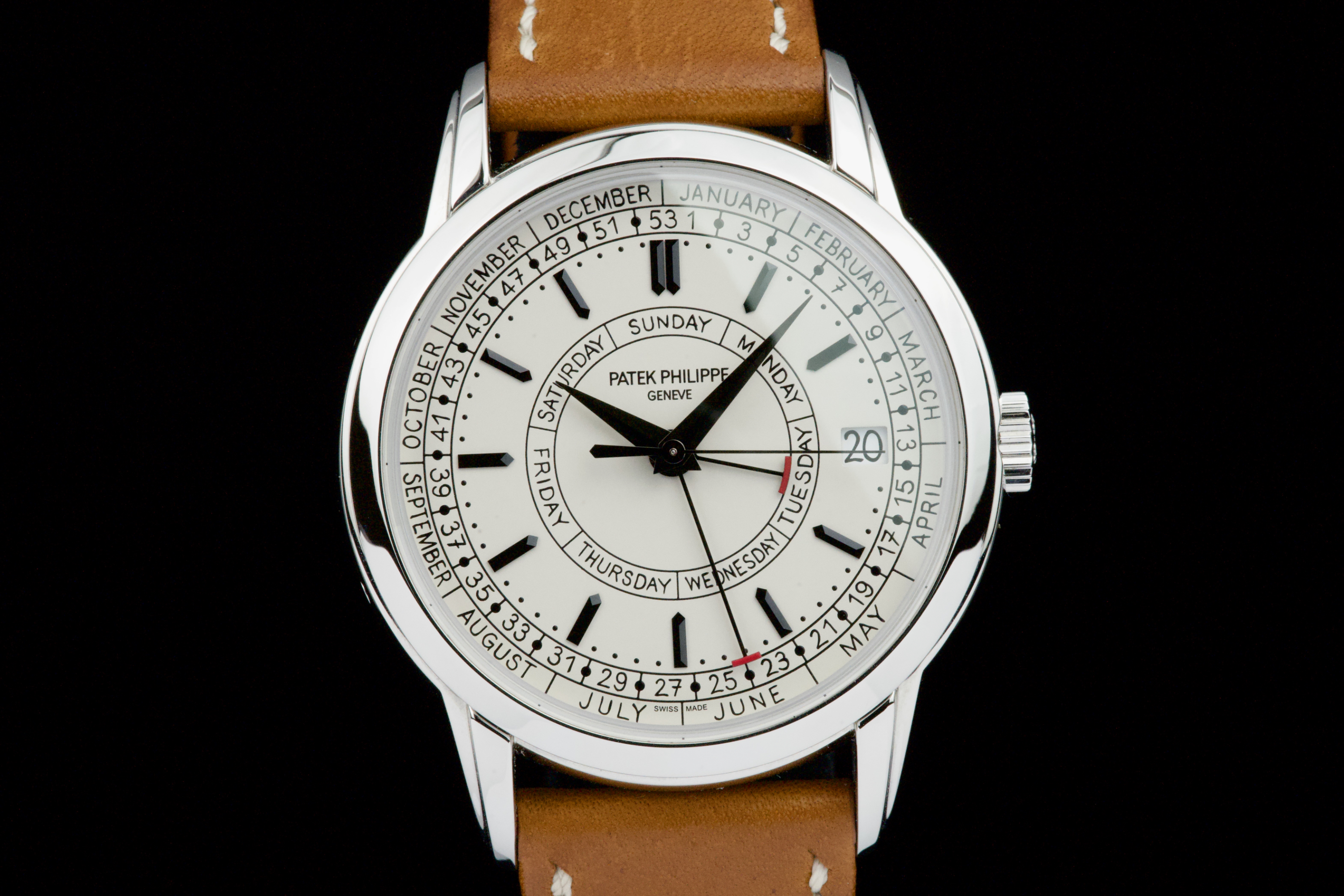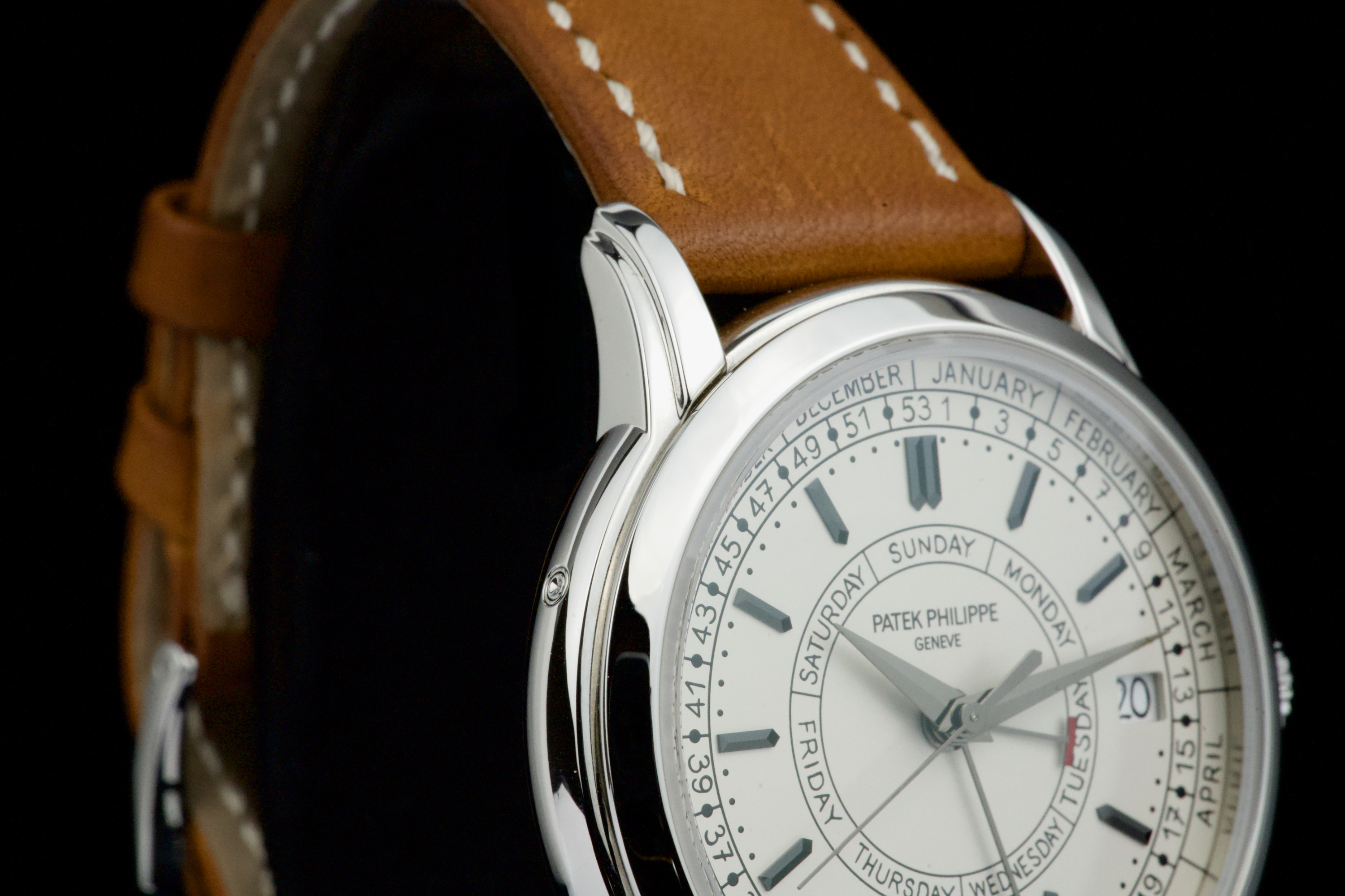Presented here is a refined and highly distinctive example of the Patek Philippe Calatrava Weekly Calendar reference 5212A. Crafted in stainless steel, this contemporary Calatrava stands apart for its technical originality and unique aesthetic, featuring the handwritten-style typography that has made the reference instantly recognizable among modern Patek Philippe creations. This example dates to 2020 and is accompanied by its full set, including original box and Swiss papers. The watch remains unpolished and presents in excellent overall condition, showing only light signs of wear consistent with careful use. It is fitted with its original beige calfskin strap, preserving the watch’s intended character and visual balance. With no recorded service history, the watch is nonetheless in perfect working condition. A highly attractive opportunity to acquire a well-preserved example of one of Patek Philippe’s most original modern Calatrava references, combining technical ingenuity, everyday wearability, and strong collector interest.