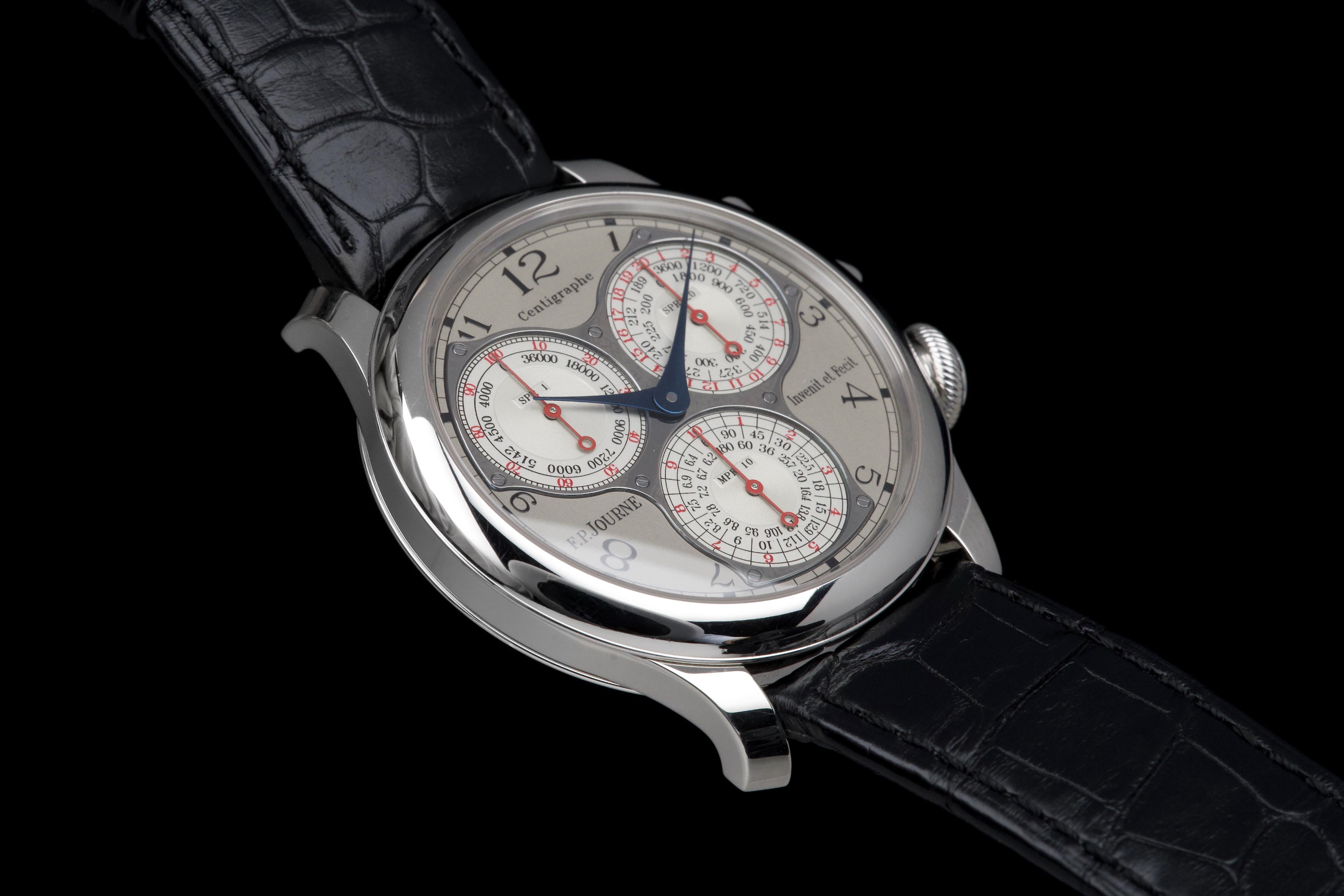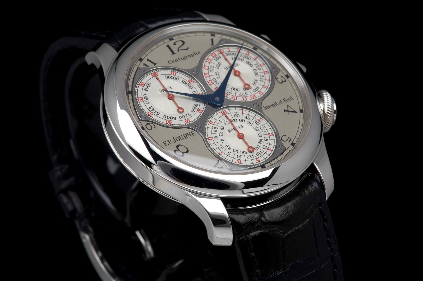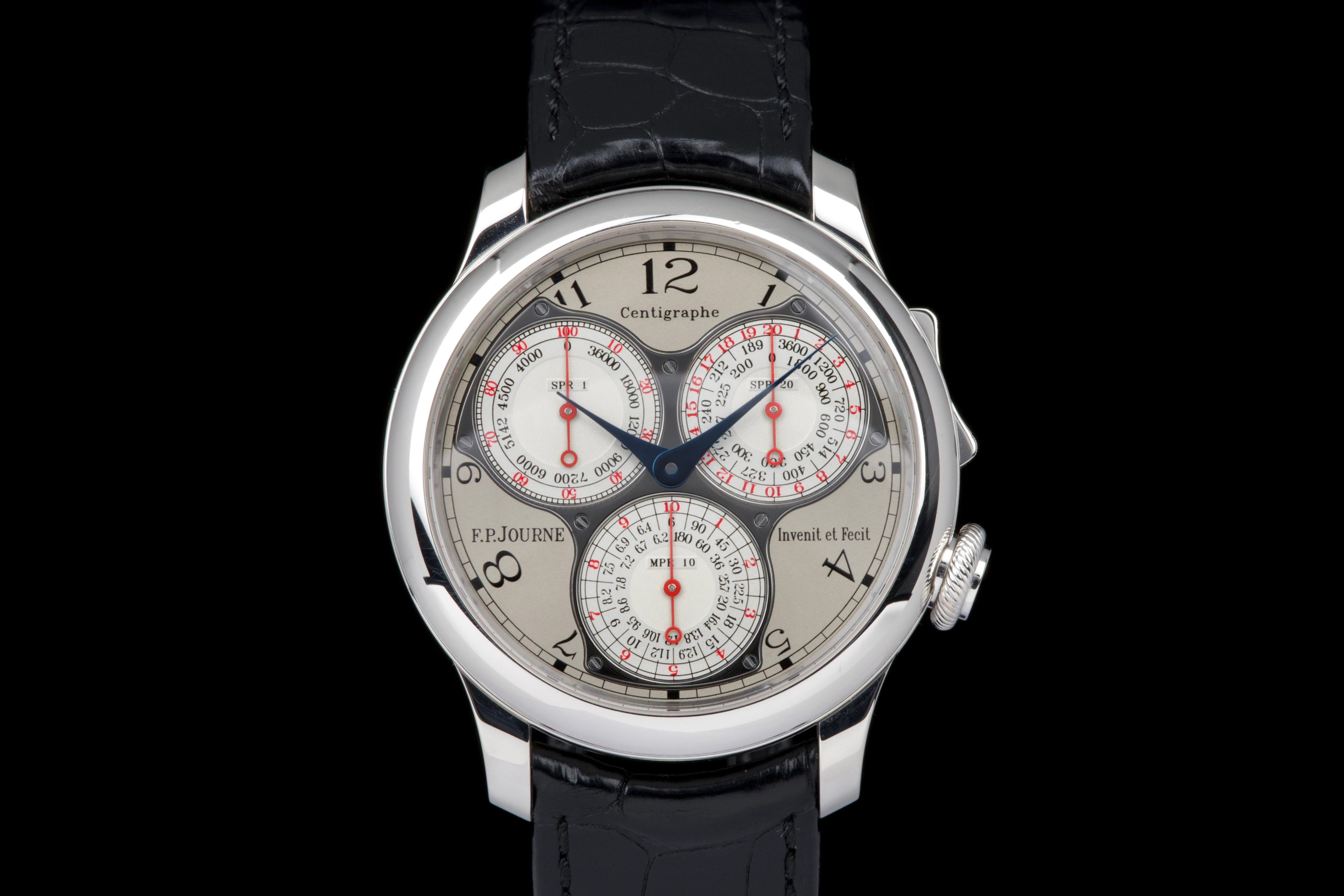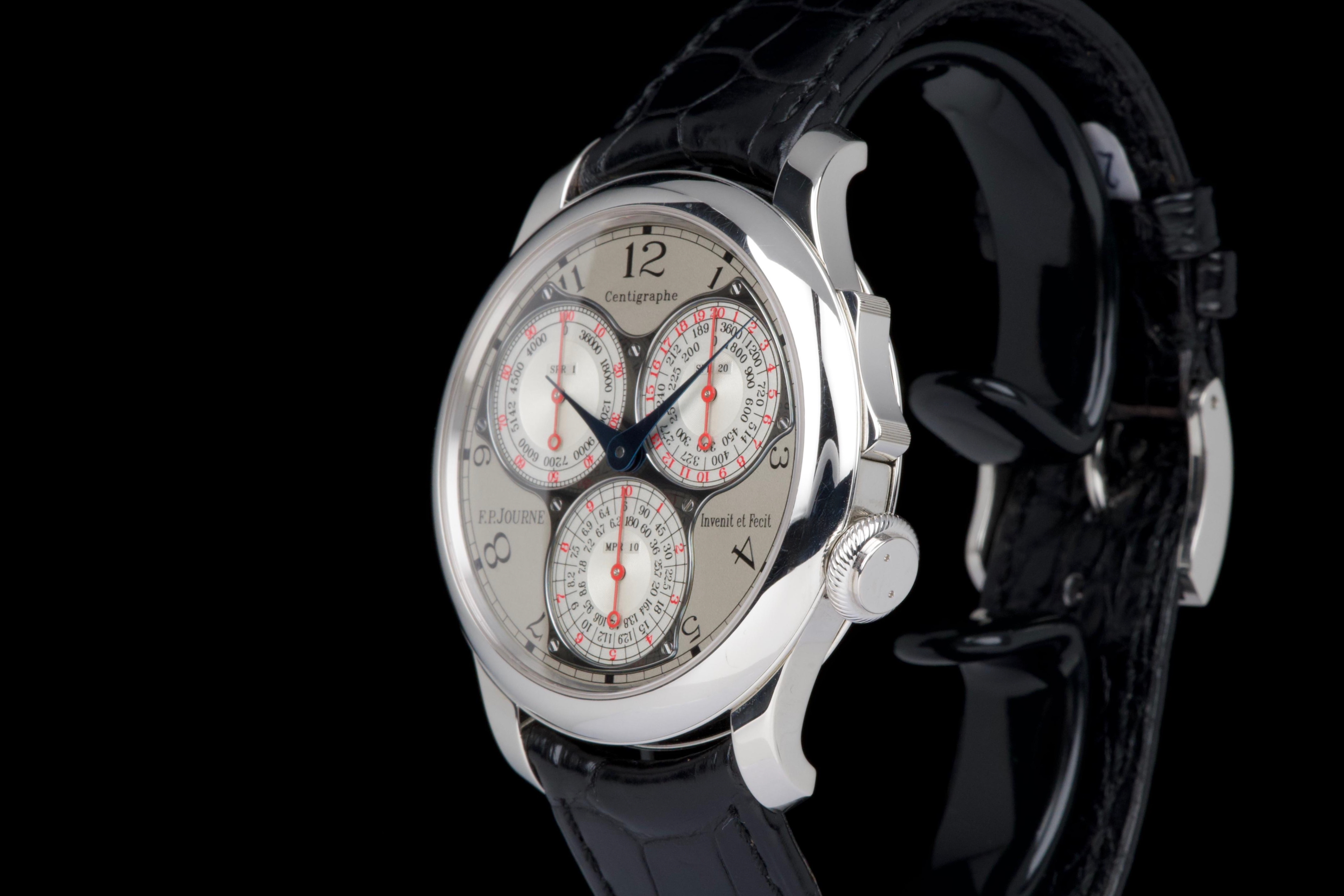 The present François-Paul Journe Centigraphe in platinum, dating to circa 2013, is a highly compelling example of the independent watchmaker’s most technically innovative and intellectually engaging creations. Executed in platinum, the watch perfectly reflects Journe’s uncompromising approach to haute horlogerie, combining mechanical originality with restrained and timeless elegance. The watch appears to have never been polished and is preserved in excellent overall condition, retaining crisp case lines and a strong, well-defined presence on the wrist. It is in excellent working order at the time of cataloguing. While no service history accompanies the watch, its mechanical performance is sound and consistent. The Centigraphe complication is one of François-Paul Journe’s signature inventions, offering a unique chronograph architecture with independent one-second, twenty-second, and ten-minute counters, each driven directly by the movement. This unconventional construction allows for exceptional precision and clarity while showcasing Journe’s distinctive horological philosophy and technical creativity. The watch is fitted with a black alligator leather strap and a platinum ardillon buckle, completing the ensemble with understated coherence and elegance. It is delivered with its original presentation box only; the original papers are not present. Rare, mechanically fascinating, and preserved in honest, seemingly unpolished condition, this platinum Centigraphe from circa 2013 represents a significant opportunity to acquire an important and highly respected work from one of the most influential independent watchmakers of the modern era