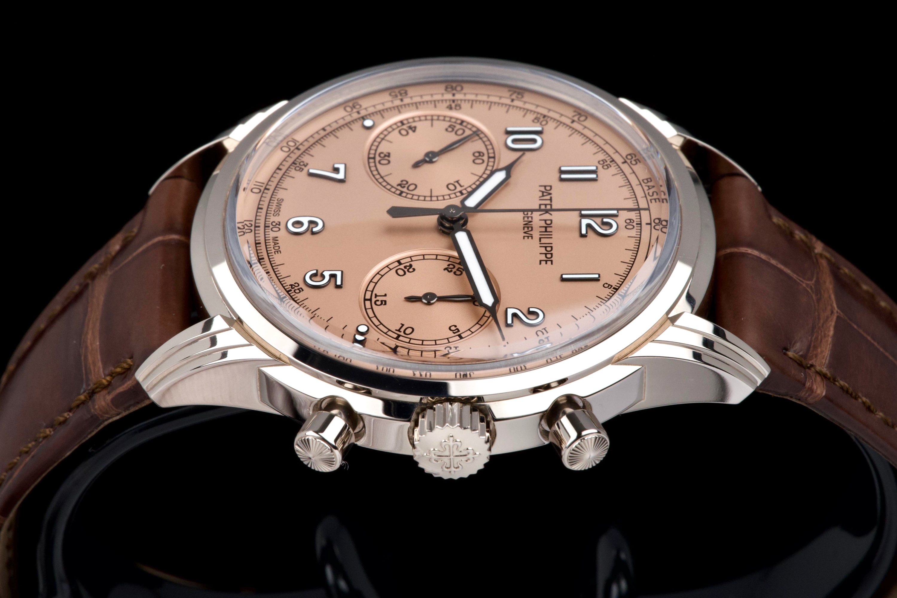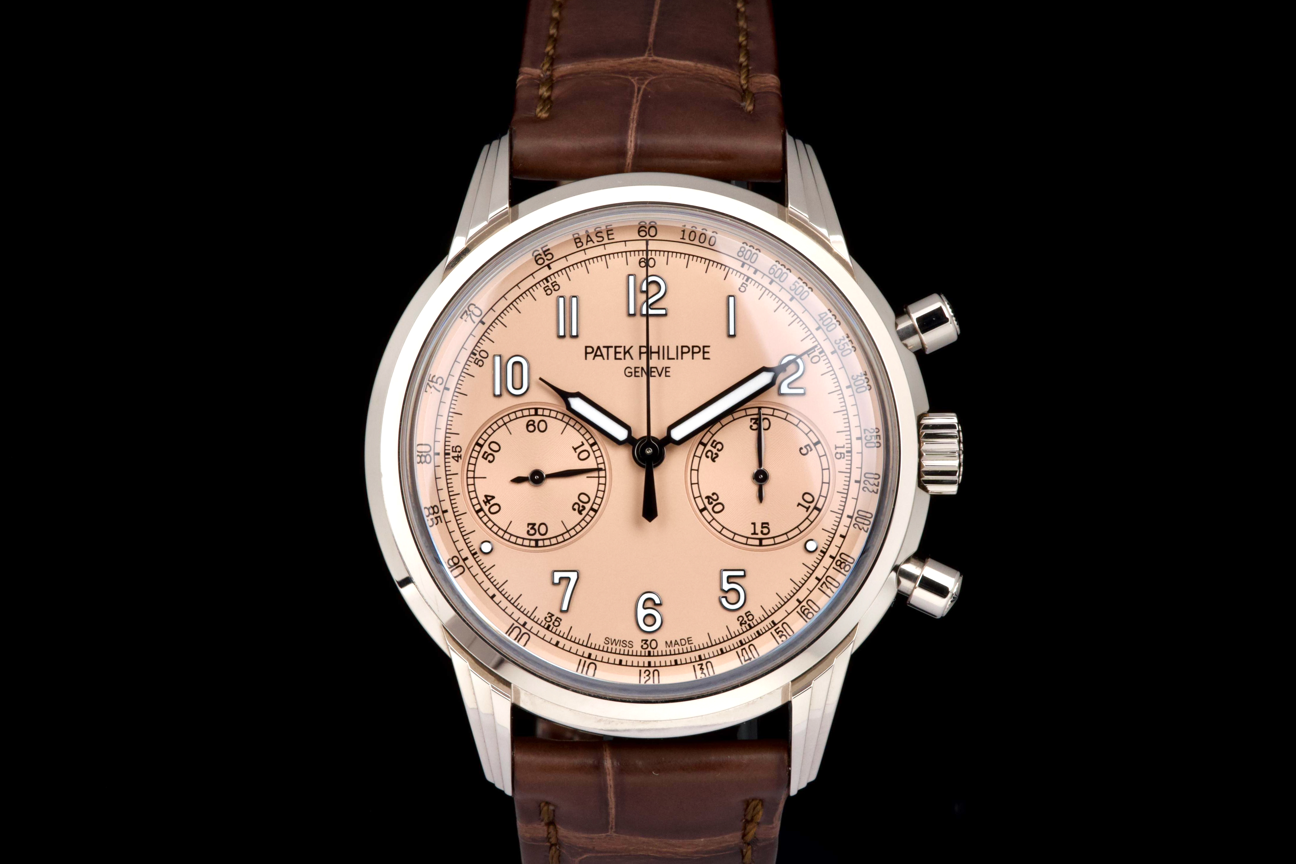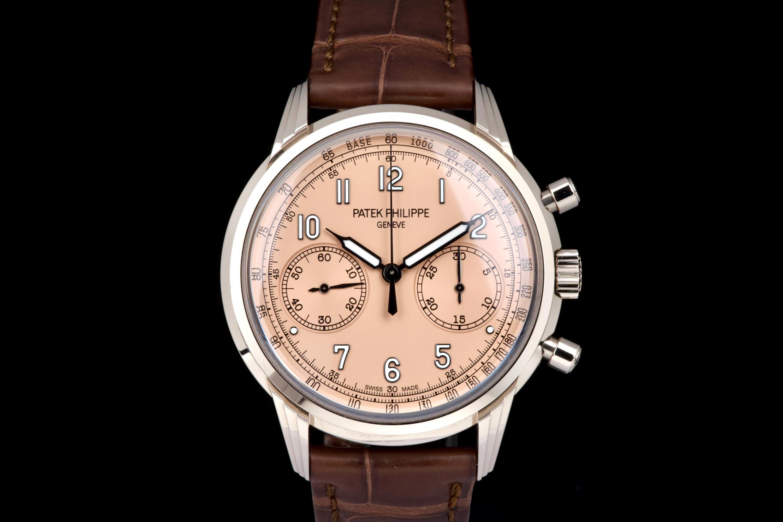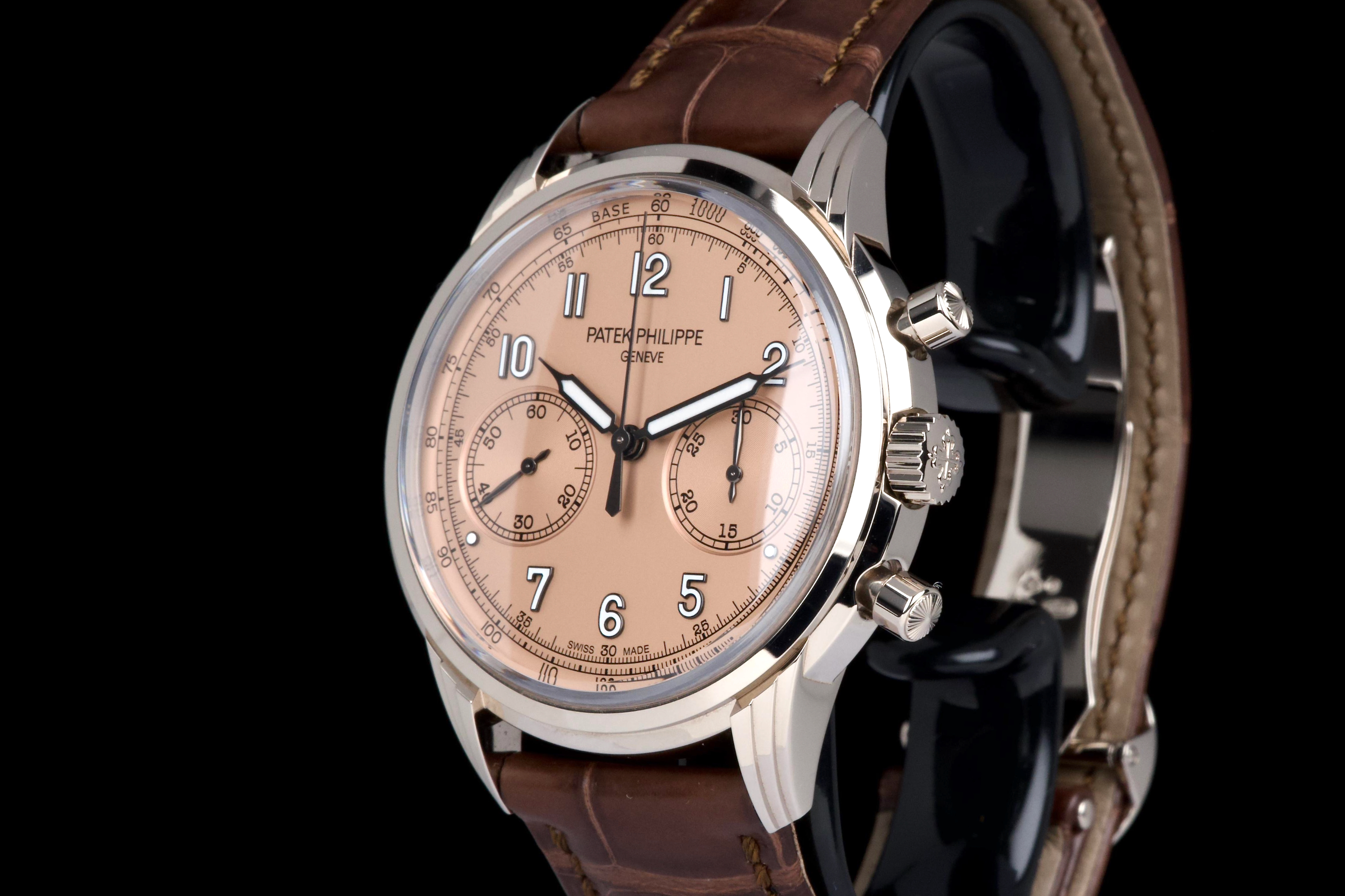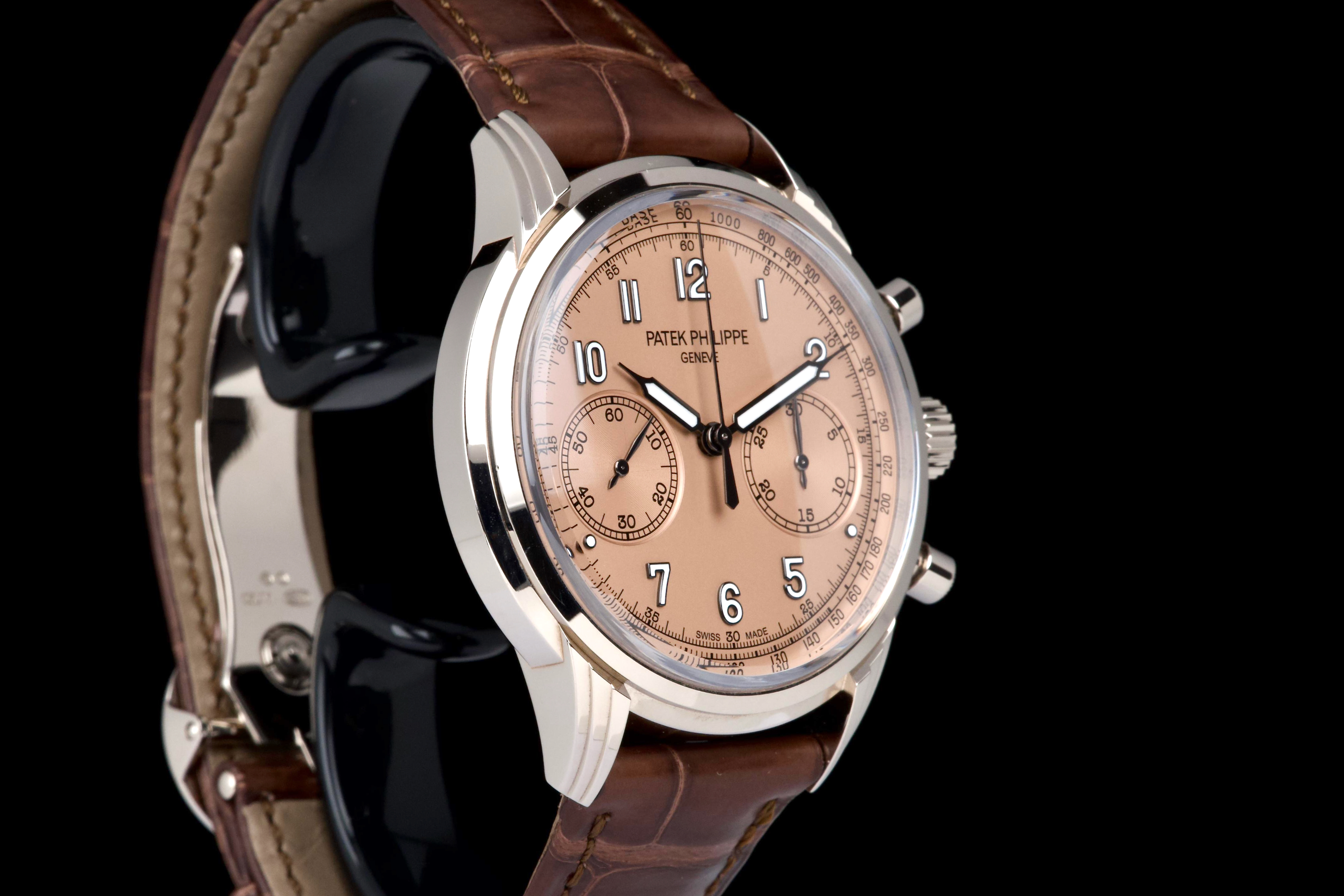 The present Patek Philippe Chronograph reference 5172G, fitted with the highly coveted salmon dial, is offered here as a complete full set and dates to 2025. One of the most celebrated contemporary Patek Philippe chronographs, the 5172G combines classical proportions with the manufacture’s latest-generation hand-wound movement and refined aesthetics. Housed in a 41 mm white-gold case, the watch presents in near-new condition, having been worn only twice. The case, bezel, and lugs remain crisp and virtually untouched, reflecting minimal handling and careful ownership. The standout feature of this example is the warm salmon-toned dial, beautifully balanced with applied white-gold Arabic numerals and elegant feuille hands. This configuration has quickly become one of the most sought-after versions of the reference, offering a perfect blend of vintage inspiration and modern execution. Powered by the in-house calibre CH 29-535 PS, Patek Philippe’s latest manually wound chronograph movement, the watch delivers exceptional performance and finishing, visible through the sapphire caseback. The movement represents the pinnacle of contemporary chronograph engineering, featuring a column wheel and multiple technical innovations. Delivered as a full set from 2025 and preserved in close-to-new condition, this 5172G salmon dial offers a rare opportunity to acquire one of Patek Philippe’s most desirable modern chronographs with immediate wearability and strong long-term collectability.