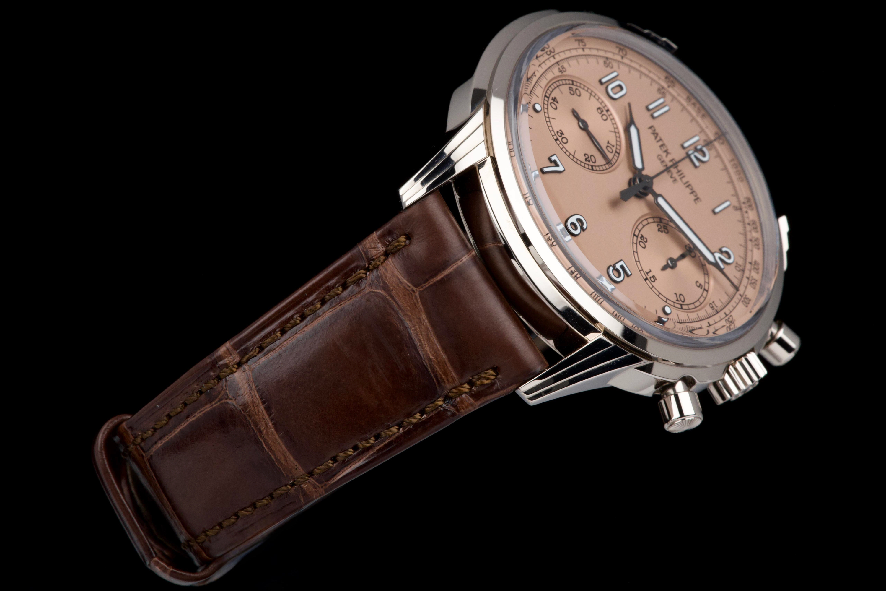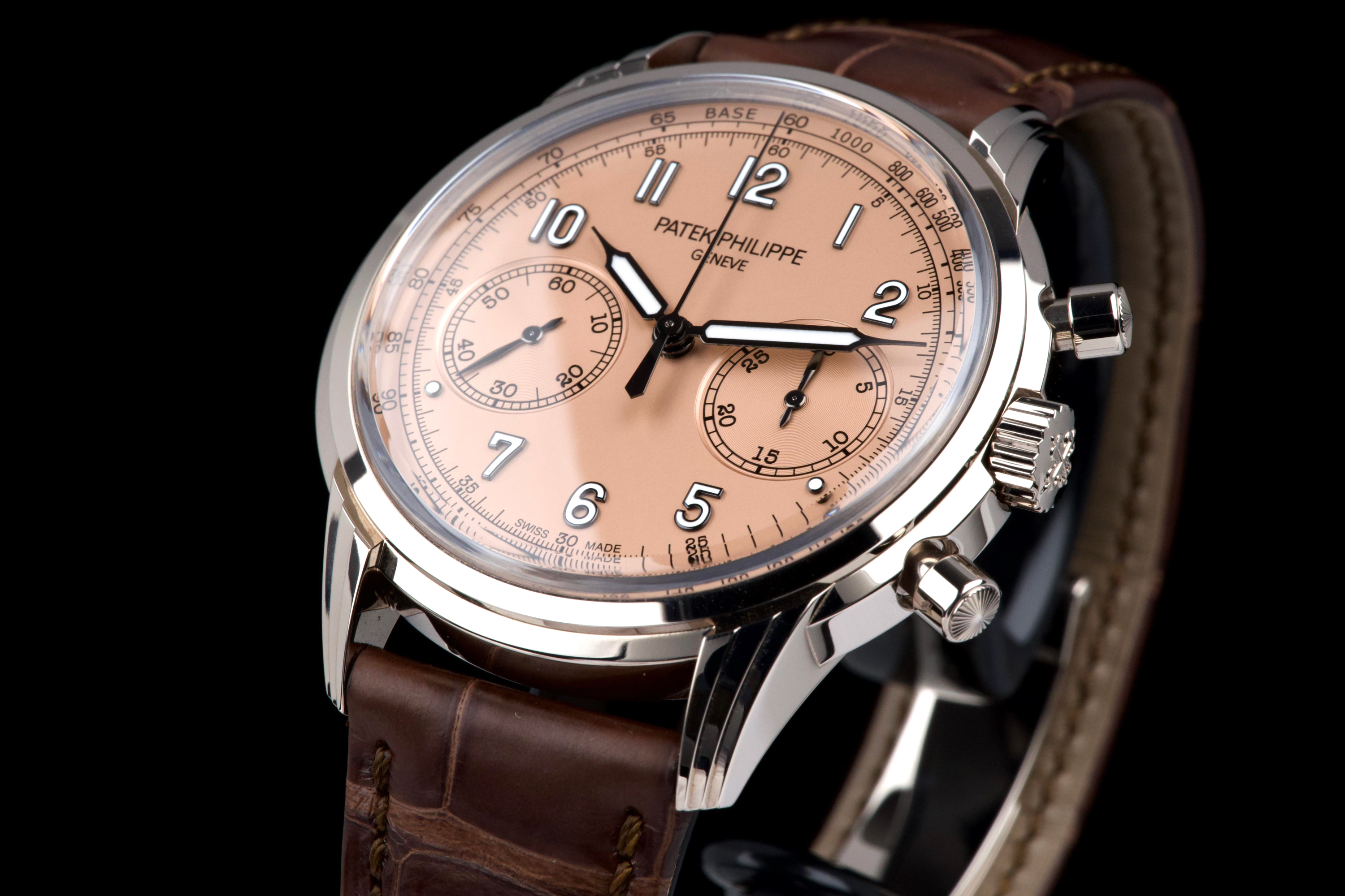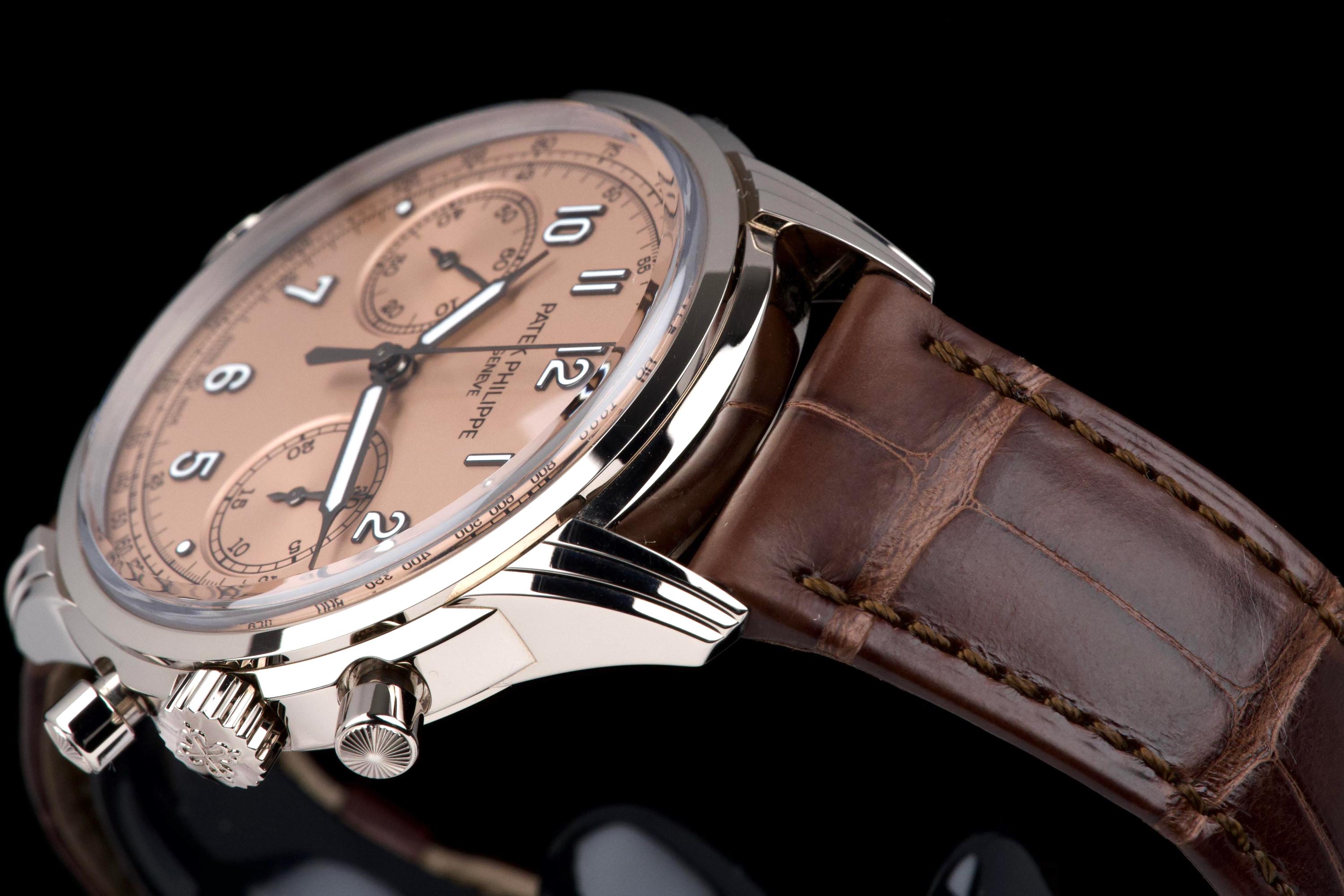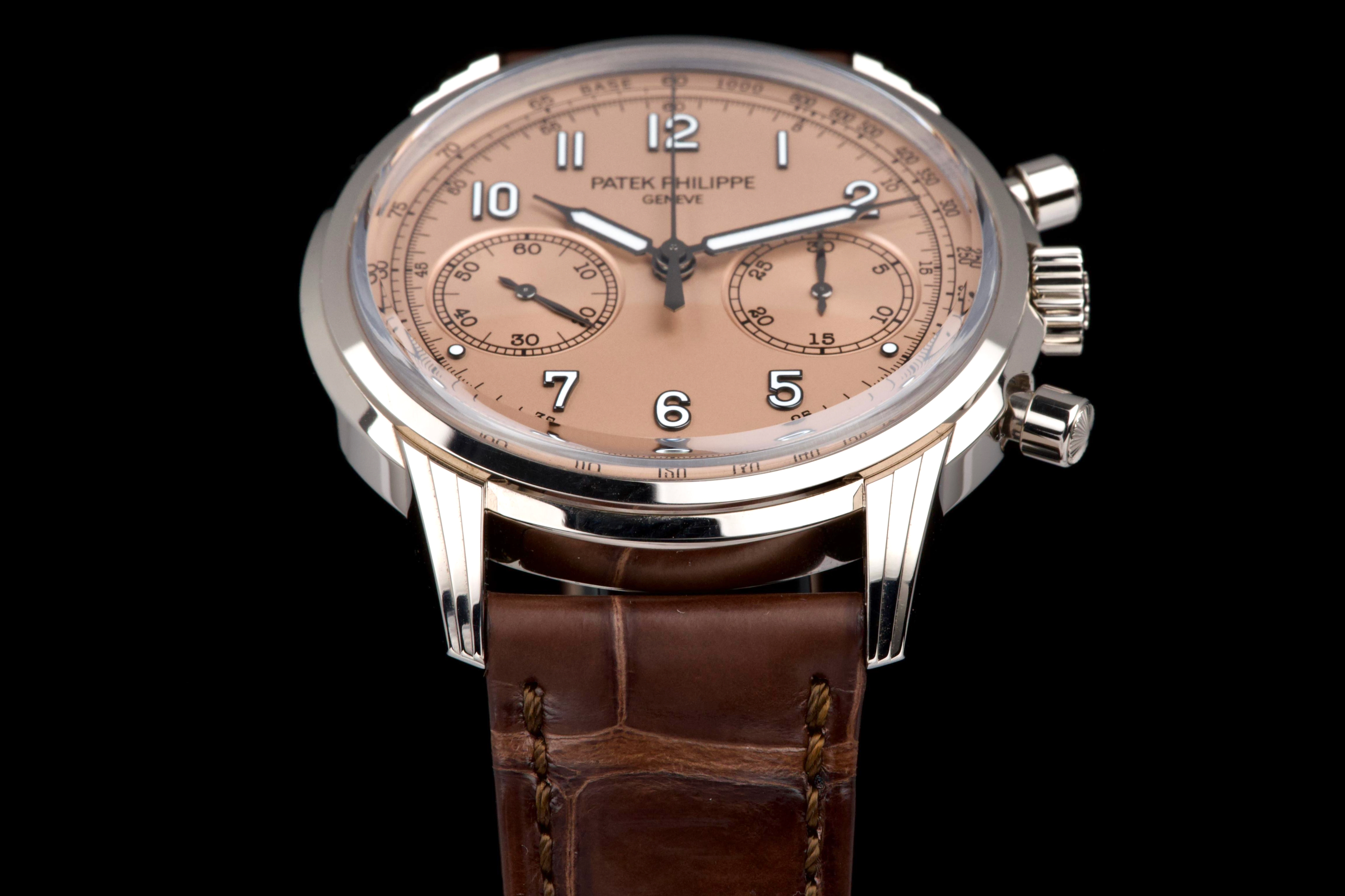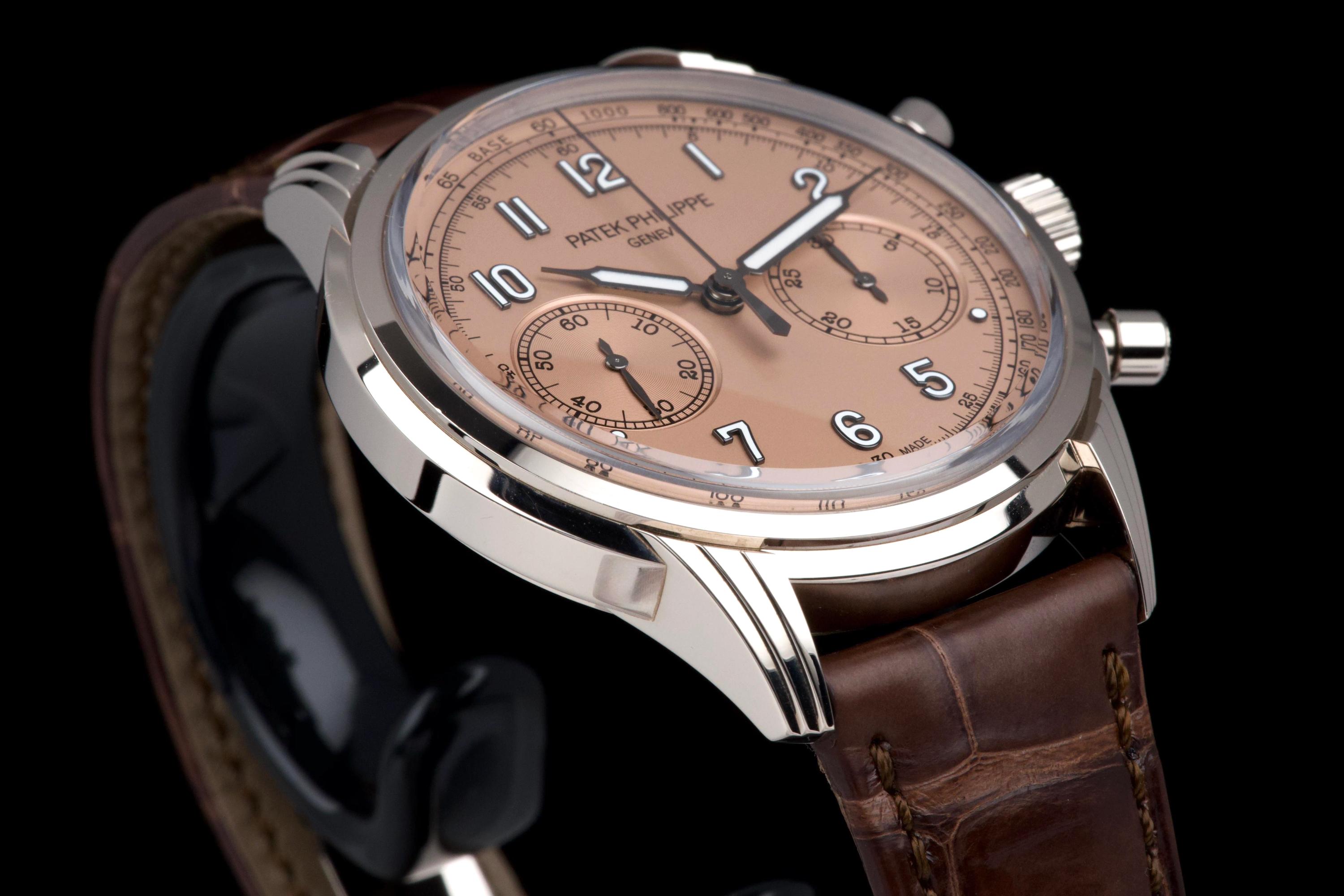 The present Patek Philippe Chronograph reference 5172G, fitted with the highly coveted salmon dial, is offered here as a complete full set and dates to 2025. One of the most celebrated contemporary Patek Philippe chronographs, the 5172G combines classical proportions with the manufacture’s latest-generation hand-wound movement and refined aesthetics. Housed in a 41 mm white-gold case, the watch presents in near-new condition, having been worn only twice. The case, bezel, and lugs remain crisp and virtually untouched, reflecting minimal handling and careful ownership. The standout feature of this example is the warm salmon-toned dial, beautifully balanced with applied white-gold Arabic numerals and elegant feuille hands. This configuration has quickly become one of the most sought-after versions of the reference, offering a perfect blend of vintage inspiration and modern execution. Powered by the in-house calibre CH 29-535 PS, Patek Philippe’s latest manually wound chronograph movement, the watch delivers exceptional performance and finishing, visible through the sapphire caseback. The movement represents the pinnacle of contemporary chronograph engineering, featuring a column wheel and multiple technical innovations. Delivered as a full set from 2025 and preserved in close-to-new condition, this 5172G salmon dial offers a rare opportunity to acquire one of Patek Philippe’s most desirable modern chronographs with immediate wearability and strong long-term collectability.