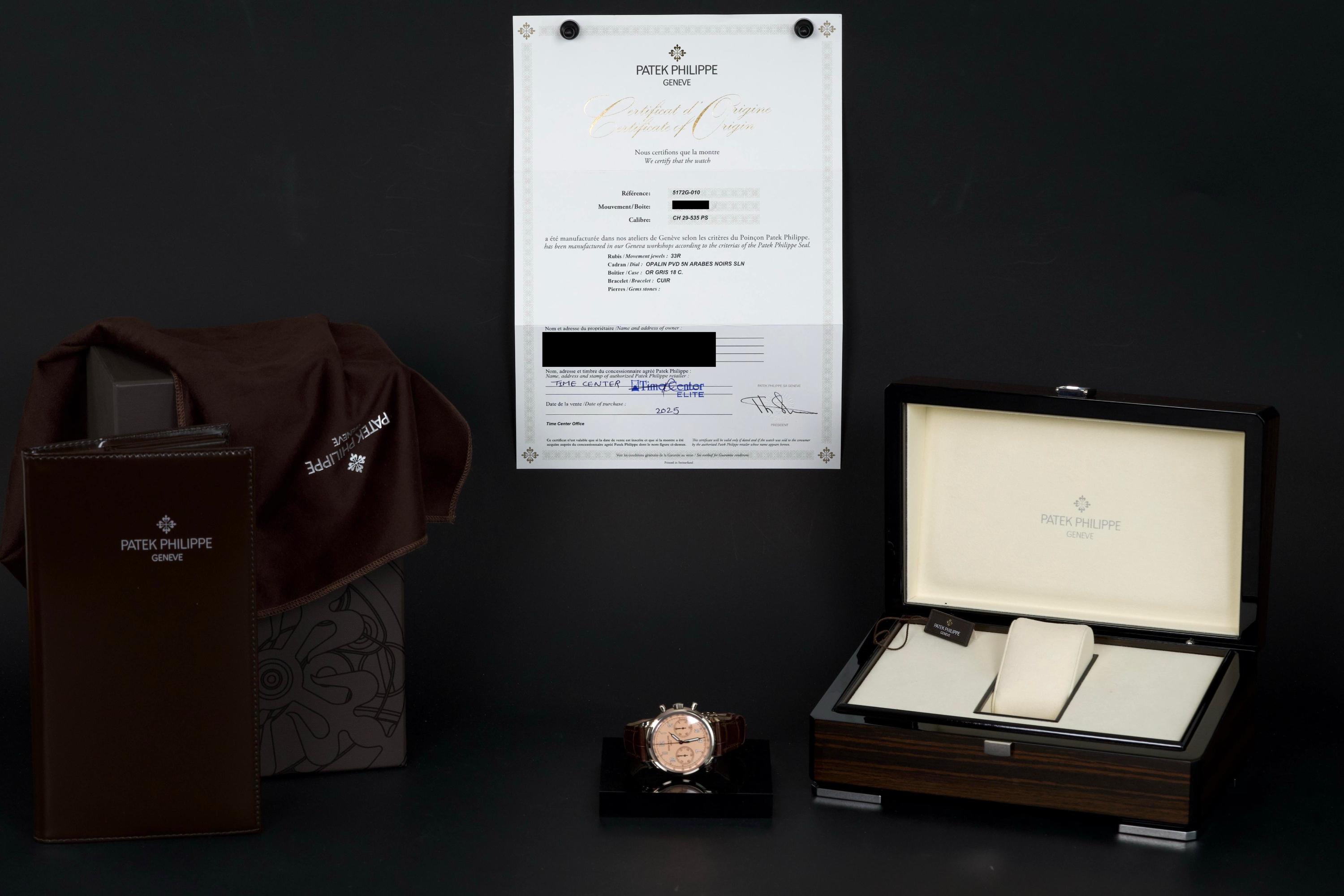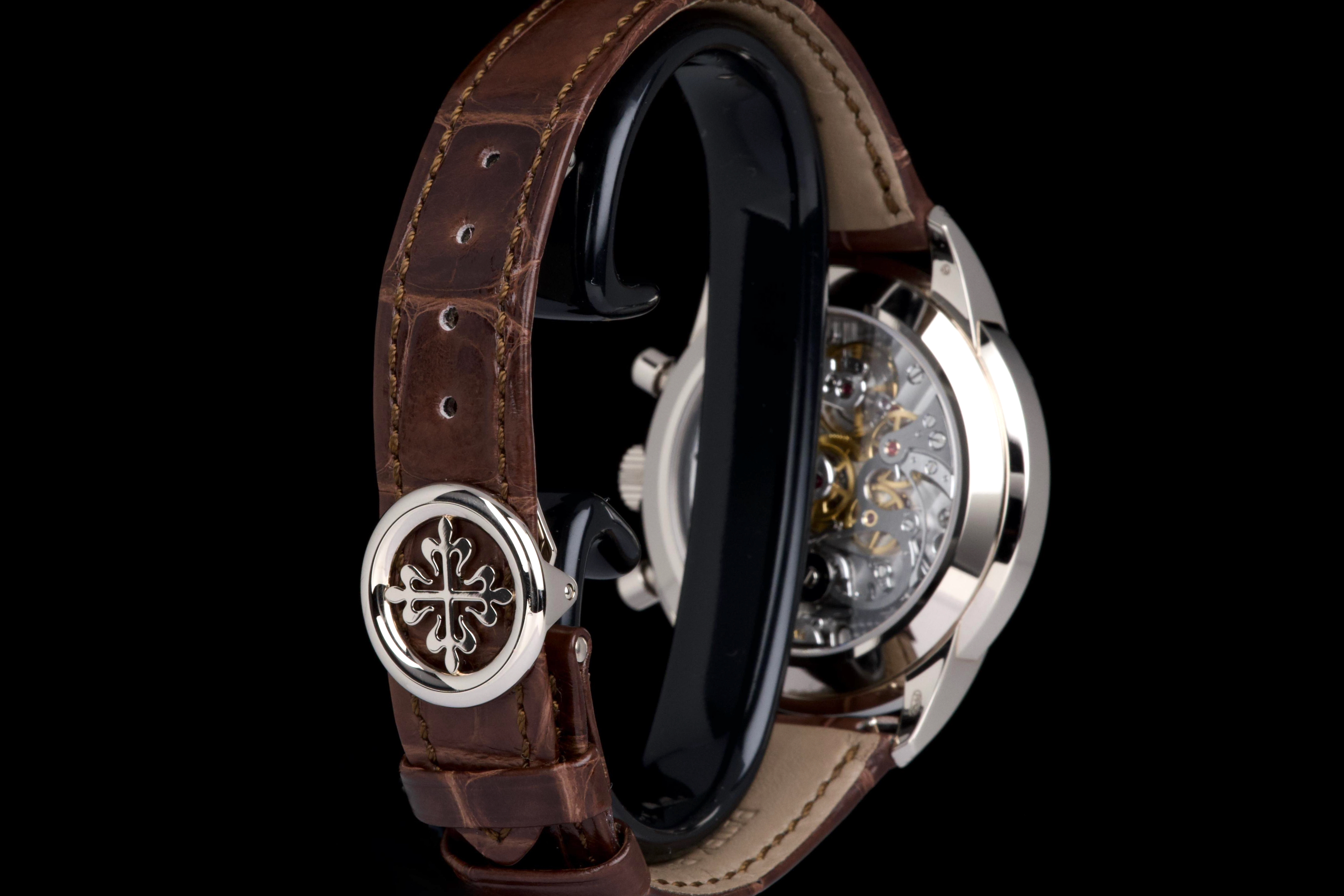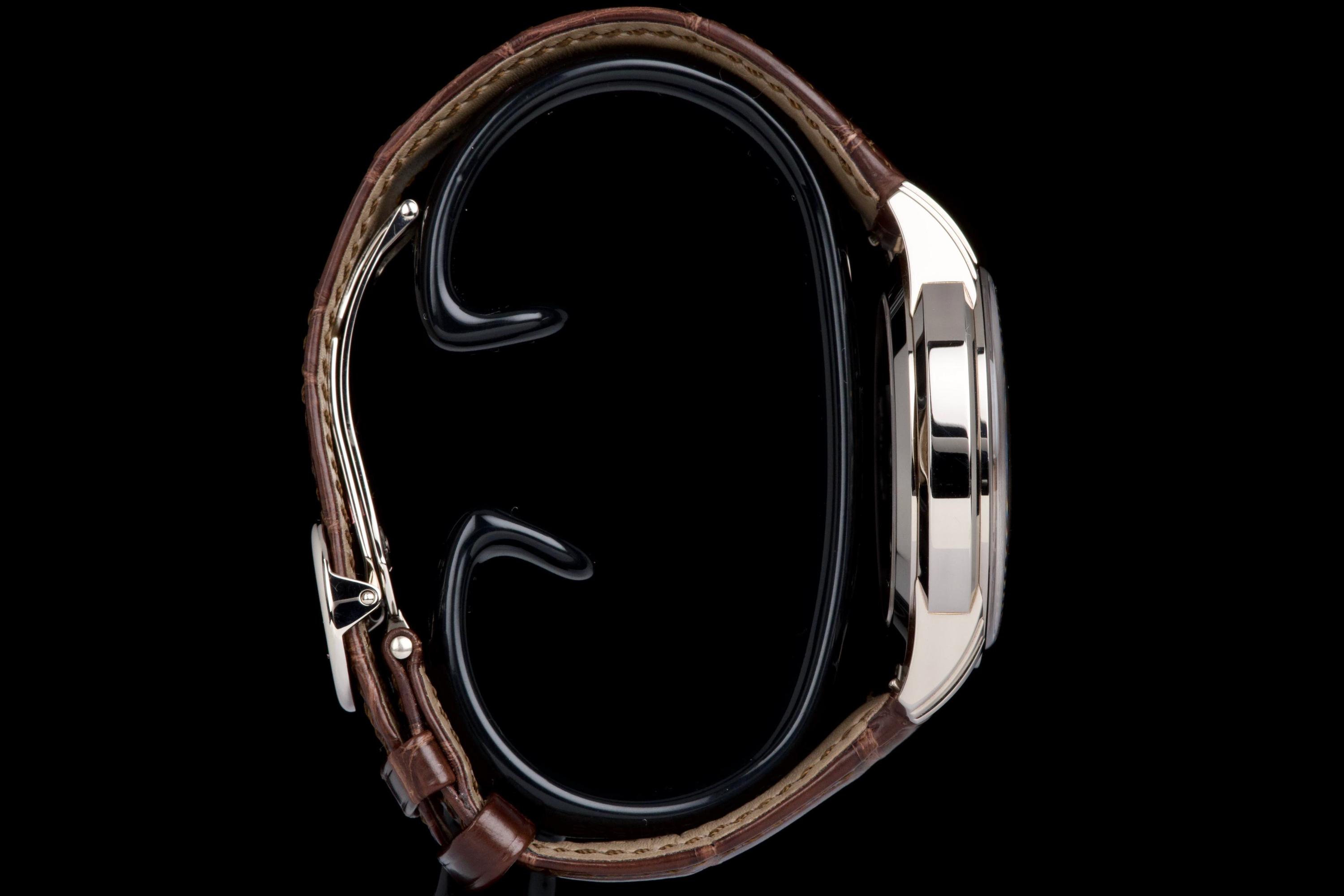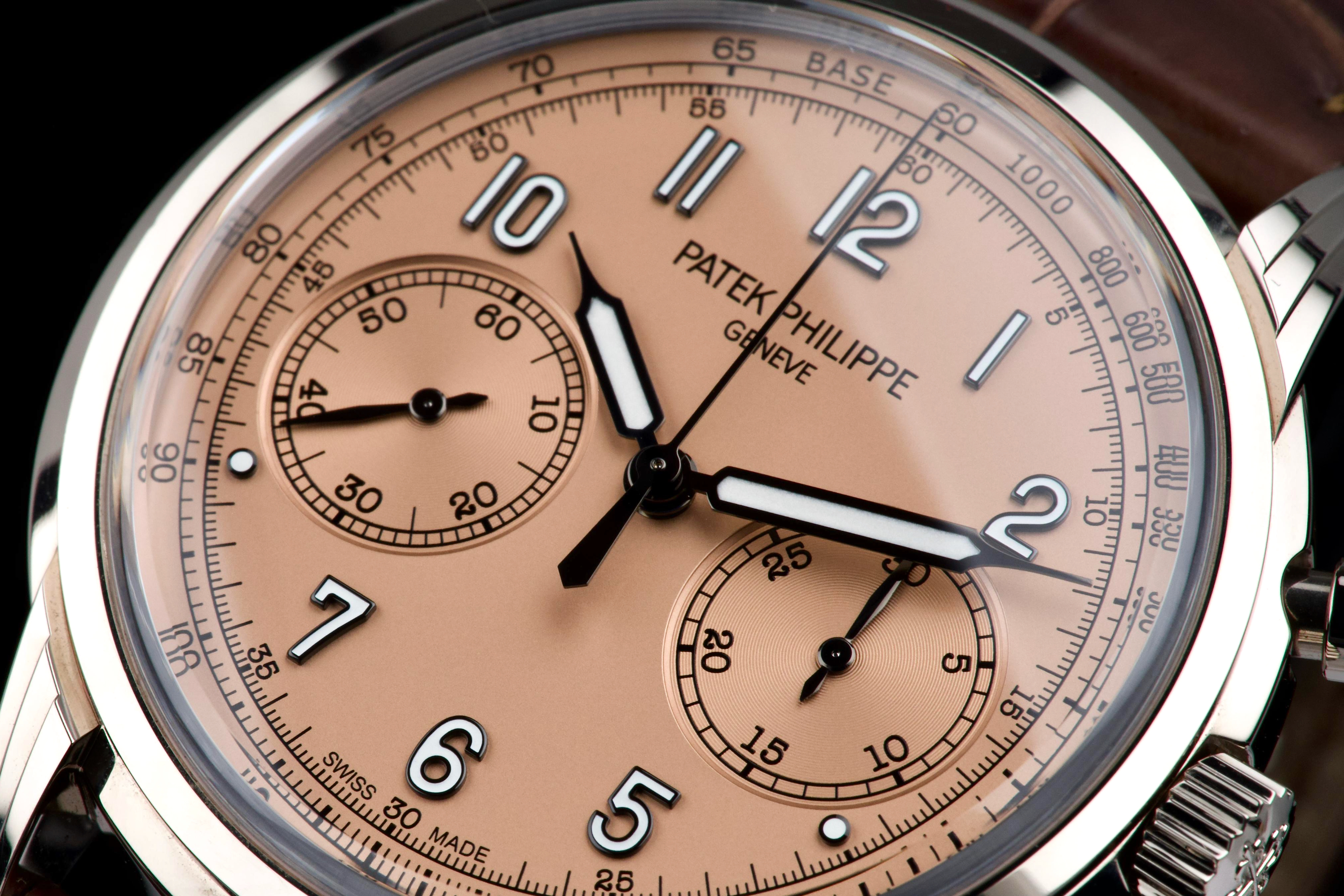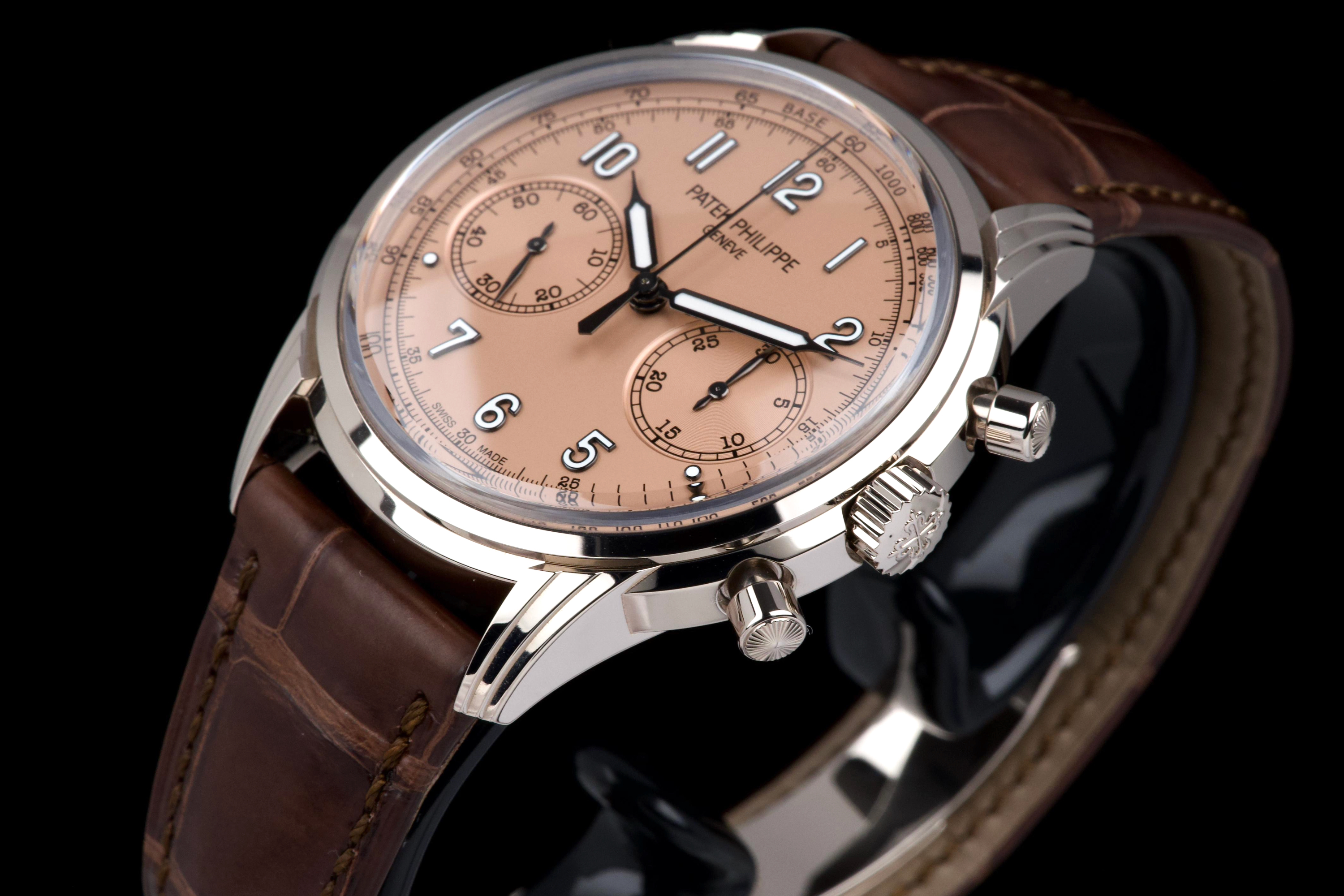 The present Patek Philippe Chronograph reference 5172G, fitted with the highly coveted salmon dial, is offered here as a complete full set and dates to 2025. One of the most celebrated contemporary Patek Philippe chronographs, the 5172G combines classical proportions with the manufacture’s latest-generation hand-wound movement and refined aesthetics. Housed in a 41 mm white-gold case, the watch presents in near-new condition, having been worn only twice. The case, bezel, and lugs remain crisp and virtually untouched, reflecting minimal handling and careful ownership. The standout feature of this example is the warm salmon-toned dial, beautifully balanced with applied white-gold Arabic numerals and elegant feuille hands. This configuration has quickly become one of the most sought-after versions of the reference, offering a perfect blend of vintage inspiration and modern execution. Powered by the in-house calibre CH 29-535 PS, Patek Philippe’s latest manually wound chronograph movement, the watch delivers exceptional performance and finishing, visible through the sapphire caseback. The movement represents the pinnacle of contemporary chronograph engineering, featuring a column wheel and multiple technical innovations. Delivered as a full set from 2025 and preserved in close-to-new condition, this 5172G salmon dial offers a rare opportunity to acquire one of Patek Philippe’s most desirable modern chronographs with immediate wearability and strong long-term collectability.