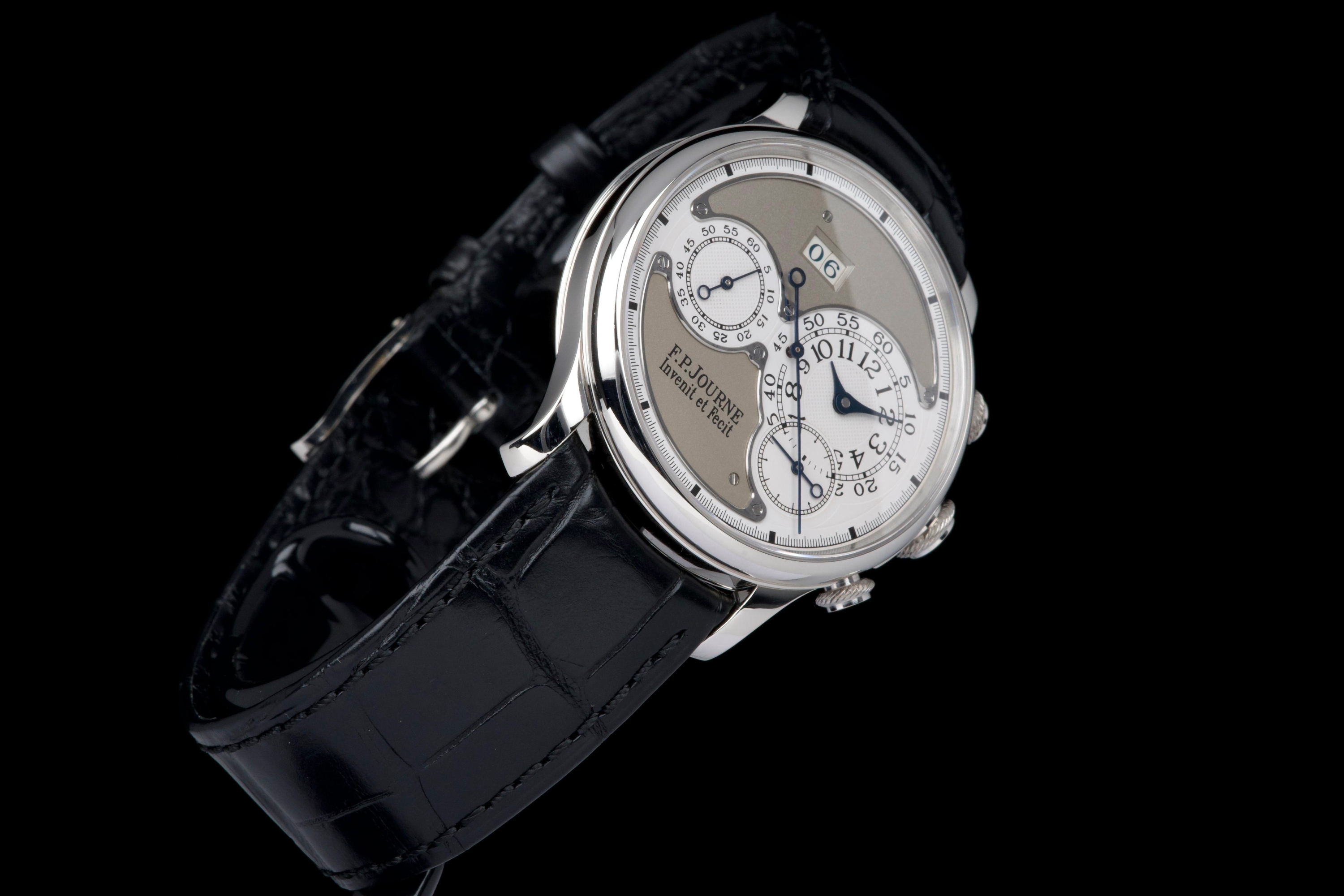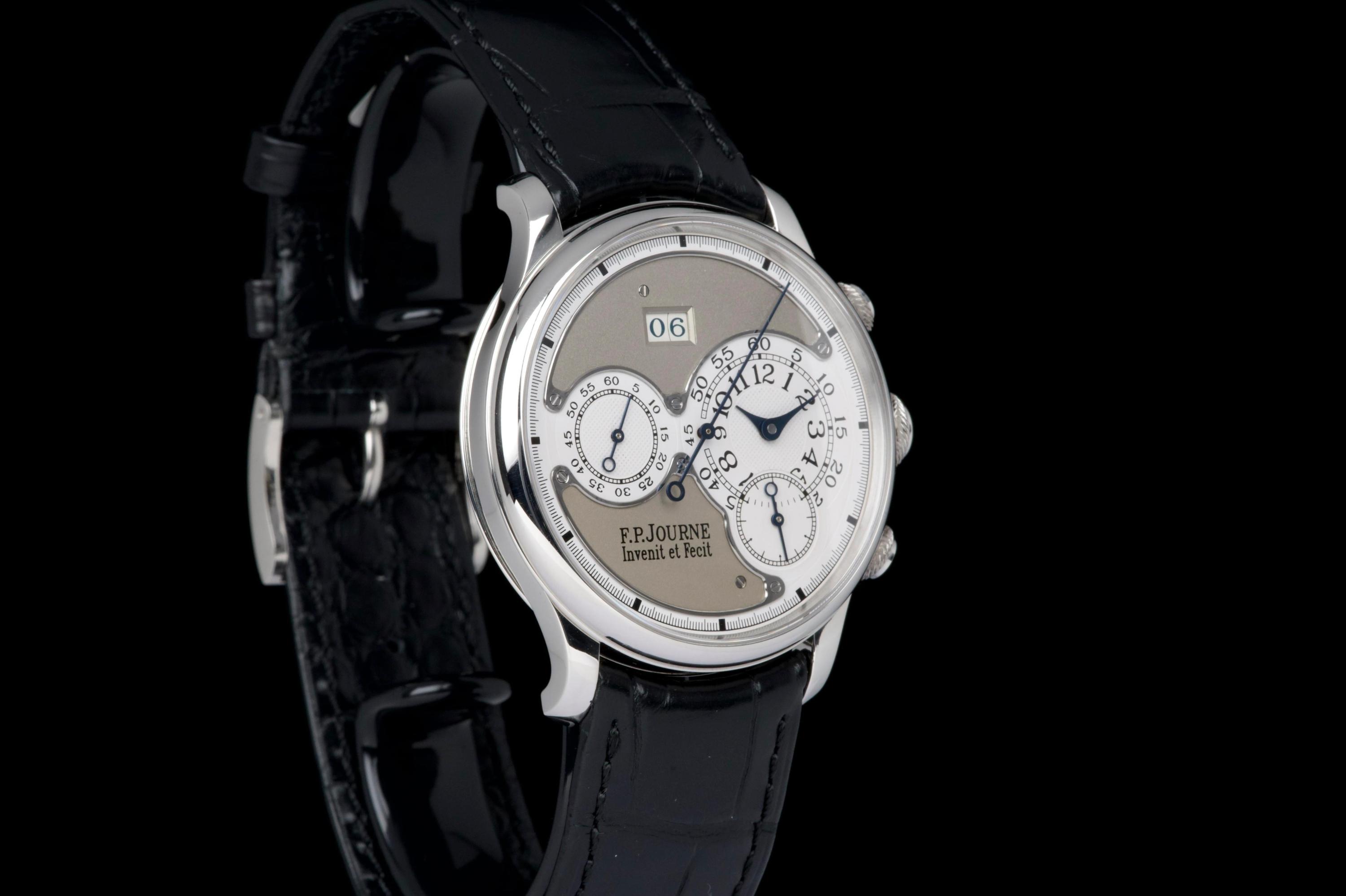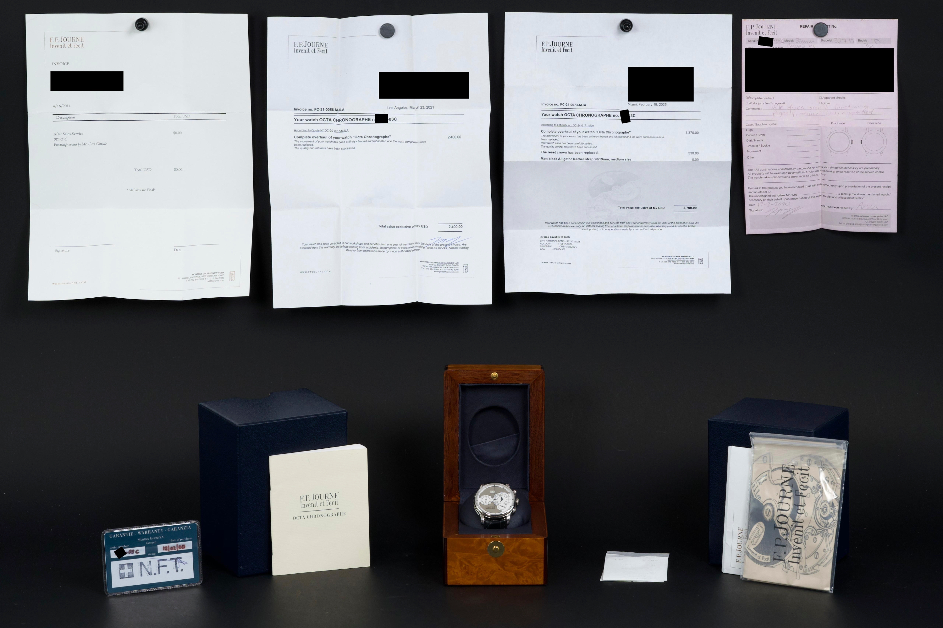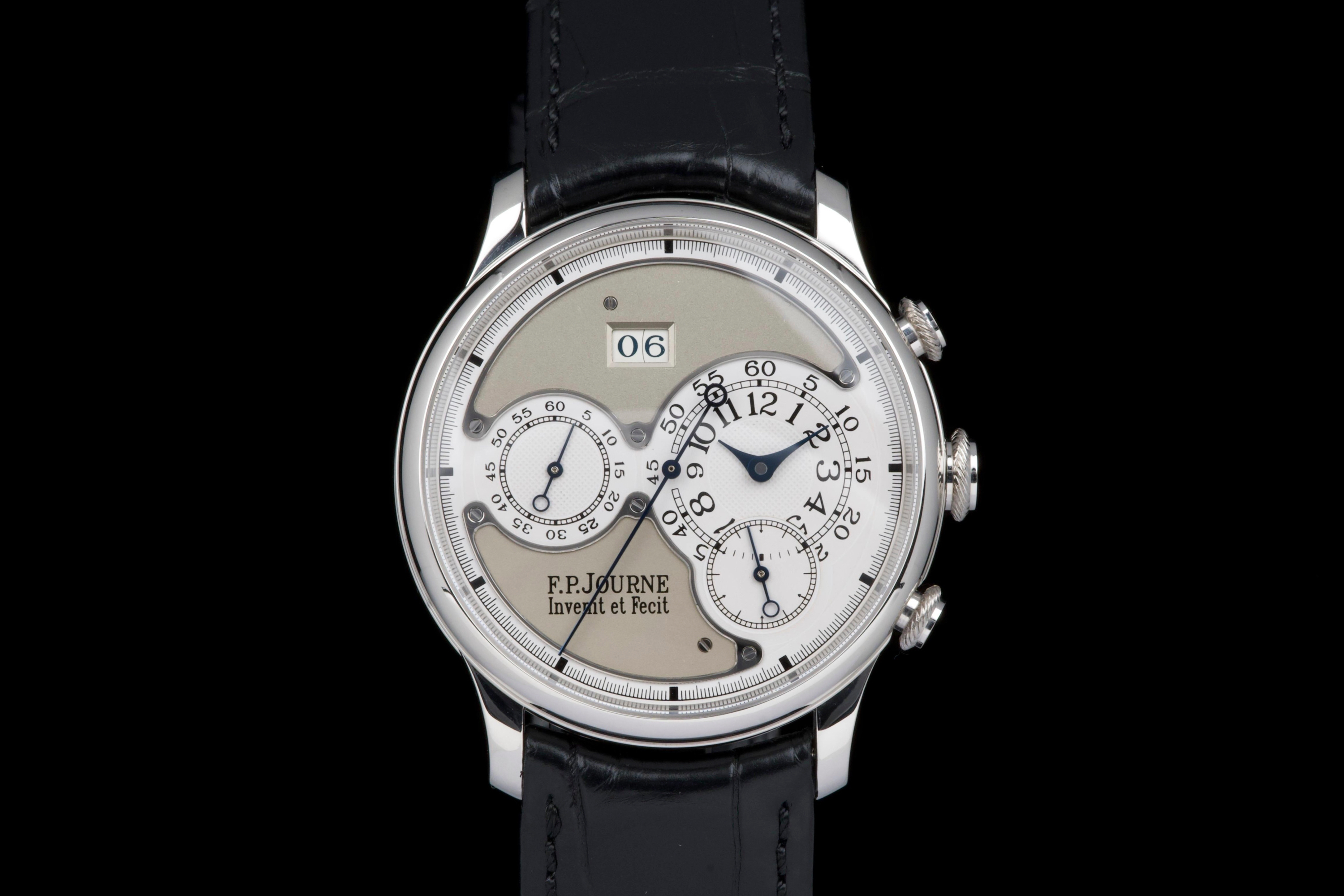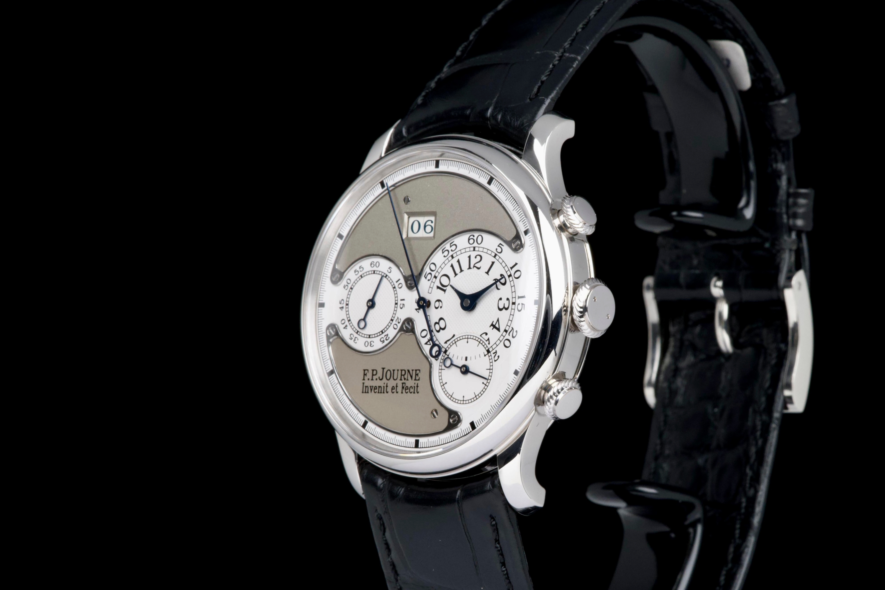 F.P Journe Octa Chronograph with early brass movement, platinum case on a strap with a matching platinum tang buckle, automatic brass FP Journe caliber 1300 movement, 60-minute chronograph, 120-hour power reserve, white gold dial with off center guilloche hour and minutes, minute totalizer for the chronograph at 9 o'clock, small seconds at 6 o'clock, sapphire crystal, display back, size 38mm, thickness 10mm, serial 08X - 03C, top condition with original FP Journe box and papers dated 2005 (produced in 2003). This watch was recently fully serviced by FP Journe in 2025. It also comes with service papers from 2014, 2020 and 2021.