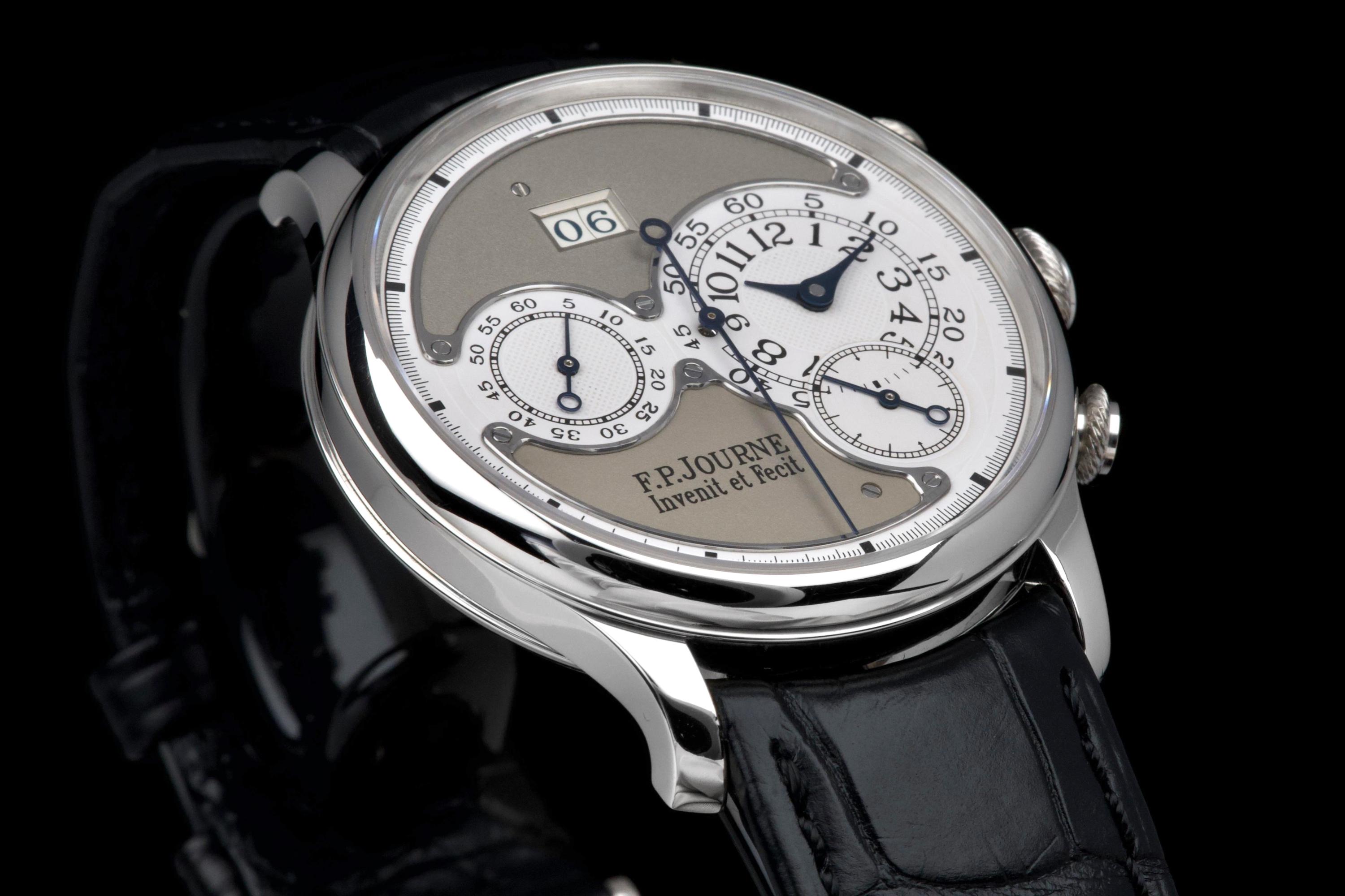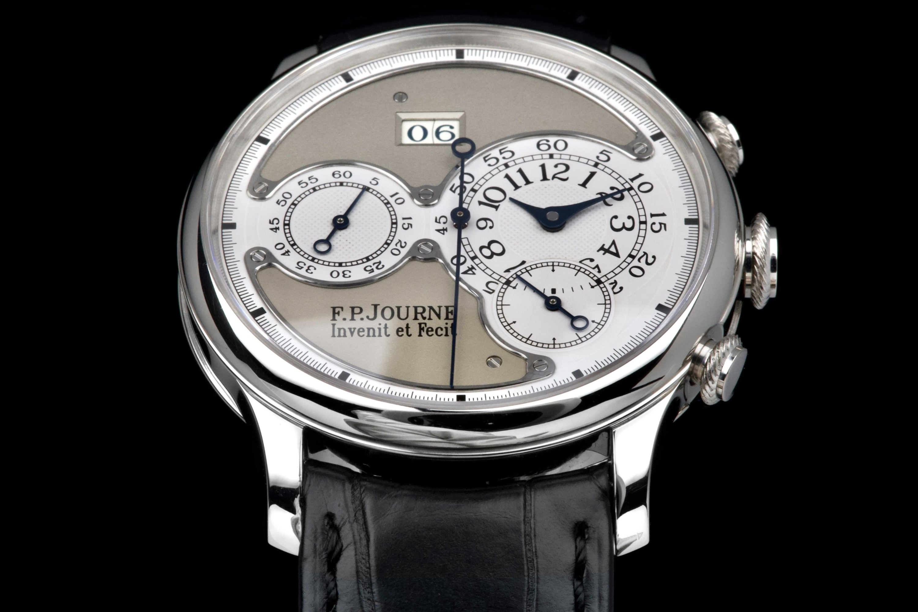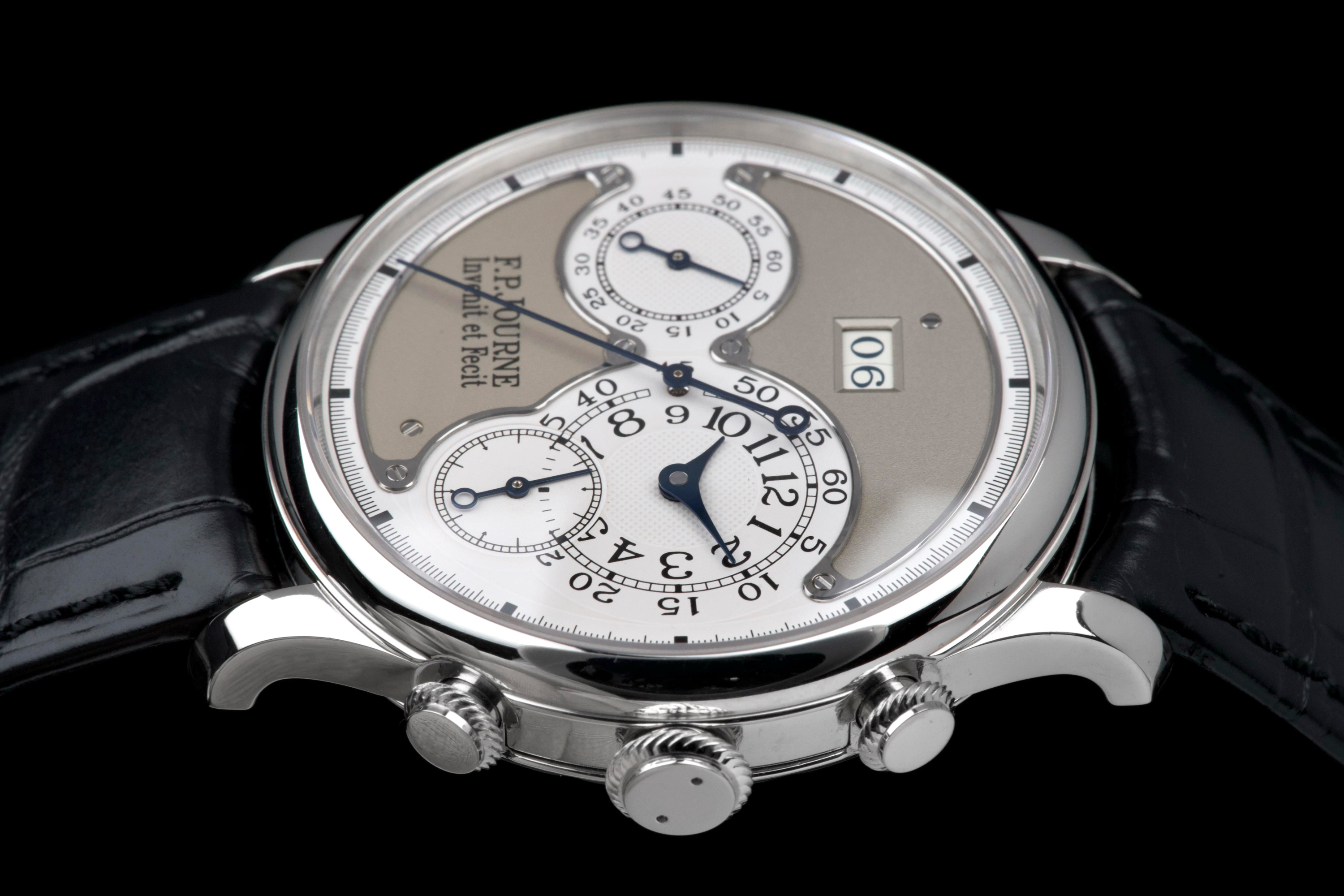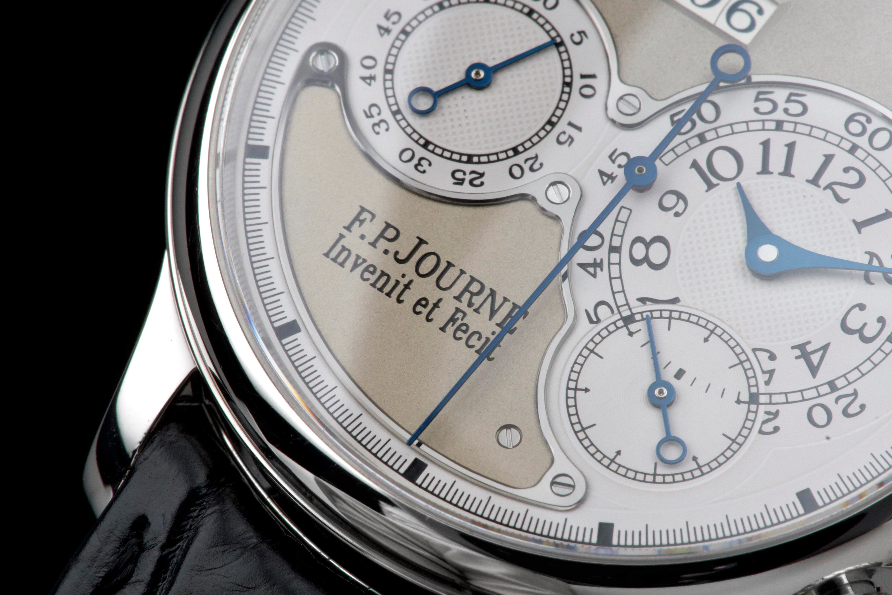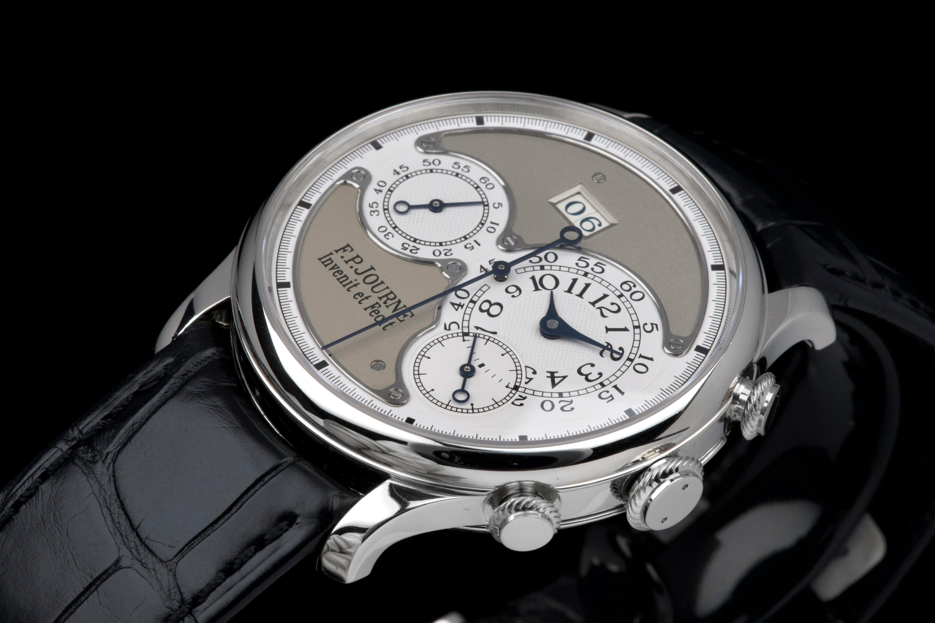 F.P Journe Octa Chronograph with early brass movement, platinum case on a strap with a matching platinum tang buckle, automatic brass FP Journe caliber 1300 movement, 60-minute chronograph, 120-hour power reserve, white gold dial with off center guilloche hour and minutes, minute totalizer for the chronograph at 9 o'clock, small seconds at 6 o'clock, sapphire crystal, display back, size 38mm, thickness 10mm, serial 08X - 03C, top condition with original FP Journe box and papers dated 2005 (produced in 2003). This watch was recently fully serviced by FP Journe in 2025. It also comes with service papers from 2014, 2020 and 2021.