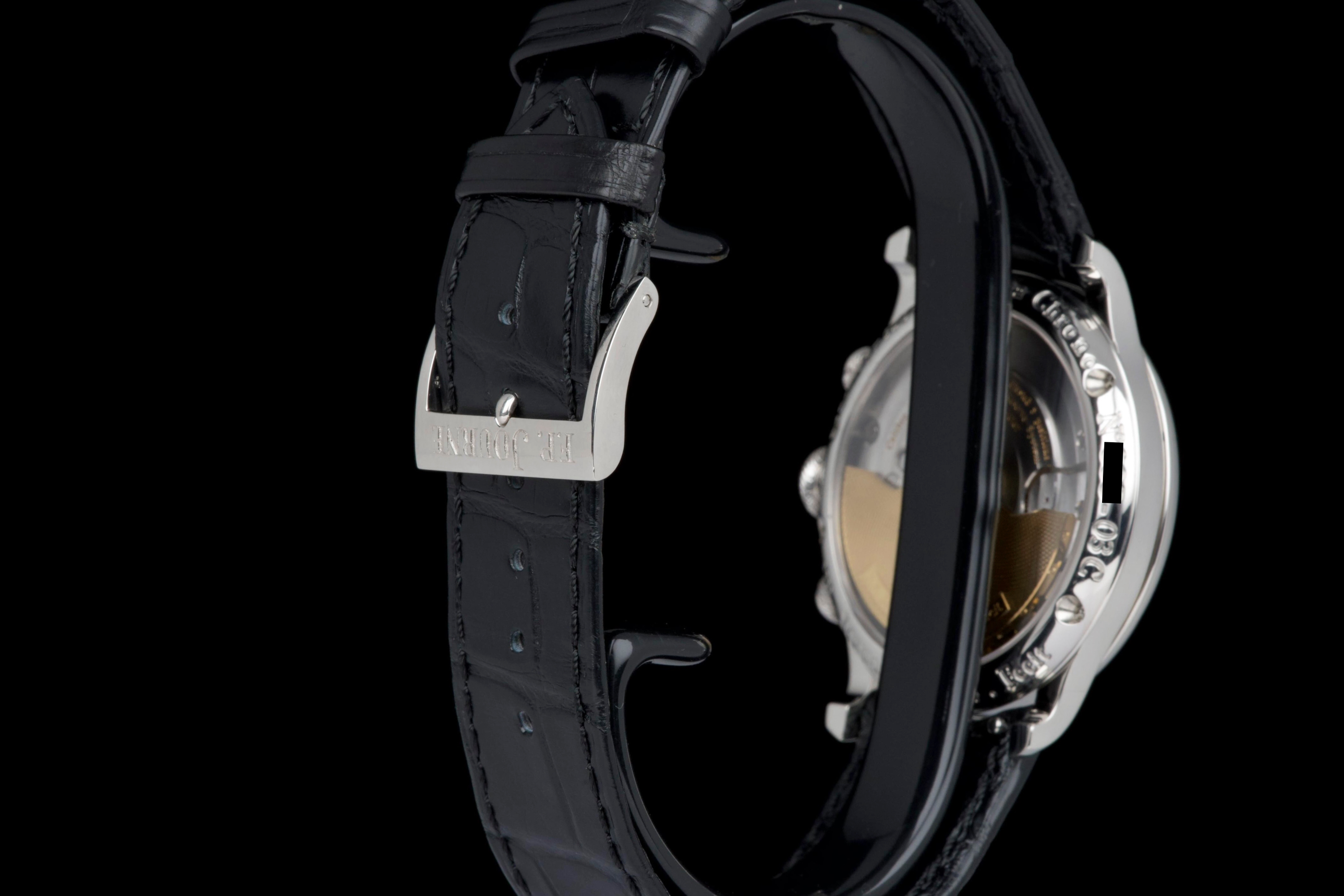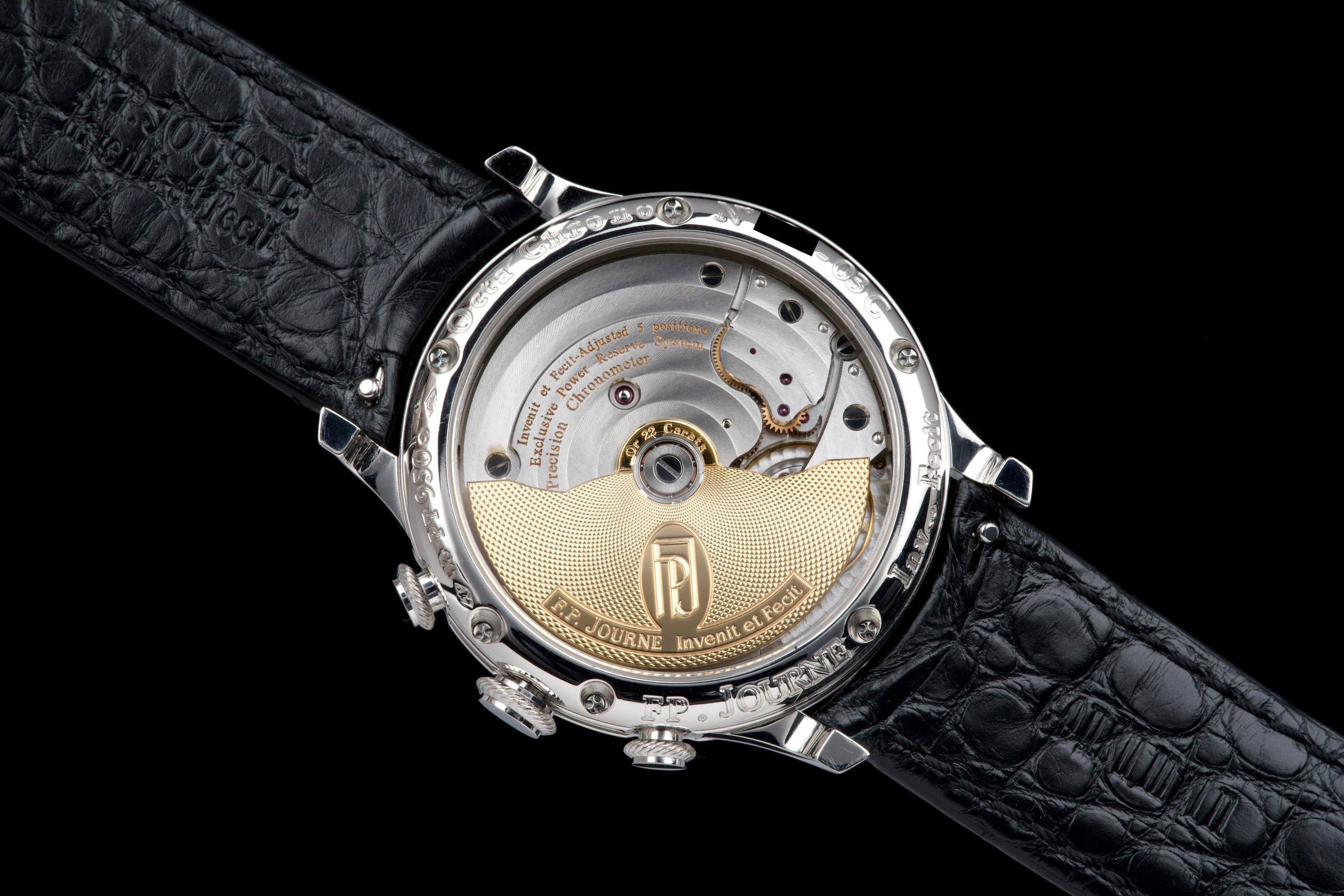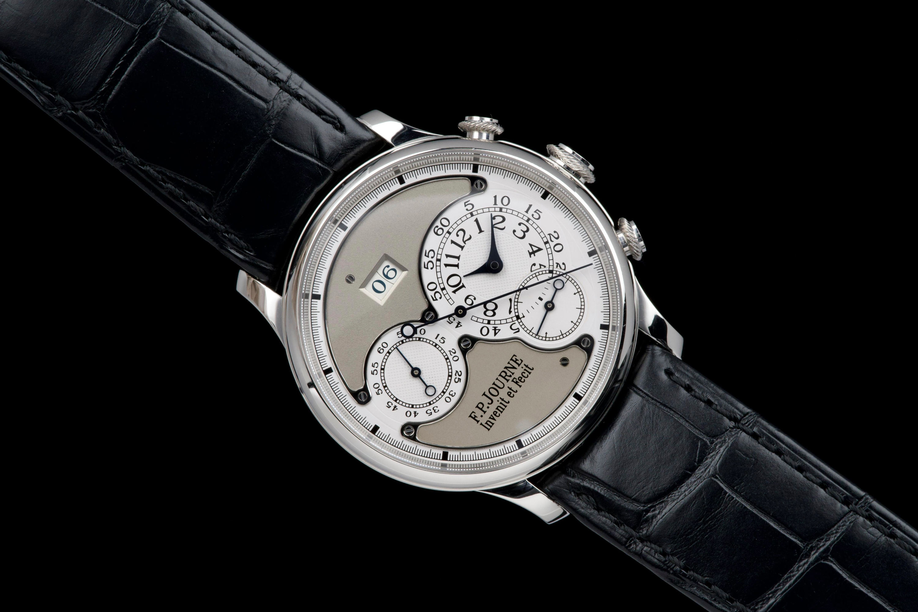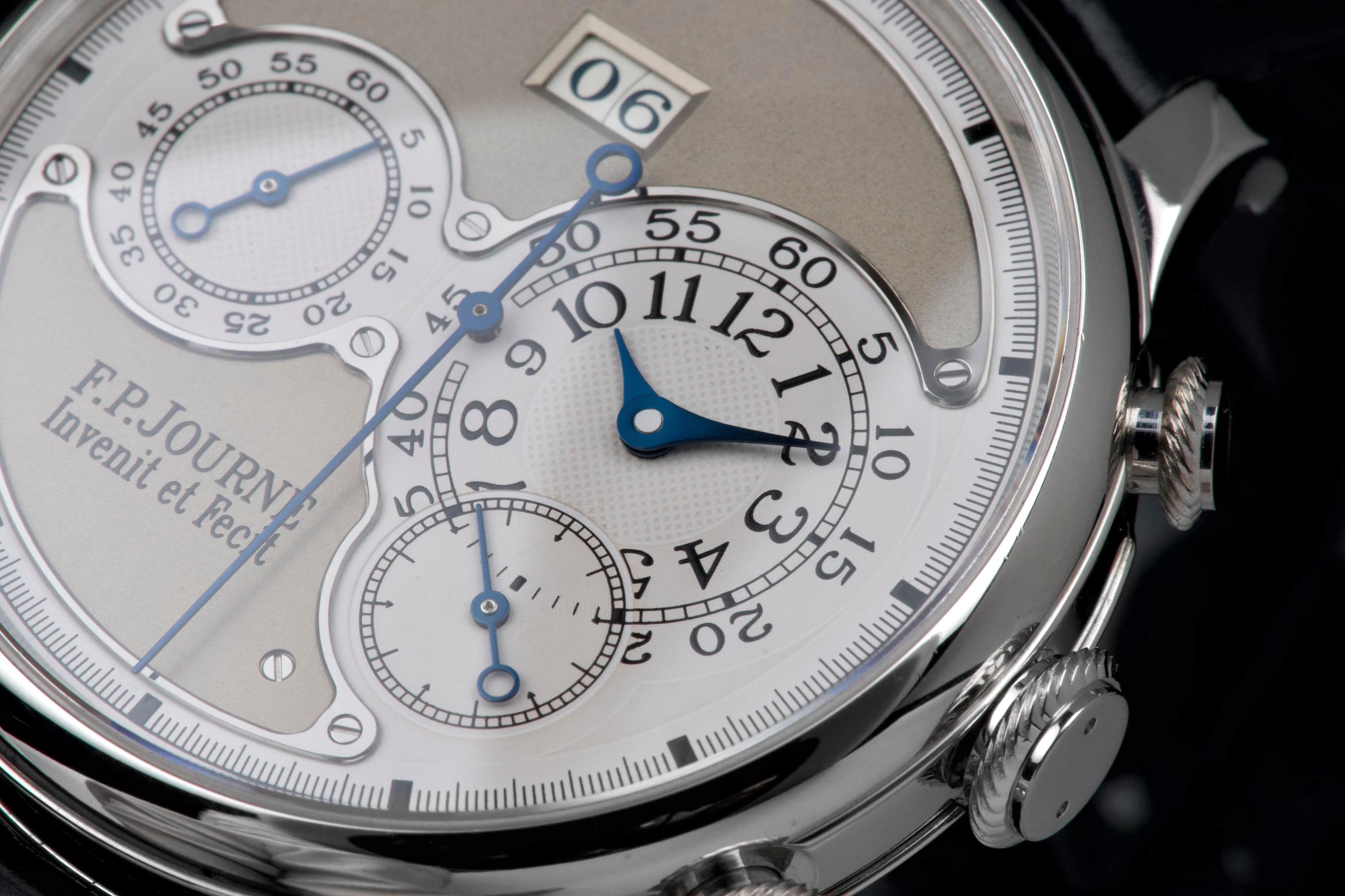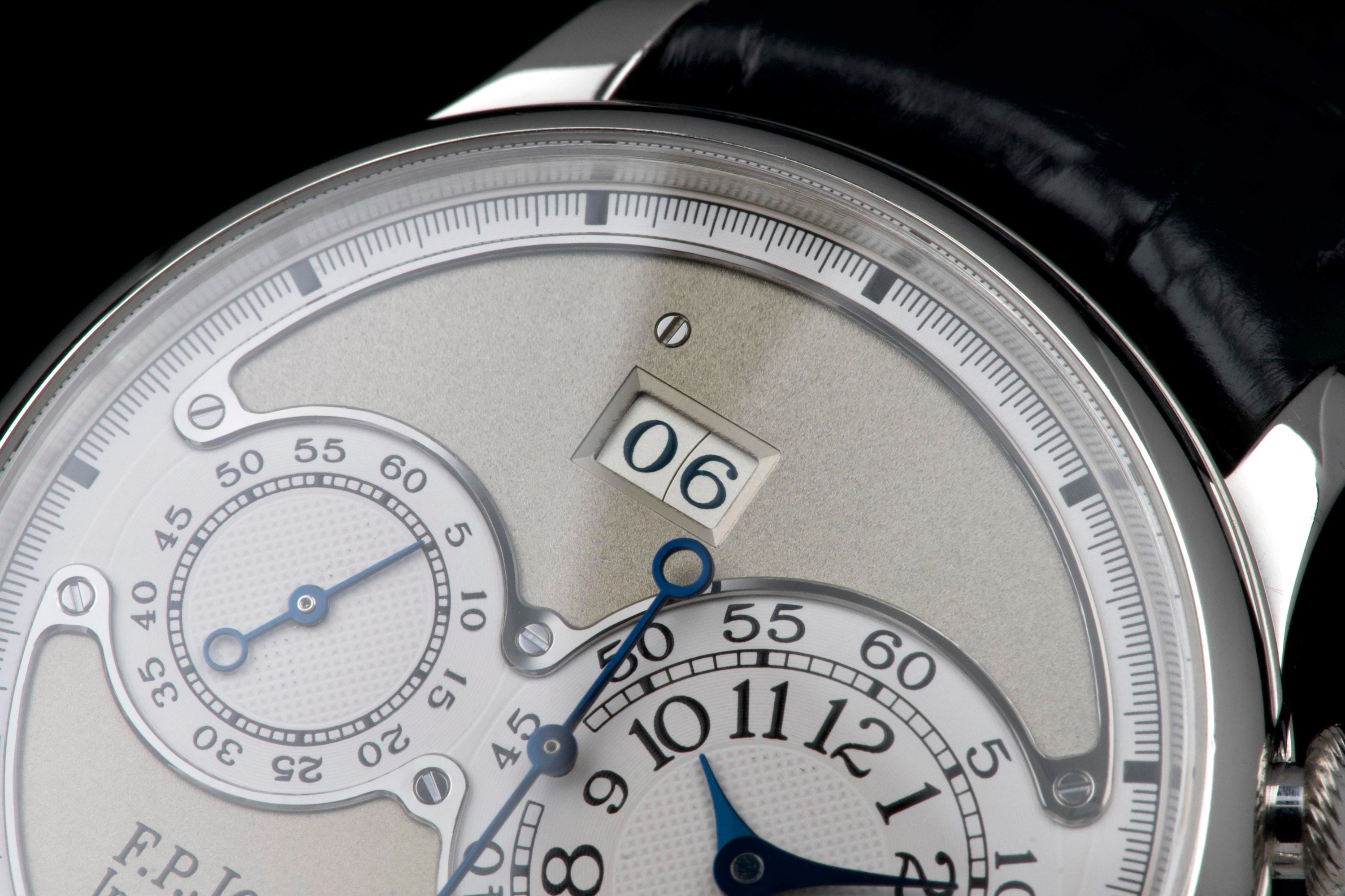 F.P Journe Octa Chronograph with early brass movement, platinum case on a strap with a matching platinum tang buckle, automatic brass FP Journe caliber 1300 movement, 60-minute chronograph, 120-hour power reserve, white gold dial with off center guilloche hour and minutes, minute totalizer for the chronograph at 9 o'clock, small seconds at 6 o'clock, sapphire crystal, display back, size 38mm, thickness 10mm, serial 08X - 03C, top condition with original FP Journe box and papers dated 2005 (produced in 2003). This watch was recently fully serviced by FP Journe in 2025. It also comes with service papers from 2014, 2020 and 2021.