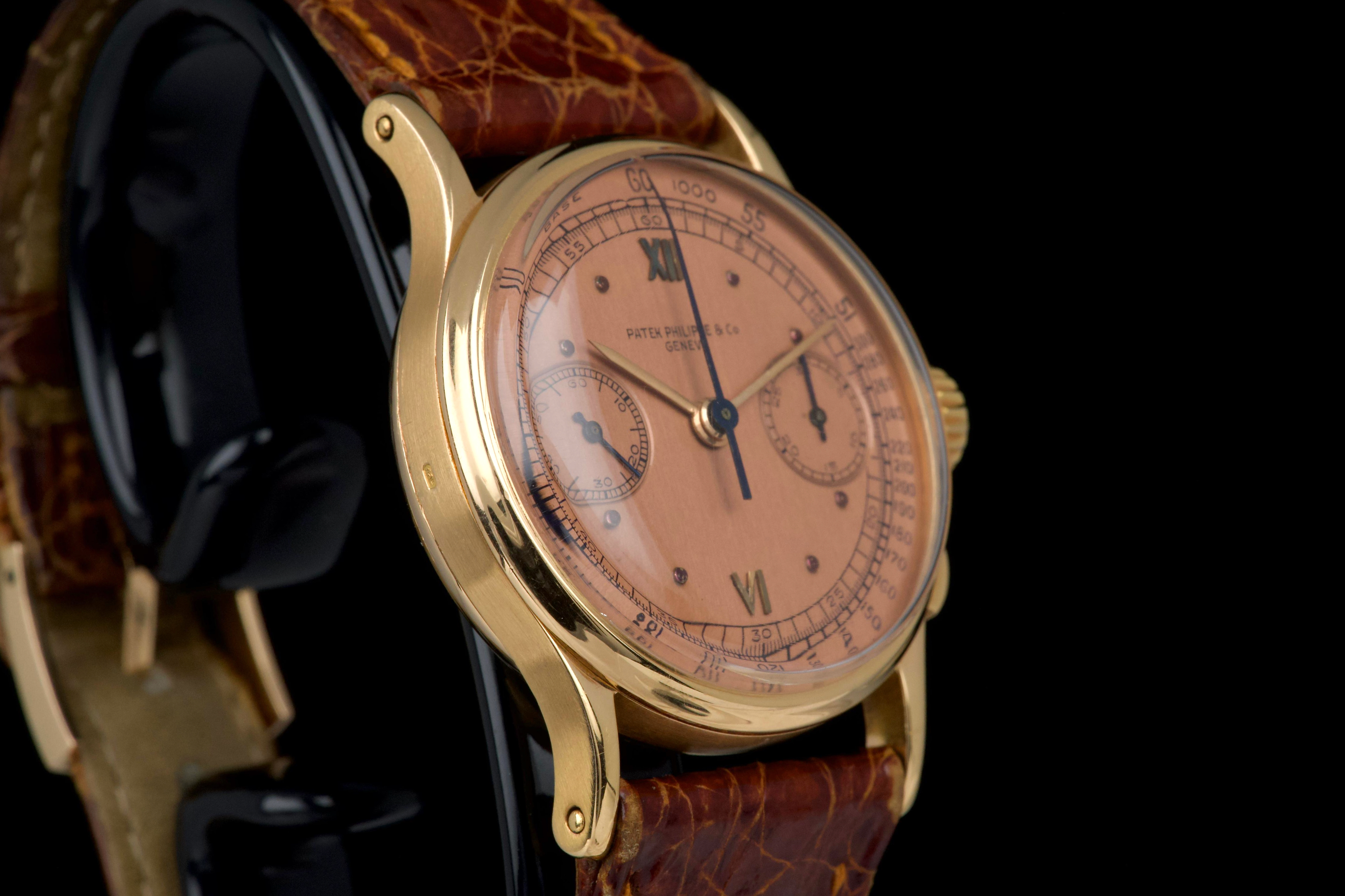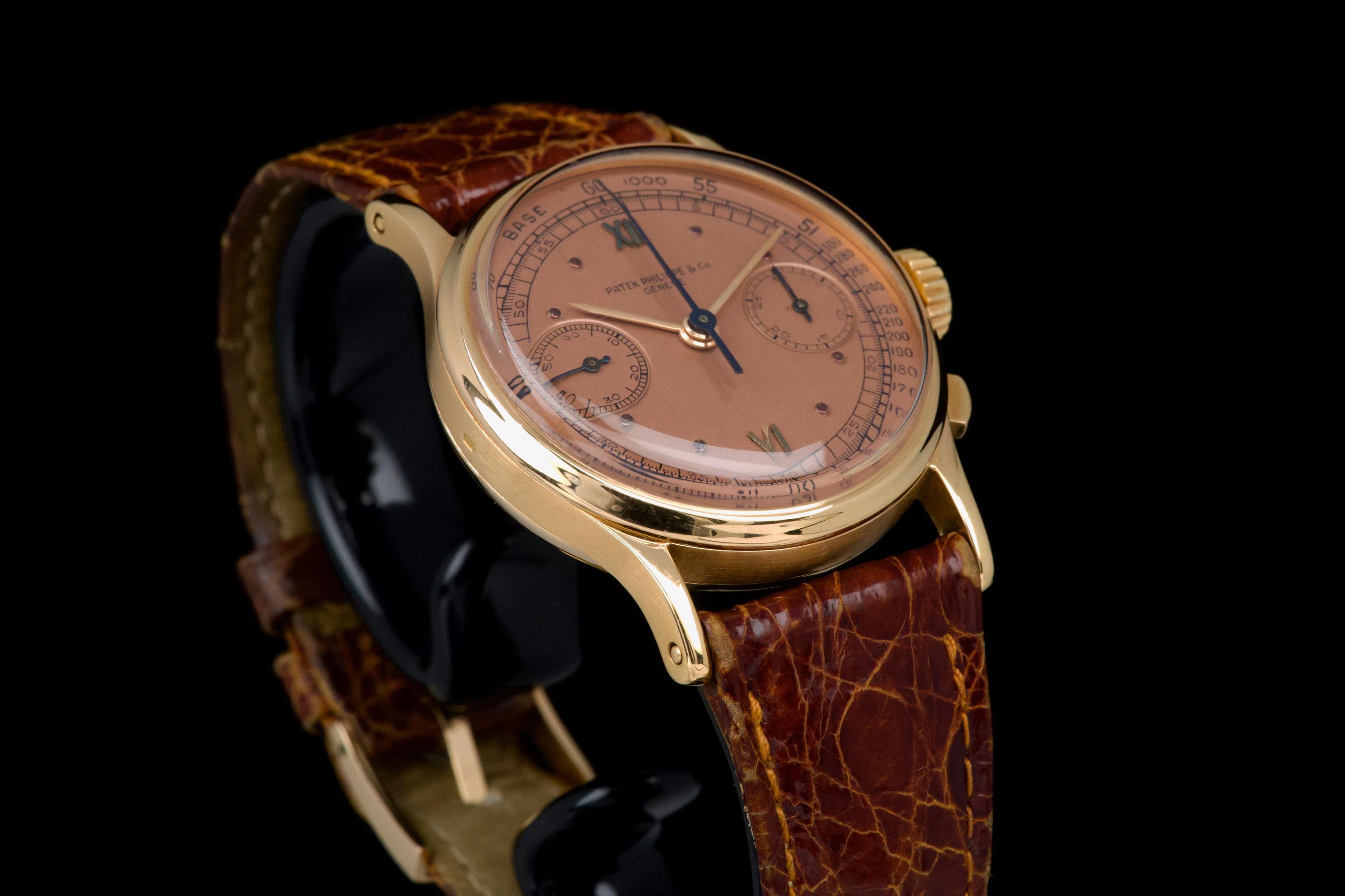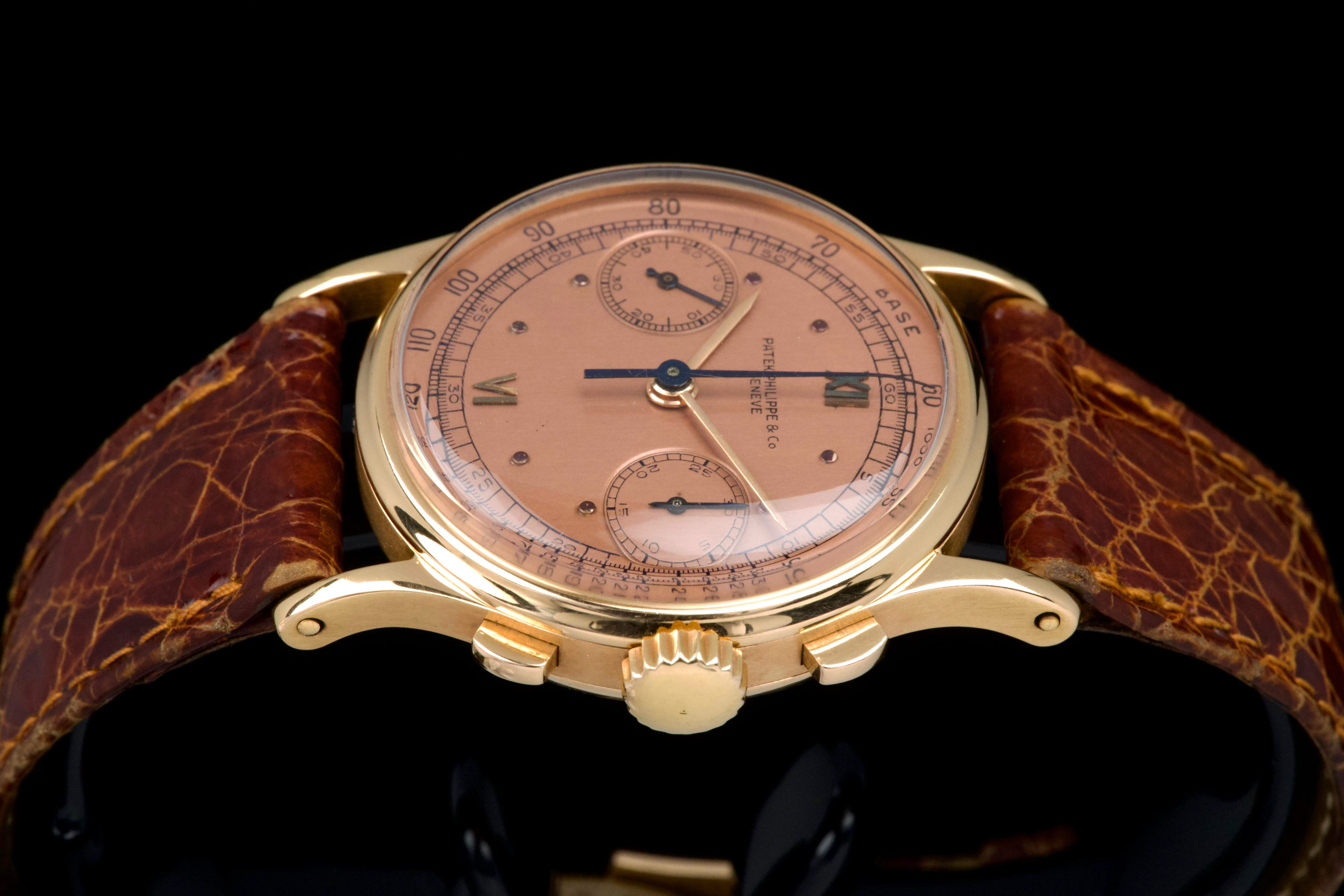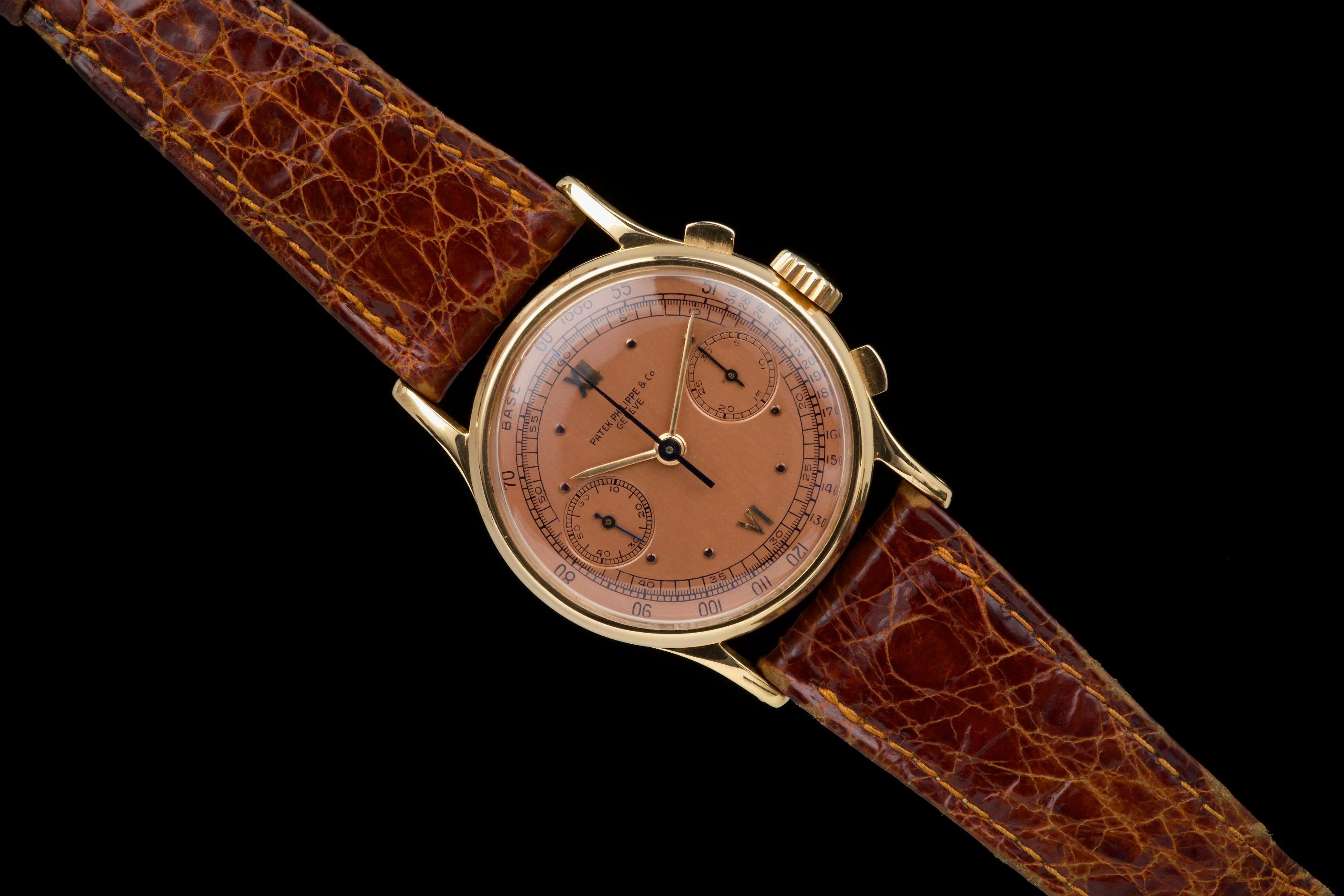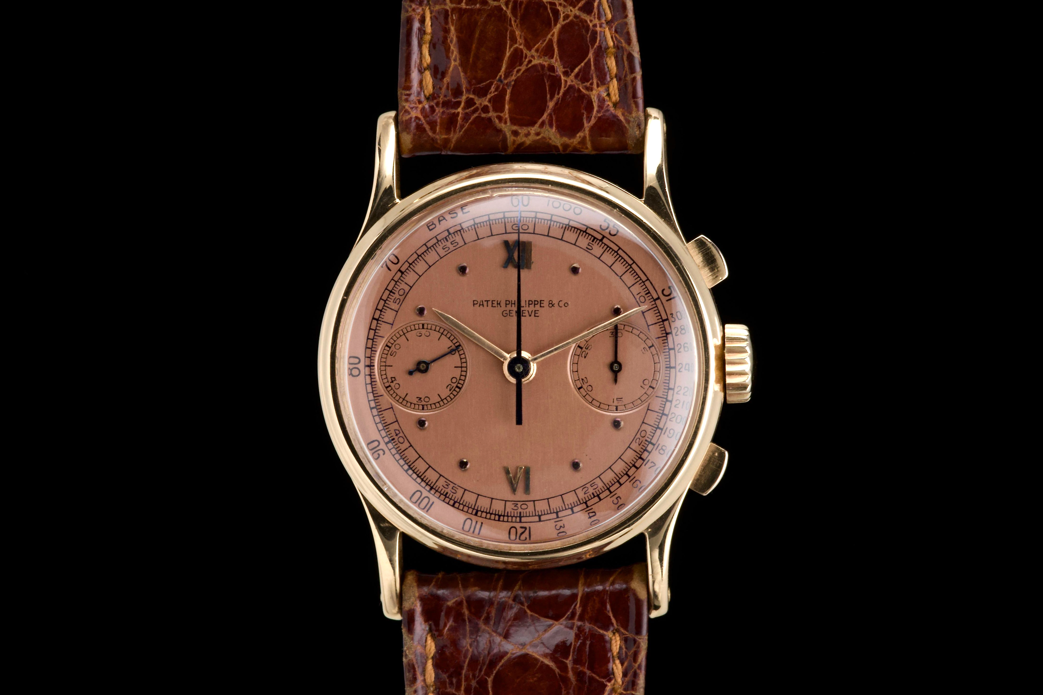 The present Patek Philippe Chronograph reference 130, executed in pink gold with a matching pink dial and dating to 1942, is an exceptionally rare and highly charismatic example of one of the manufacture’s most celebrated vintage chronographs. Often referred to by collectors as a “pink on pink” configuration, this watch represents a particularly elegant and sought-after aesthetic within the reference 130 family. The pink-gold case has been polished in the past but remains in very fine overall condition, retaining strong proportions and crisp definition. Importantly, the original hallmark remains deep and clearly visible, a reassuring detail that underscores the integrity and honest preservation of the case. The highlight of this example is undoubtedly its rare original pink dial, preserved in excellent condition. Dials of this colour and period are seldom encountered and are highly prized by collectors for their warmth and distinctive character. The dial retains remarkable freshness, with matching hands that create a harmonious and cohesive appearance throughout. The watch is accompanied by an Extract from the Archives, confirming production in 1942 and original sale in August 1943, providing valuable historical documentation and further enhancing the desirability of the piece. It is fitted with a crocodile leather strap paired with its original pink-gold ardillon buckle, maintaining correct material and period coherence. While no service history accompanies the watch, it is functioning correctly at the time of cataloguing. Elegant, rare, and rich in mid-century charm, this Patek Philippe chronograph reference 130 in pink-on-pink configuration represents a compelling opportunity to acquire an important and beautifully preserved example of one of the most iconic chronographs ever produced by the Geneva manufacture.