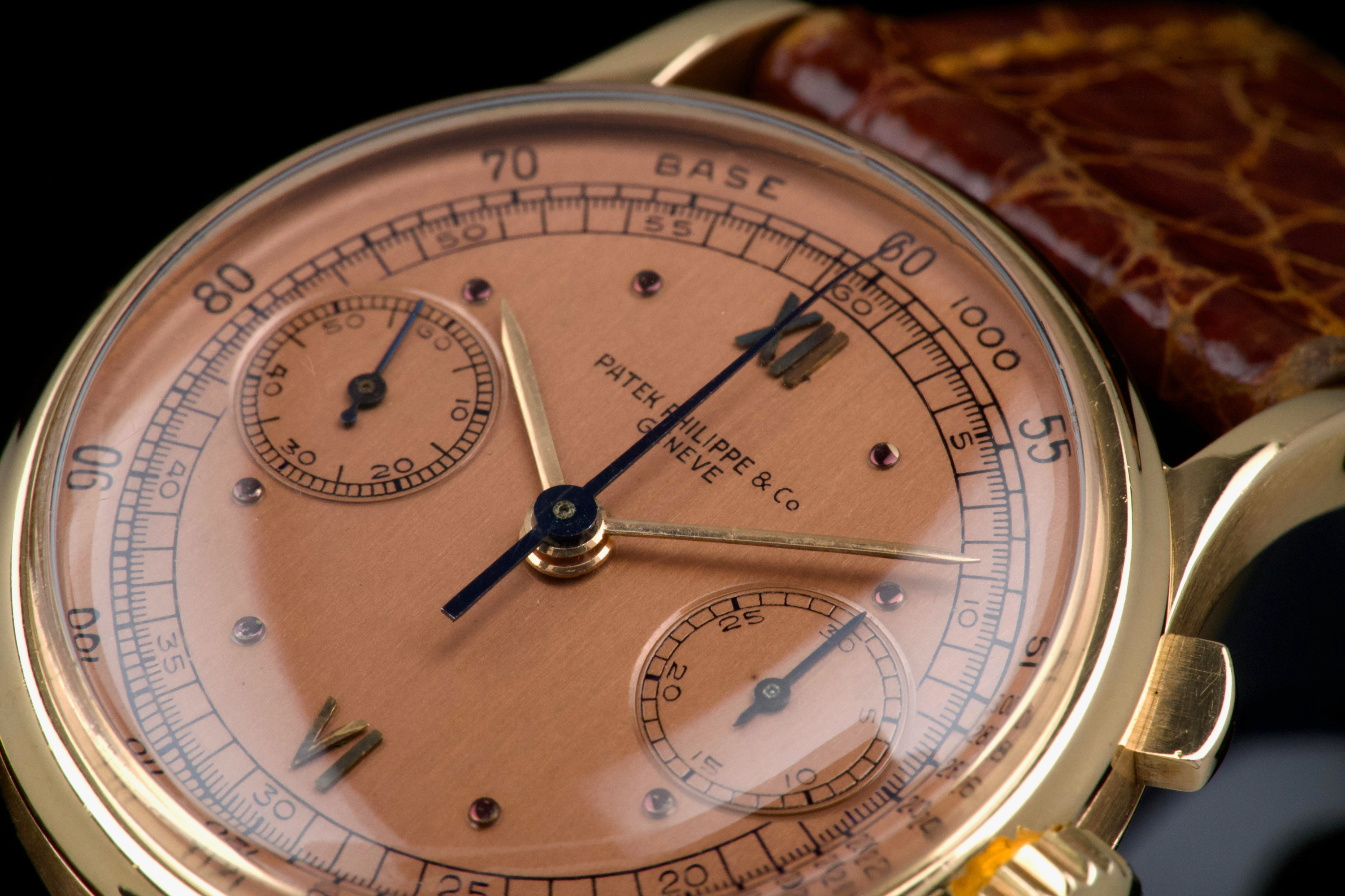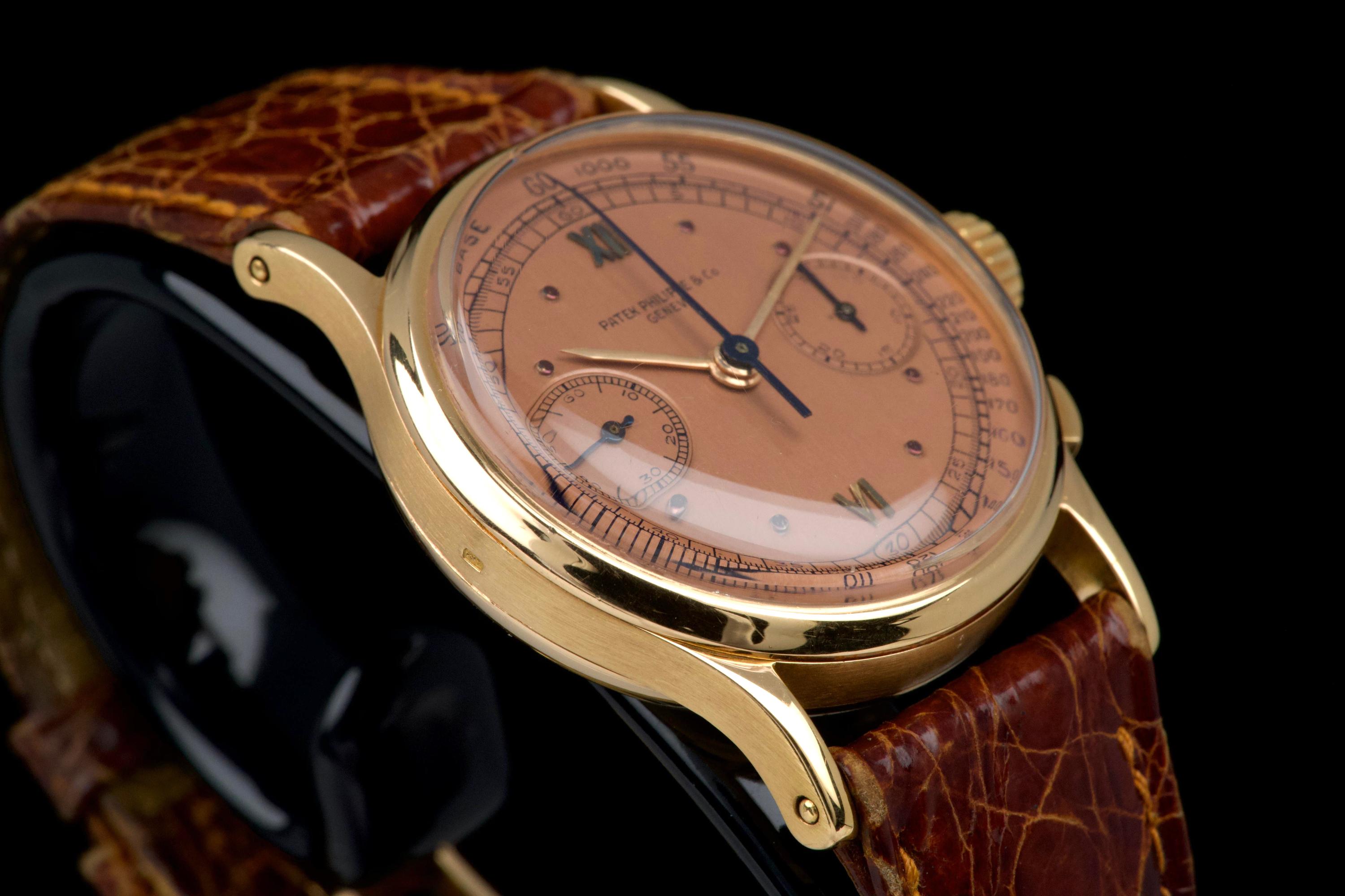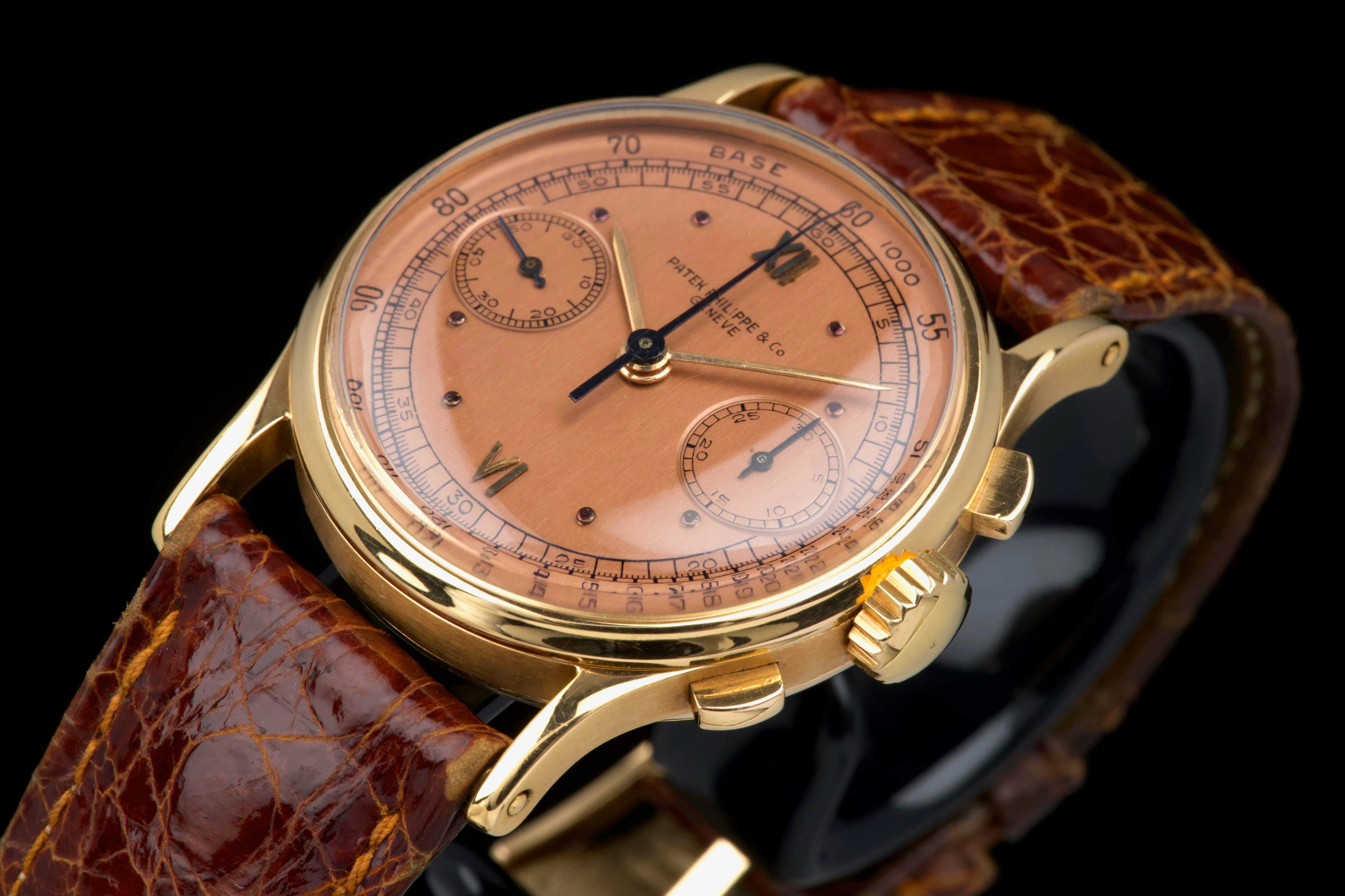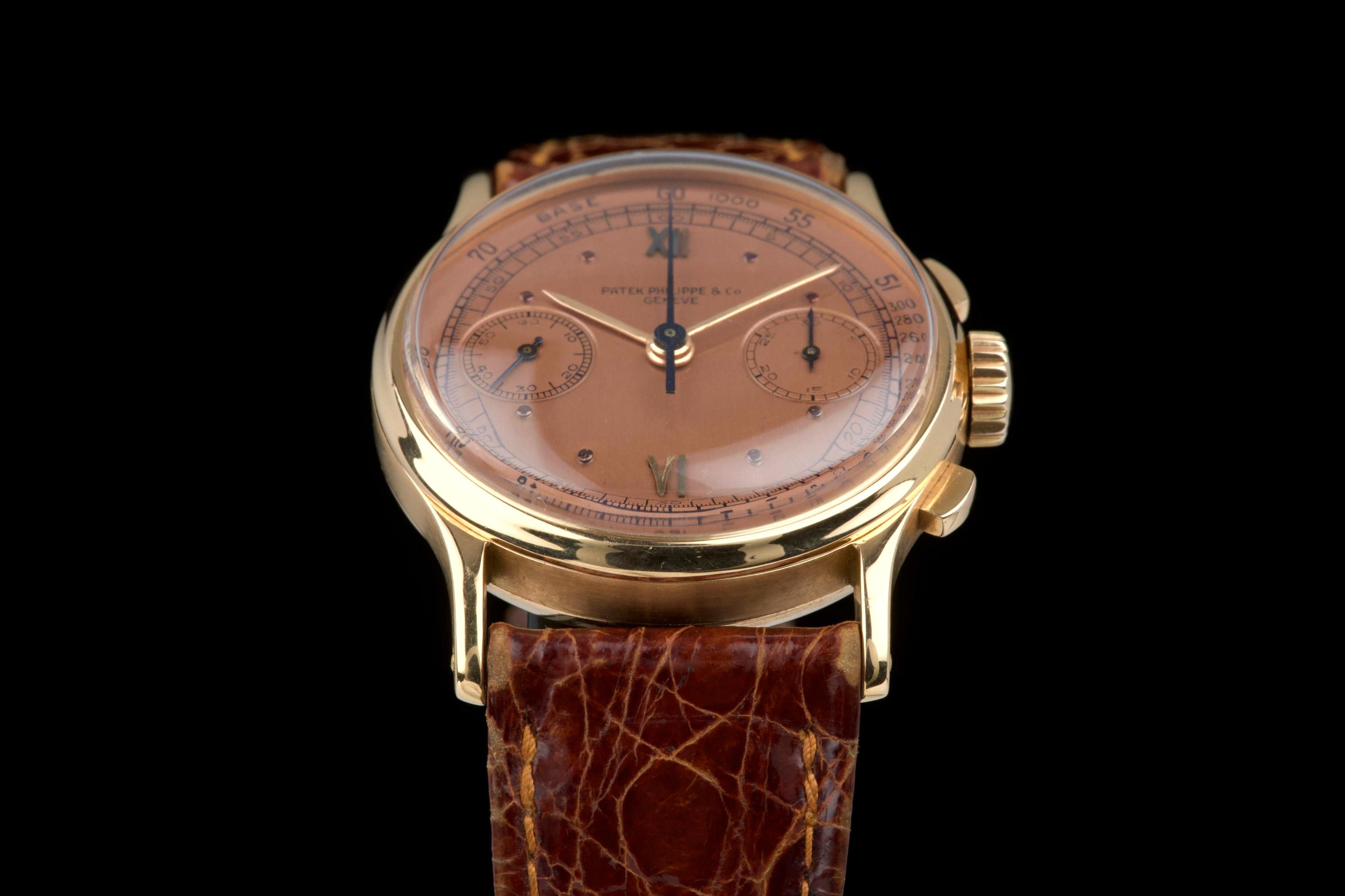 The present Patek Philippe Chronograph reference 130, executed in pink gold with a matching pink dial and dating to 1942, is an exceptionally rare and highly charismatic example of one of the manufacture’s most celebrated vintage chronographs. Often referred to by collectors as a “pink on pink” configuration, this watch represents a particularly elegant and sought-after aesthetic within the reference 130 family. The pink-gold case has been polished in the past but remains in very fine overall condition, retaining strong proportions and crisp definition. Importantly, the original hallmark remains deep and clearly visible, a reassuring detail that underscores the integrity and honest preservation of the case. The highlight of this example is undoubtedly its rare original pink dial, preserved in excellent condition. Dials of this colour and period are seldom encountered and are highly prized by collectors for their warmth and distinctive character. The dial retains remarkable freshness, with matching hands that create a harmonious and cohesive appearance throughout. The watch is accompanied by an Extract from the Archives, confirming production in 1942 and original sale in August 1943, providing valuable historical documentation and further enhancing the desirability of the piece. It is fitted with a crocodile leather strap paired with its original pink-gold ardillon buckle, maintaining correct material and period coherence. While no service history accompanies the watch, it is functioning correctly at the time of cataloguing. Elegant, rare, and rich in mid-century charm, this Patek Philippe chronograph reference 130 in pink-on-pink configuration represents a compelling opportunity to acquire an important and beautifully preserved example of one of the most iconic chronographs ever produced by the Geneva manufacture.