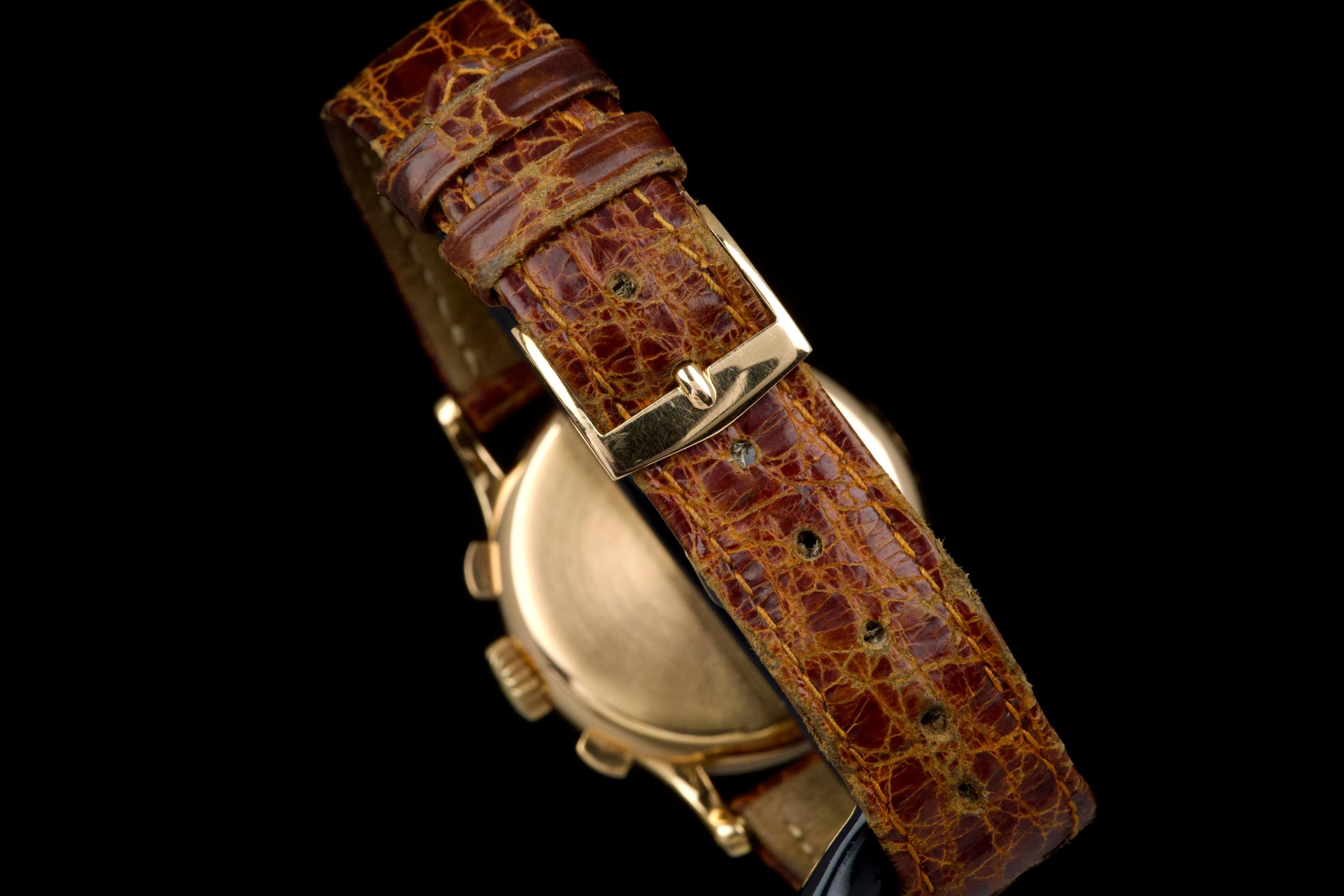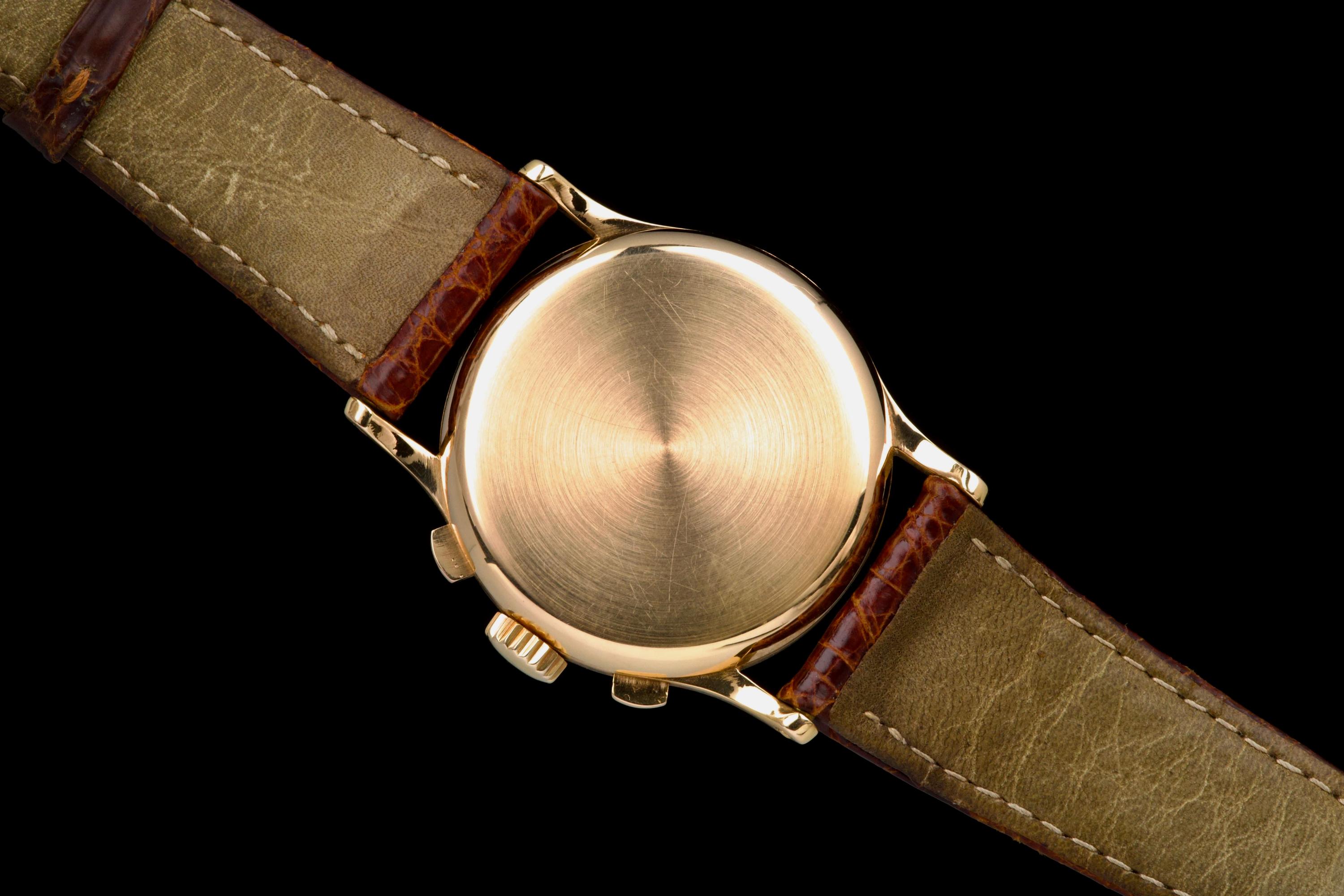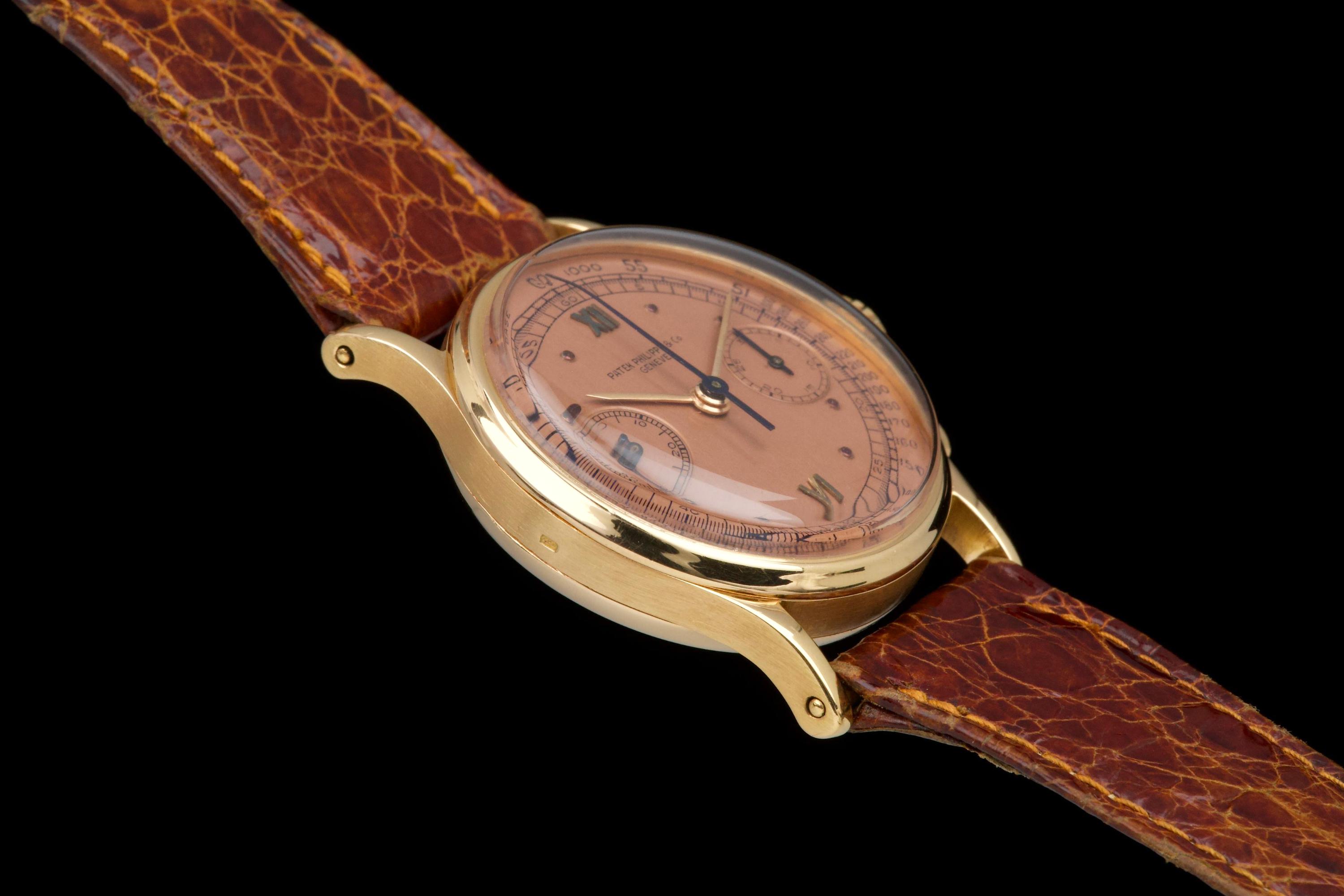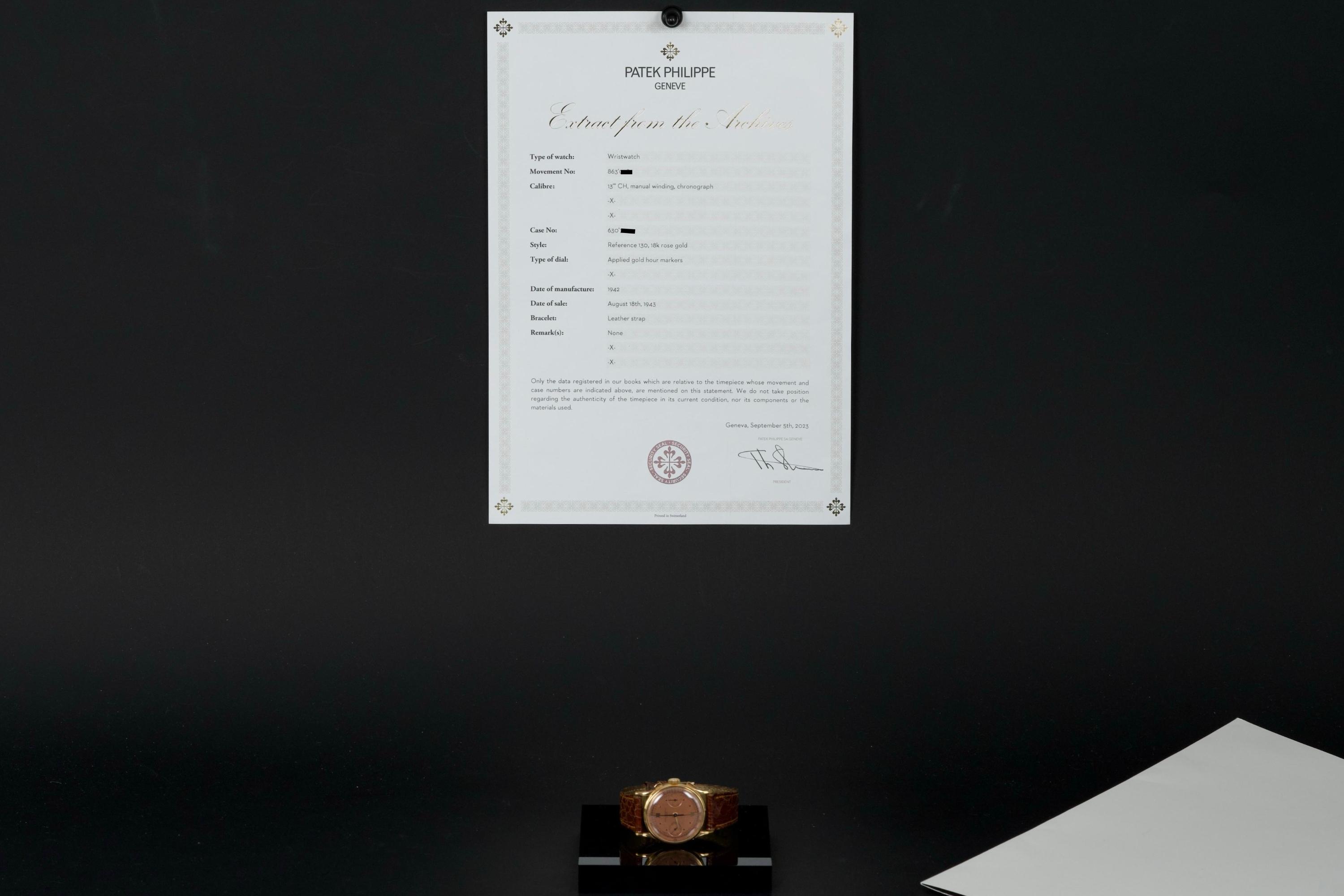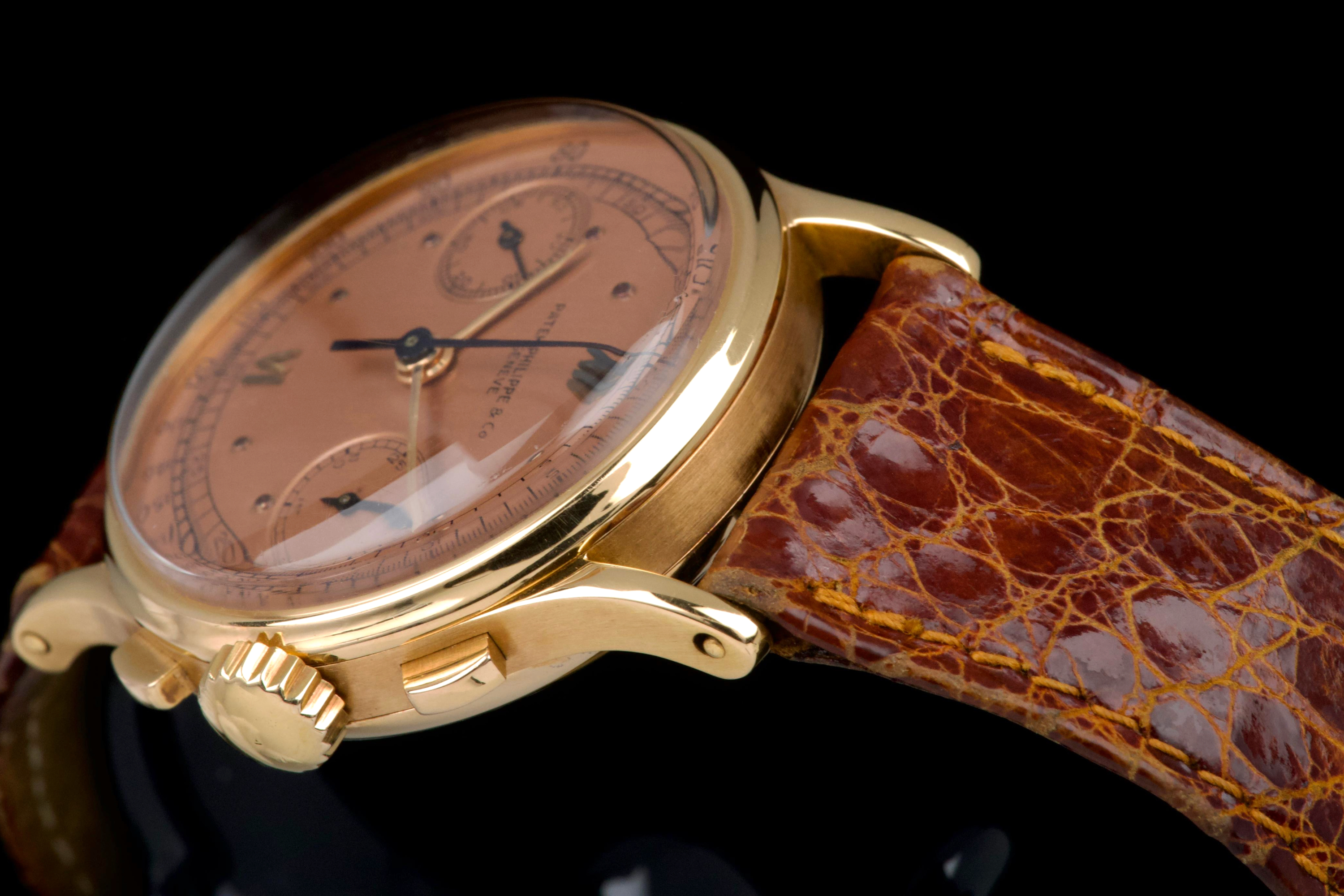 The present Patek Philippe Chronograph reference 130, executed in pink gold with a matching pink dial and dating to 1942, is an exceptionally rare and highly charismatic example of one of the manufacture’s most celebrated vintage chronographs. Often referred to by collectors as a “pink on pink” configuration, this watch represents a particularly elegant and sought-after aesthetic within the reference 130 family. The pink-gold case has been polished in the past but remains in very fine overall condition, retaining strong proportions and crisp definition. Importantly, the original hallmark remains deep and clearly visible, a reassuring detail that underscores the integrity and honest preservation of the case. The highlight of this example is undoubtedly its rare original pink dial, preserved in excellent condition. Dials of this colour and period are seldom encountered and are highly prized by collectors for their warmth and distinctive character. The dial retains remarkable freshness, with matching hands that create a harmonious and cohesive appearance throughout. The watch is accompanied by an Extract from the Archives, confirming production in 1942 and original sale in August 1943, providing valuable historical documentation and further enhancing the desirability of the piece. It is fitted with a crocodile leather strap paired with its original pink-gold ardillon buckle, maintaining correct material and period coherence. While no service history accompanies the watch, it is functioning correctly at the time of cataloguing. Elegant, rare, and rich in mid-century charm, this Patek Philippe chronograph reference 130 in pink-on-pink configuration represents a compelling opportunity to acquire an important and beautifully preserved example of one of the most iconic chronographs ever produced by the Geneva manufacture.