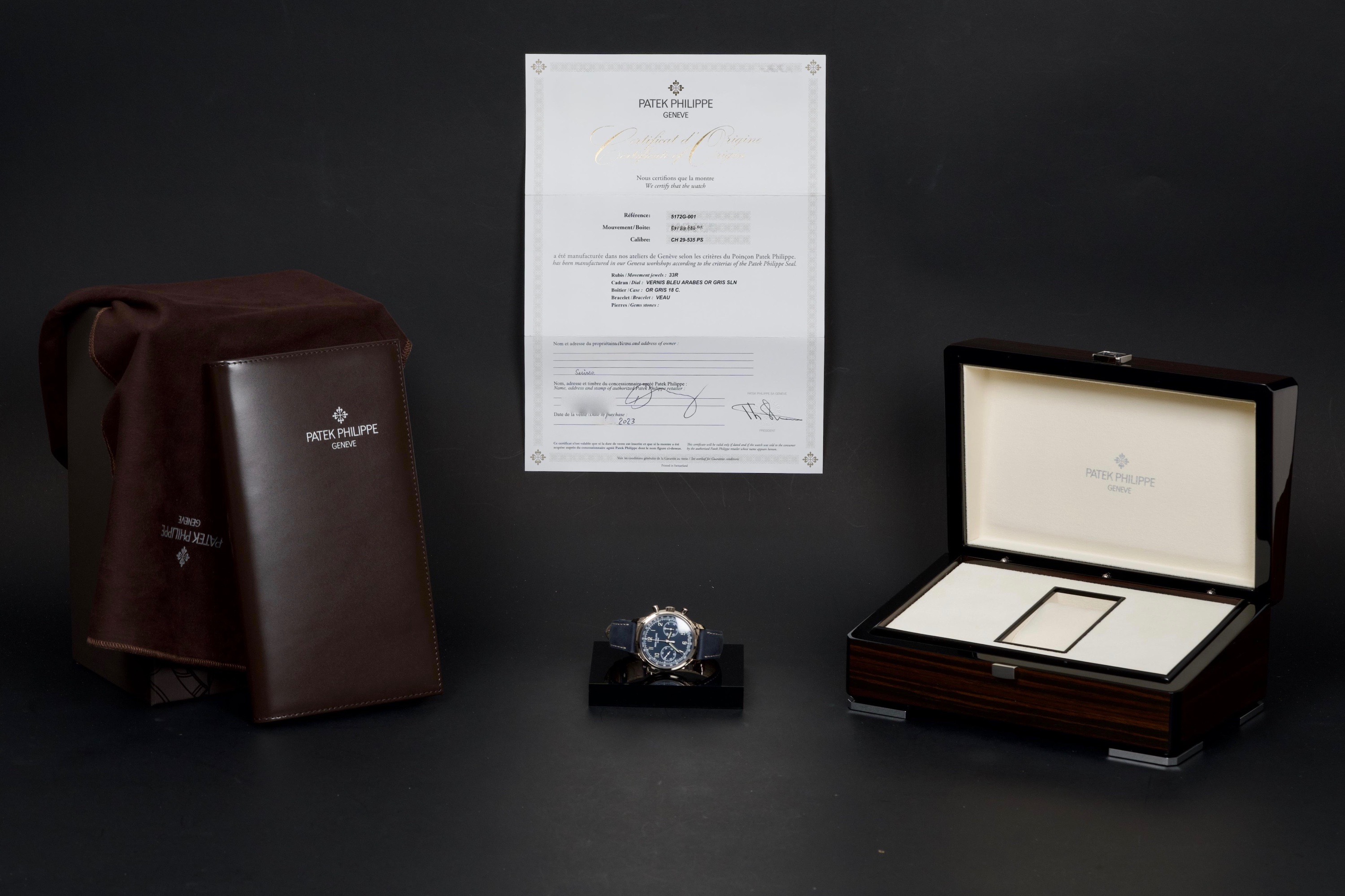 The present Patek Philippe Chronograph reference 5172G-001, featuring the highly desirable blue dial, dates to 2023 and is offered here as a complete full set. The watch has remained in the possession of a single owner since new and is preserved in near-new condition. It has never been polished and retains crisp, well-defined case edges, with only the slightest signs of handling consistent with extremely careful wear. The blue dial is particularly attractive, combining a rich sunburst finish with applied white gold Arabic numerals and syringe-style hands, offering a refined yet sporty aesthetic. The layout, with its twin chronograph subdials and tachymeter scale, ensures both excellent legibility and visual balance, in line with Patek Philippe’s modern chronograph design language. The 41 mm white gold case, with its vintage-inspired stepped lugs and concave bezel, further enhances the character of the model, blending classical inspiration with contemporary proportions. Powered by the in-house manual-winding calibre CH 29-535 PS, the watch represents the pinnacle of Patek Philippe’s chronograph expertise, combining traditional construction with advanced technical innovations for precise and reliable performance. Preserved in outstanding condition and accompanied by its full original set, this 5172G-001 represents an excellent opportunity to acquire a highly sought-after modern Patek Philippe chronograph, combining mechanical excellence, elegant design, and strong collector appeal.