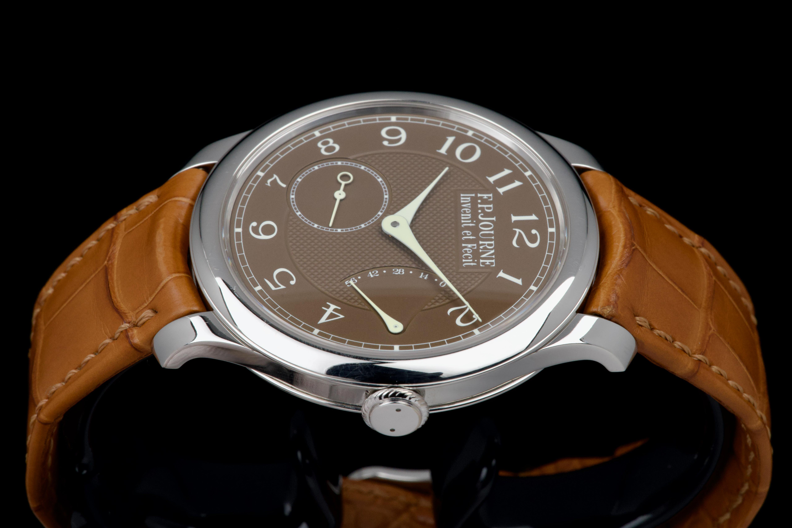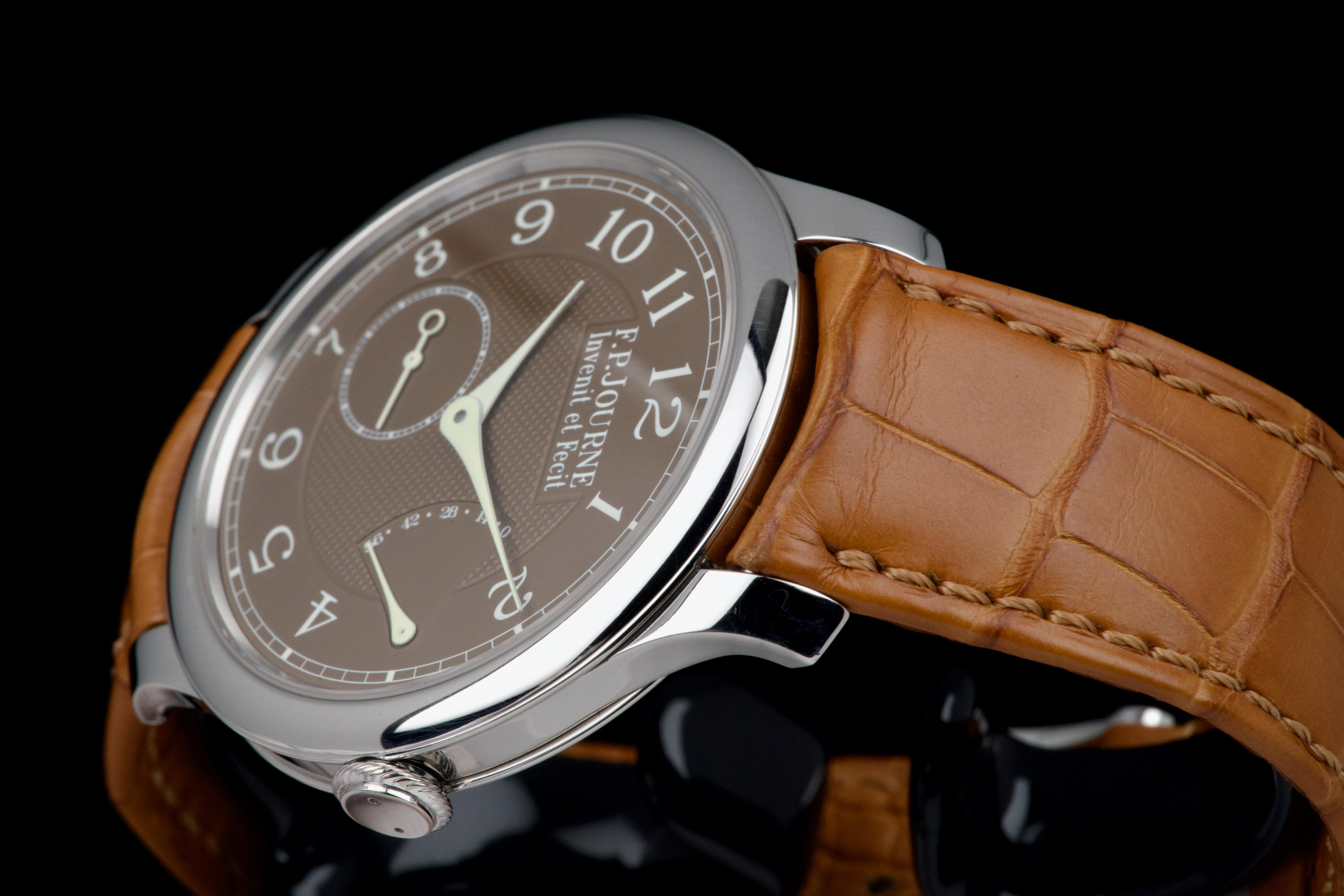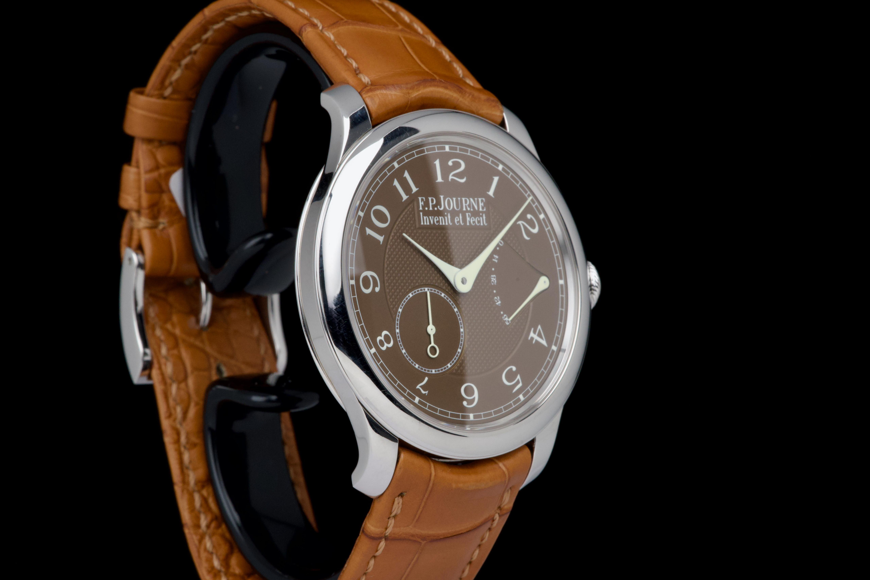 The present F.P. Journe Chronomètre Souverain Havana, dating to circa 2020, is offered here as a complete full set and represents one of the most refined expressions of the brand’s pursuit of chronometric precision. The watch has remained in the possession of a single owner since new and is preserved in near-new condition. It has never been polished and retains sharp, well-defined case edges, with only the slightest signs of handling consistent with careful wear. The Havana dial is particularly striking, distinguished by its rich and warm brown tones obtained through a complex treatment combining gold and ruthenium, giving each piece a unique and highly attractive appearance. The model features F.P. Journe’s signature asymmetrical display, combining hours and minutes with a small seconds subdial and a power reserve indicator, offering both visual balance and exceptional legibility. Its design remains one of the most recognizable and celebrated within the brand’s Classique collection. Powered by the in-house manual-winding calibre 1304, manufactured in 18k rose gold, the watch is equipped with twin barrels mounted in parallel, ensuring a highly stable delivery of energy and consistent chronometric performance over an approximate 56-hour power reserve. Preserved in outstanding condition and accompanied by its full original set, this Chronomètre Souverain Havana represents a rare opportunity to acquire one of F.P. Journe’s most iconic and sought-after models, combining technical sophistication, distinctive aesthetics, and strong collector appeal.