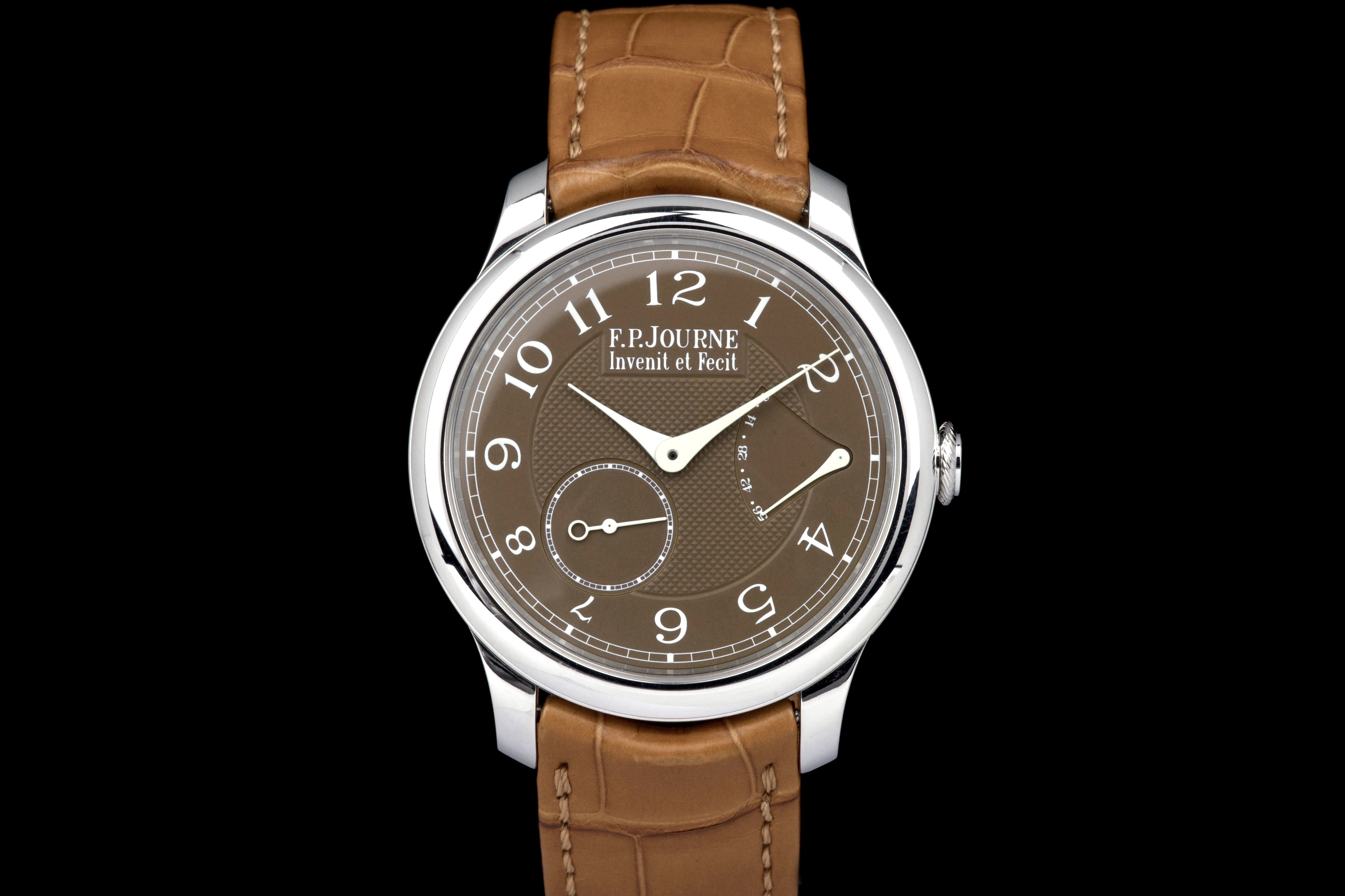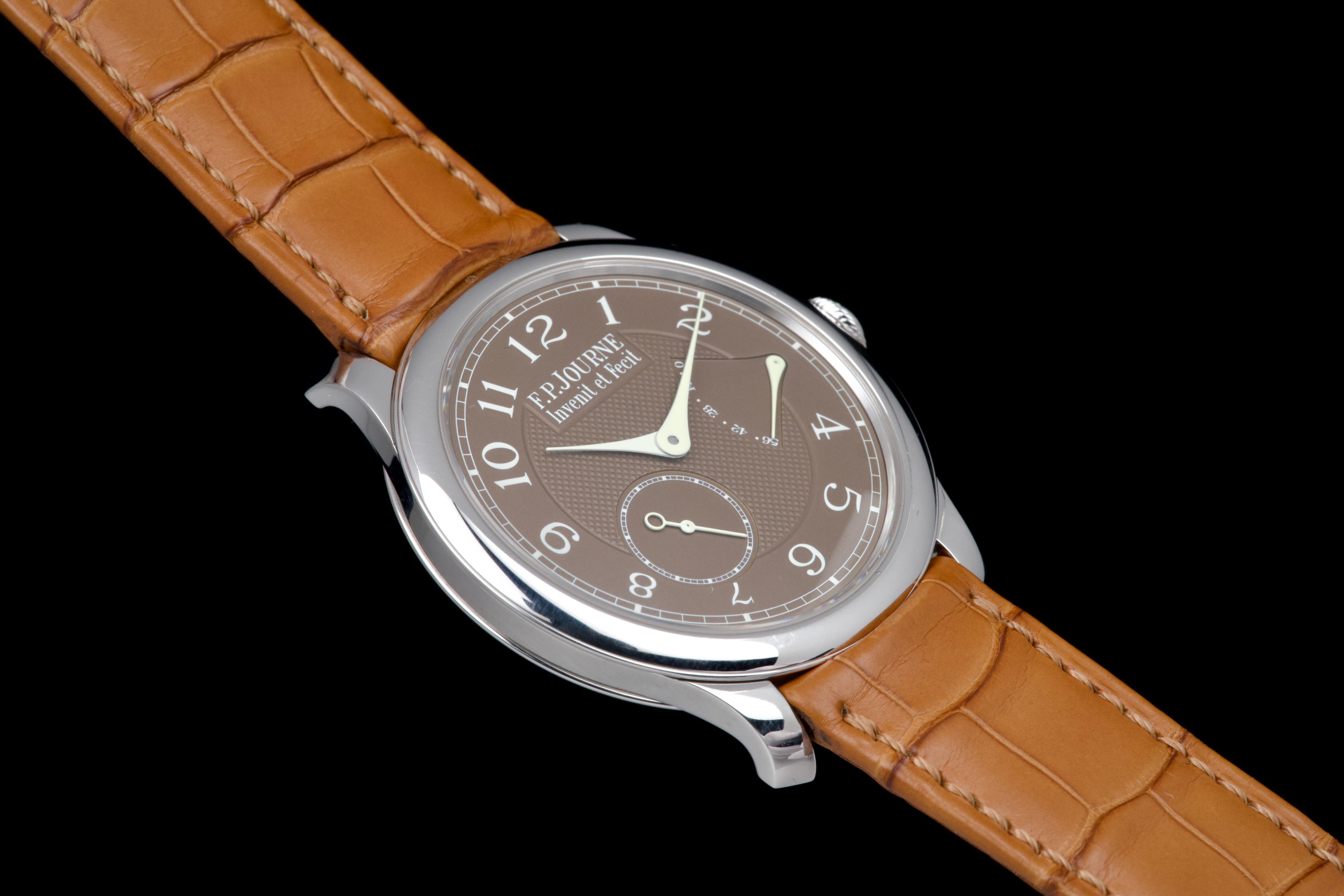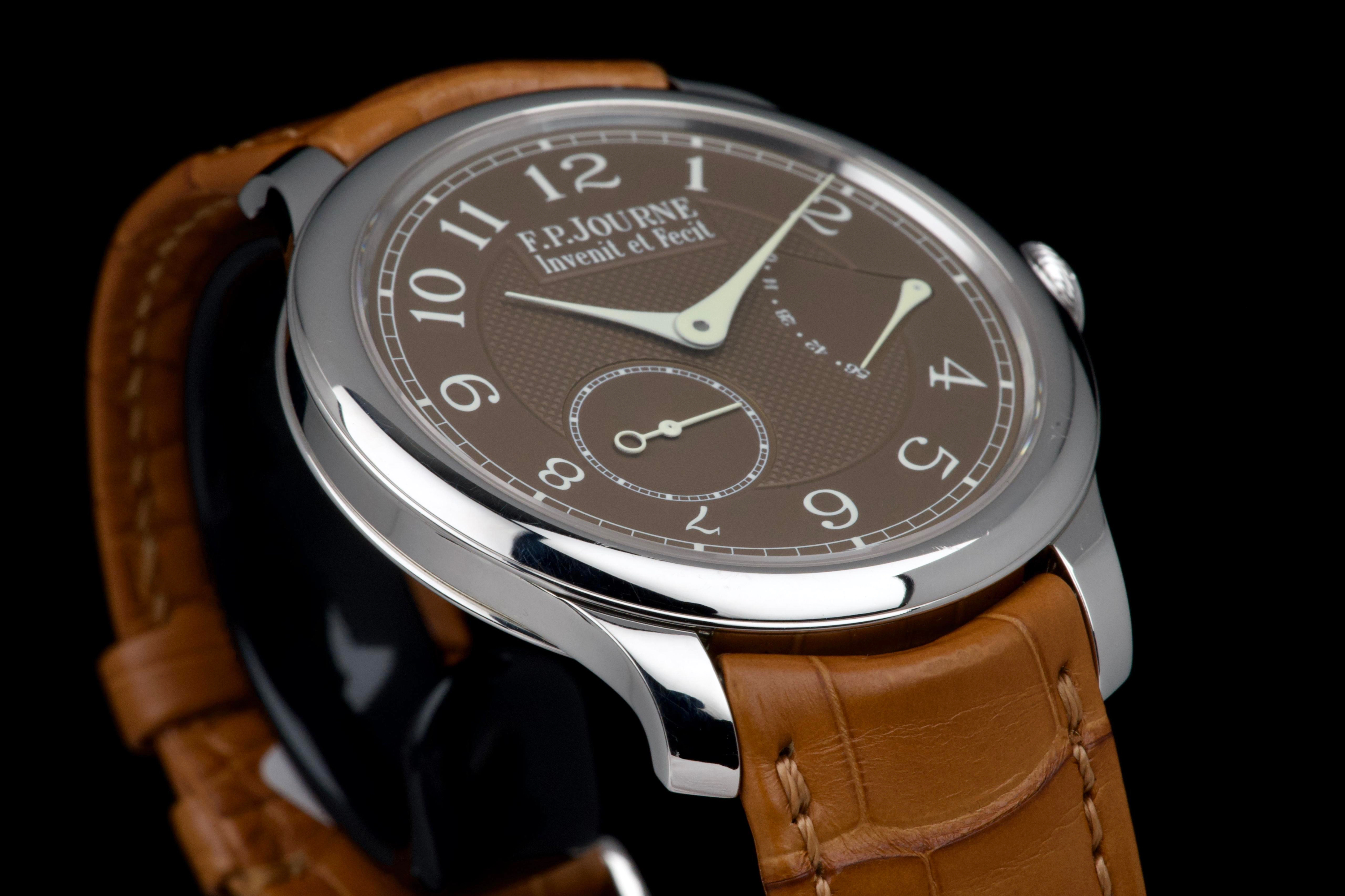 The present F.P. Journe Chronomètre Souverain Havana, dating to circa 2020, is offered here as a complete full set and represents one of the most refined expressions of the brand’s pursuit of chronometric precision. The watch has remained in the possession of a single owner since new and is preserved in near-new condition. It has never been polished and retains sharp, well-defined case edges, with only the slightest signs of handling consistent with careful wear. The Havana dial is particularly striking, distinguished by its rich and warm brown tones obtained through a complex treatment combining gold and ruthenium, giving each piece a unique and highly attractive appearance. The model features F.P. Journe’s signature asymmetrical display, combining hours and minutes with a small seconds subdial and a power reserve indicator, offering both visual balance and exceptional legibility. Its design remains one of the most recognizable and celebrated within the brand’s Classique collection. Powered by the in-house manual-winding calibre 1304, manufactured in 18k rose gold, the watch is equipped with twin barrels mounted in parallel, ensuring a highly stable delivery of energy and consistent chronometric performance over an approximate 56-hour power reserve. Preserved in outstanding condition and accompanied by its full original set, this Chronomètre Souverain Havana represents a rare opportunity to acquire one of F.P. Journe’s most iconic and sought-after models, combining technical sophistication, distinctive aesthetics, and strong collector appeal.