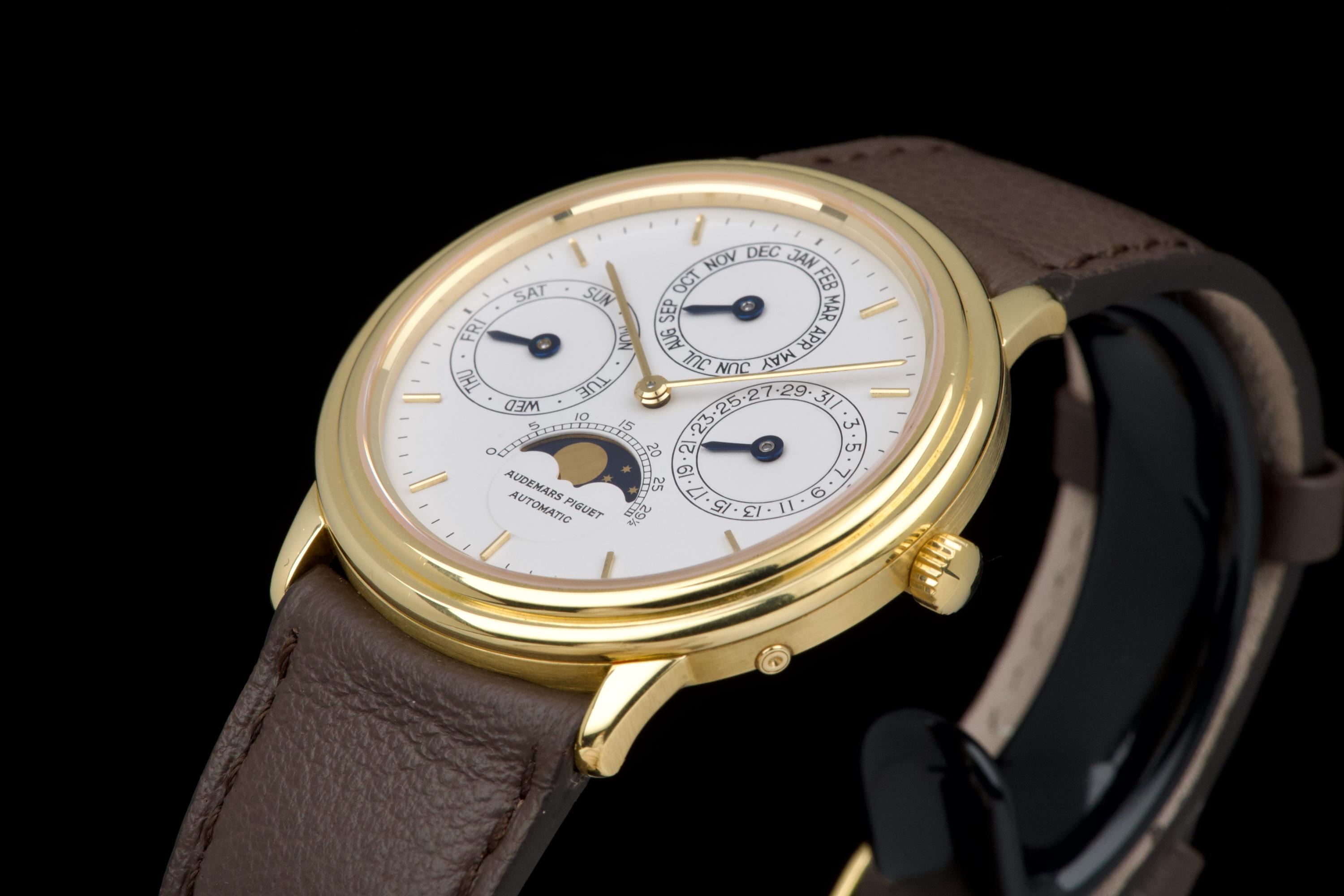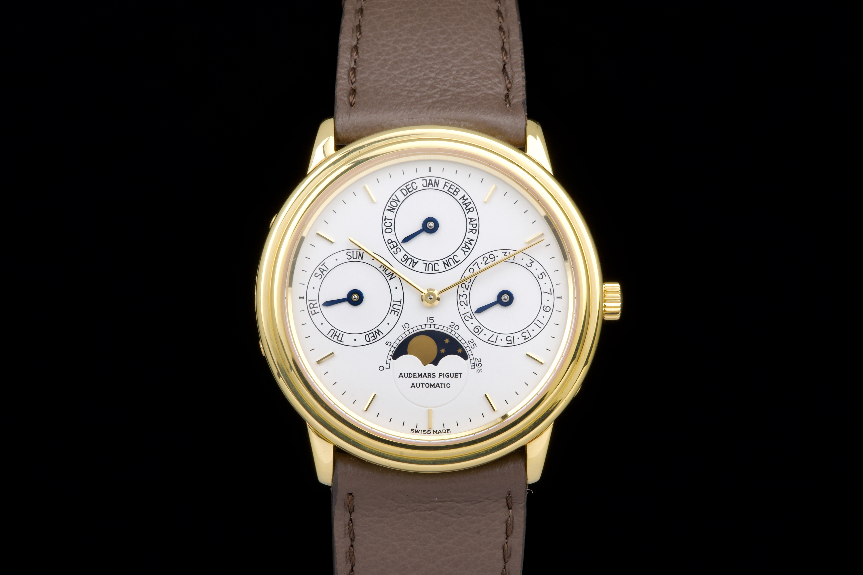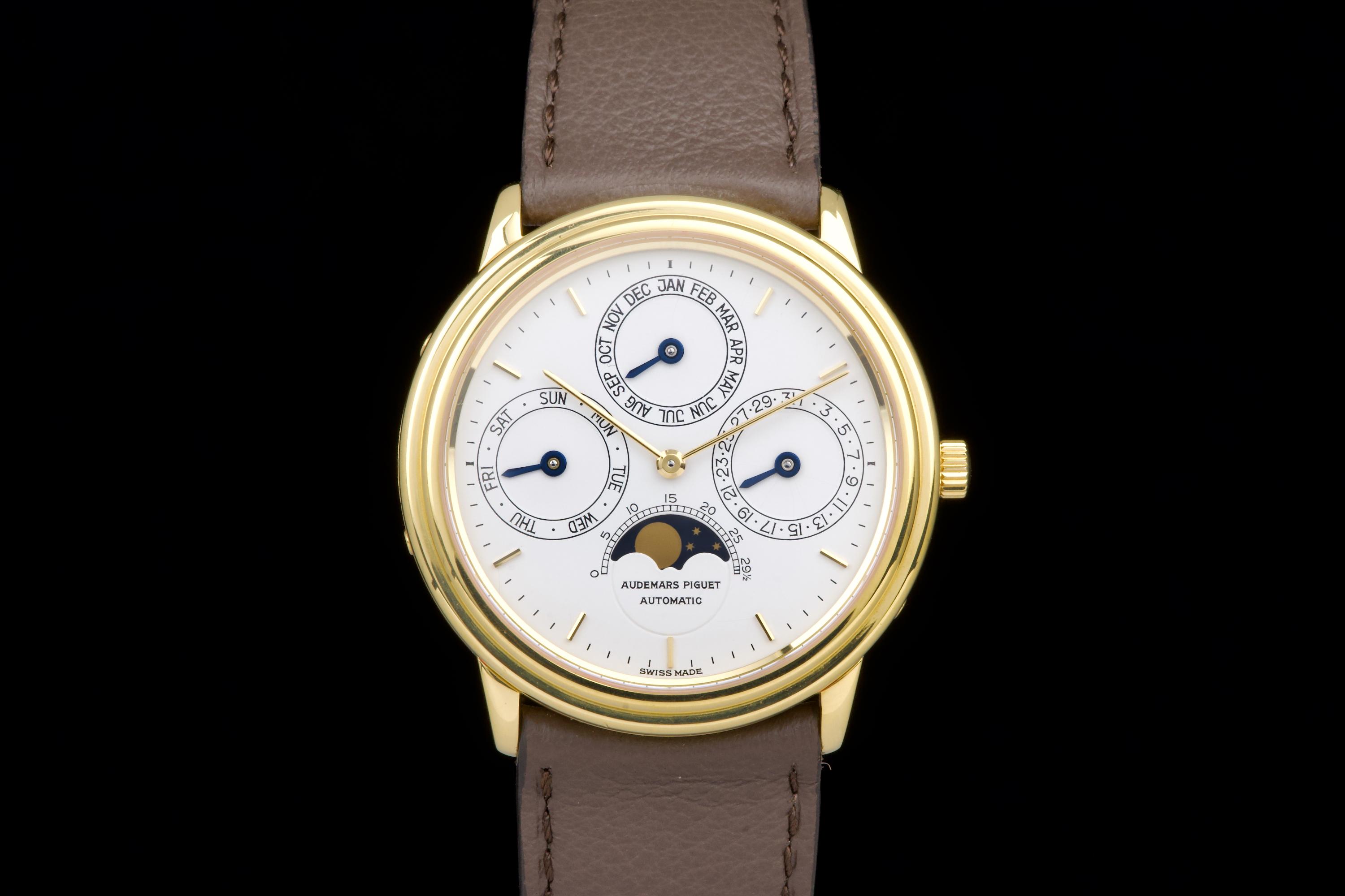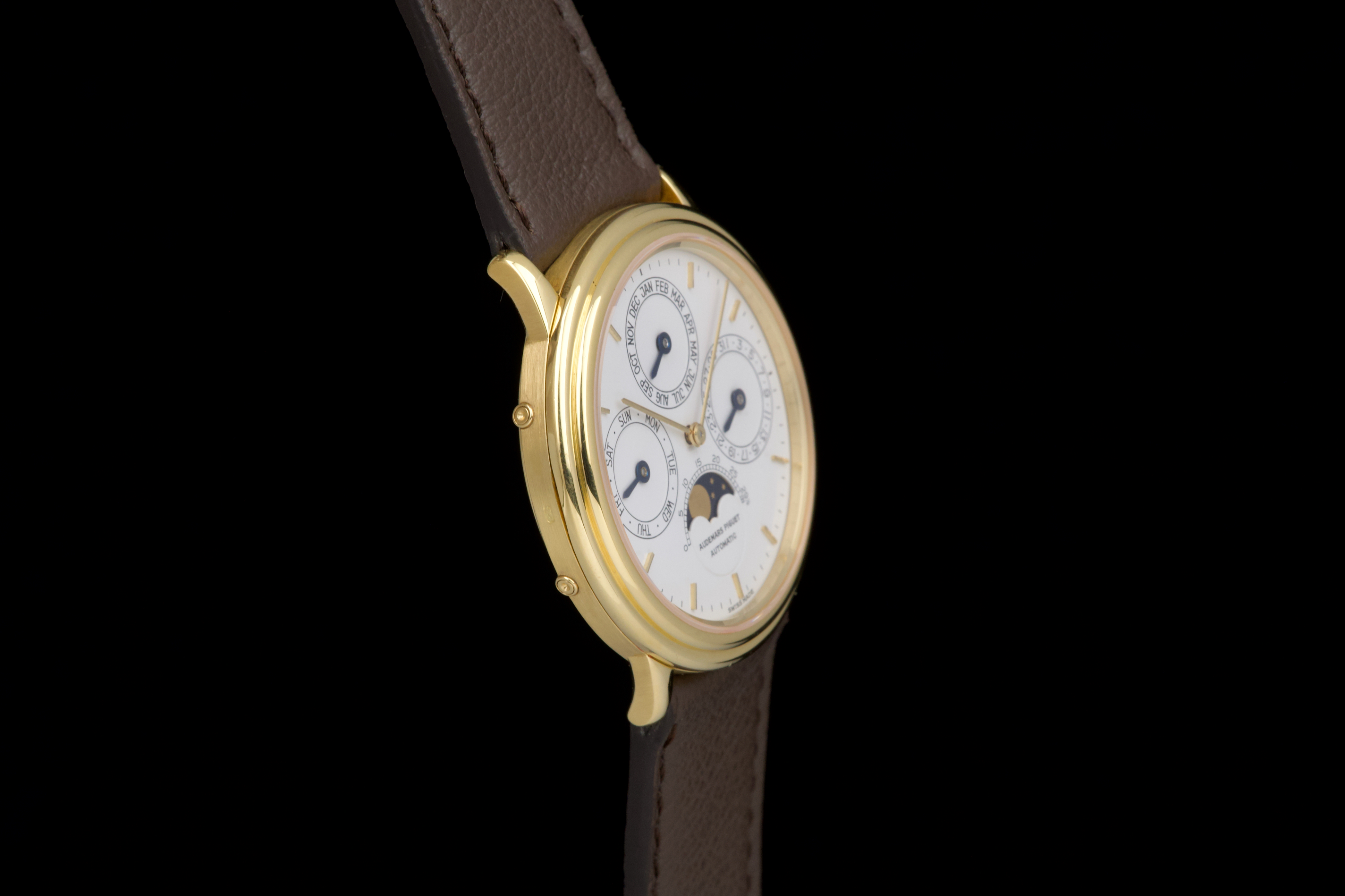 An extraordinary and museum-grade example of the Audemars Piguet Perpetual Calendar reference 5548BA, one of the very first automatic perpetual calendar wristwatches ever produced by Audemars Piguet. This piece belongs to the desirable B-series, placing its production in the late 1970s, and is accompanied by an exceptionally complete and historically rich set. Included are the original box, period Japanese catalogue folder, leather document holder, original certificate, and the original warranty (undated). The watch also comes with Audemars Piguet Japan service papers from 2025, confirming a movement service only (no polishing), preserving the original sharp case geometry. The 18k yellow-gold case is in superb condition, with deep and crisp hallmarks. The white enamel dial is exceptional, showing only a few microscopic hairlines invisible to the naked eye — a normal and completely acceptable characteristic of enamel dials from this era. It is fitted with its original yellow-gold AP buckle and a new (non-AP) leather strap. With only 2066 pieces produced in yellow gold across the 5548/25548 family, this model is one of the most important and collectible early AP perpetual calendars, representing the birth of the ultra-thin automatic QP lineage that later defined the brand. A truly outstanding example — unparalleled condition, a phenomenal set, and a historically significant perpetual calendar from the golden age of Audemars Piguet.