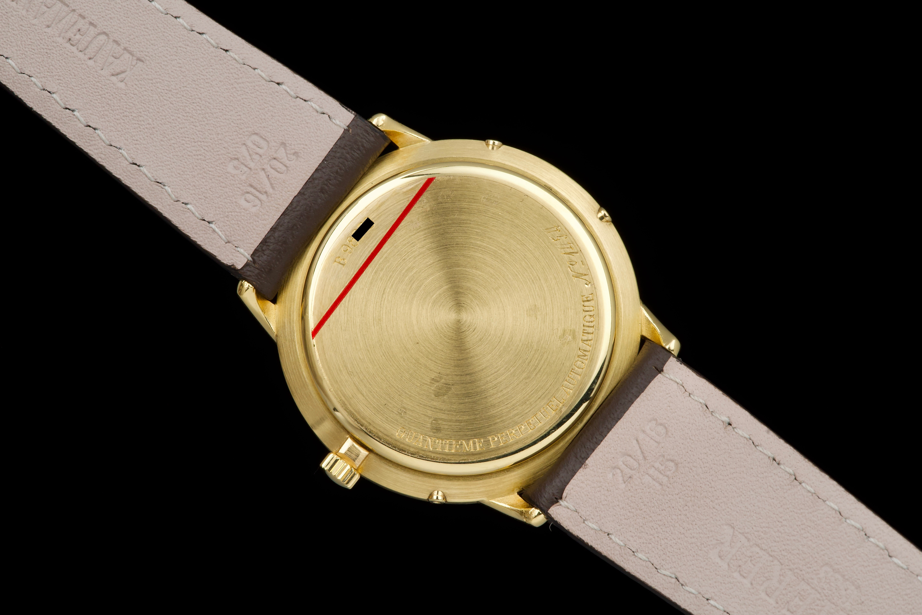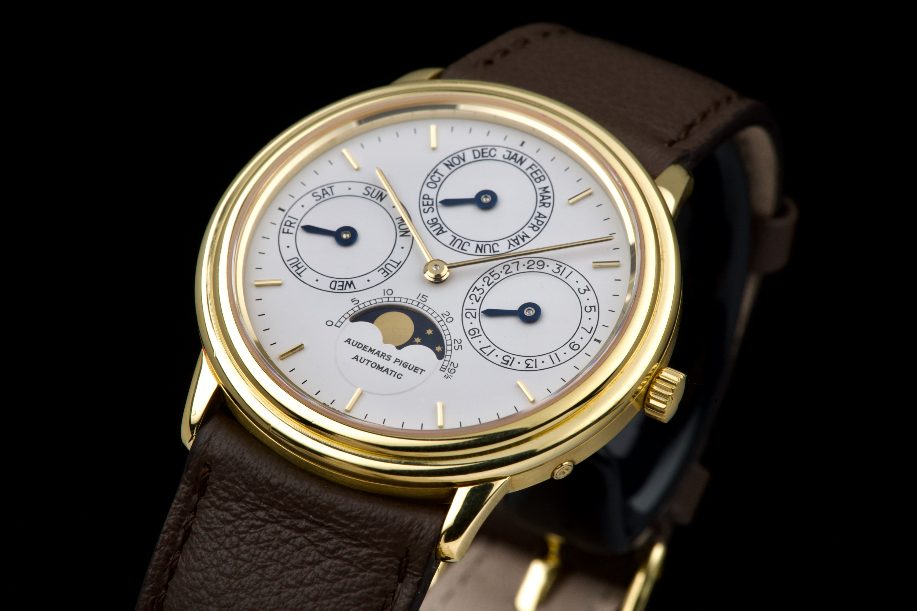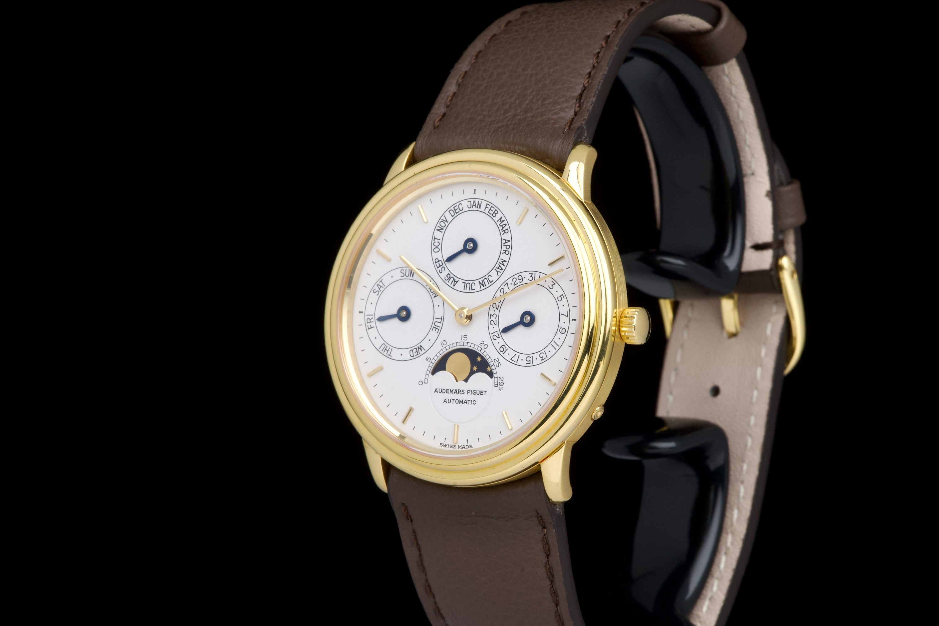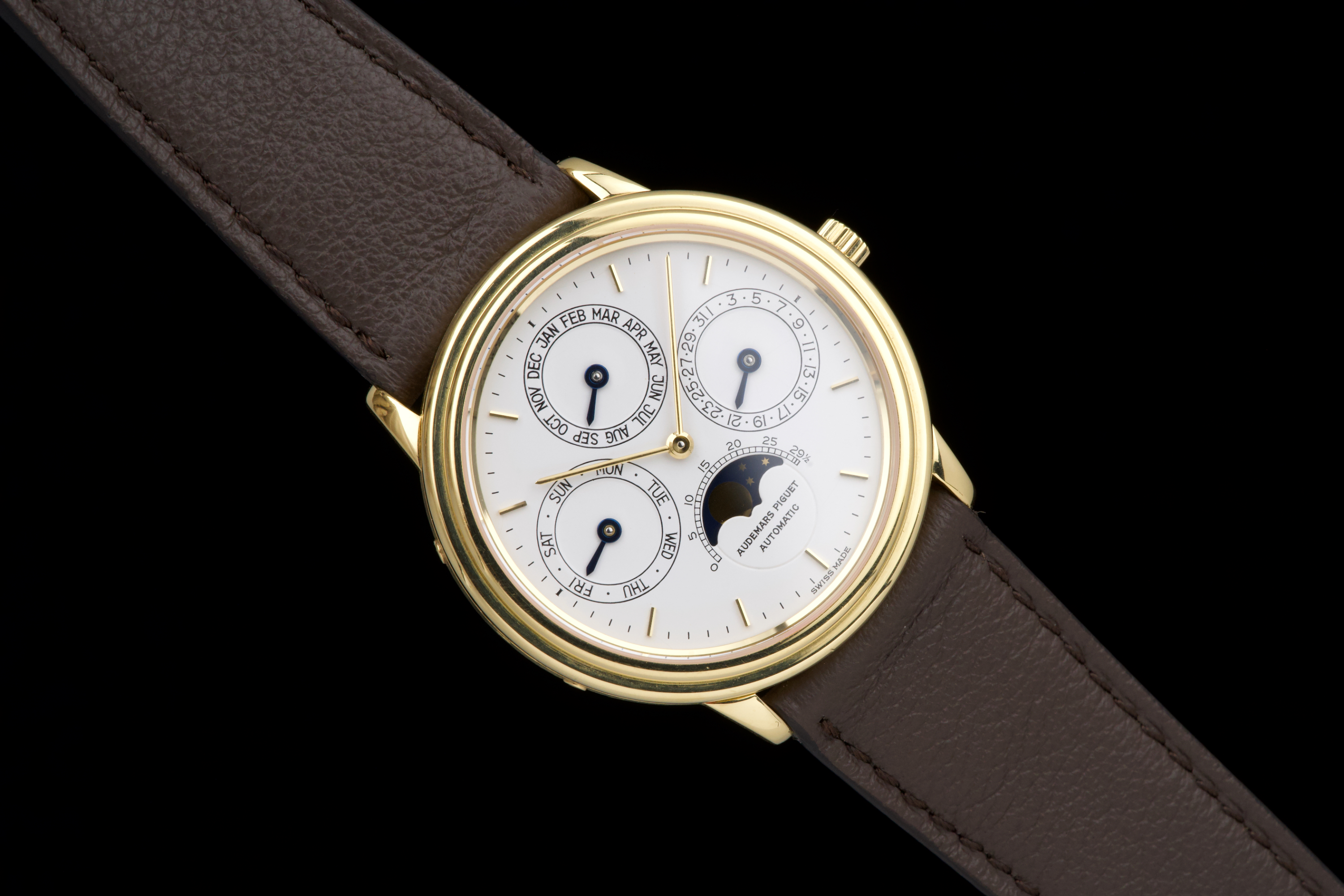 An extraordinary and museum-grade example of the Audemars Piguet Perpetual Calendar reference 5548BA, one of the very first automatic perpetual calendar wristwatches ever produced by Audemars Piguet. This piece belongs to the desirable B-series, placing its production in the late 1970s, and is accompanied by an exceptionally complete and historically rich set. Included are the original box, period Japanese catalogue folder, leather document holder, original certificate, and the original warranty (undated). The watch also comes with Audemars Piguet Japan service papers from 2025, confirming a movement service only (no polishing), preserving the original sharp case geometry. The 18k yellow-gold case is in superb condition, with deep and crisp hallmarks. The white enamel dial is exceptional, showing only a few microscopic hairlines invisible to the naked eye — a normal and completely acceptable characteristic of enamel dials from this era. It is fitted with its original yellow-gold AP buckle and a new (non-AP) leather strap. With only 2066 pieces produced in yellow gold across the 5548/25548 family, this model is one of the most important and collectible early AP perpetual calendars, representing the birth of the ultra-thin automatic QP lineage that later defined the brand. A truly outstanding example — unparalleled condition, a phenomenal set, and a historically significant perpetual calendar from the golden age of Audemars Piguet.