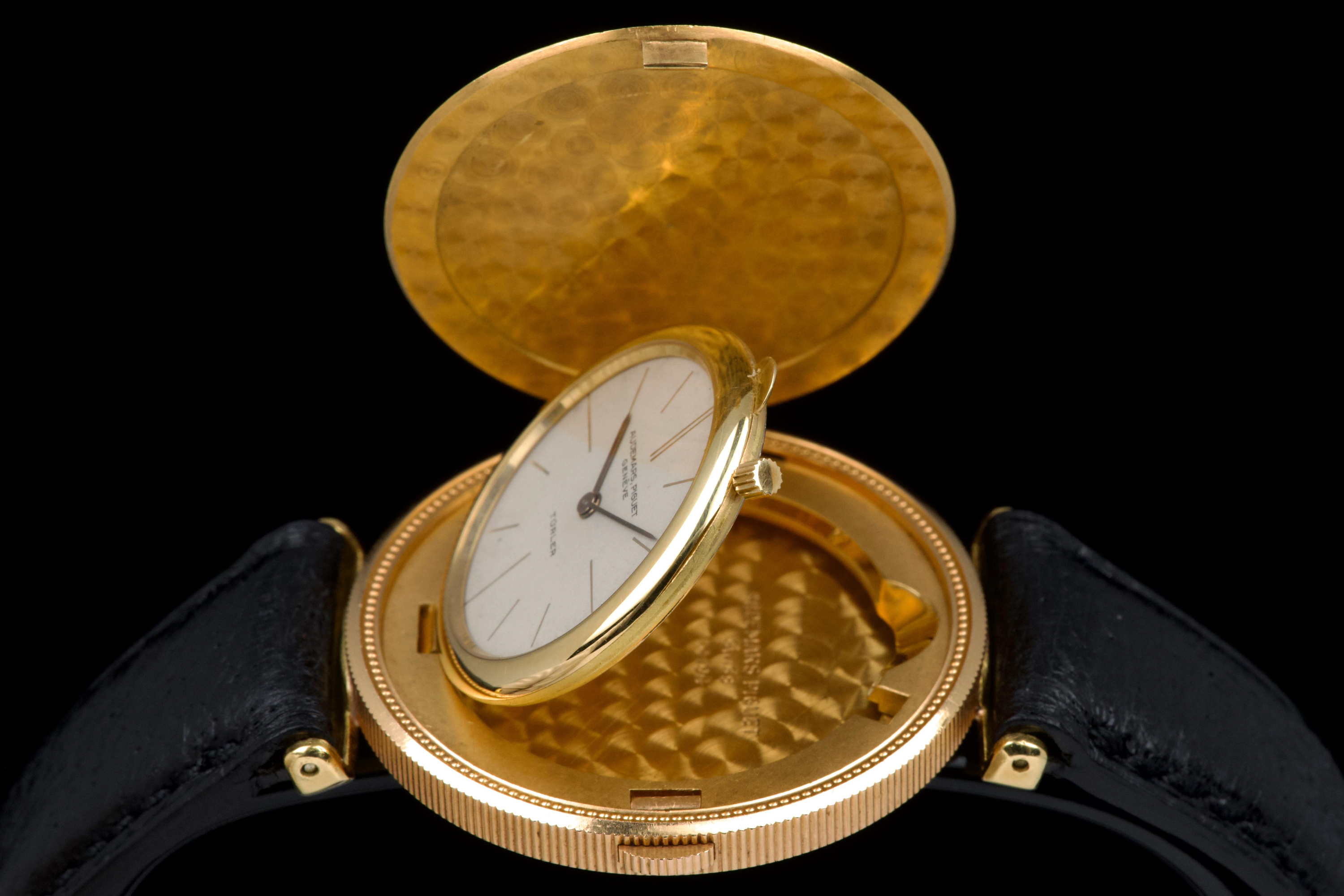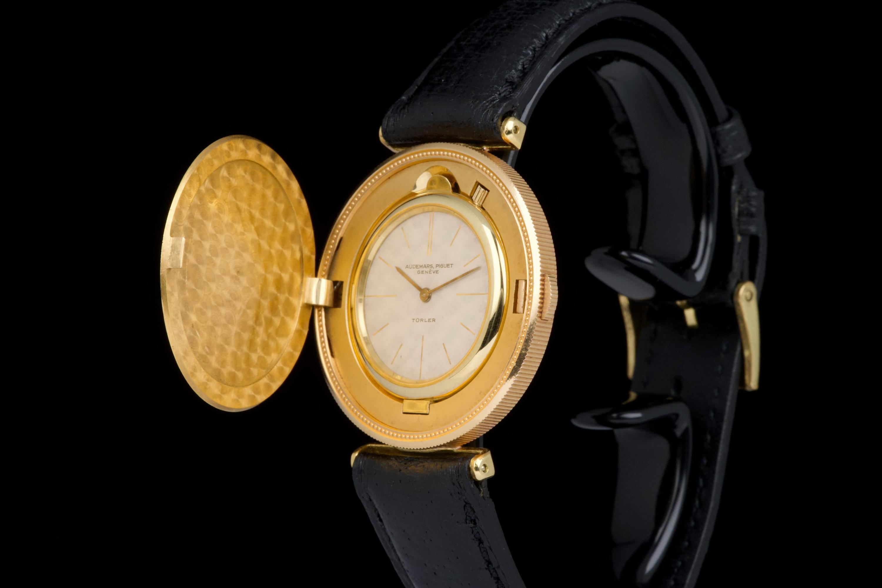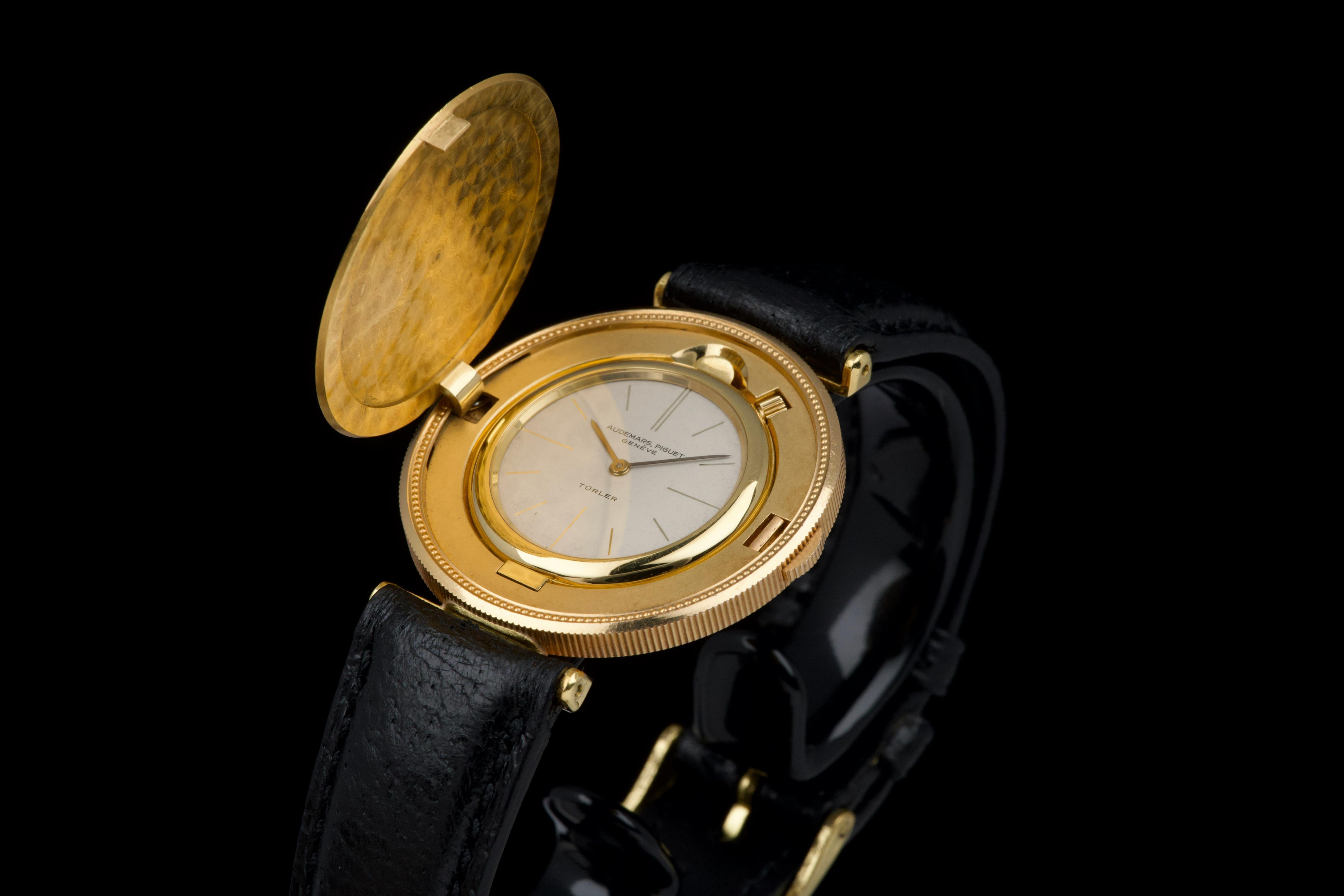 The present Audemars Piguet Coin Watch, double-signed Türler, dating to the 1970s, is a refined and historically evocative example of one of the most discreet and intellectually playful genres in 20th-century Swiss watchmaking. Executed in 18K yellow gold and measuring 34 mm in diameter, this watch reflects Audemars Piguet’s mastery of ultra-thin construction and elegant concealment. Coin watches emerged primarily during the 1950s–1970s, a period when several high-end manufactures—including Audemars Piguet, Patek Philippe, Piaget, and Vacheron Constantin—experimented with watches hidden inside genuine gold coins. Typically crafted from coins such as 20-dollar Double Eagles or European gold pieces, these watches were designed to appear entirely innocuous when closed, revealing their true nature only when hinged open. Beyond their novelty, coin watches were feats of technical ingenuity, requiring exceptionally thin movements and precise case engineering to preserve the coin’s original appearance and proportions. Audemars Piguet was among the most respected producers of such pieces, often supplying them to prestigious retailers like Türler, whose double signature on the dial adds an extra layer of collectability and provenance. Türler, based in Zurich, was known for commissioning discreet, high-quality complications for a refined clientele who valued understatement over ostentation. This example is fitted with a black leather strap (non-Audemars Piguet) and a gold-tone buckle (non-AP). No service history accompanies the watch. Nonetheless, it remains a charming and historically significant object, illustrating a fascinating chapter in Swiss watchmaking where technical sophistication was deliberately hidden behind the guise of everyday objects. Elegant, discreet, and rich in horological lore, this double-signed Audemars Piguet Coin Watch offers a rare opportunity to acquire a piece that perfectly encapsulates the playful ingenuity and refined discretion of haute horlogerie in the mid-20th century.