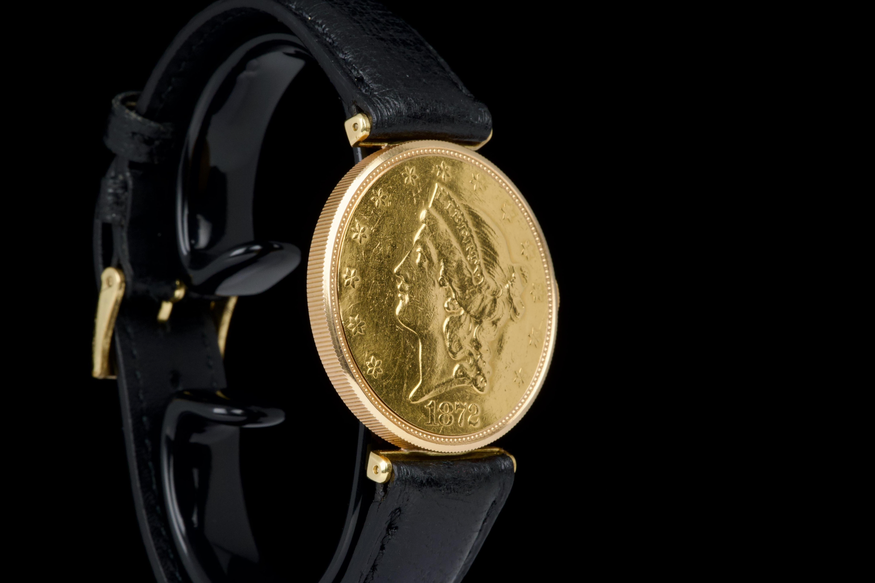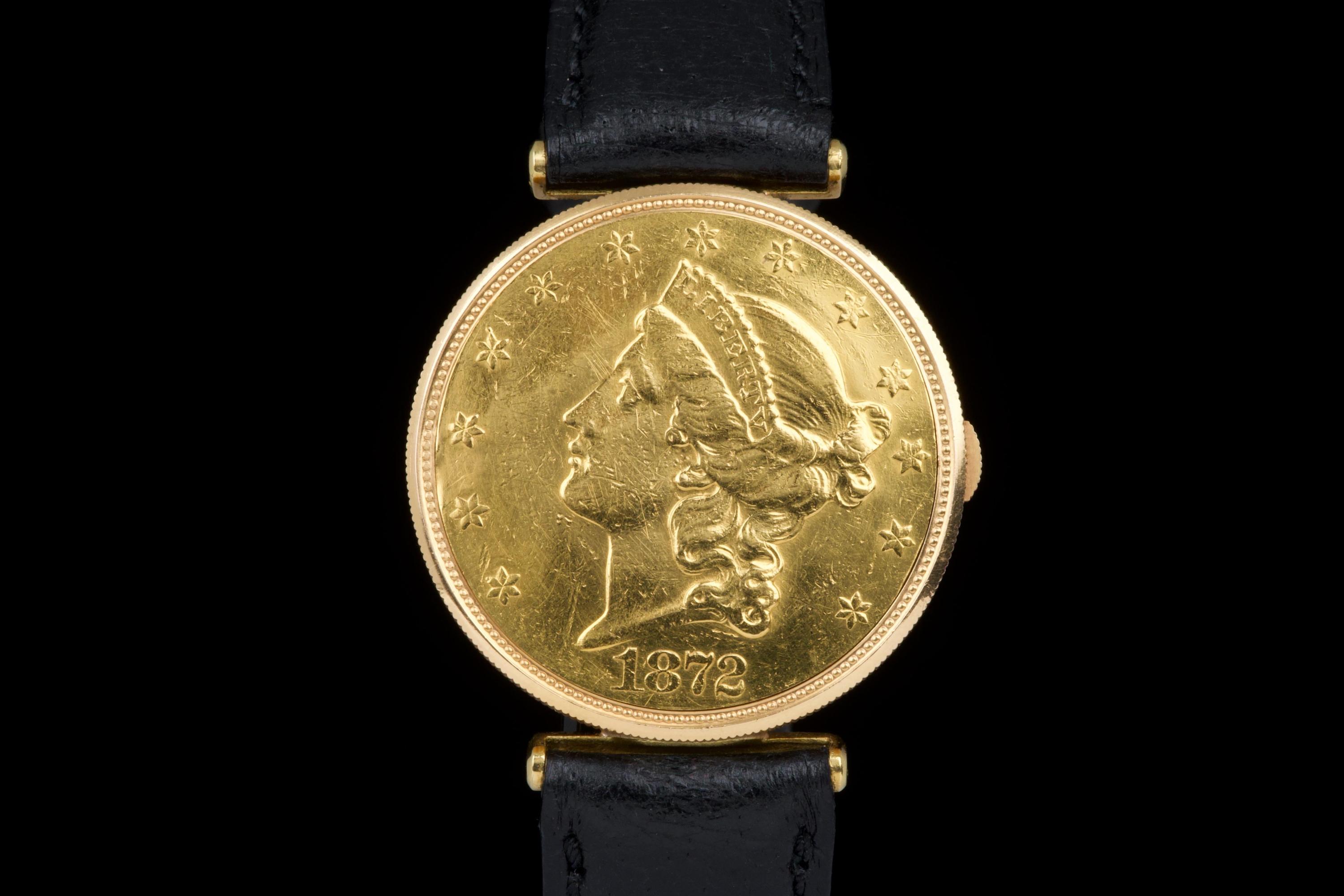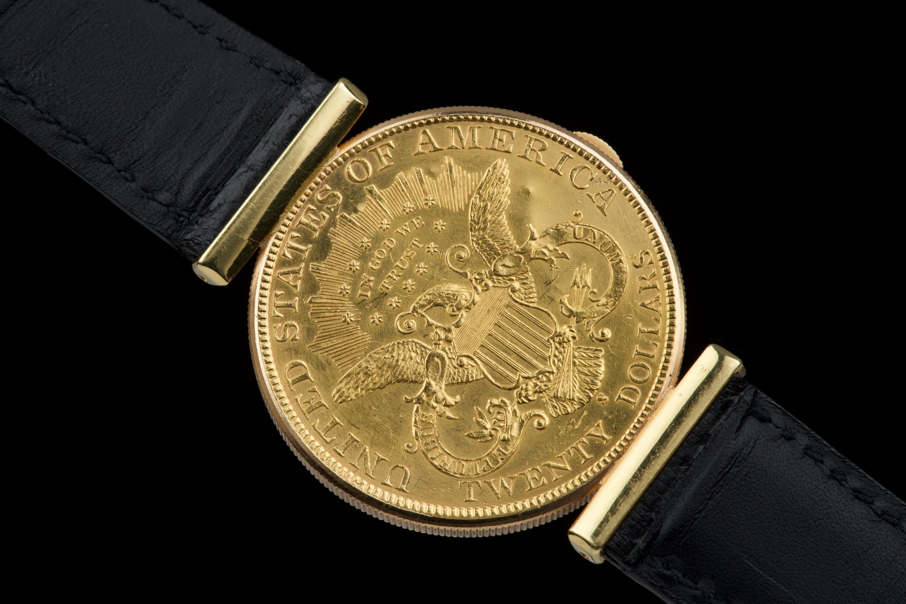 The present Audemars Piguet Coin Watch, double-signed Türler, dating to the 1970s, is a refined and historically evocative example of one of the most discreet and intellectually playful genres in 20th-century Swiss watchmaking. Executed in 18K yellow gold and measuring 34 mm in diameter, this watch reflects Audemars Piguet’s mastery of ultra-thin construction and elegant concealment. Coin watches emerged primarily during the 1950s–1970s, a period when several high-end manufactures—including Audemars Piguet, Patek Philippe, Piaget, and Vacheron Constantin—experimented with watches hidden inside genuine gold coins. Typically crafted from coins such as 20-dollar Double Eagles or European gold pieces, these watches were designed to appear entirely innocuous when closed, revealing their true nature only when hinged open. Beyond their novelty, coin watches were feats of technical ingenuity, requiring exceptionally thin movements and precise case engineering to preserve the coin’s original appearance and proportions. Audemars Piguet was among the most respected producers of such pieces, often supplying them to prestigious retailers like Türler, whose double signature on the dial adds an extra layer of collectability and provenance. Türler, based in Zurich, was known for commissioning discreet, high-quality complications for a refined clientele who valued understatement over ostentation. This example is fitted with a black leather strap (non-Audemars Piguet) and a gold-tone buckle (non-AP). No service history accompanies the watch. Nonetheless, it remains a charming and historically significant object, illustrating a fascinating chapter in Swiss watchmaking where technical sophistication was deliberately hidden behind the guise of everyday objects. Elegant, discreet, and rich in horological lore, this double-signed Audemars Piguet Coin Watch offers a rare opportunity to acquire a piece that perfectly encapsulates the playful ingenuity and refined discretion of haute horlogerie in the mid-20th century.