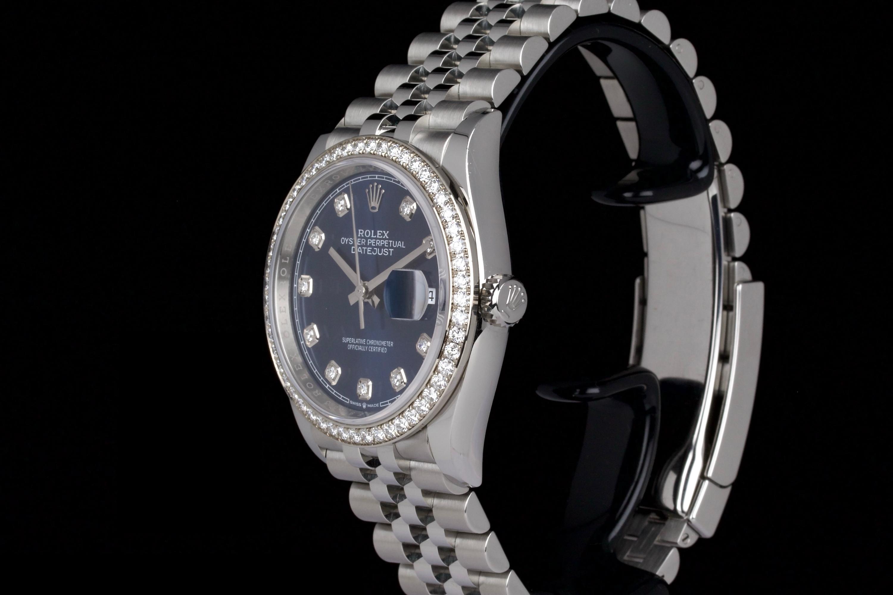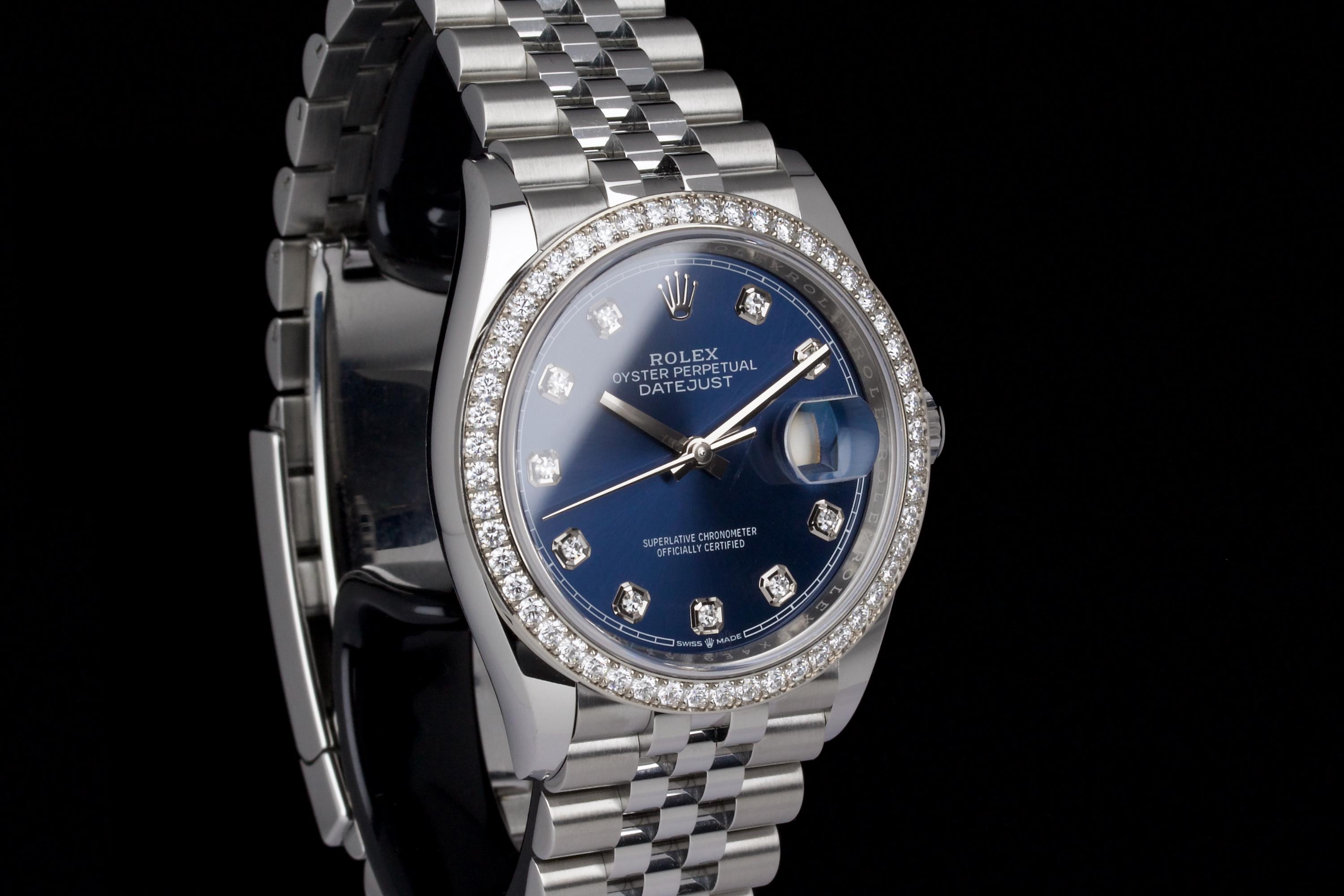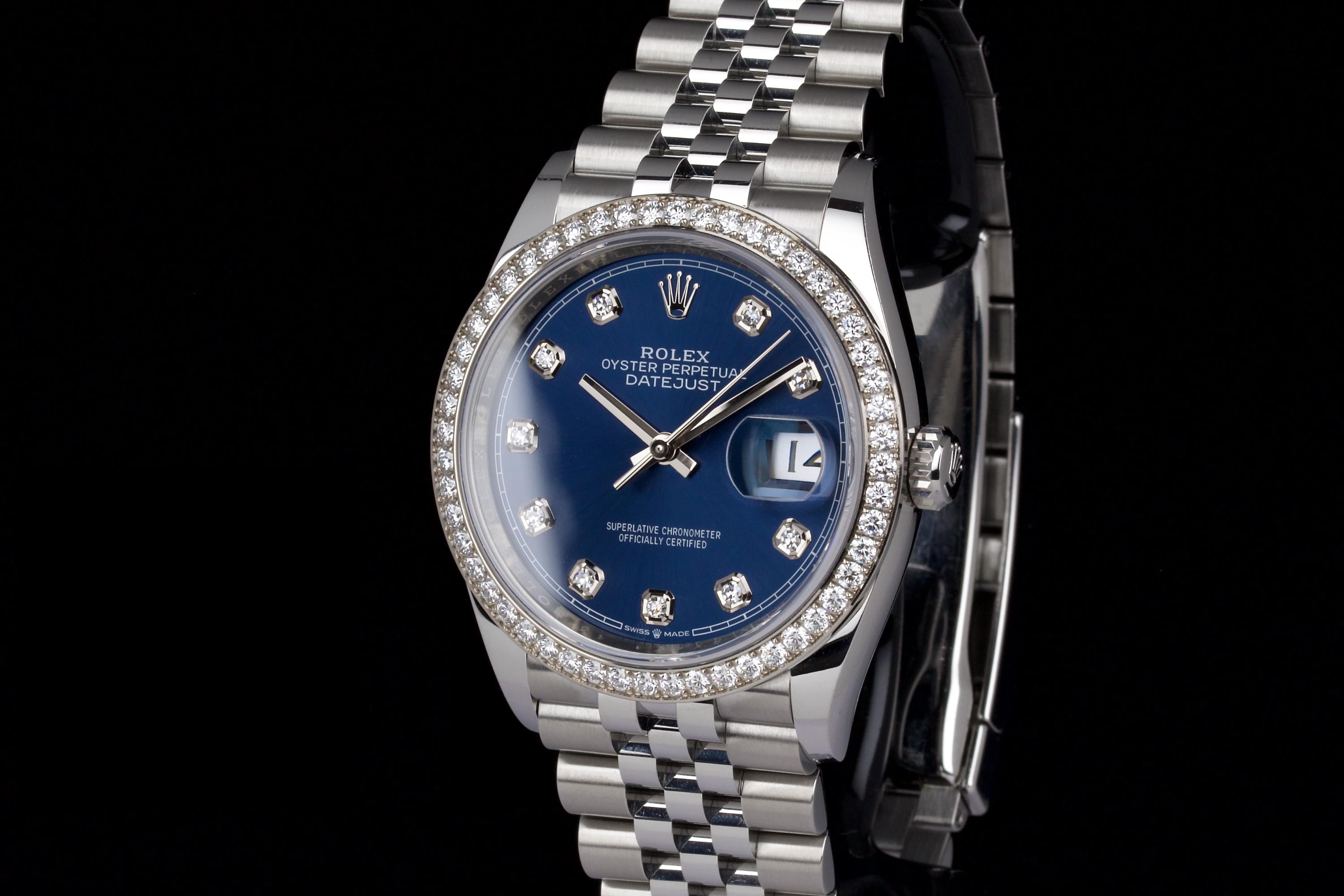 This Rolex Datejust 36 mm reference 126284RBR stands out with its factory-set diamond bezel and striking sunburst blue dial featuring diamond hour markers. The result is a refined and luxurious version of Rolex’s most iconic model, balancing sparkle with everyday wearability. The watch is unpolished and remains in excellent condition, showing only light wear from occasional use. It is fitted with a stainless steel case and white gold diamond bezel, and comes with its original box (no warranty card). An elegant and contemporary Datejust, ideal for those looking for a modern piece with classic proportions and factory diamond details.