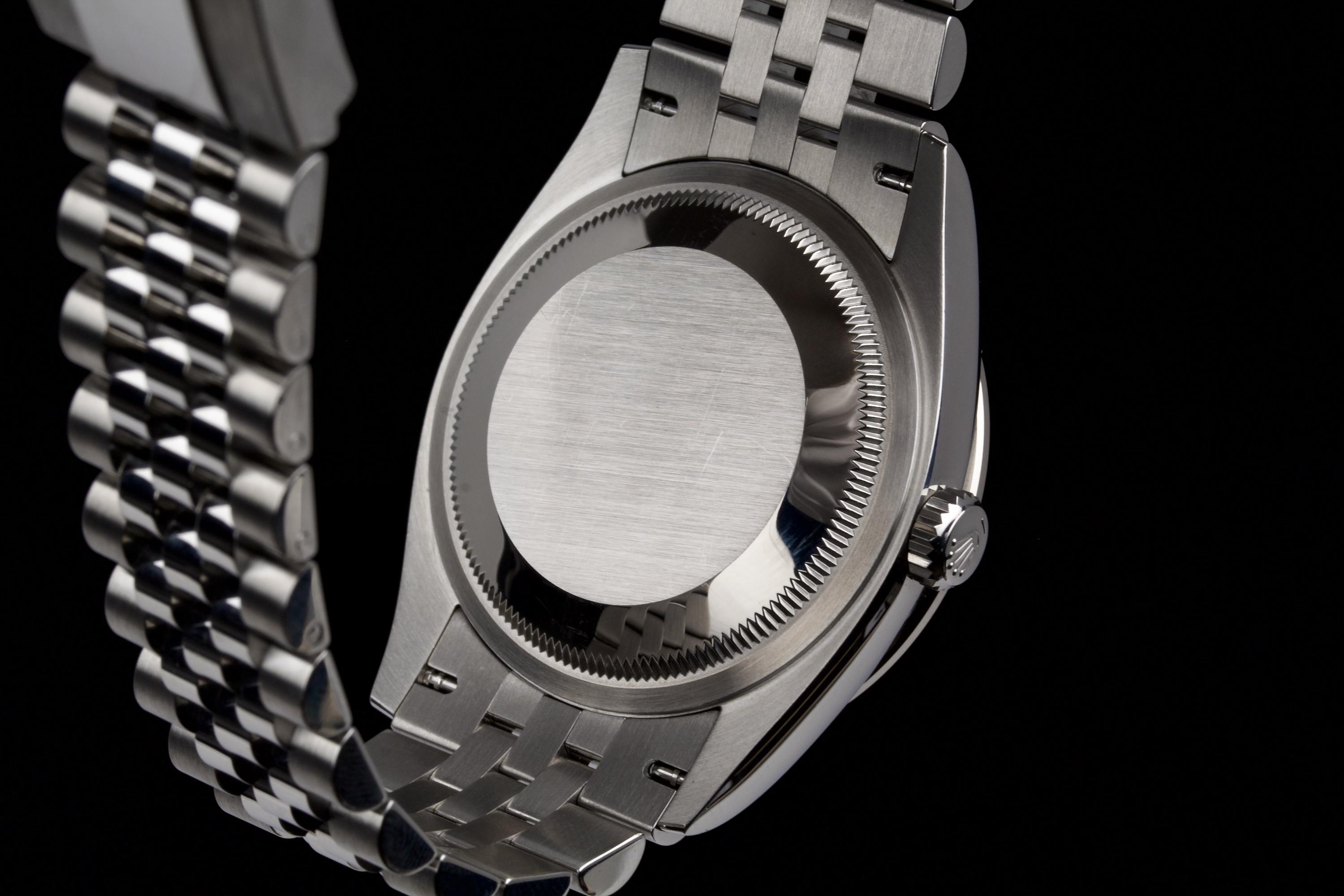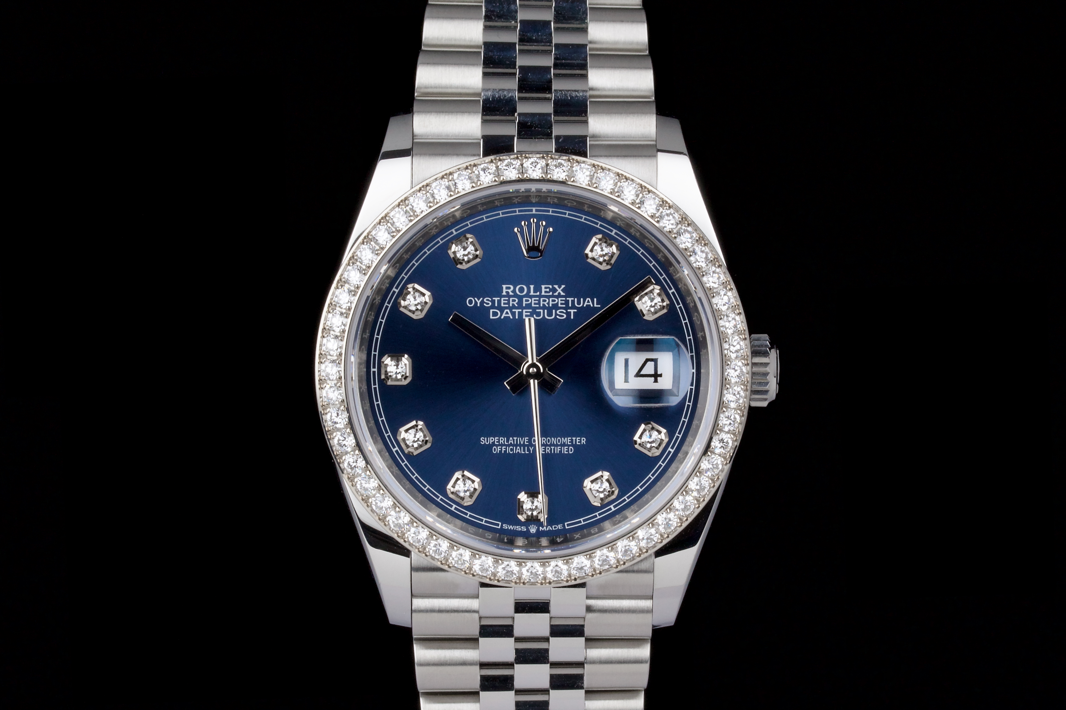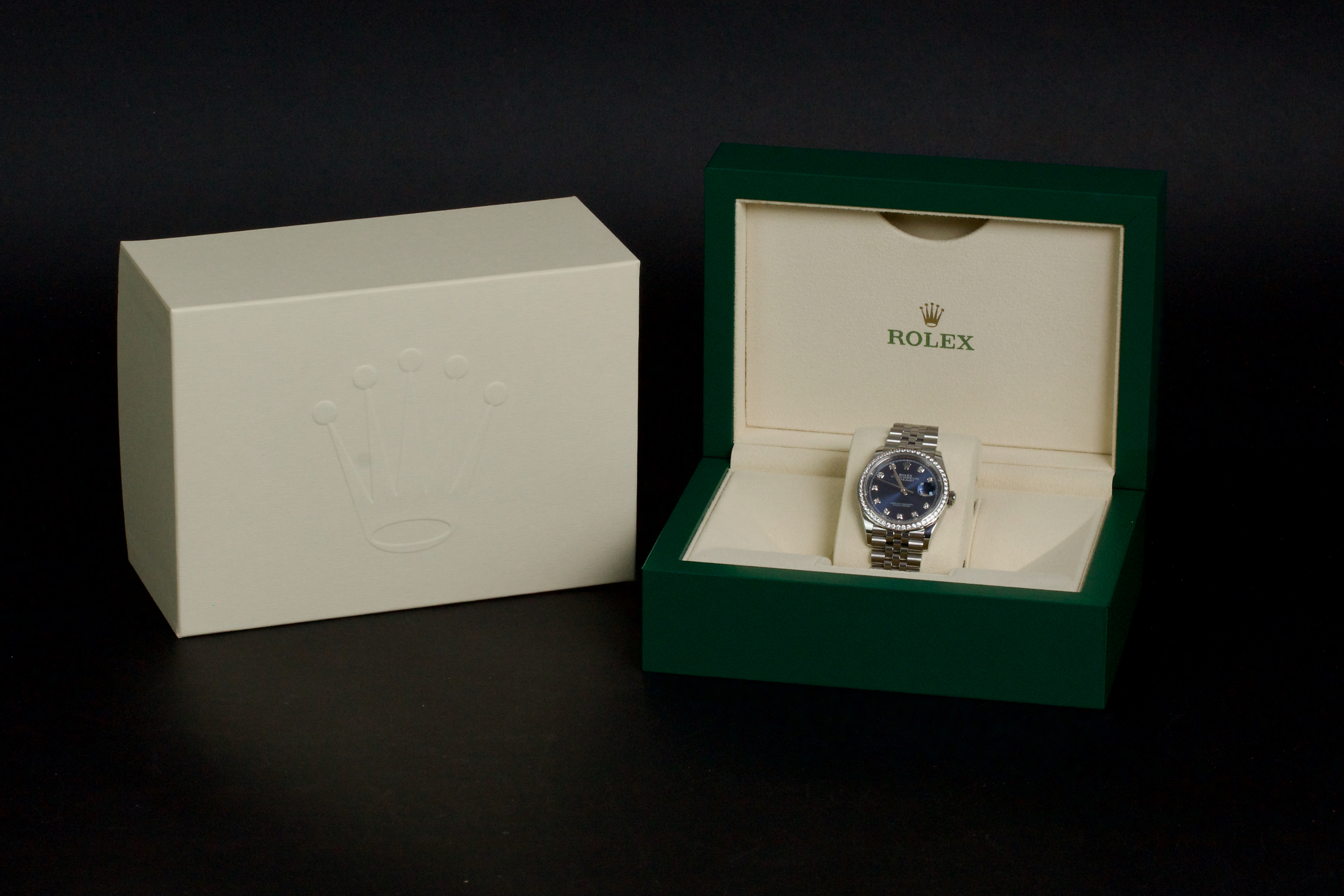 This Rolex Datejust 36 mm reference 126284RBR stands out with its factory-set diamond bezel and striking sunburst blue dial featuring diamond hour markers. The result is a refined and luxurious version of Rolex’s most iconic model, balancing sparkle with everyday wearability. The watch is unpolished and remains in excellent condition, showing only light wear from occasional use. It is fitted with a stainless steel case and white gold diamond bezel, and comes with its original box (no warranty card). An elegant and contemporary Datejust, ideal for those looking for a modern piece with classic proportions and factory diamond details.