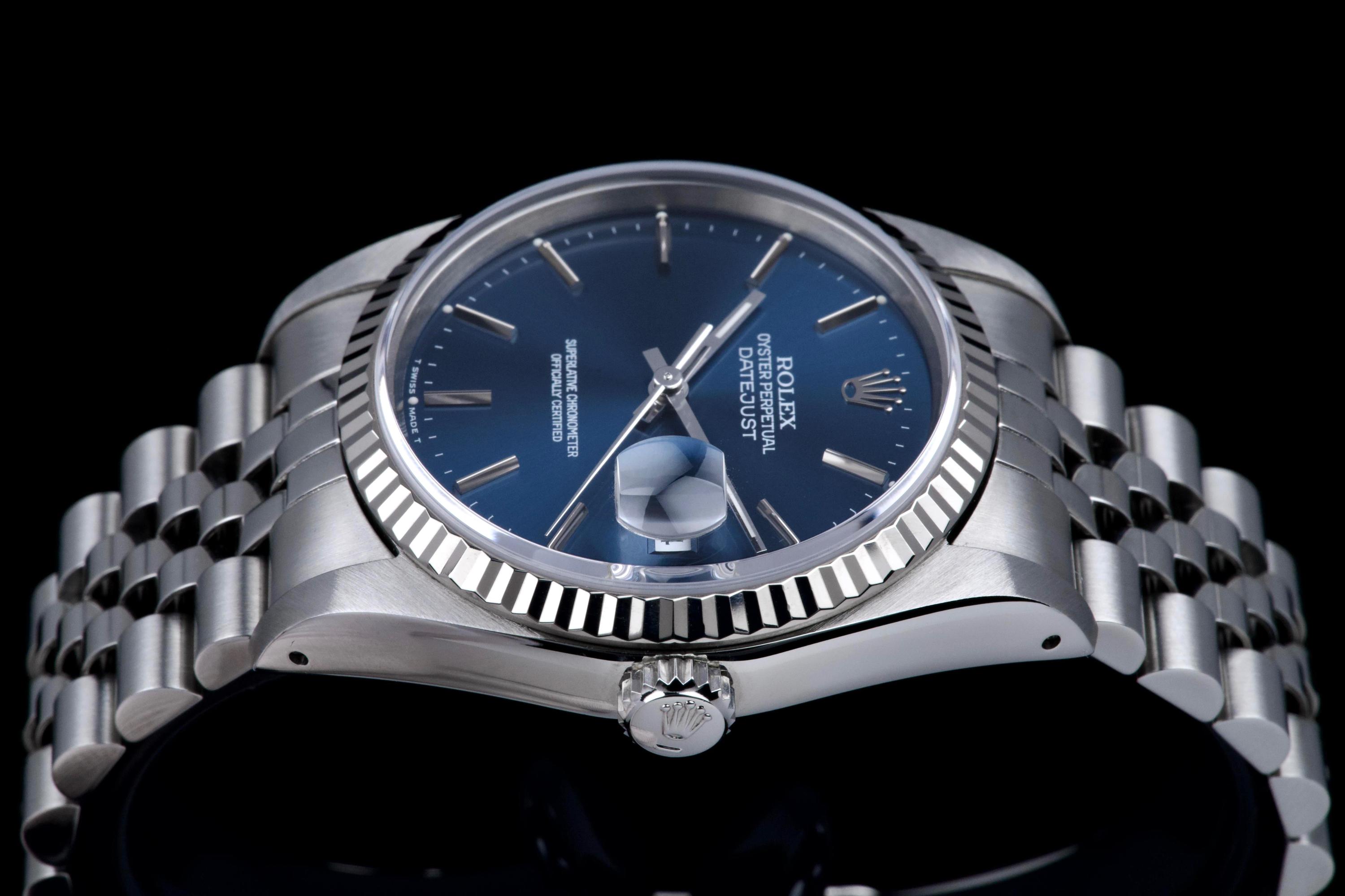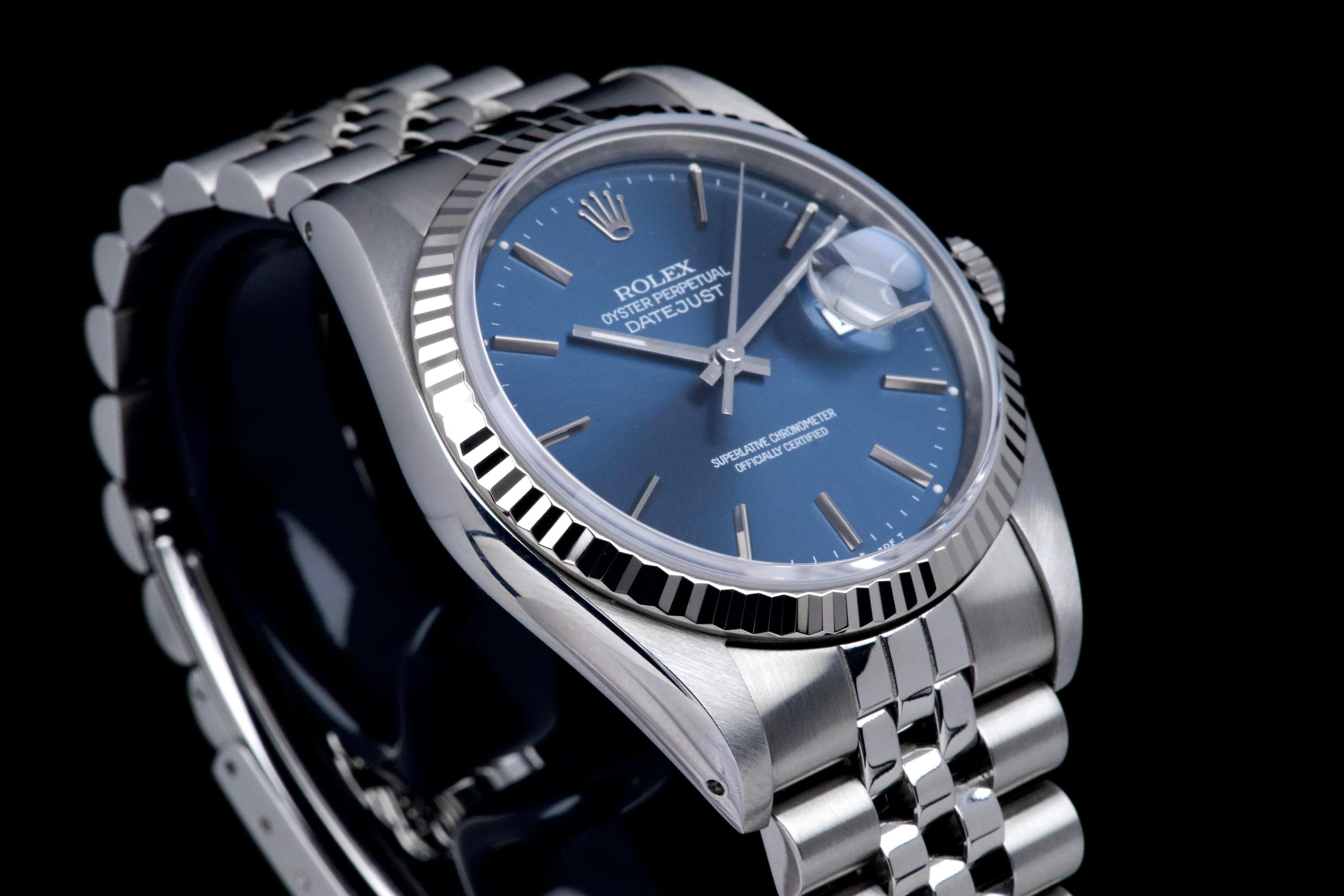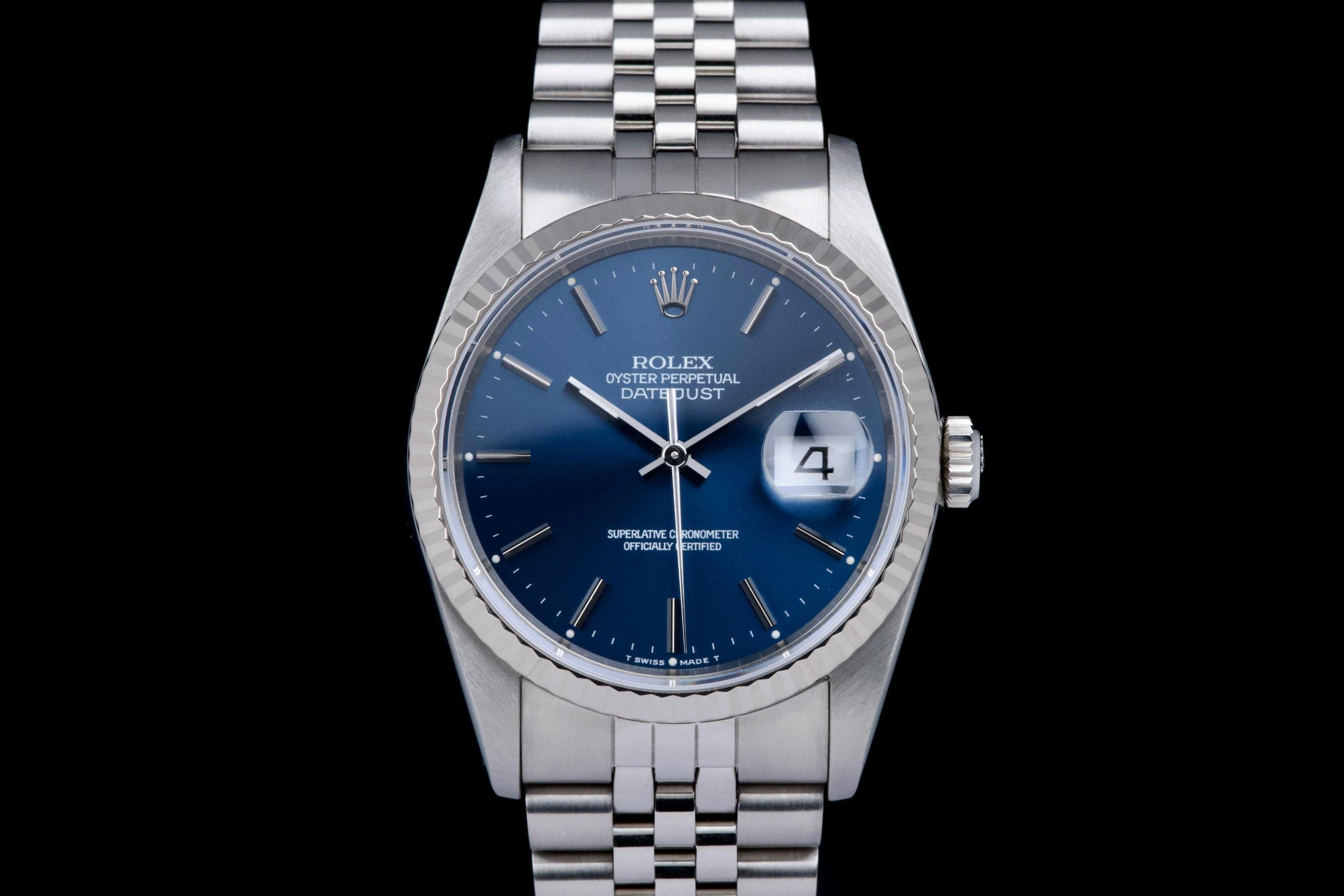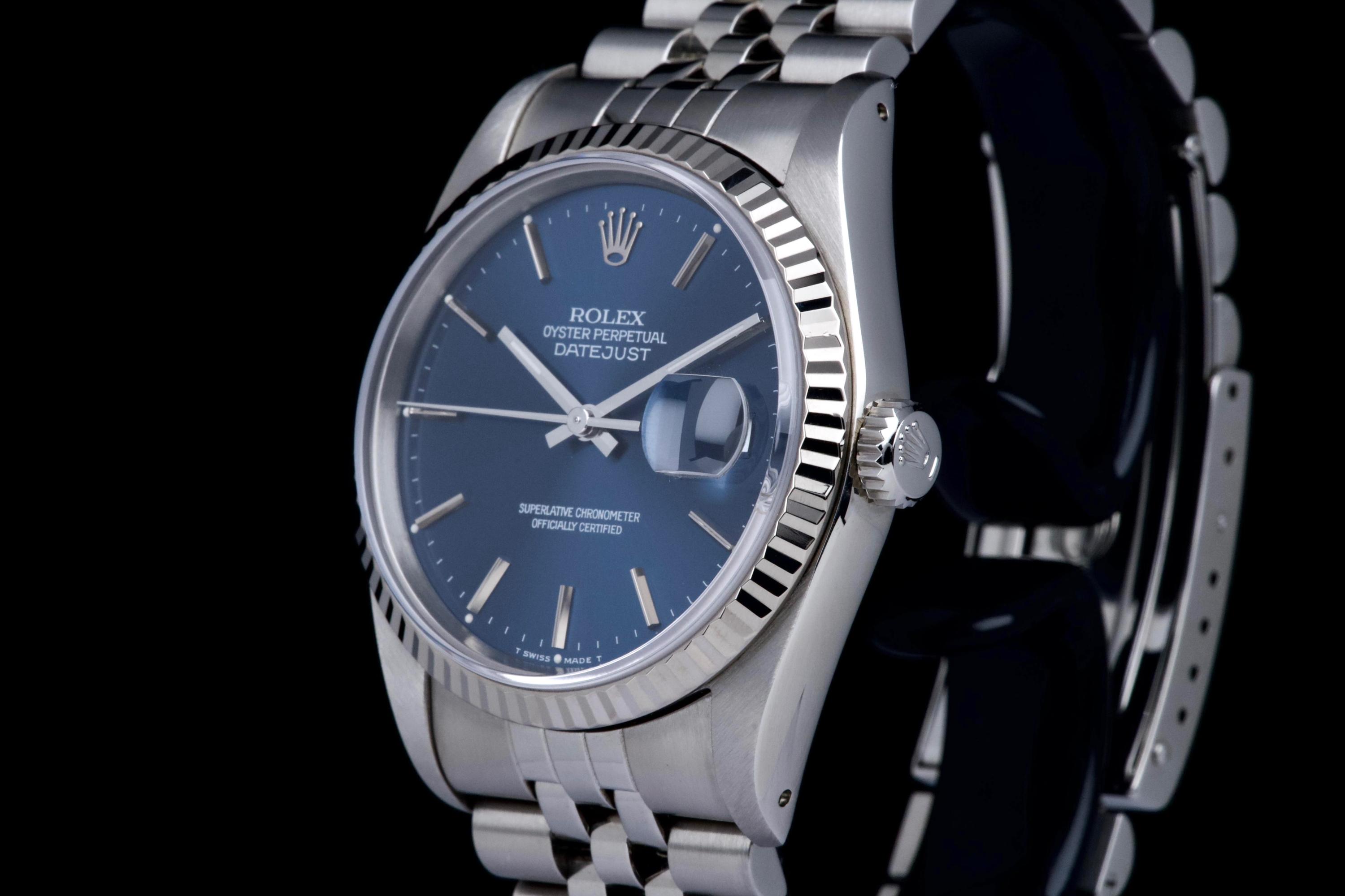The Rolex Datejust 36 reference 16234, dating to circa 1990, is offered as a complete full set and represents a timeless expression of one of the brand’s most iconic models. The watch features a 36 mm stainless steel Oyster case complemented by an 18k white gold fluted bezel, creating the elegant contrast that defines the Datejust line. Its classic dial configuration offers a refined and highly versatile aesthetic, enhanced by applied hour markers and the signature date display at 3 o’clock with Cyclops magnification. Powered by a reliable automatic Rolex movement, the watch ensures precise and dependable performance for everyday wear. It is fitted with its matching bracelet, providing both comfort and a balanced presence on the wrist. The watch has been recently serviced and polished by our watchmaker and is presented in very good overall condition, with a clean and refreshed appearance. Offered with its full original set including box, warranty papers, and accessories, this reference 16234 represents an excellent opportunity to acquire a classic and enduring Rolex model suitable for any occasion.