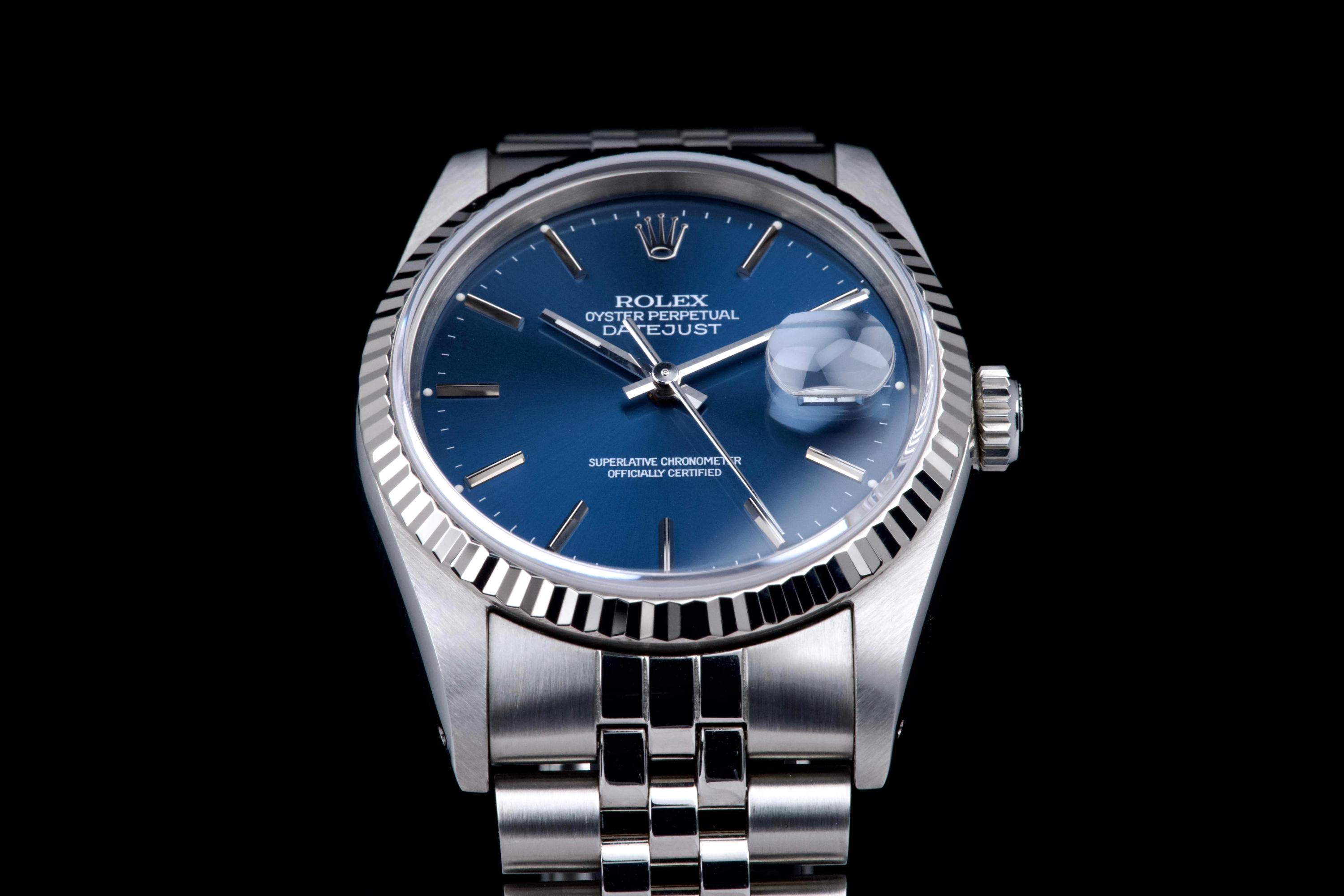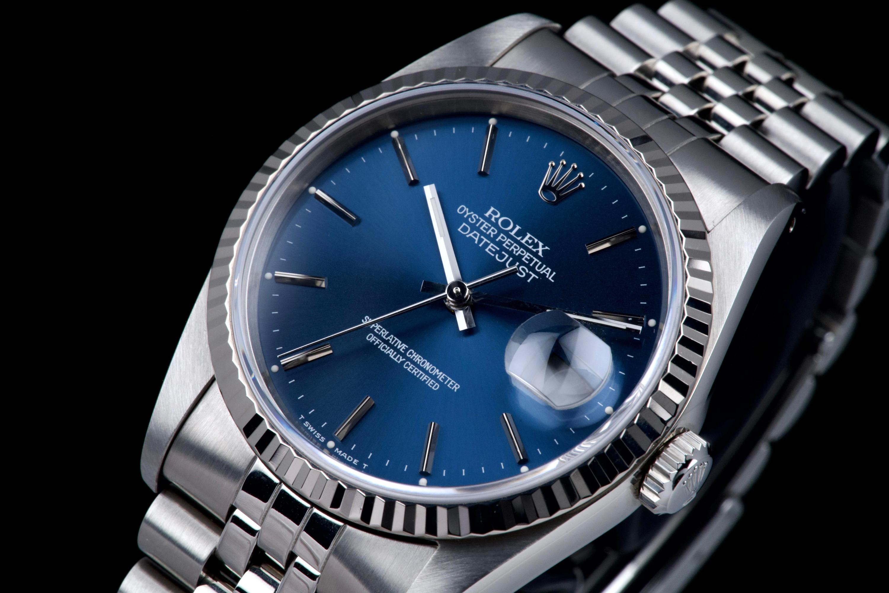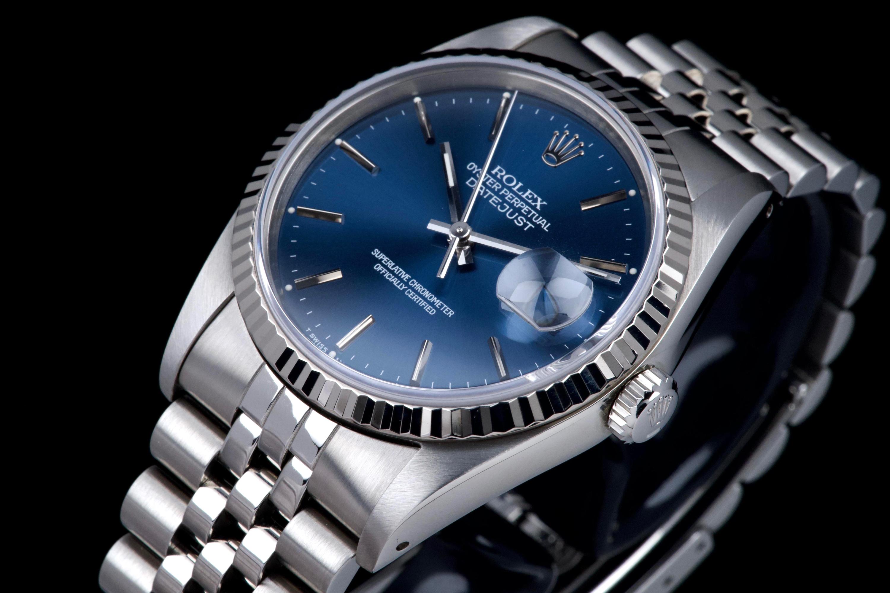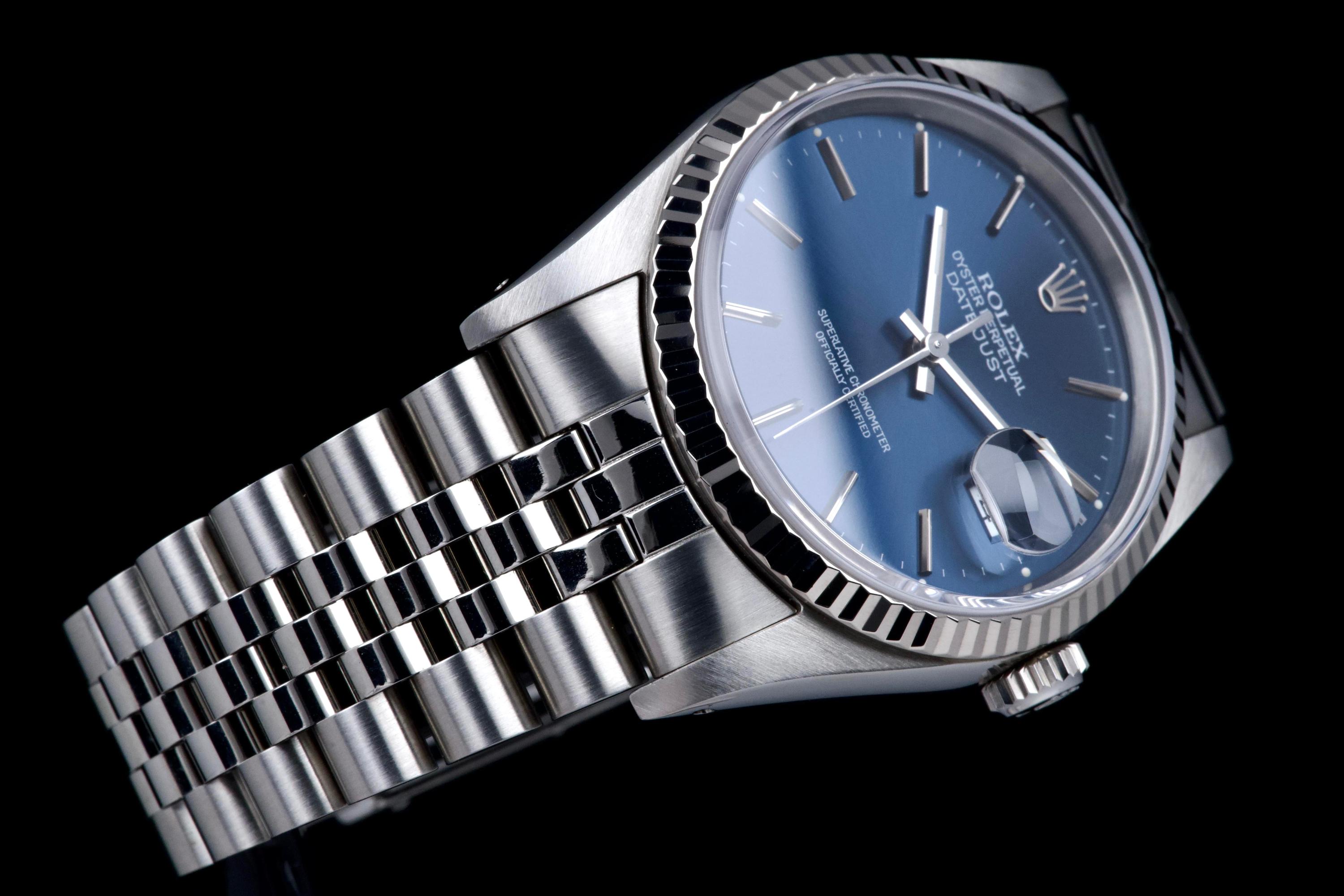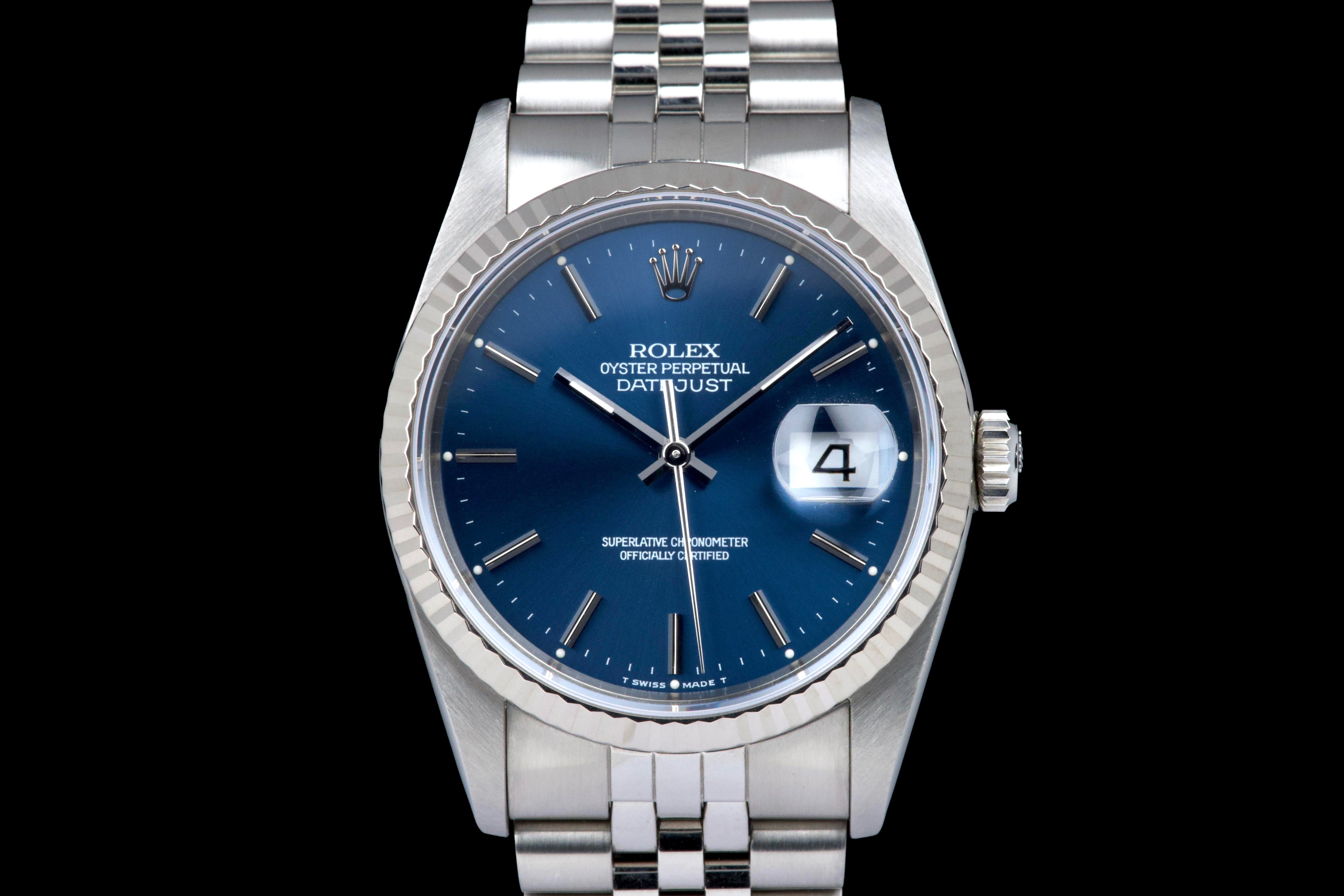 The Rolex Datejust 36 reference 16234, dating to circa 1990, is offered as a complete full set and represents a timeless expression of one of the brand’s most iconic models. The watch features a 36 mm stainless steel Oyster case complemented by an 18k white gold fluted bezel, creating the elegant contrast that defines the Datejust line. Its classic dial configuration offers a refined and highly versatile aesthetic, enhanced by applied hour markers and the signature date display at 3 o’clock with Cyclops magnification. Powered by a reliable automatic Rolex movement, the watch ensures precise and dependable performance for everyday wear. It is fitted with its matching bracelet, providing both comfort and a balanced presence on the wrist. The watch has been recently serviced and polished by our watchmaker and is presented in very good overall condition, with a clean and refreshed appearance. Offered with its full original set including box, warranty papers, and accessories, this reference 16234 represents an excellent opportunity to acquire a classic and enduring Rolex model suitable for any occasion.