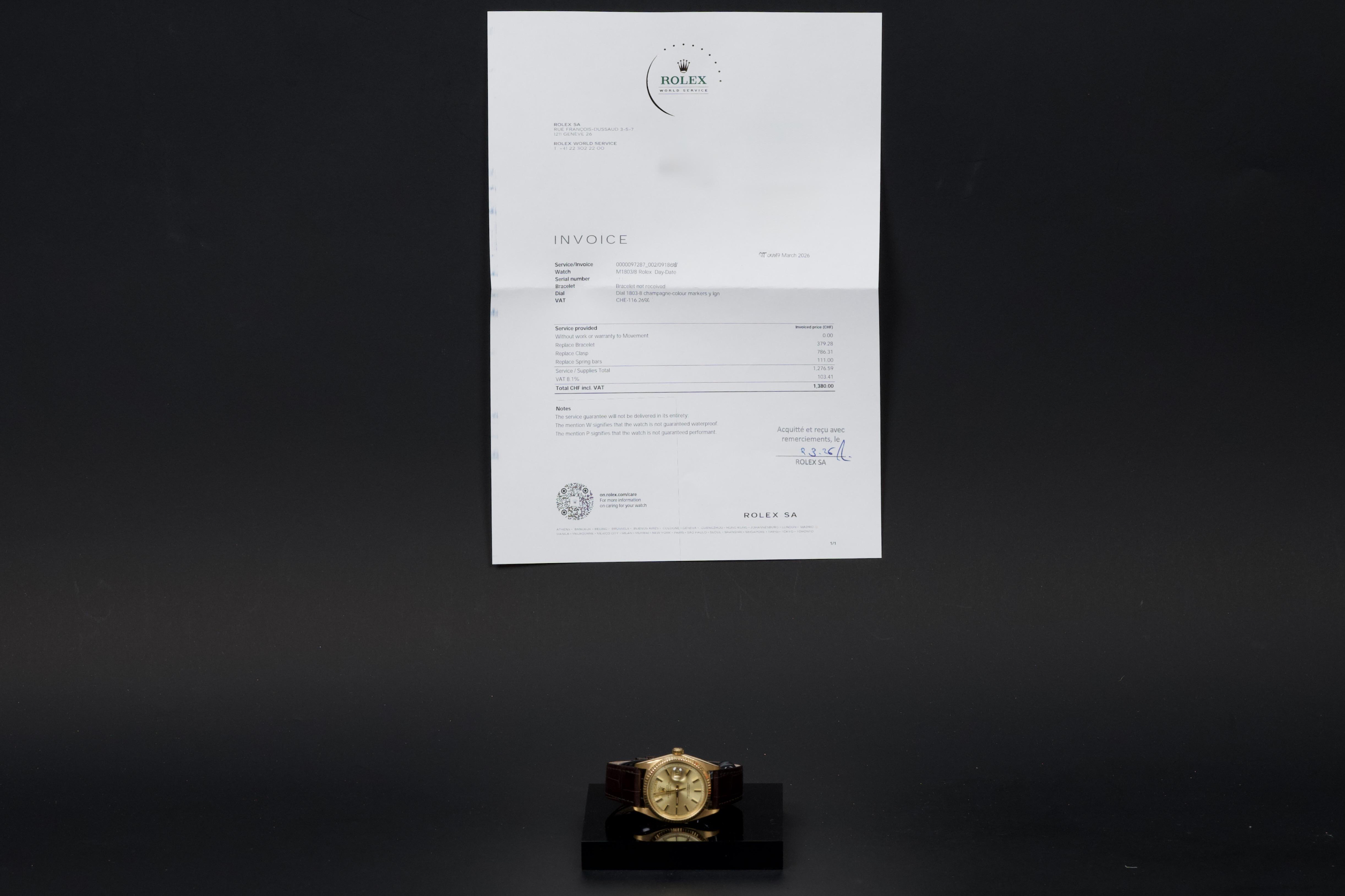 A classic Rolex Day-Date reference 1803/8 in 18k yellow gold, dating to 1970 (serial 2956XXX), presented on a brown crocodile leather strap. The case is in excellent condition, remaining sharp with well-defined edges, and the fluted bezel is equally well preserved, enhancing the overall presence of the watch. The champagne dial is in very good condition overall, with a light and honest vintage character. Some of the tritium plots show minor flaking, with the lume at 10 o’clock missing, which is not uncommon for a watch of this age. The hands are in excellent condition and fully matching, maintaining a cohesive look. The watch has benefited from a recent intervention at Rolex Geneva in 2026, including the replacement of the strap, 18k yellow gold buckle, and spring bars. The proper functioning of the movement was checked during this service. A clean and well-preserved example of the iconic Day-Date, combining sharp case proportions, a pleasing dial, and the timeless elegance of yellow gold.
