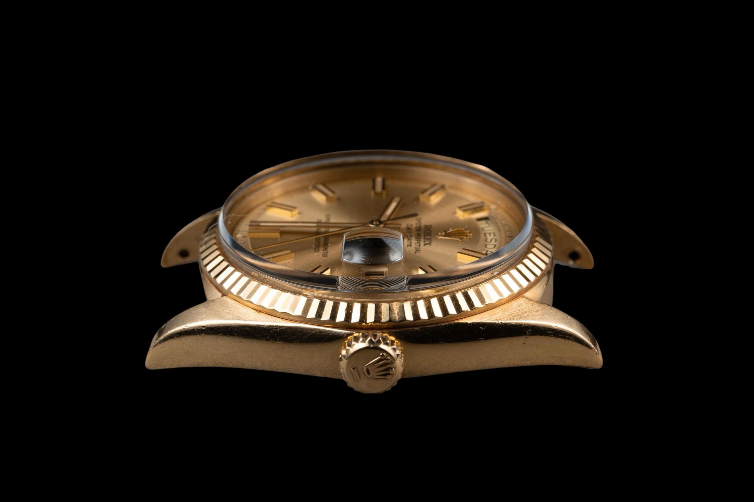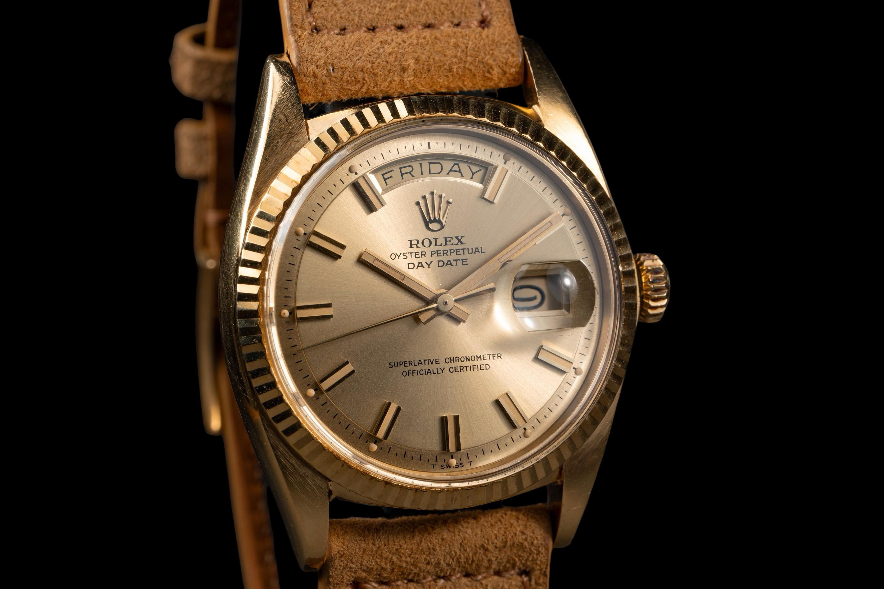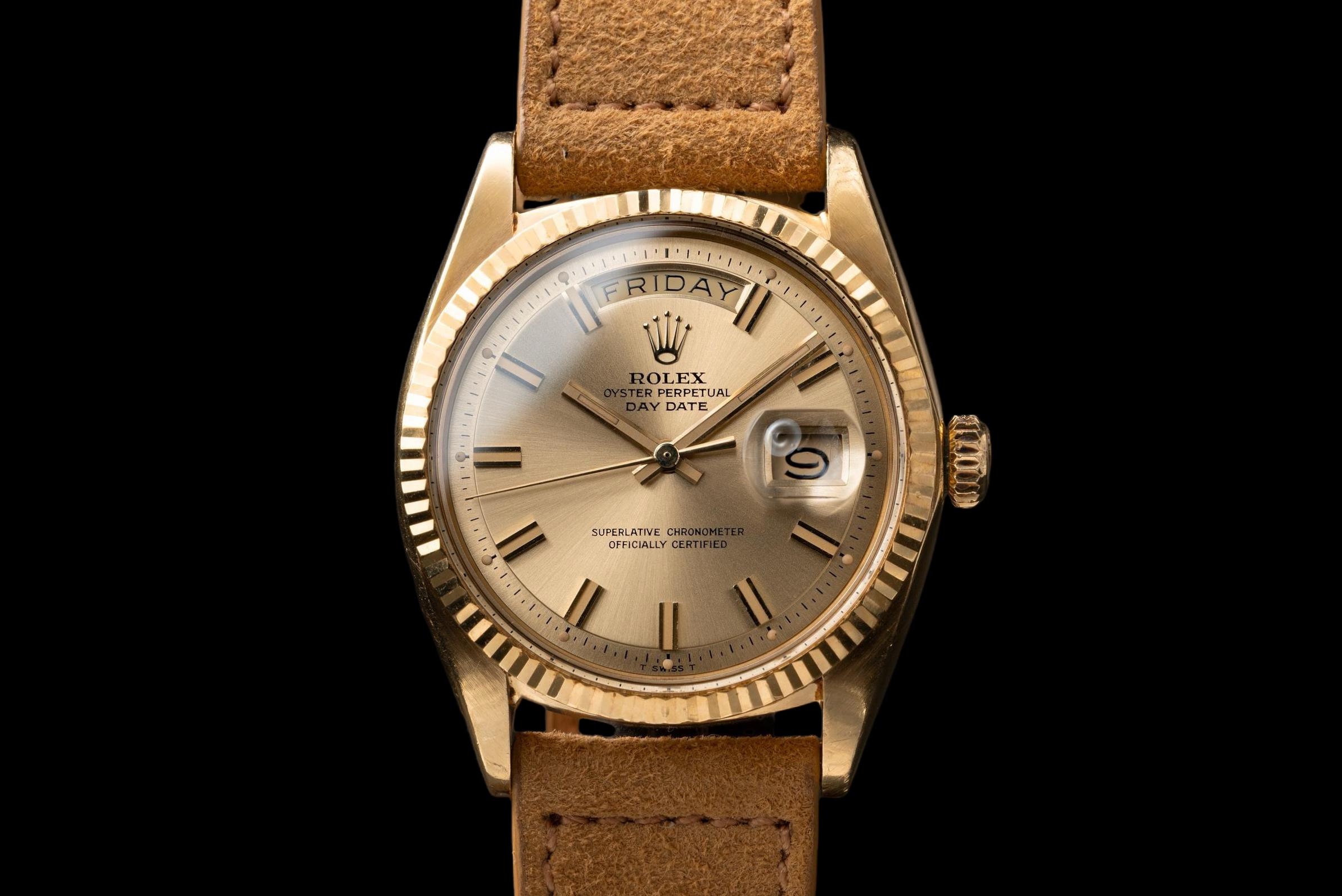 Rolex Day-Date reference 1803 in 18K yellow gold, produced in 1970 and featuring the highly sought-after “Wide Boy” champagne dial with stepped minute track. The 36mm yellow gold case is in excellent condition, showing only light signs of wear, as is the fluted bezel which remains sharp and well-defined. The stepped champagne dial is beautifully preserved, with bold Wide Boy indexes and matching wide hands. The tritium lume has aged to a warm, creamy hue, and the hands perfectly match the dial. The watch is fitted with a tan suede Molequin strap in excellent condition with gold platted Rolex ardillon buckle. No accessories are included. A well-balanced and elegant vintage Day-Date, appreciated for its distinctive dial configuration and understated presence on the wrist.