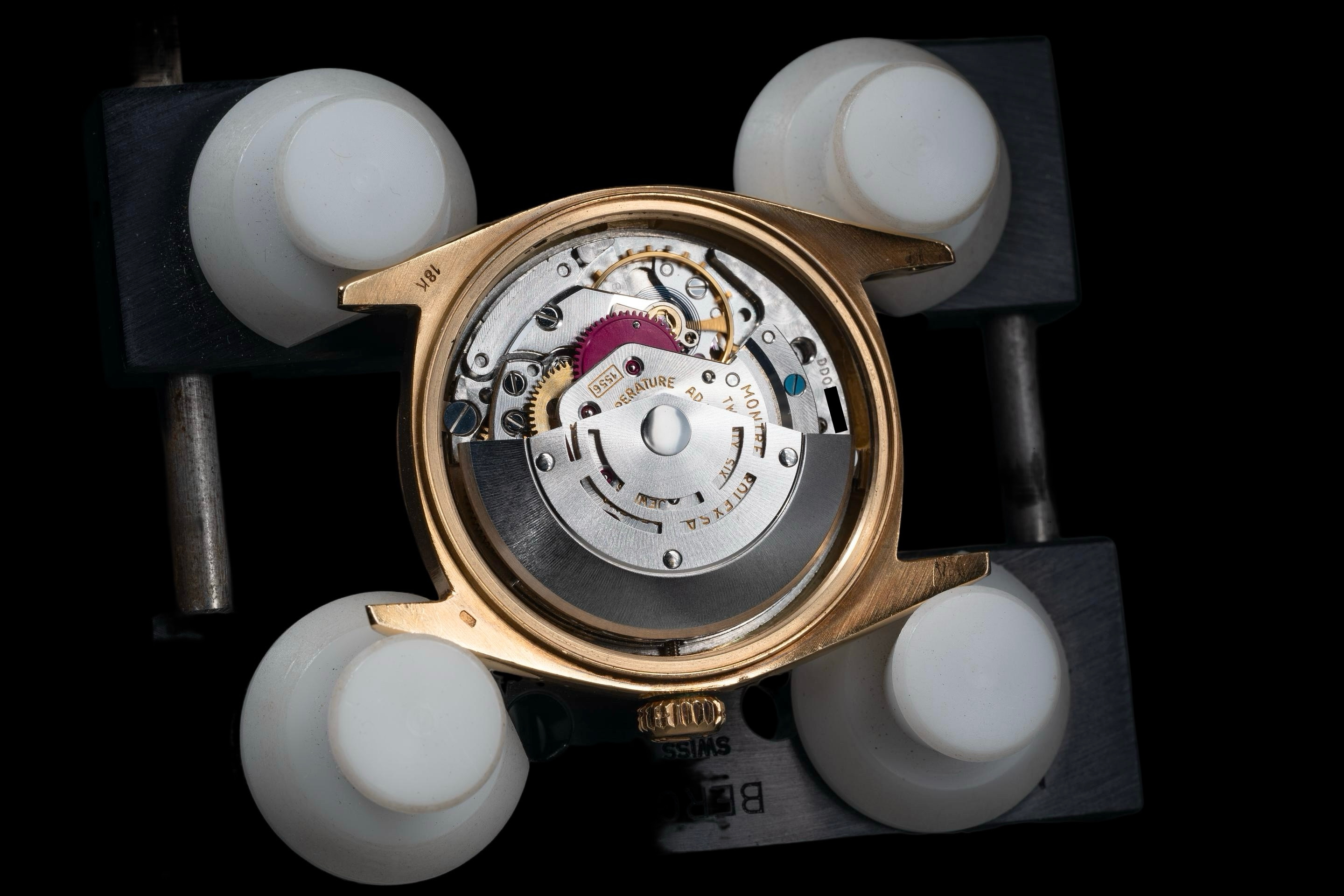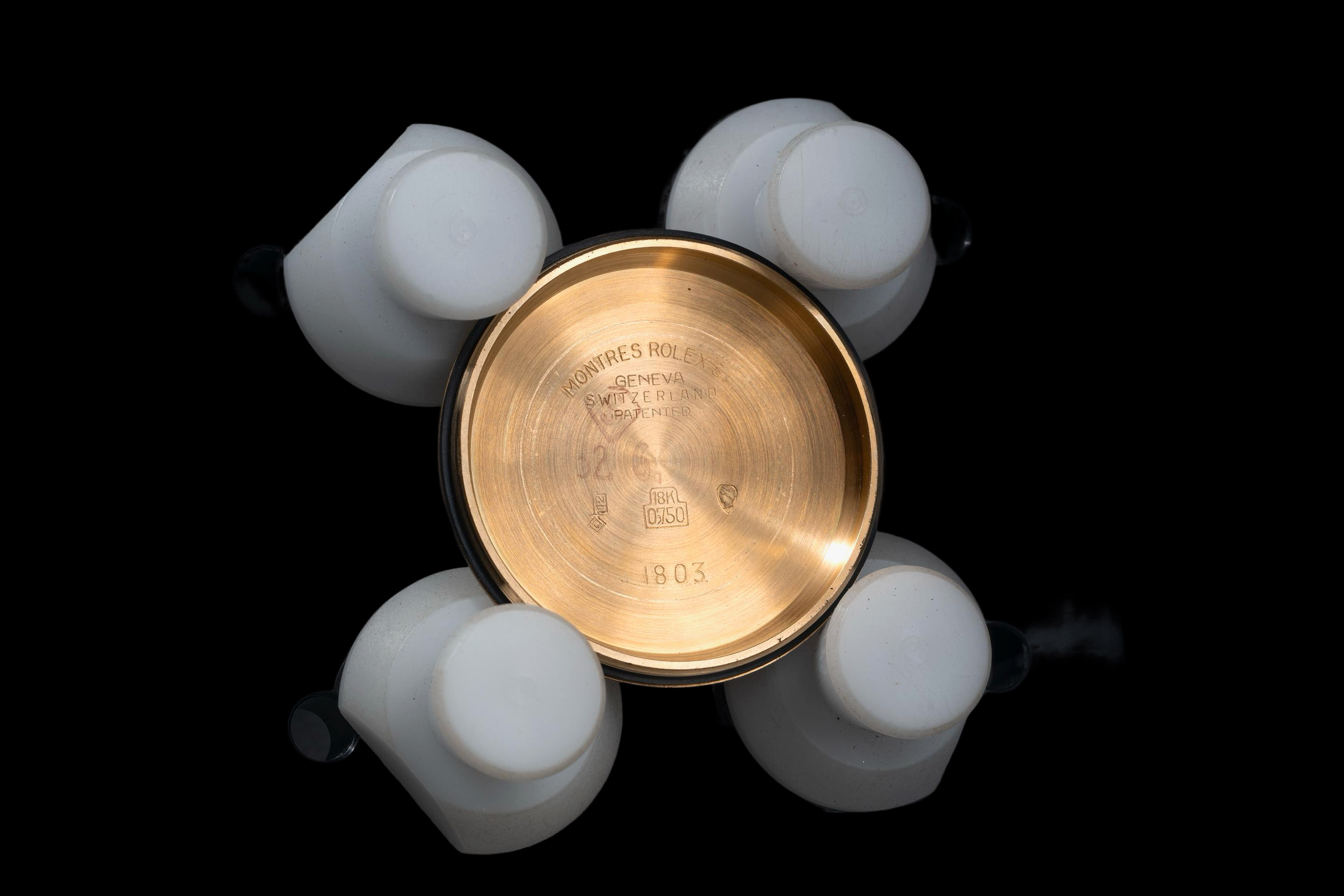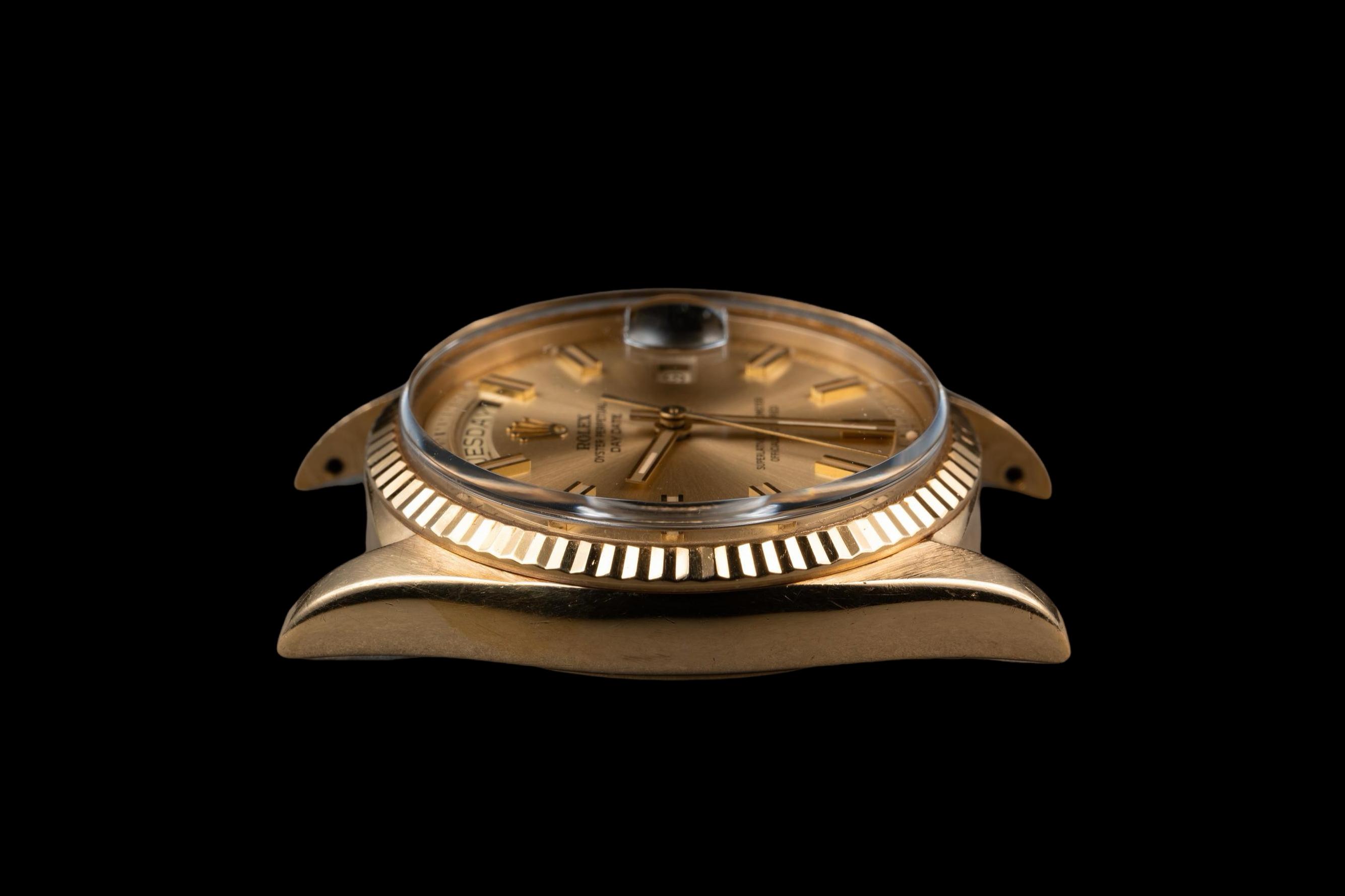 Rolex Day-Date reference 1803 in 18K yellow gold, produced in 1970 and featuring the highly sought-after “Wide Boy” champagne dial with stepped minute track. The 36mm yellow gold case is in excellent condition, showing only light signs of wear, as is the fluted bezel which remains sharp and well-defined. The stepped champagne dial is beautifully preserved, with bold Wide Boy indexes and matching wide hands. The tritium lume has aged to a warm, creamy hue, and the hands perfectly match the dial. The watch is fitted with a tan suede Molequin strap in excellent condition with gold platted Rolex ardillon buckle. No accessories are included. A well-balanced and elegant vintage Day-Date, appreciated for its distinctive dial configuration and understated presence on the wrist.