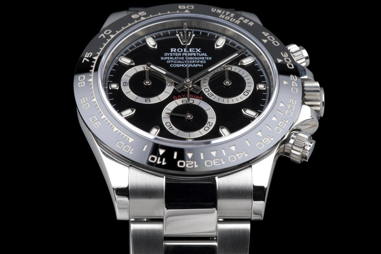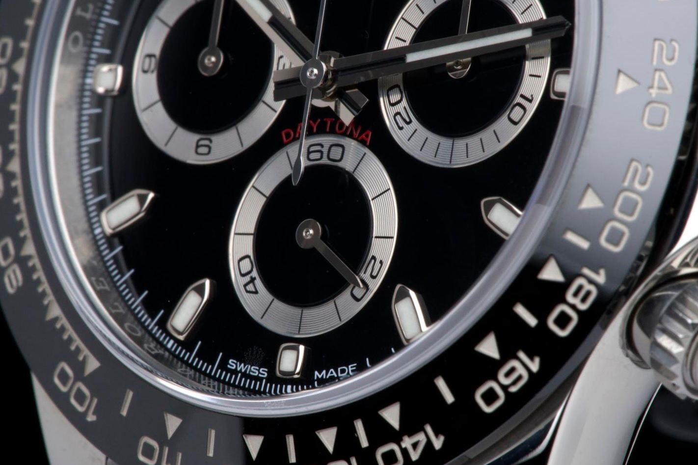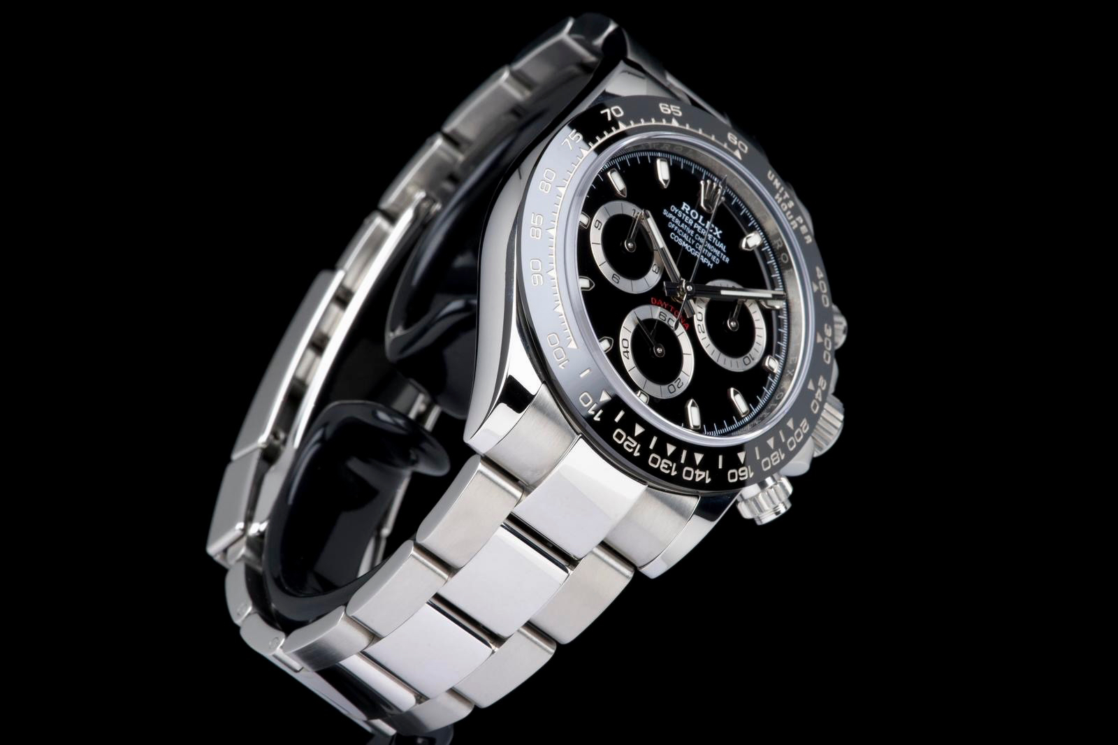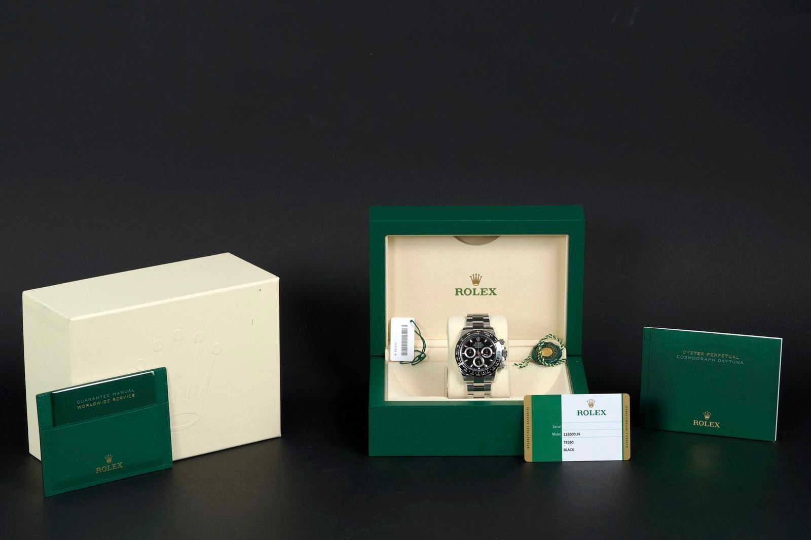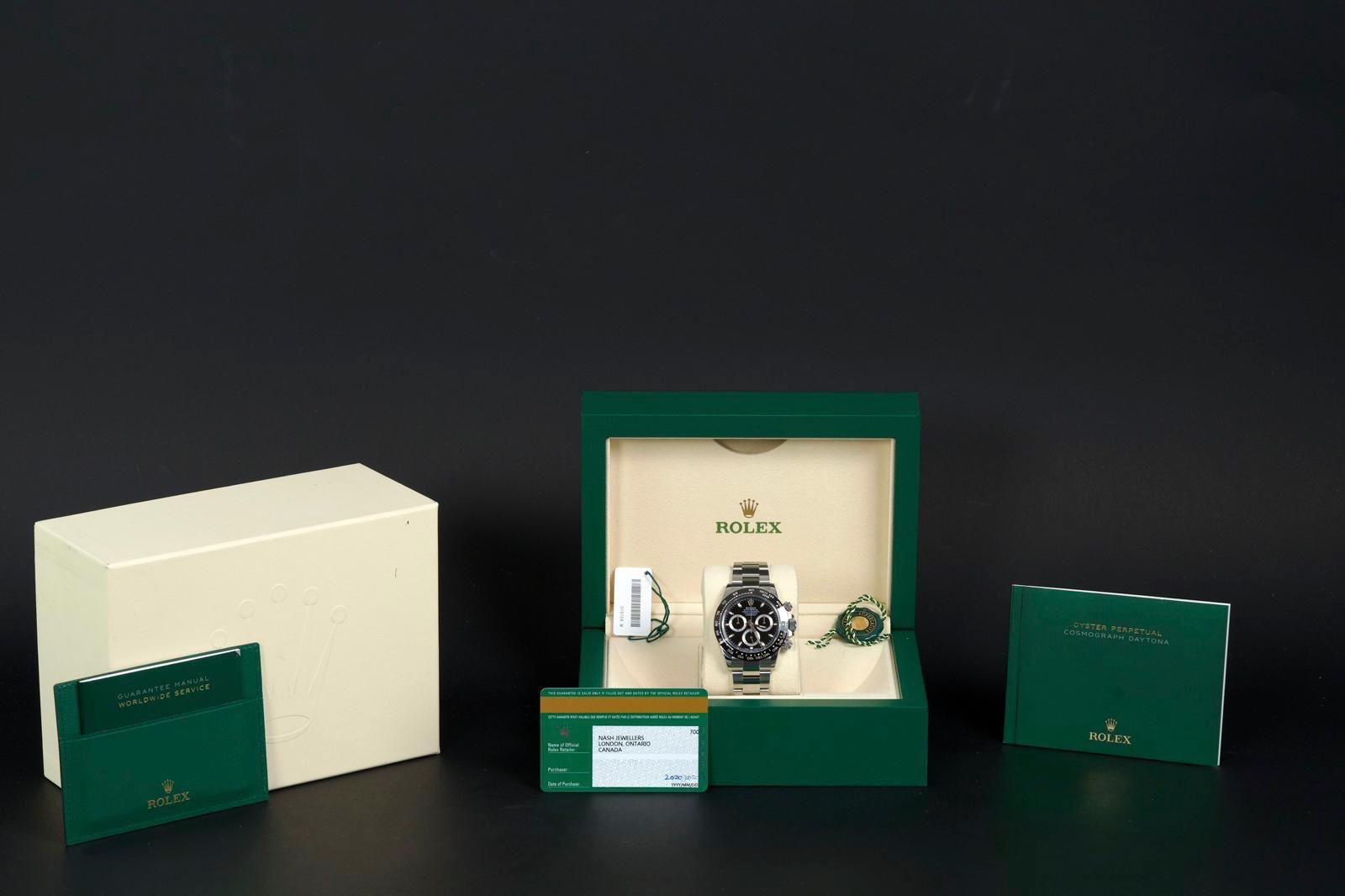 Presented here is a modern icon of Rolex sports chronographs: the Cosmograph Daytona reference 116500LN with black dial. Introduced with a Cerachrom bezel and instantly recognizable for its balanced and highly legible design, this stainless steel Daytona remains one of the most sought-after contemporary Rolex models. This example dates to 2020 and was originally sold in Ontario, Canada, accompanied by the earlier-style warranty card. The watch has recently been professionally polished by our watchmaker and now presents in excellent condition, with clean lines and a refined overall appearance. Offered as a full set with its original box, papers, and accessories, the watch has no recorded service history but is in perfect working order, having been checked by our watchmaker. A well-presented and complete example of a contemporary Daytona, combining strong desirability with immediate wearability.