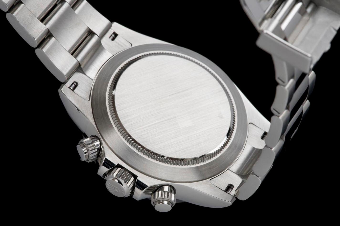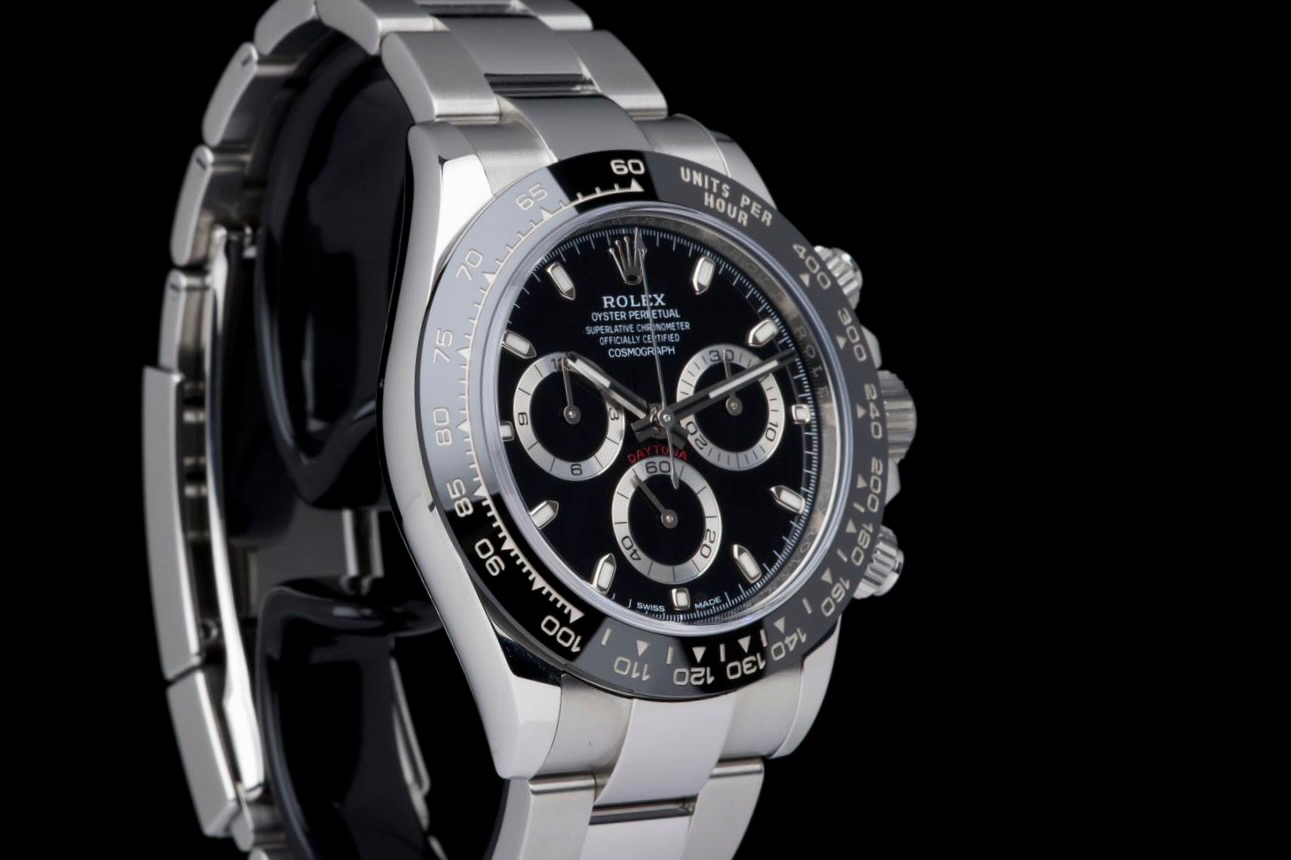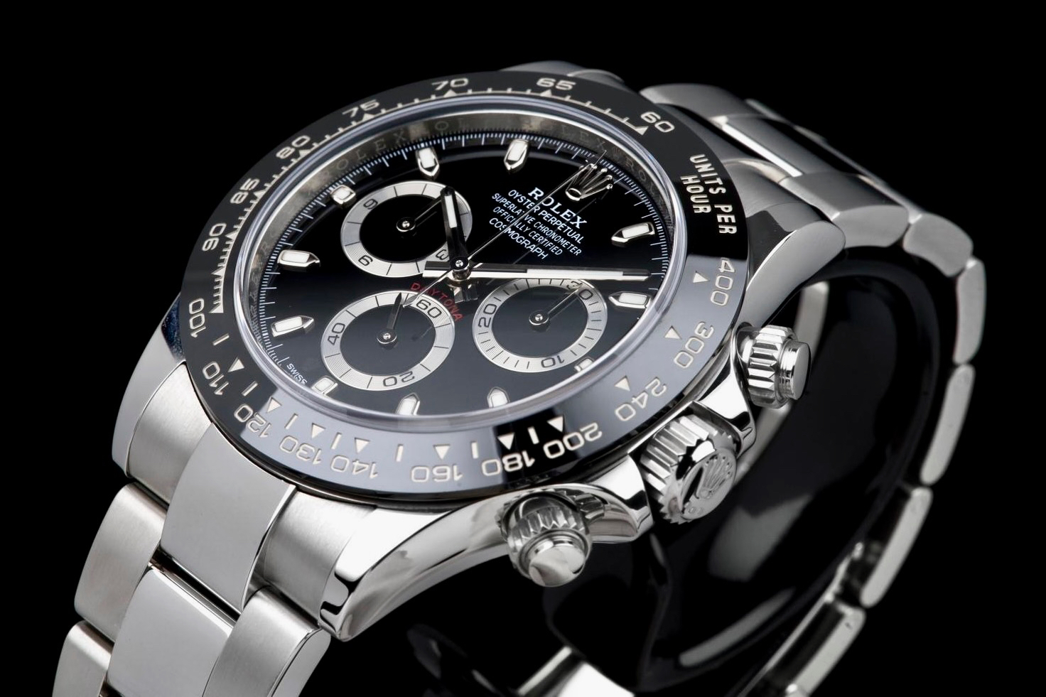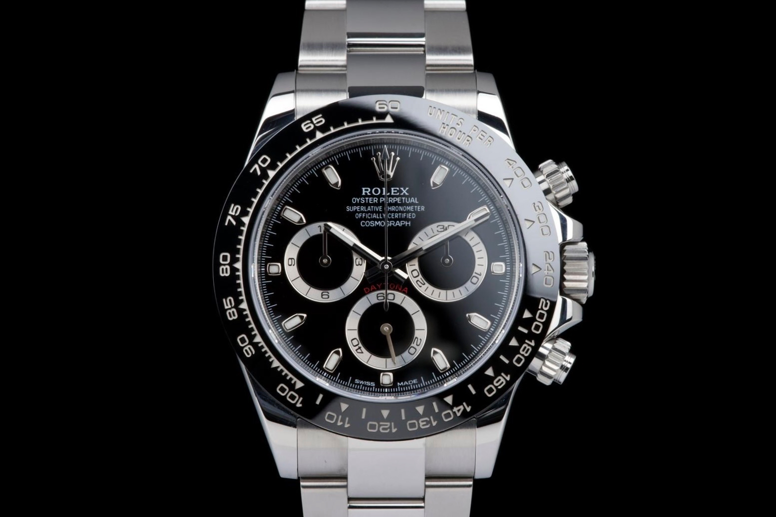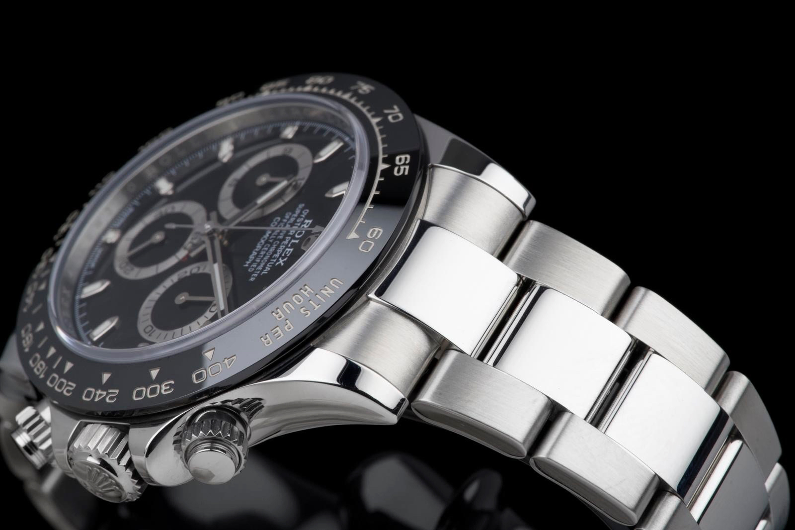 Presented here is a modern icon of Rolex sports chronographs: the Cosmograph Daytona reference 116500LN with black dial. Introduced with a Cerachrom bezel and instantly recognizable for its balanced and highly legible design, this stainless steel Daytona remains one of the most sought-after contemporary Rolex models. This example dates to 2020 and was originally sold in Ontario, Canada, accompanied by the earlier-style warranty card. The watch has recently been professionally polished by our watchmaker and now presents in excellent condition, with clean lines and a refined overall appearance. Offered as a full set with its original box, papers, and accessories, the watch has no recorded service history but is in perfect working order, having been checked by our watchmaker. A well-presented and complete example of a contemporary Daytona, combining strong desirability with immediate wearability.