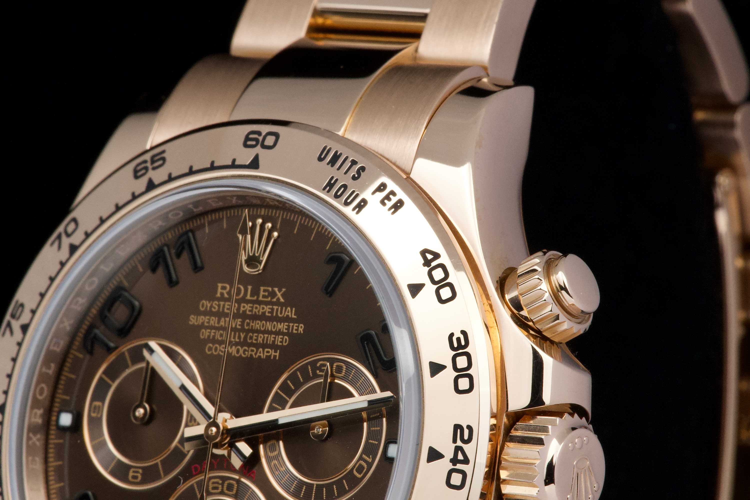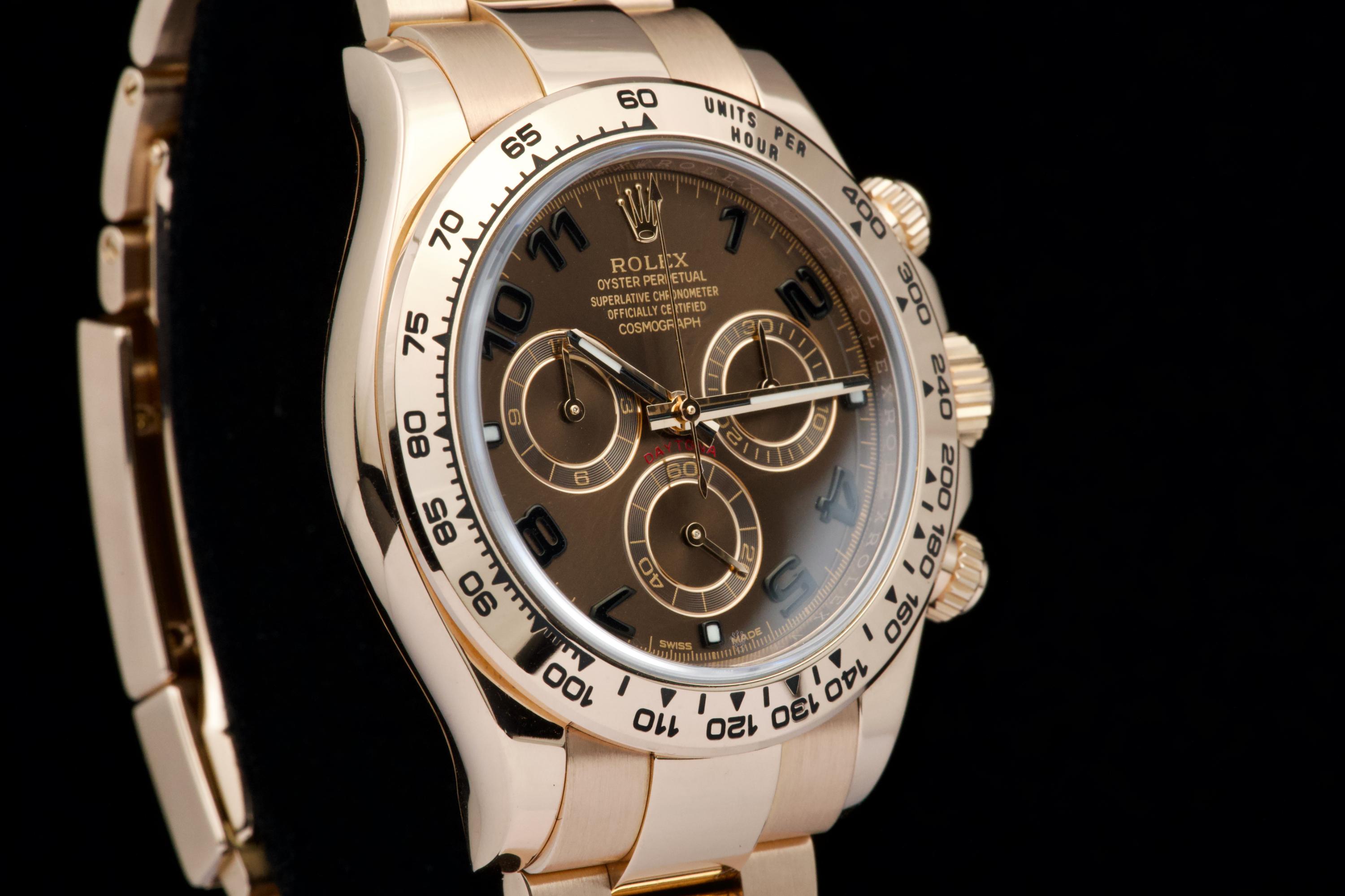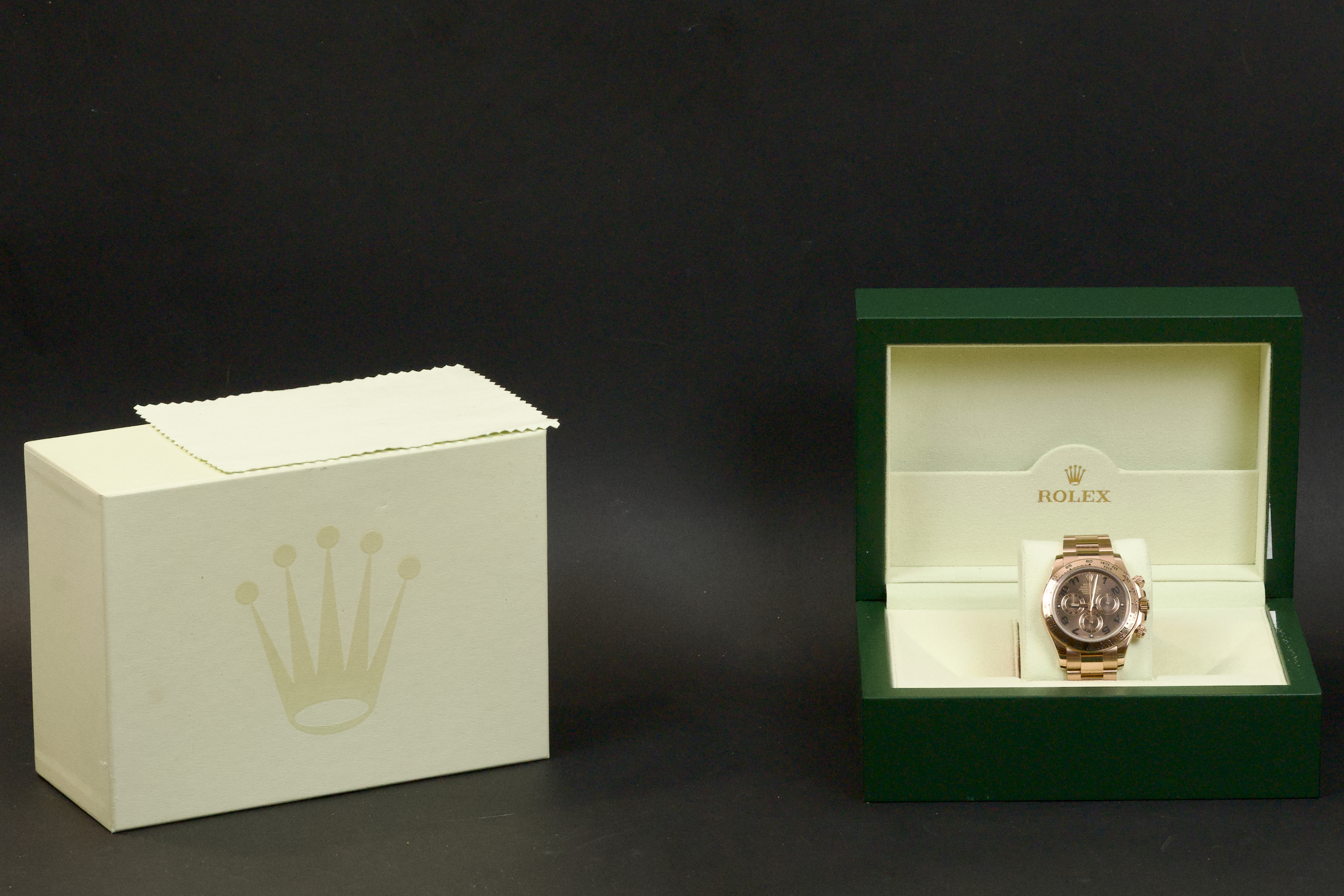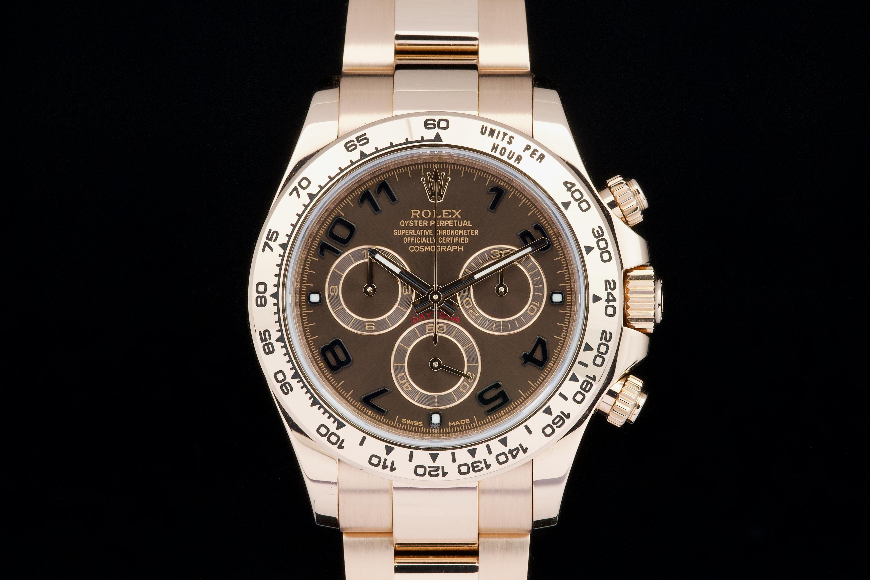 A superb example of the Rolex Cosmograph Daytona reference 116505 in 18K Everose gold, featuring the desirable chocolate brown “racing” dial with black Arabic numerals. The watch is unpolished and remains in excellent overall condition, with all bracelet links present. It comes with a Rolex box, though the original warranty card is missing. Powered by the Rolex caliber 4130 automatic chronograph movement, offering precision and reliability. The movement has no service history but has been checked by our watchmaker and runs perfectly. A striking and elegant Everose Daytona — sharp case, rich dial tones, and excellent overall condition.