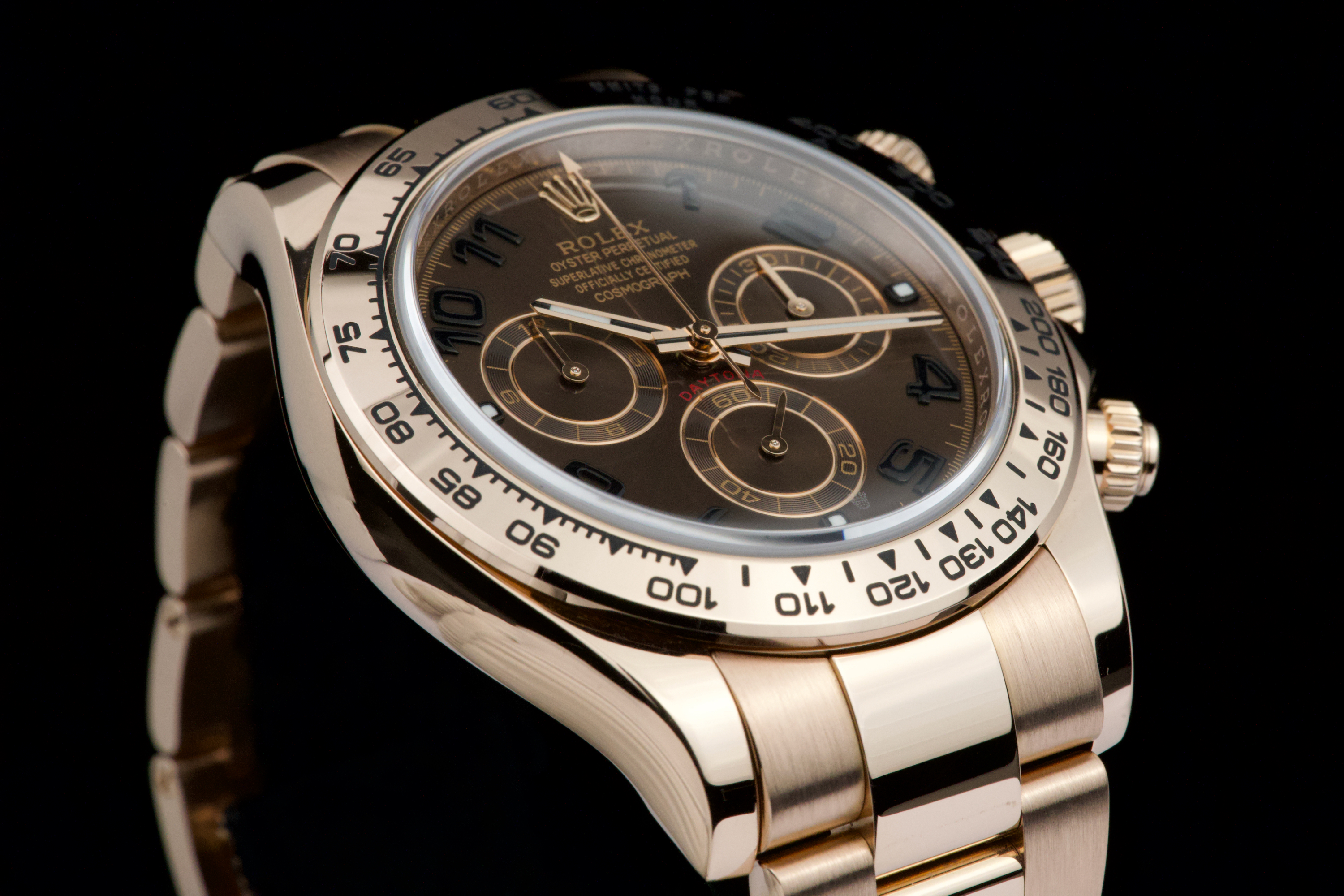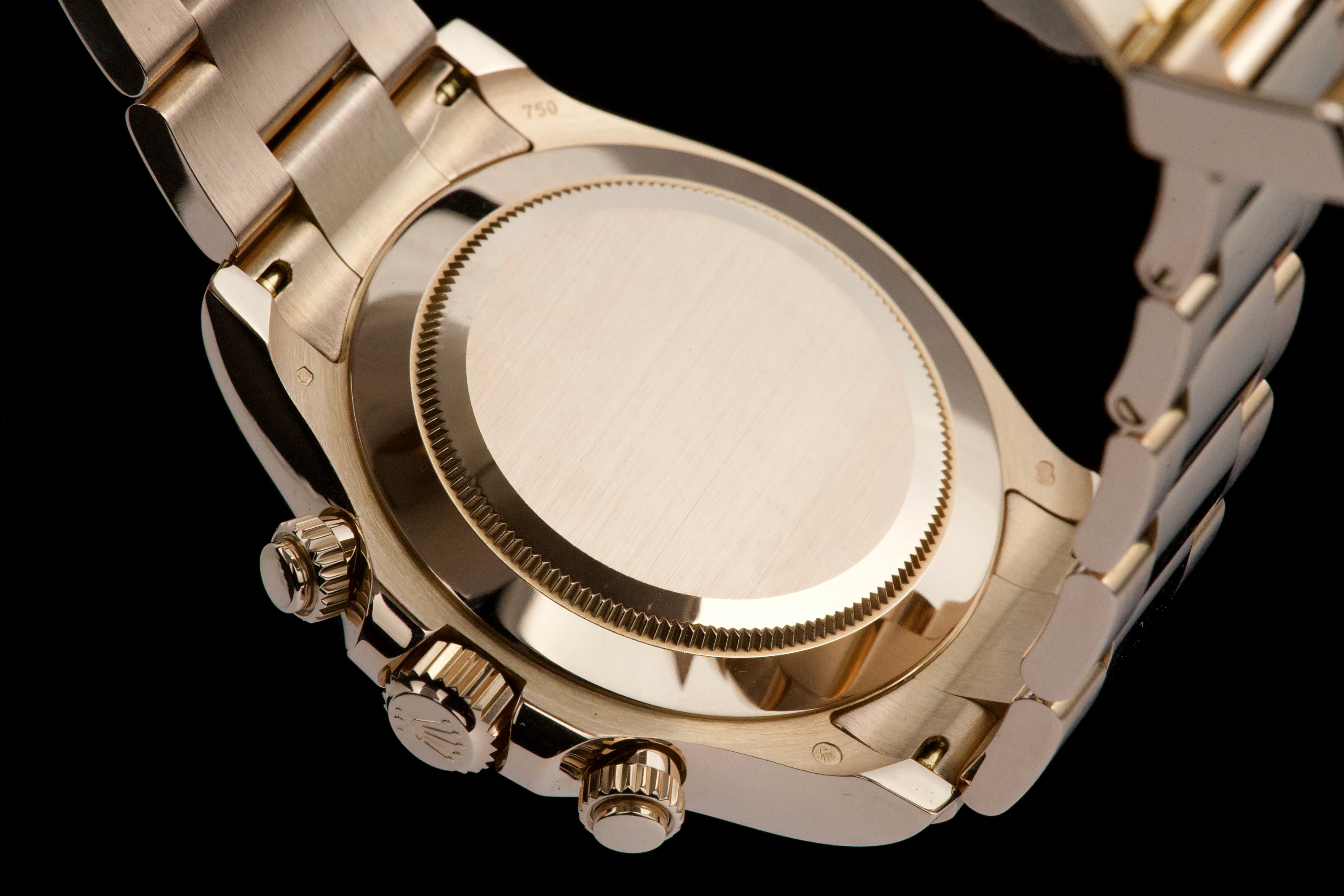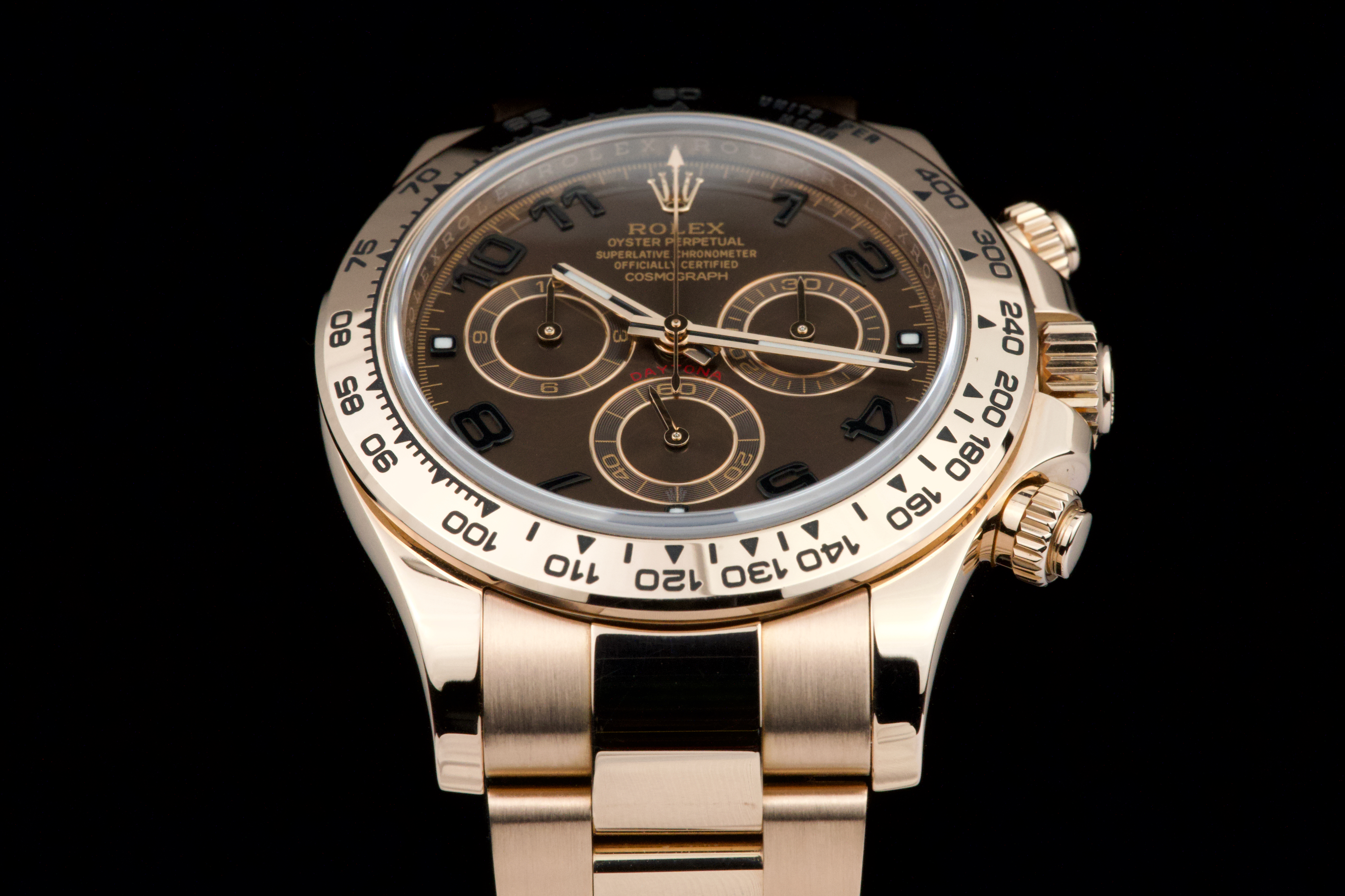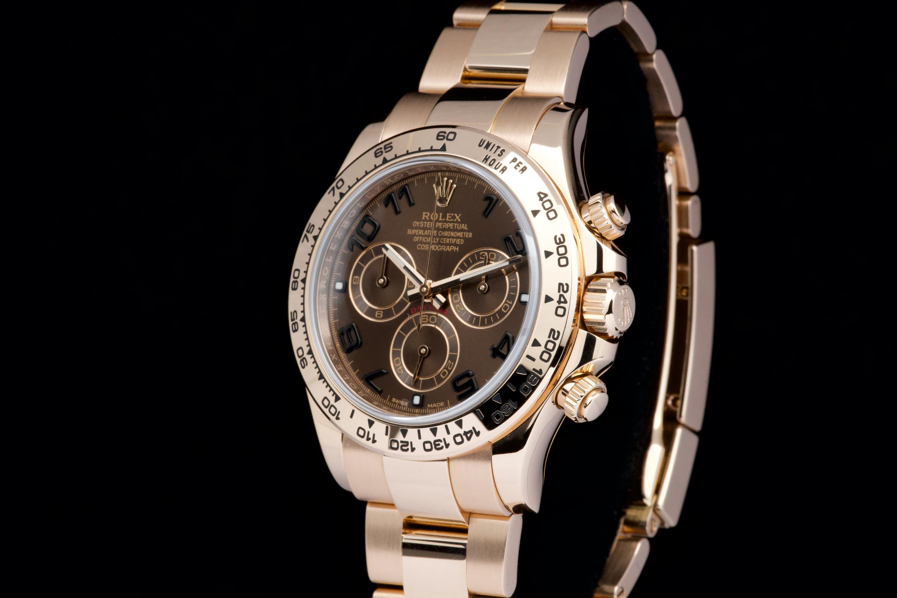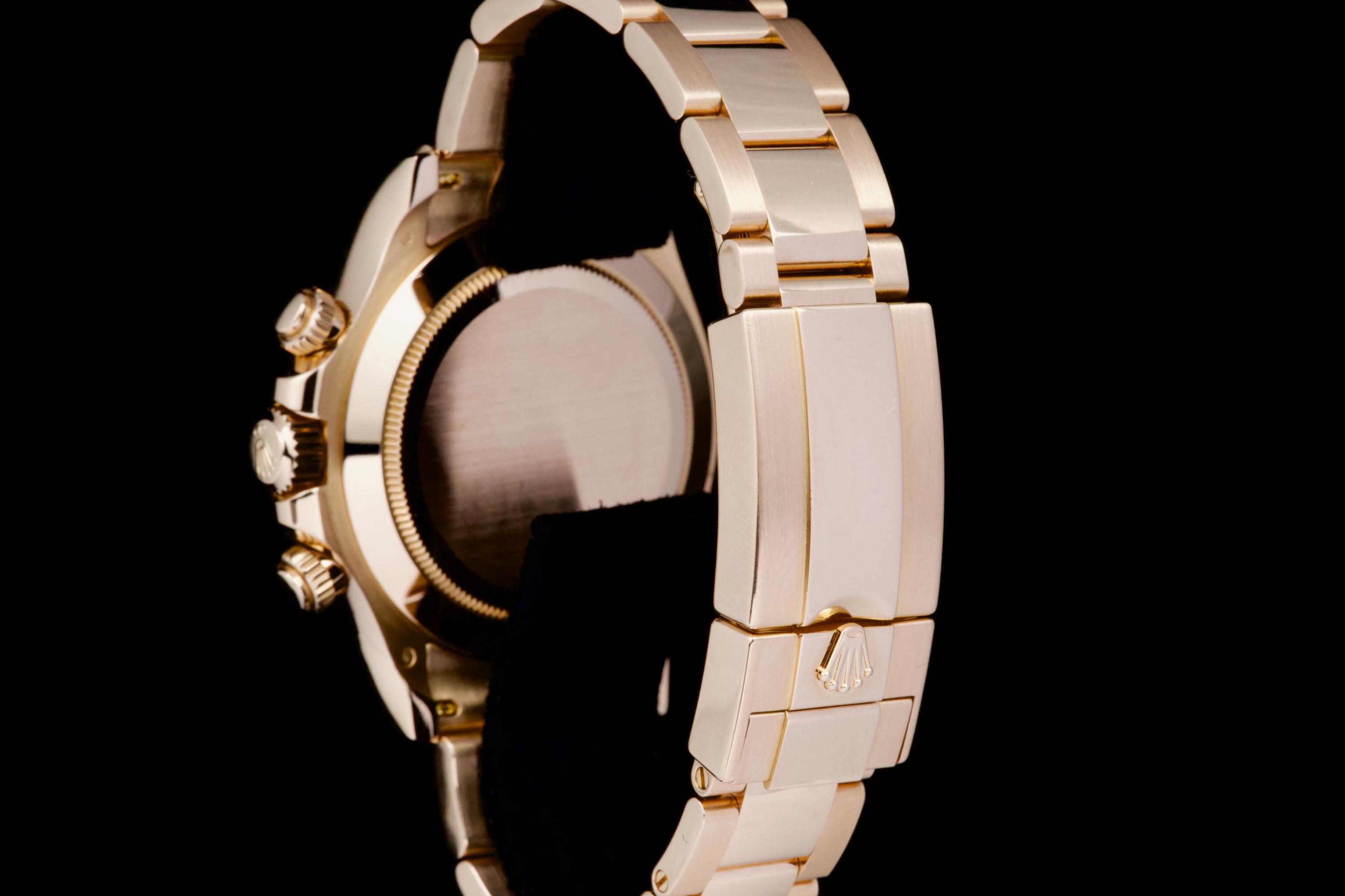 A superb example of the Rolex Cosmograph Daytona reference 116505 in 18K Everose gold, featuring the desirable chocolate brown “racing” dial with black Arabic numerals. The watch is unpolished and remains in excellent overall condition, with all bracelet links present. It comes with a Rolex box, though the original warranty card is missing. Powered by the Rolex caliber 4130 automatic chronograph movement, offering precision and reliability. The movement has no service history but has been checked by our watchmaker and runs perfectly. A striking and elegant Everose Daytona — sharp case, rich dial tones, and excellent overall condition.