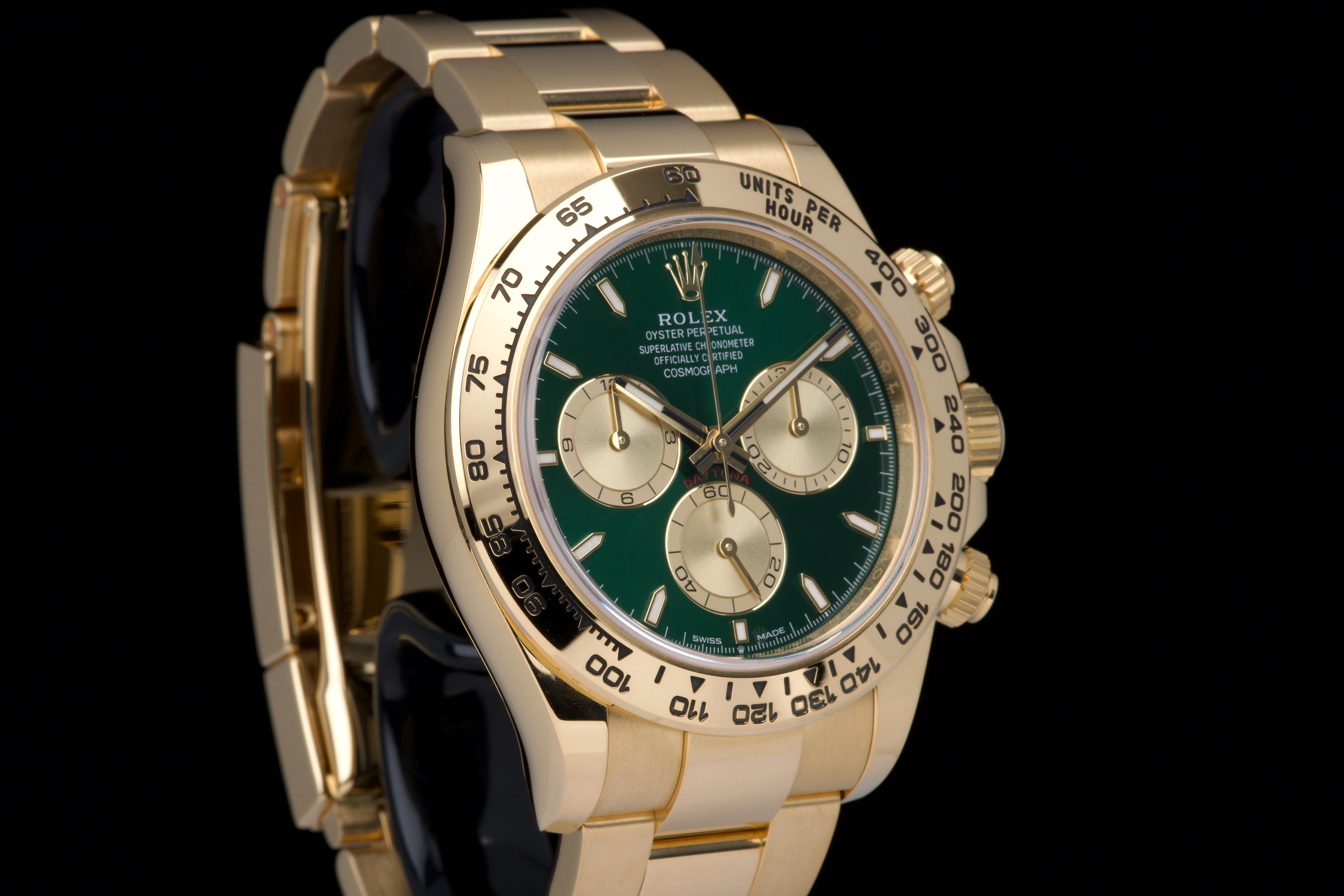 The present Rolex Cosmograph Daytona reference 126508 in 18K yellow gold, fitted with the highly desirable green dial, is offered here as a complete full set from its first owner. Dated 2025, this modern Daytona represents one of the most sought-after contemporary configurations of the model, combining the iconic Daytona design with a bold and instantly recognizable dial colour. The watch has been carefully refreshed by our watchmaker and is presented in excellent overall condition, retaining sharp lines and a superb finish throughout. The green dial is flawless, offering a striking contrast to the warmth of the yellow-gold case and bracelet, and reinforcing the strong visual identity that has made this reference so collectible. Delivered as a full set and preserved in outstanding condition, this Daytona 126508 offers an exceptional opportunity to acquire a current-production Rolex sports chronograph in one of its most desirable executions, with impeccable provenance and immediate wearability.