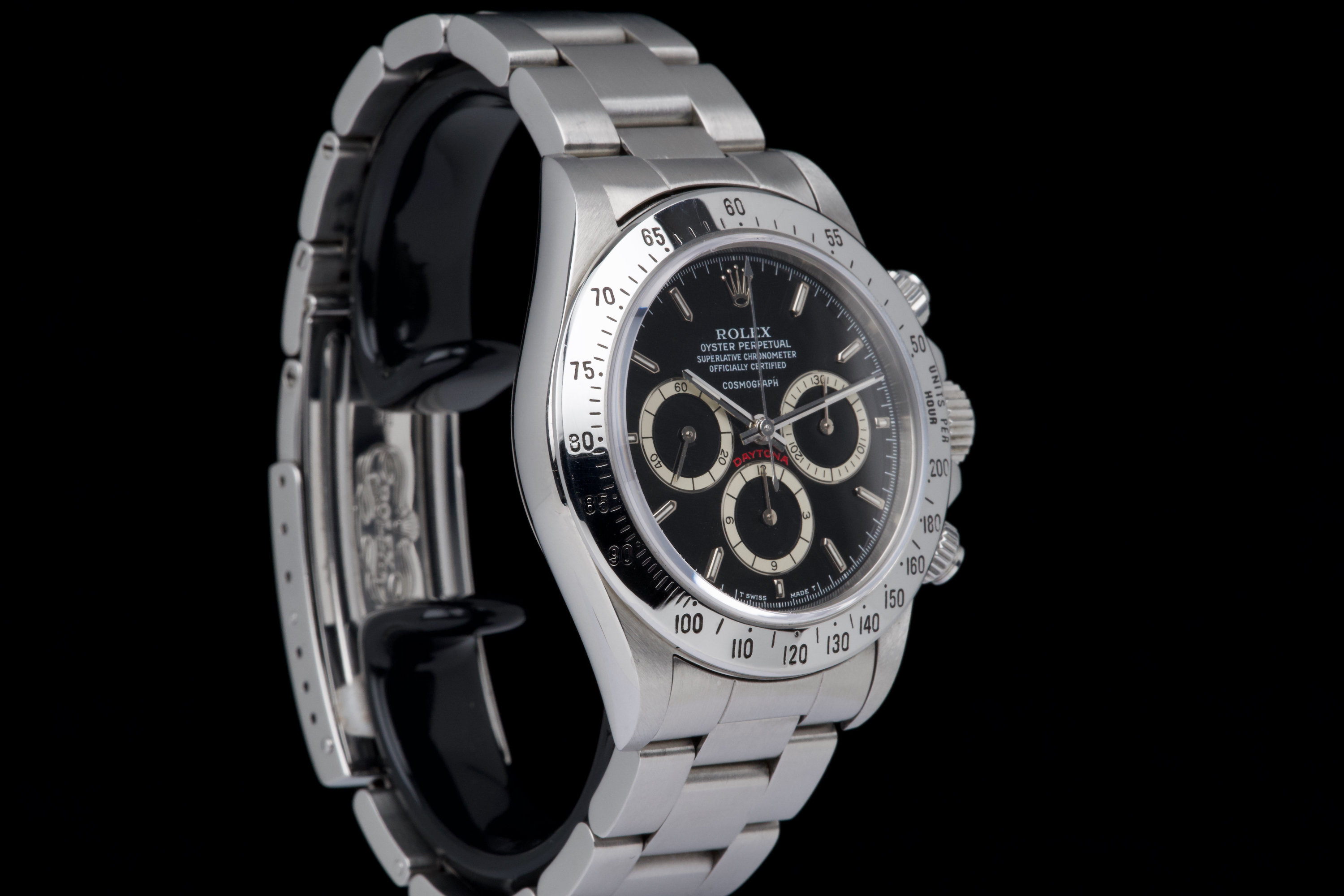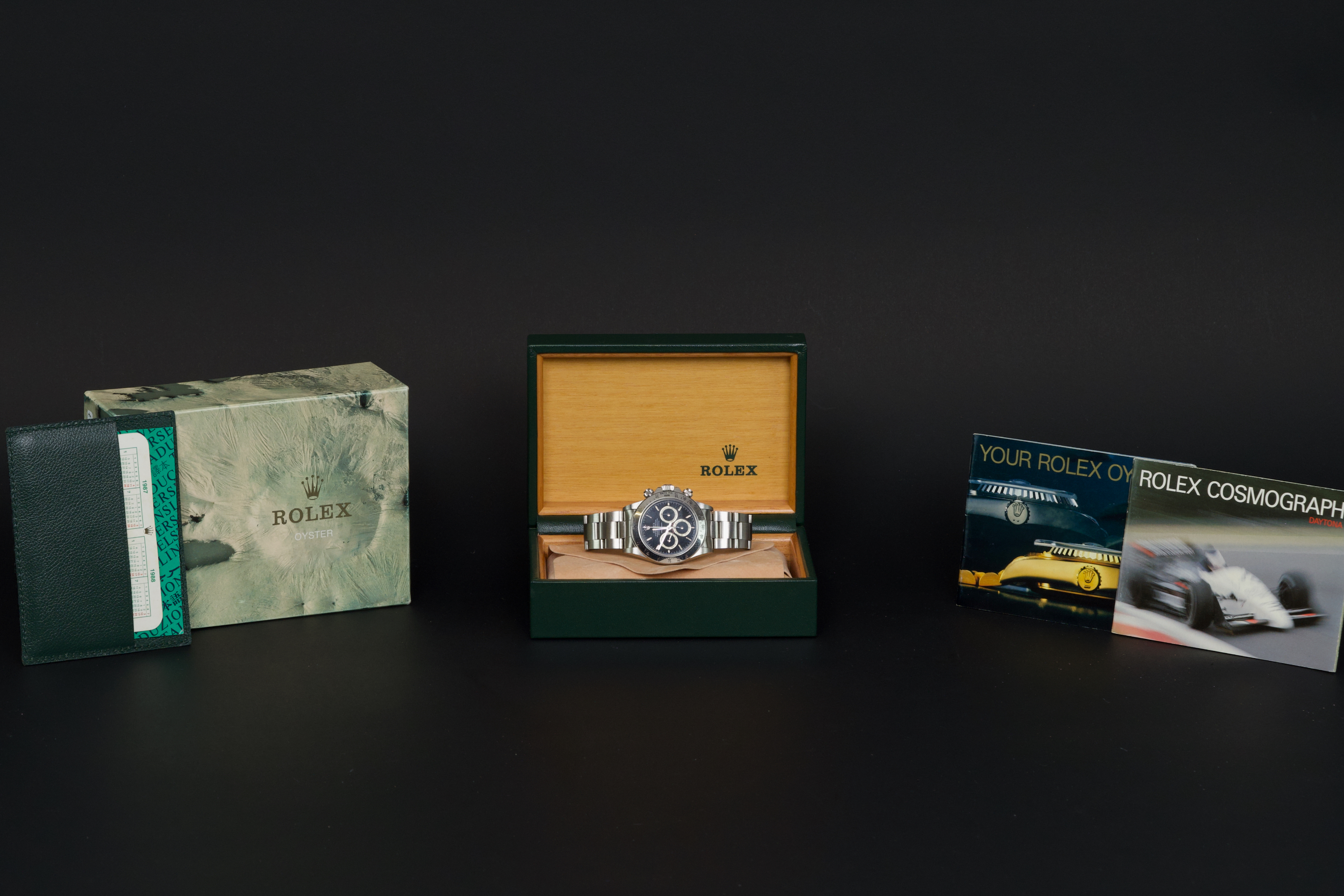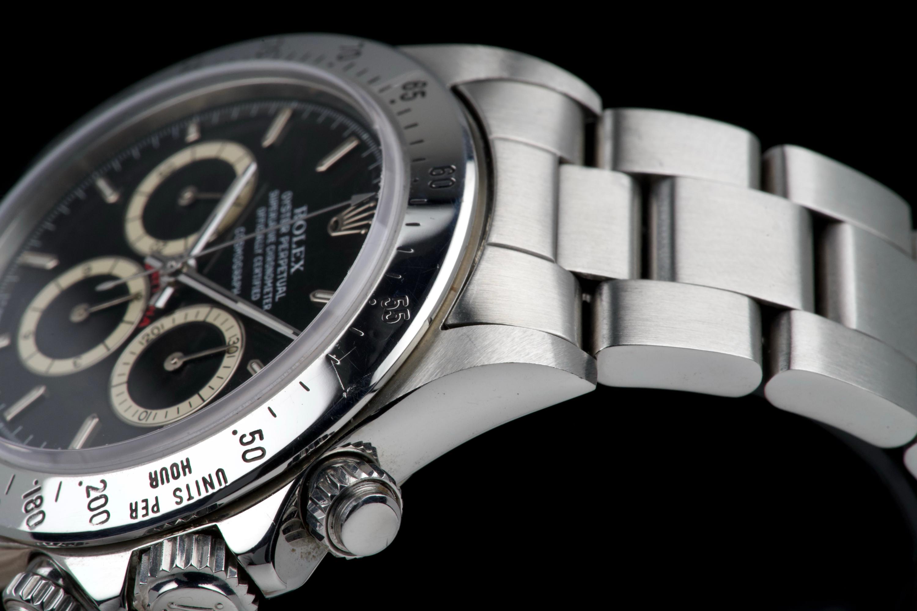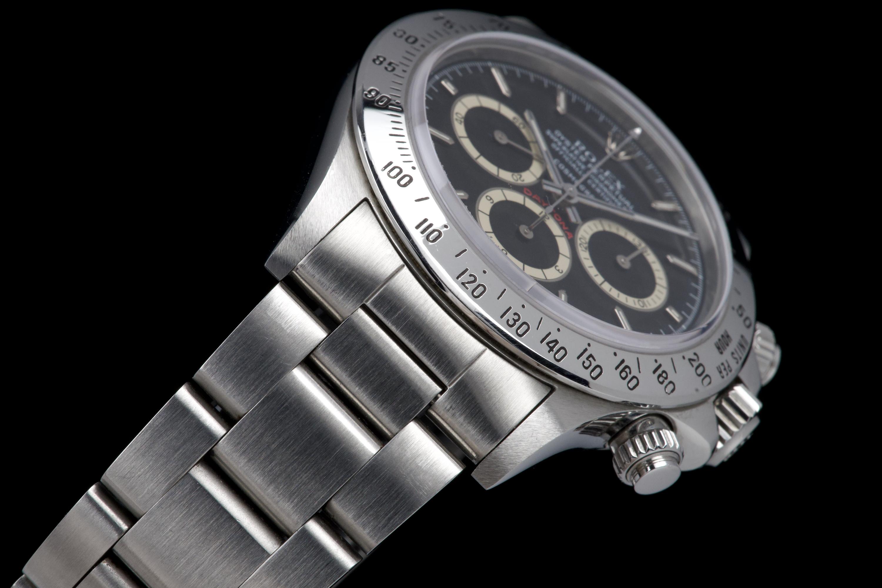 An exceptional early example of the Rolex Cosmograph Daytona reference 16520, featuring the highly sought-after black “Floating” dial, powered by the Zenith-based caliber 4030. The case is sharp and thick, showing only very light signs of past polishing, and retains excellent proportions. The bezel is also in excellent condition, with crisp engravings — the black enamel within the numerals remains strong and vivid. The original black tritium dial is in beautiful condition, with only minor imperfections near the center of the subdials, a common trait on early floating examples. The hands are perfectly matching. Fitted with its original 78360 all-brushed Oyster bracelet, showing minimal stretch, with 503 endlinks and claspcode P6. The serial number R7XXXXX and reference engravings between the lugs are deep and perfectly legible, confirming an excellent, well-preserved case. The movement has been checked by our watchmaker and runs perfectly. Comes with the set shown in the pictures. A superb and honest early Daytona “Floating Dial” — rare, crisp, and highly collectible.