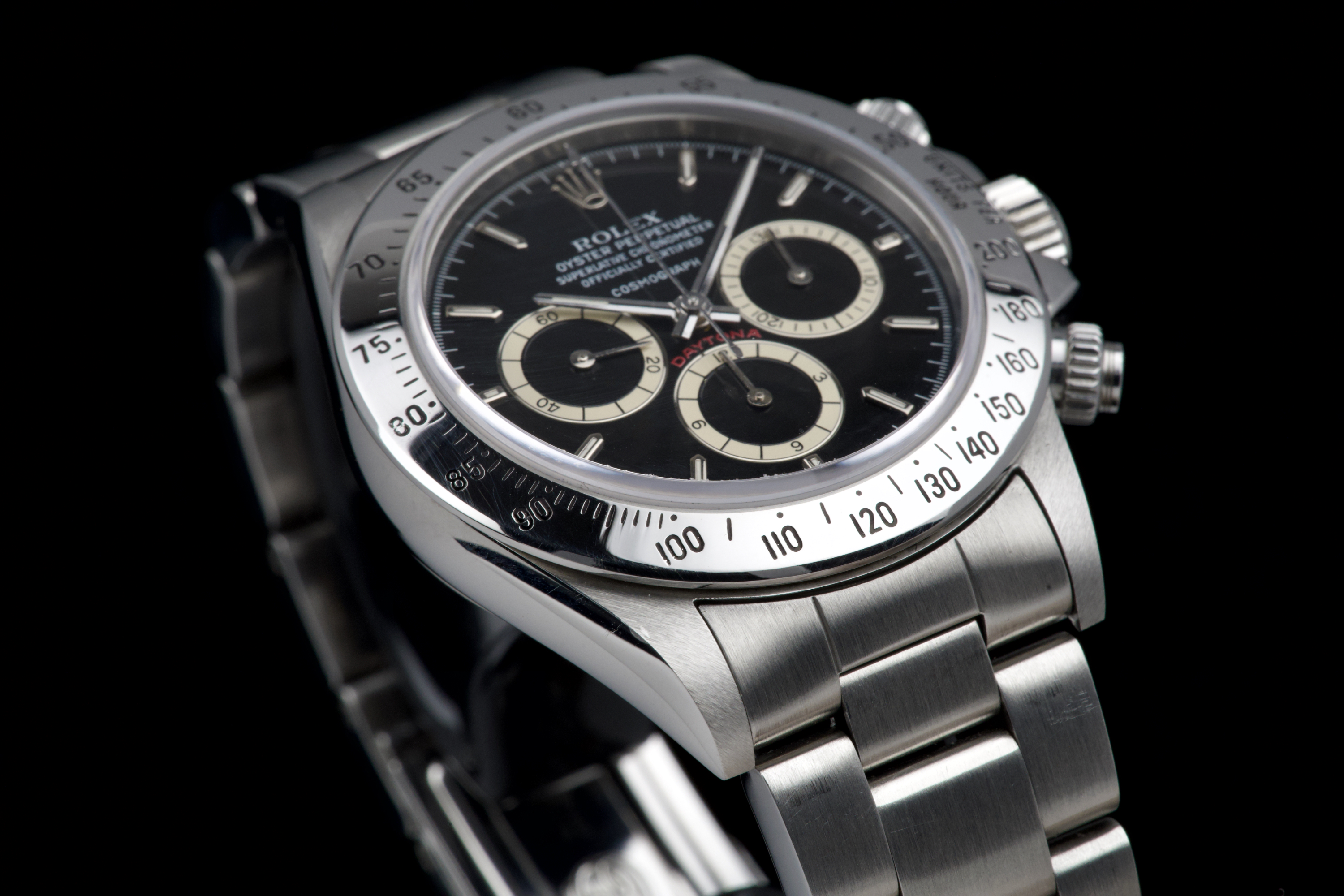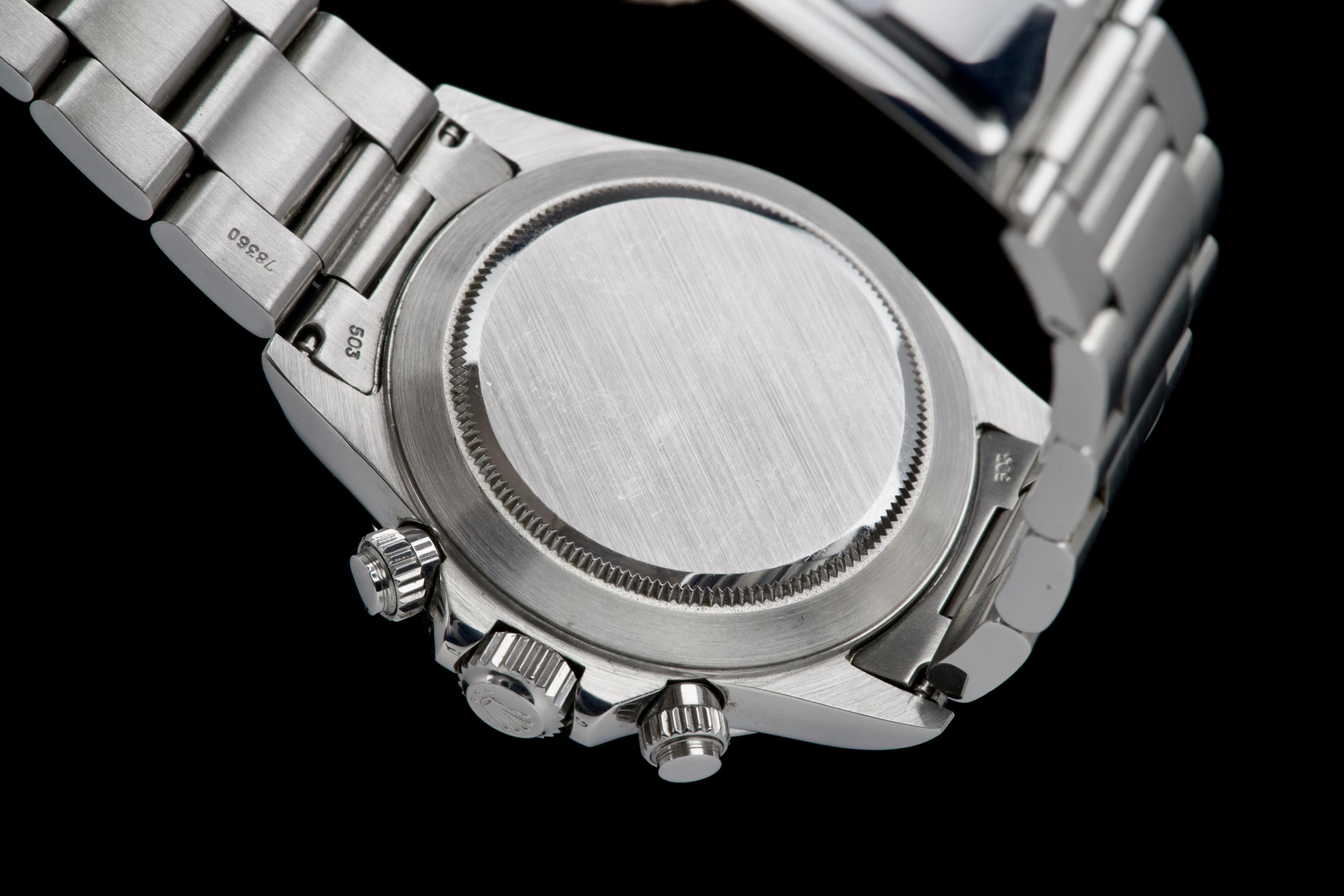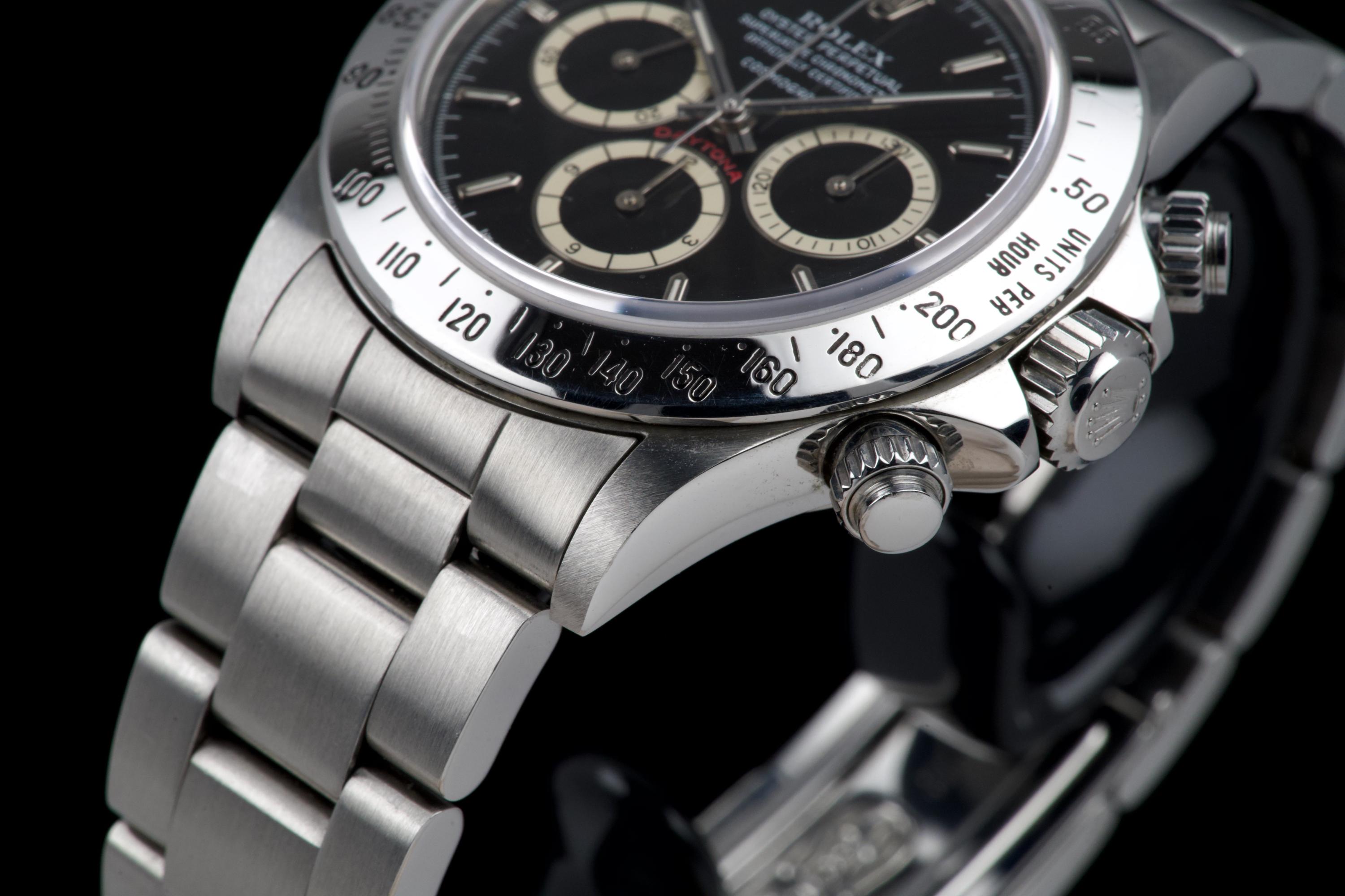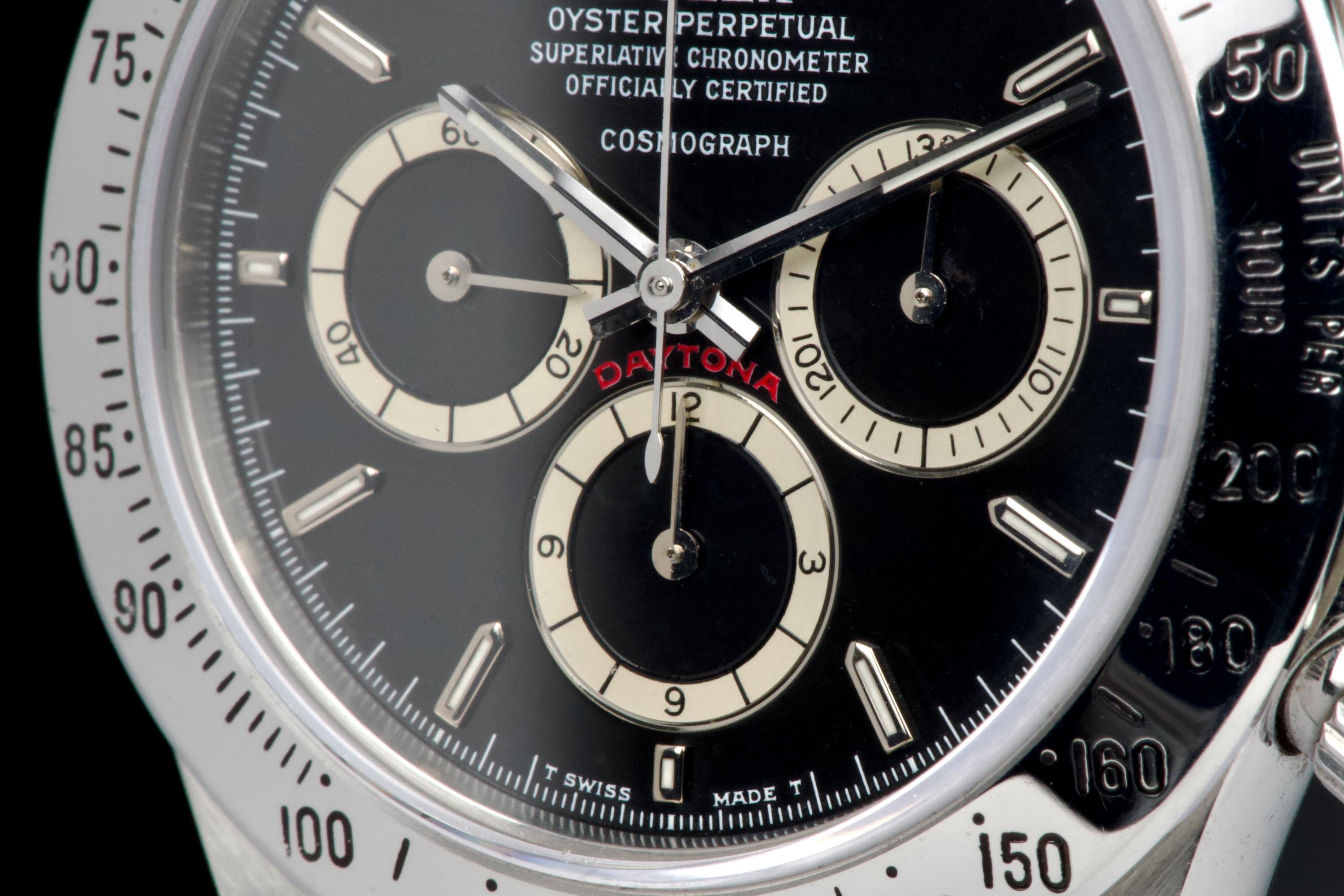 An exceptional early example of the Rolex Cosmograph Daytona reference 16520, featuring the highly sought-after black “Floating” dial, powered by the Zenith-based caliber 4030. The case is sharp and thick, showing only very light signs of past polishing, and retains excellent proportions. The bezel is also in excellent condition, with crisp engravings — the black enamel within the numerals remains strong and vivid. The original black tritium dial is in beautiful condition, with only minor imperfections near the center of the subdials, a common trait on early floating examples. The hands are perfectly matching. Fitted with its original 78360 all-brushed Oyster bracelet, showing minimal stretch, with 503 endlinks and claspcode P6. The serial number R7XXXXX and reference engravings between the lugs are deep and perfectly legible, confirming an excellent, well-preserved case. The movement has been checked by our watchmaker and runs perfectly. Comes with the set shown in the pictures. A superb and honest early Daytona “Floating Dial” — rare, crisp, and highly collectible.