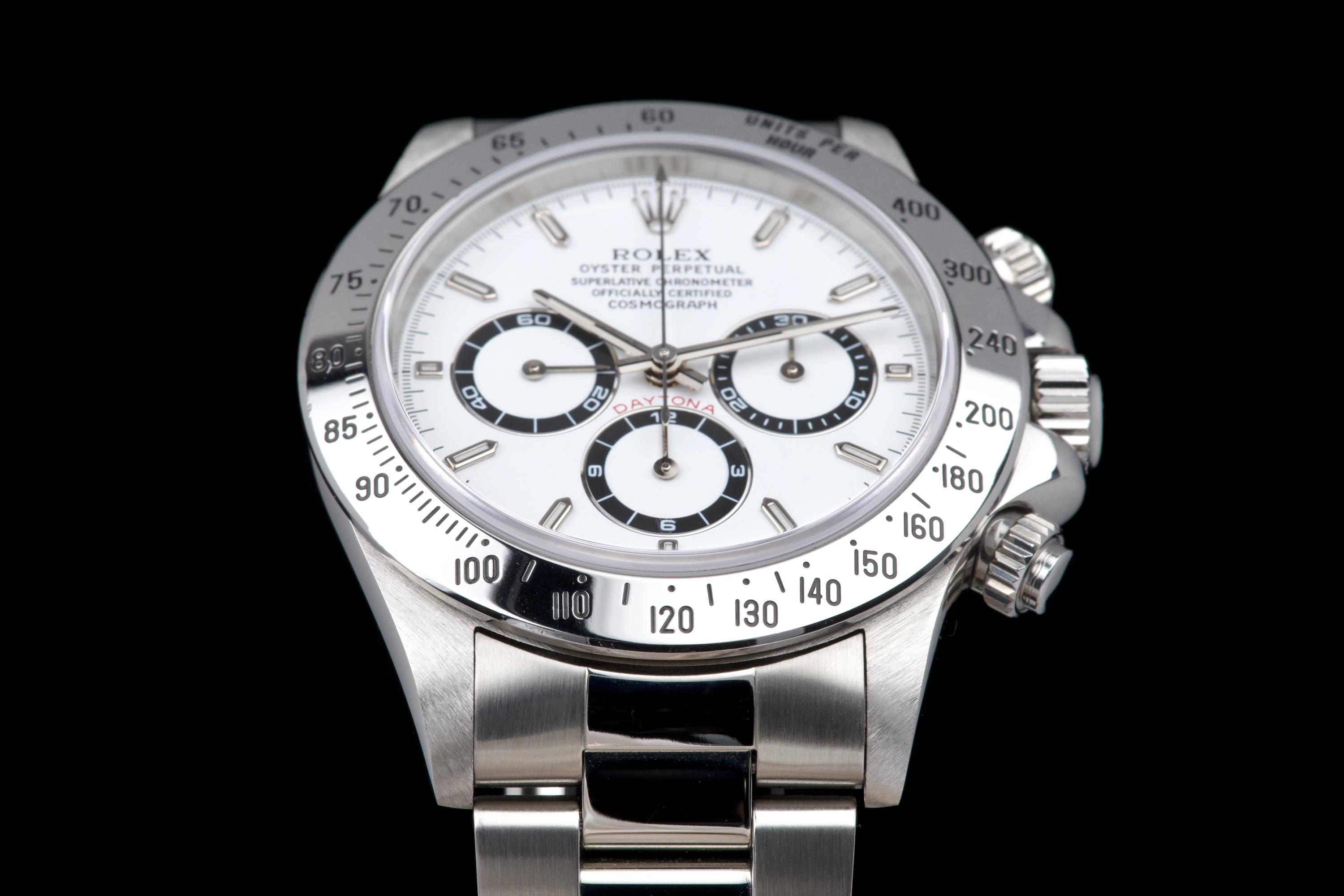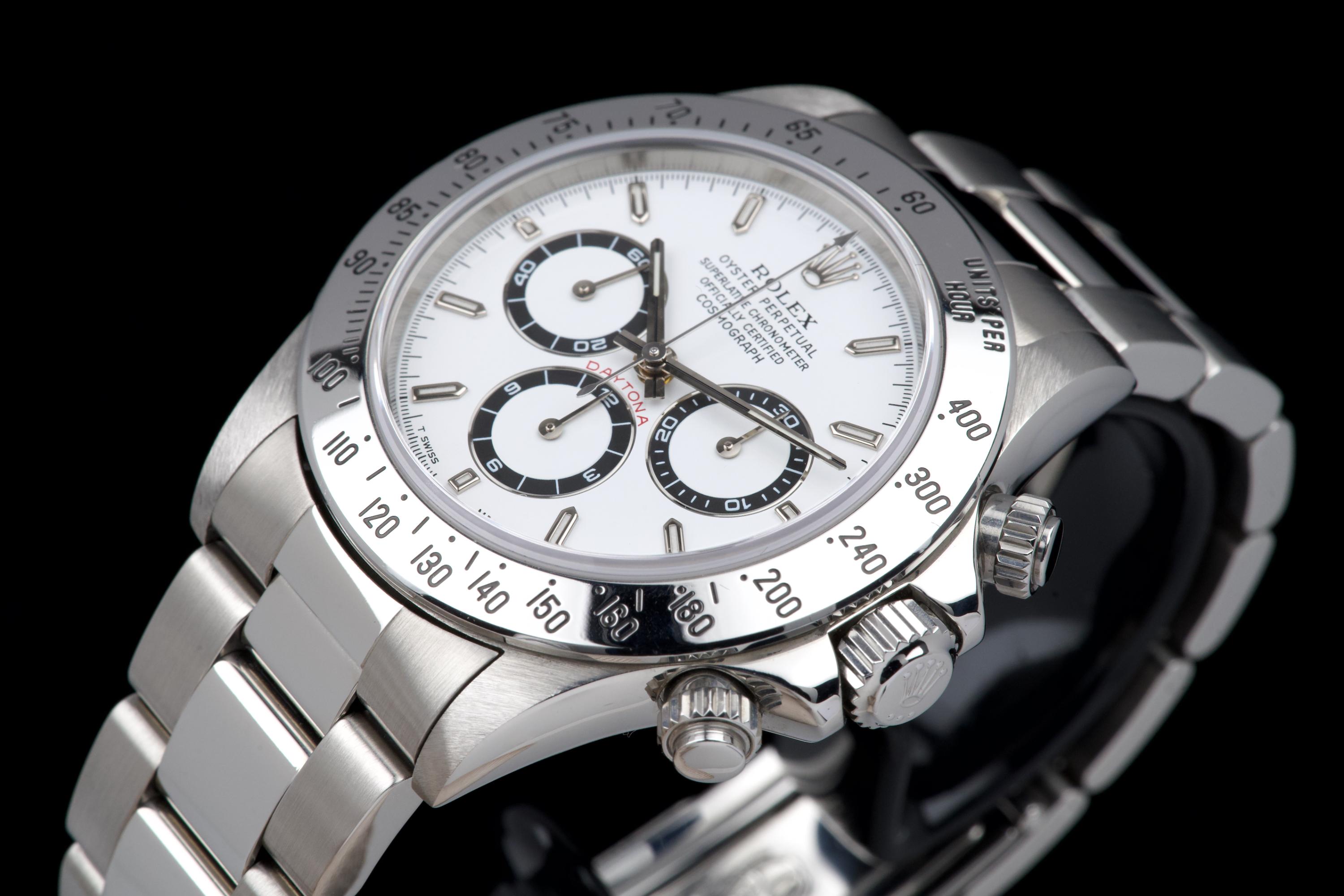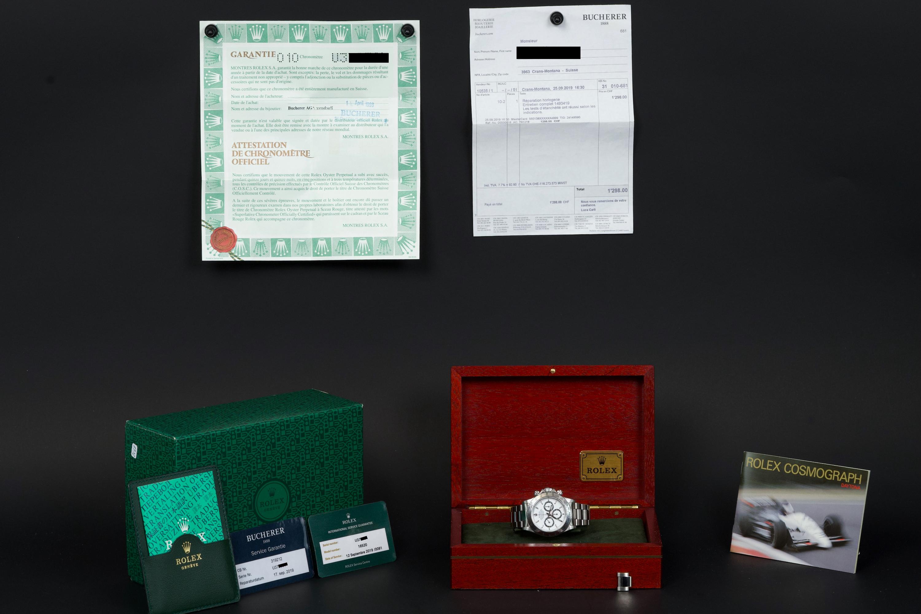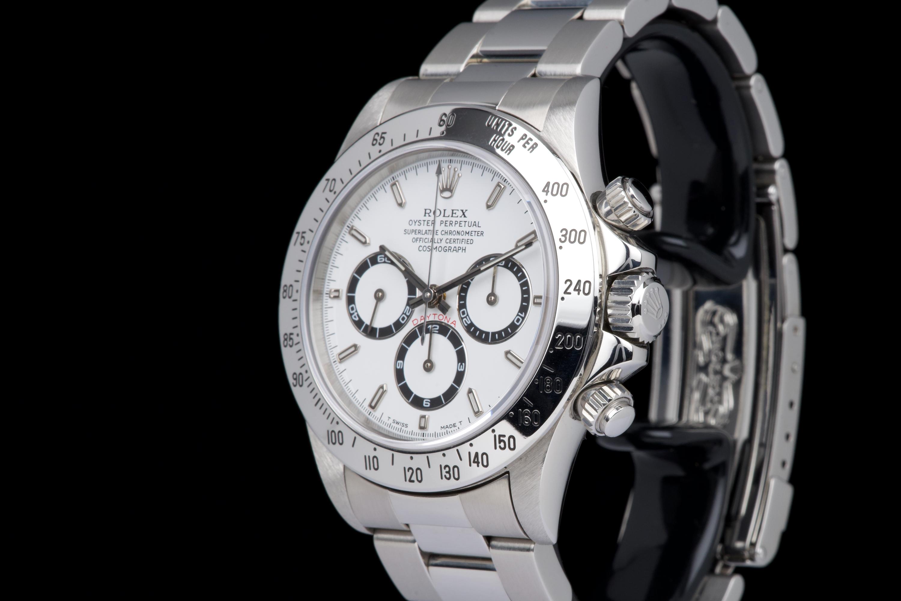 An outstanding example of the iconic Zenith-powered Daytona reference 16520, coming from its second owner. The watch features an excellent, sharp and thick case, lightly polished by Bucherer in 2019 and seemingly unworn since. It retains its original white tritium dial with perfectly matching hands, both in superb condition. The original 78390 bracelet with 503B endlinks shows only very light stretch, with a U1 clasp code. The watch was fully serviced by Bucherer in 2019 and remains in excellent overall condition. A truly beautiful and complete example of this highly collectible reference.