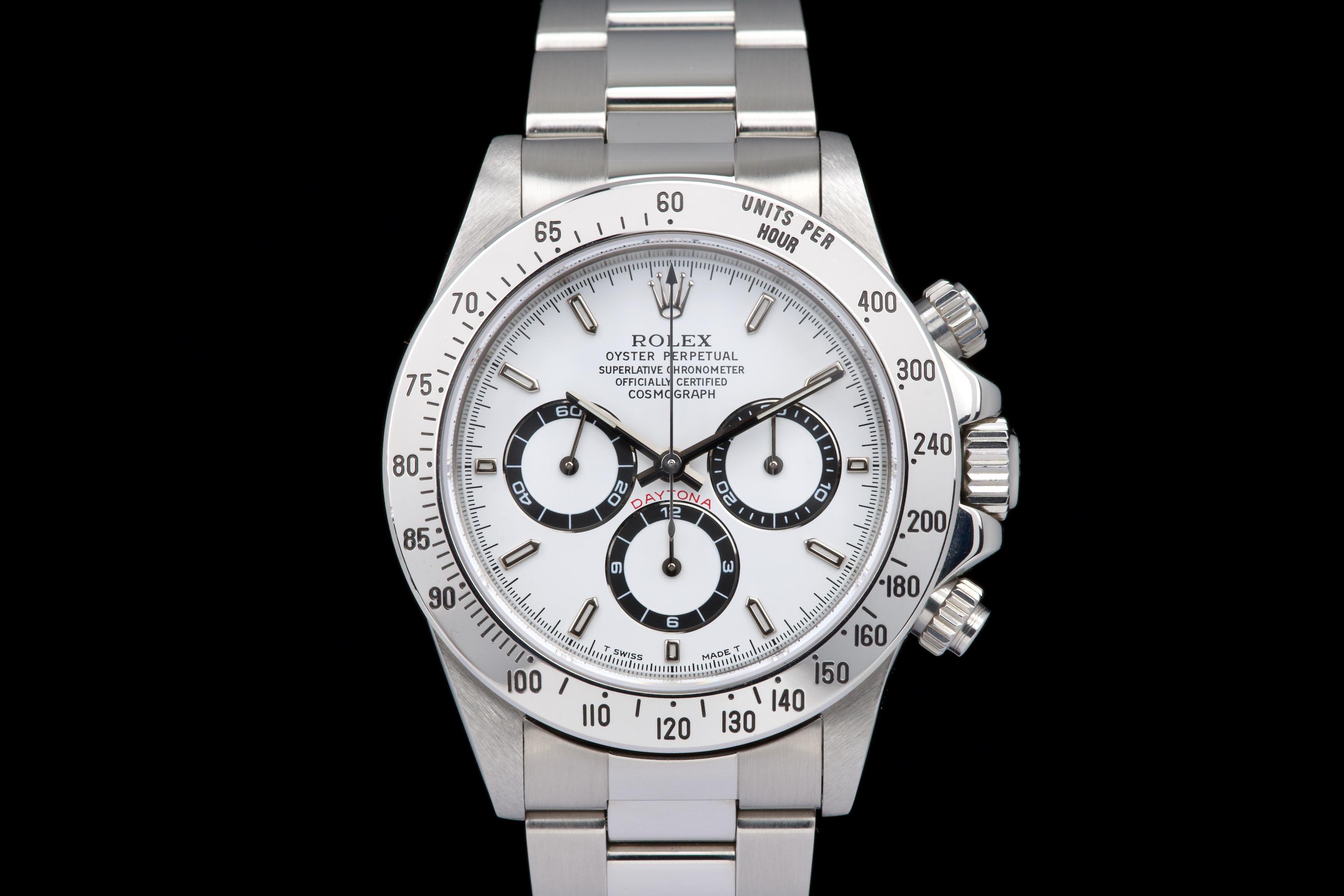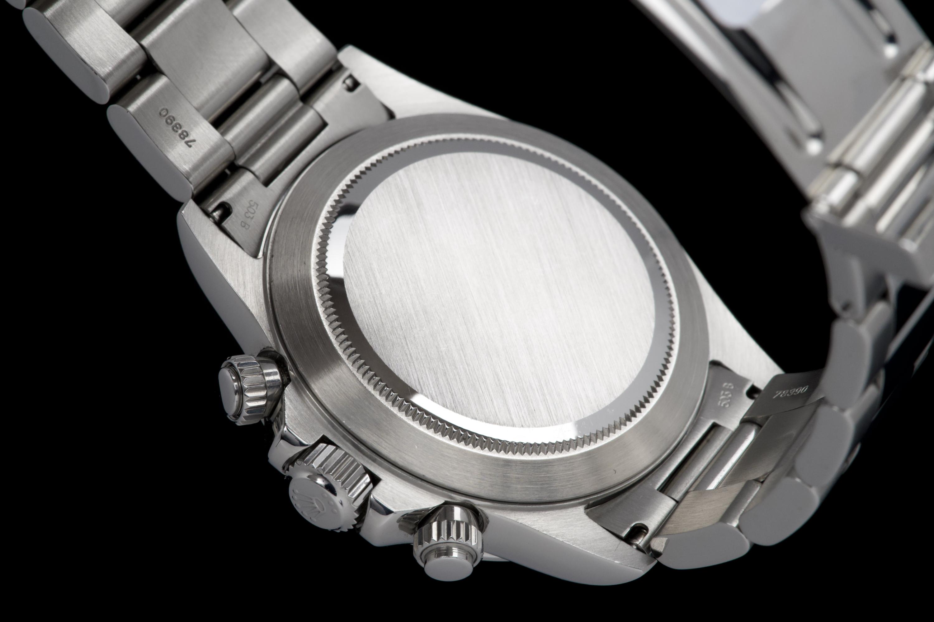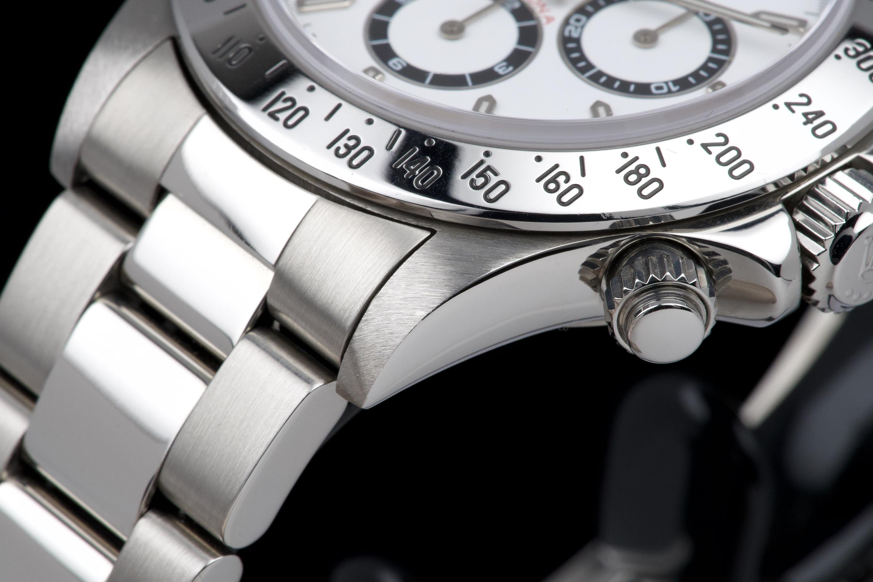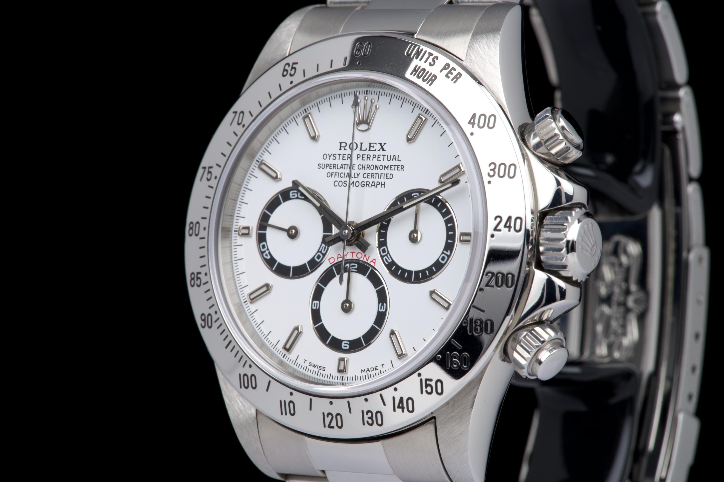 An outstanding example of the iconic Zenith-powered Daytona reference 16520, coming from its second owner. The watch features an excellent, sharp and thick case, lightly polished by Bucherer in 2019 and seemingly unworn since. It retains its original white tritium dial with perfectly matching hands, both in superb condition. The original 78390 bracelet with 503B endlinks shows only very light stretch, with a U1 clasp code. The watch was fully serviced by Bucherer in 2019 and remains in excellent overall condition. A truly beautiful and complete example of this highly collectible reference.