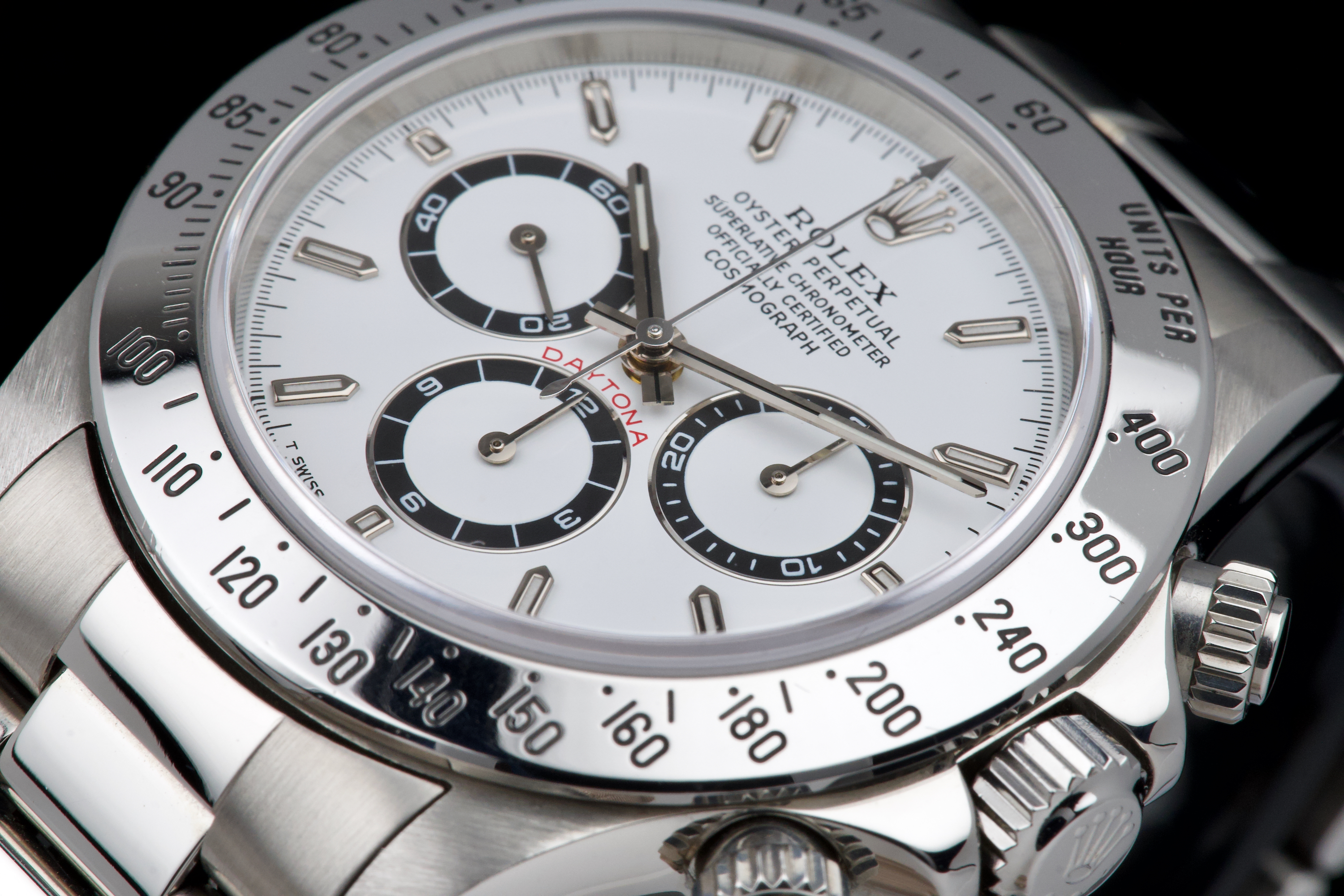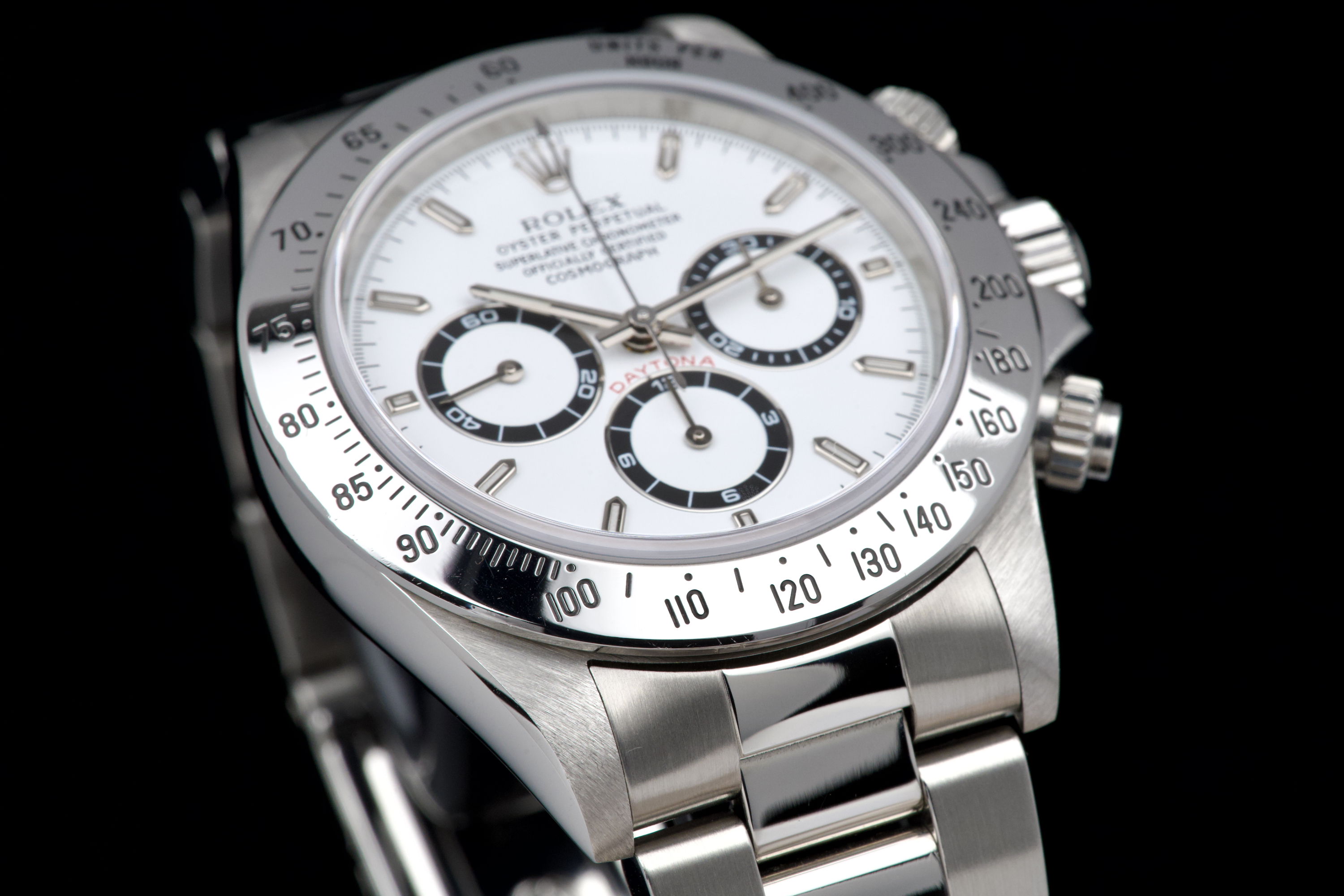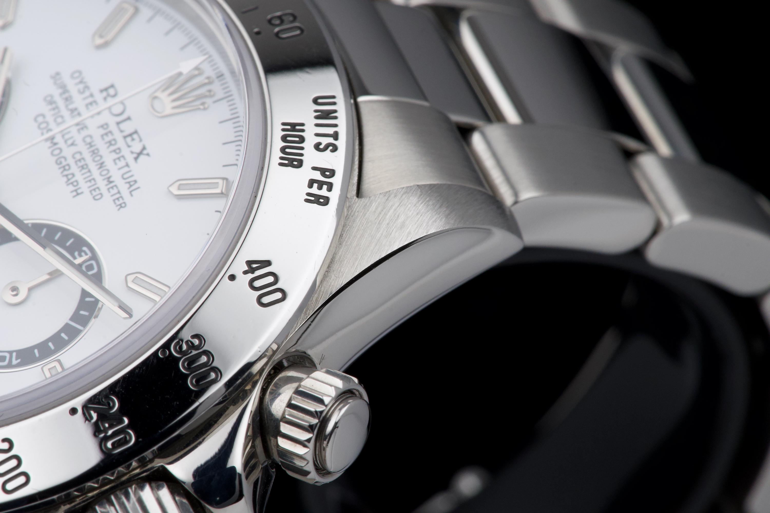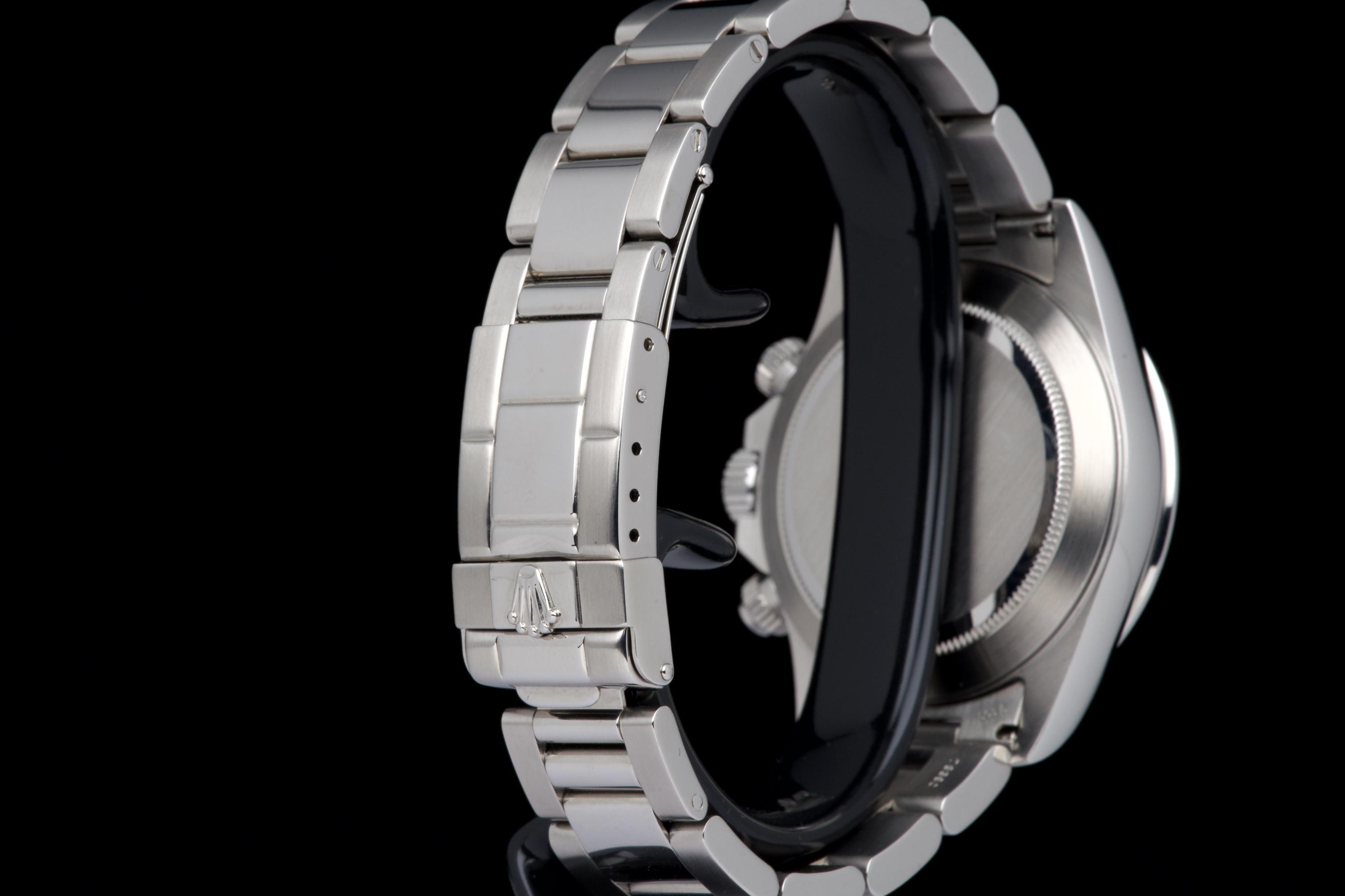 An outstanding example of the iconic Zenith-powered Daytona reference 16520, coming from its second owner. The watch features an excellent, sharp and thick case, lightly polished by Bucherer in 2019 and seemingly unworn since. It retains its original white tritium dial with perfectly matching hands, both in superb condition. The original 78390 bracelet with 503B endlinks shows only very light stretch, with a U1 clasp code. The watch was fully serviced by Bucherer in 2019 and remains in excellent overall condition. A truly beautiful and complete example of this highly collectible reference.