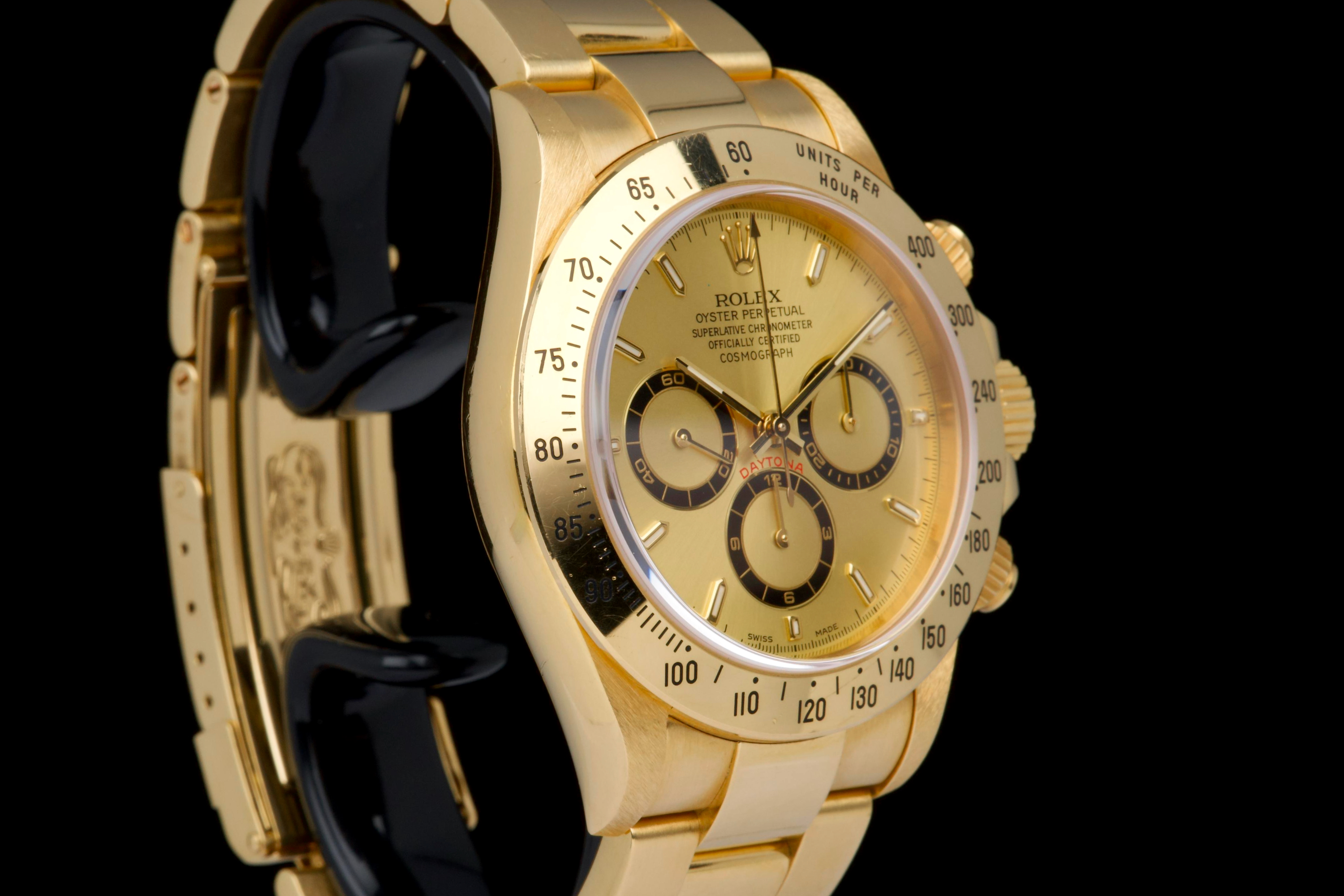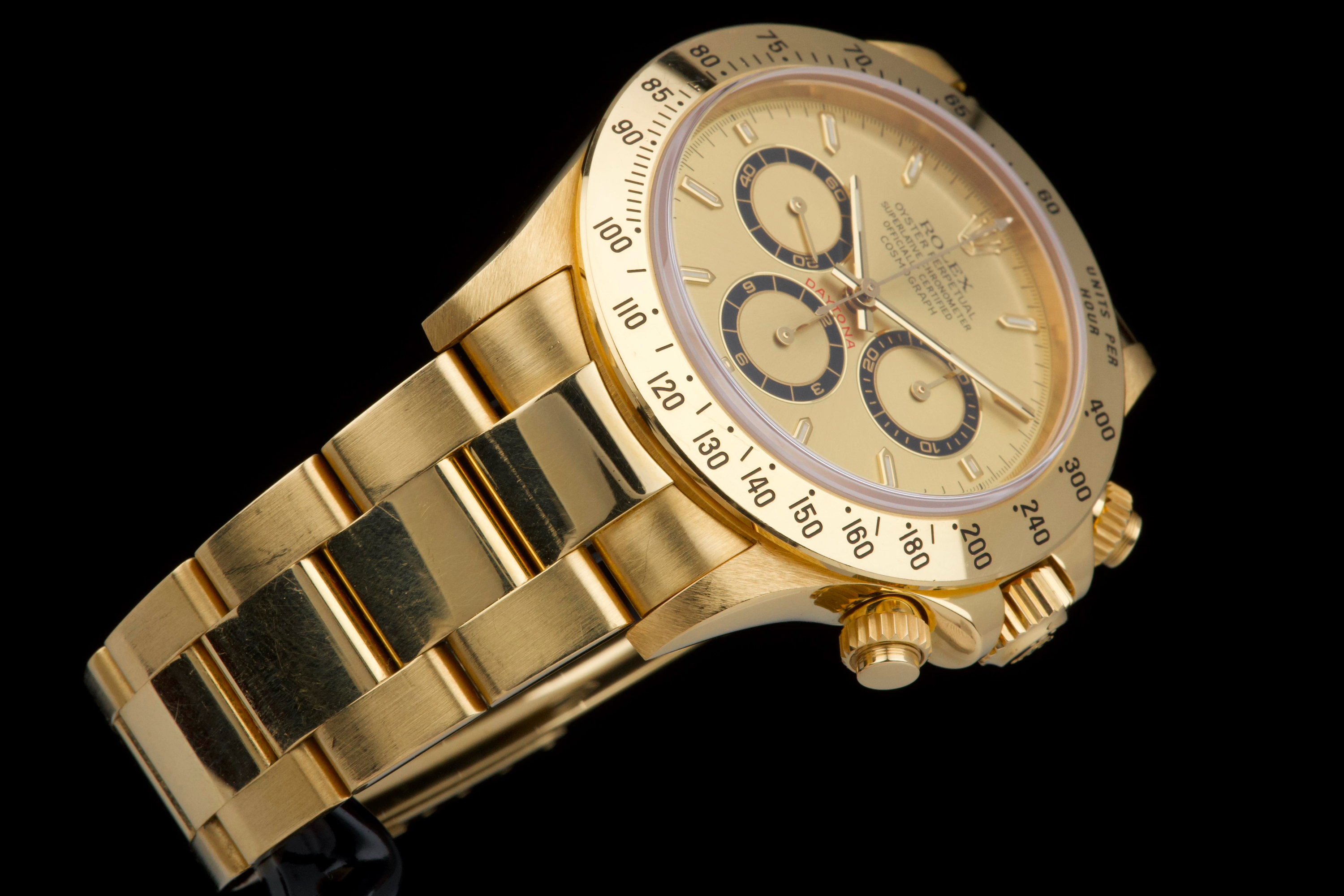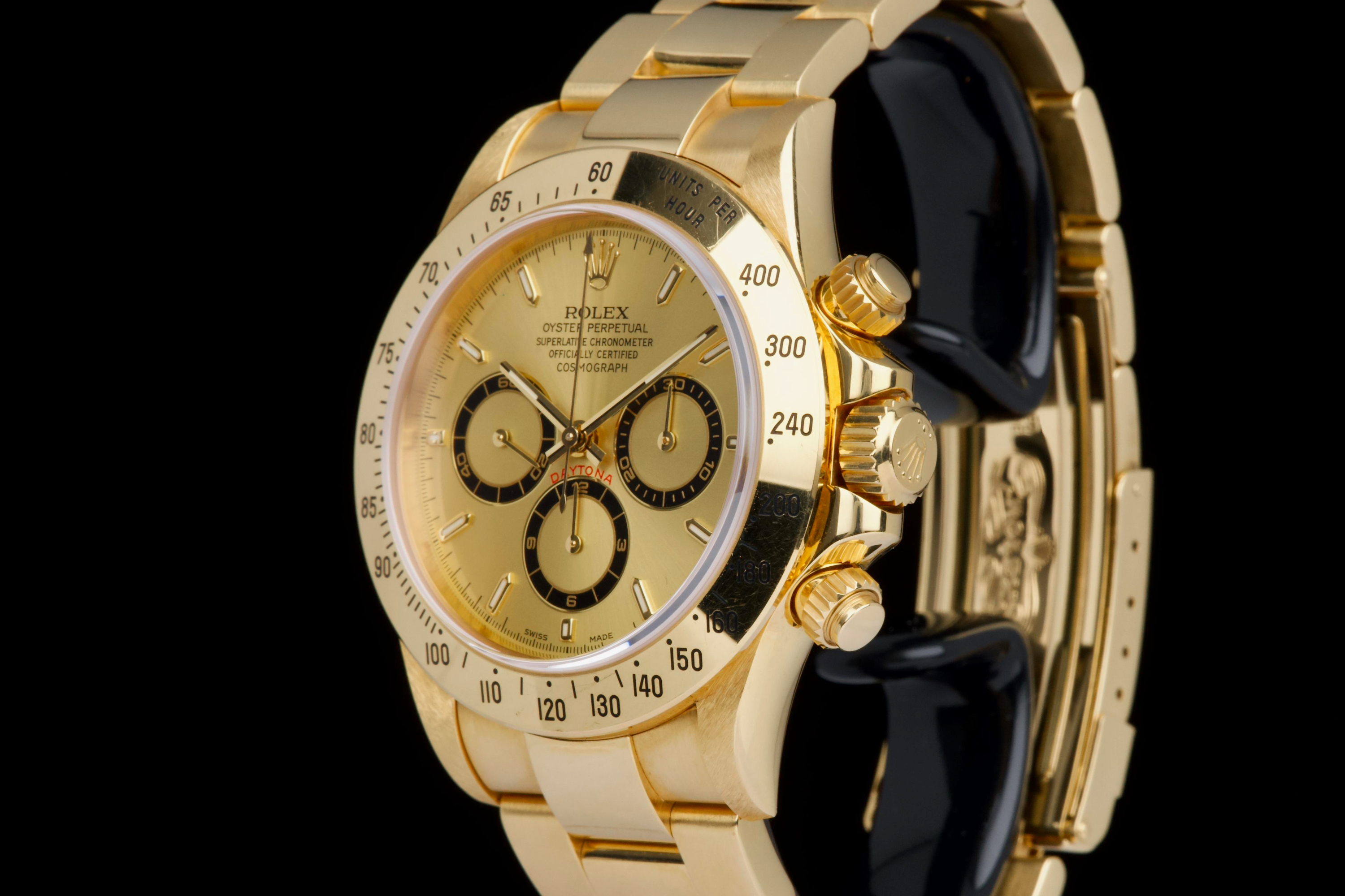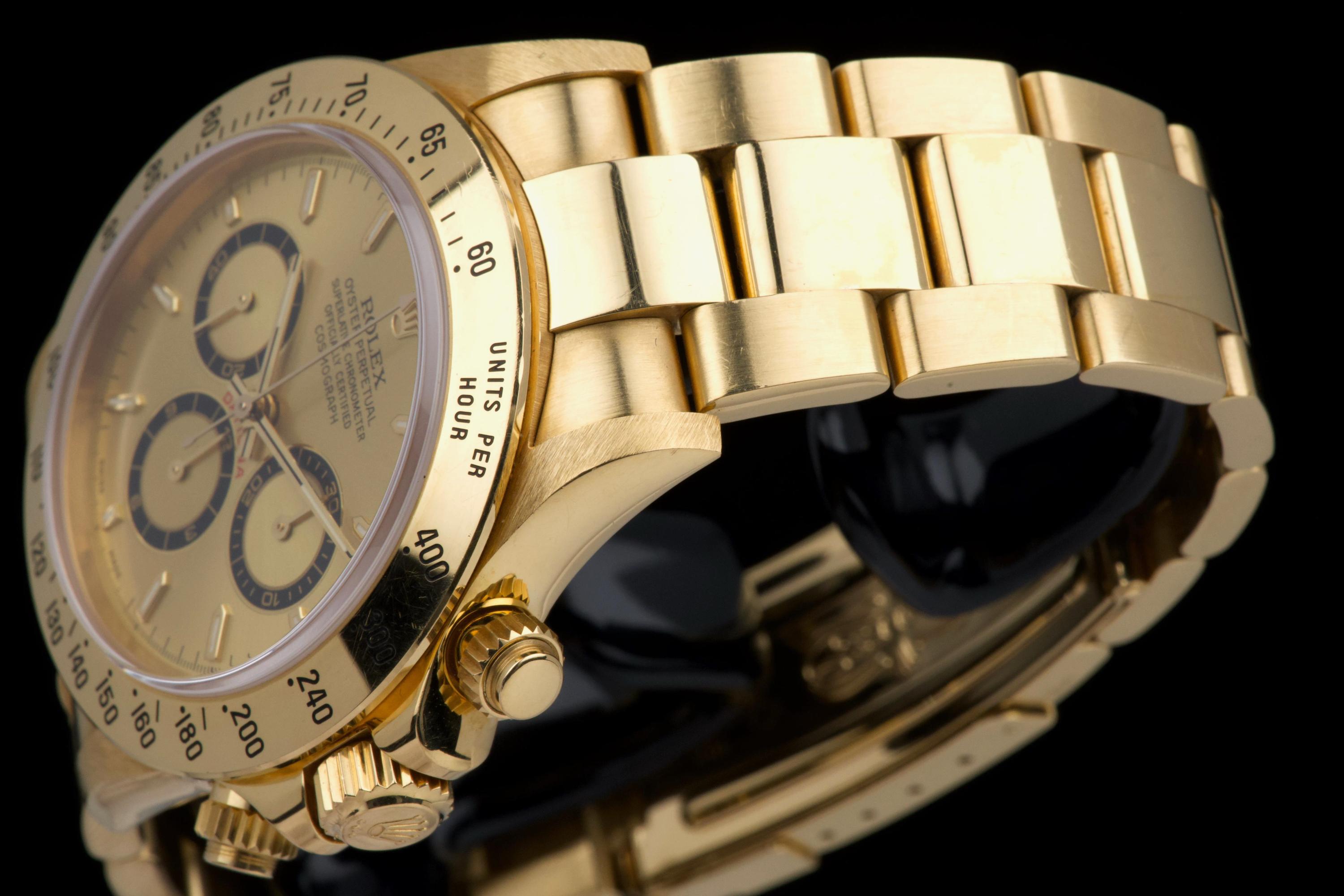 The present Rolex Cosmograph Daytona reference 16528, dating to 2000 and bearing an A-serial, is an exceptional and remarkably well-preserved example offered here as a complete full set. Executed in 18K yellow gold, this watch stands out for its outstanding originality and unpolished condition—attributes that are increasingly rare for Daytonas of this era. The case is unpolished and remains in superb overall condition, showing only minimal signs of wear consistent with careful use. Importantly, the original green Rolex sticker is still present on the caseback, a strong indicator of the watch’s preservation. The bezel is likewise in excellent condition and has never been polished, retaining crisp definition and sharp edges. The watch is fitted with its original champagne luminova dial, preserved in excellent condition, and paired with matching original hands. The harmonious tone of the dial and hands, combined with the warmth of the yellow-gold case, gives the watch a particularly elegant and cohesive appearance. At its heart beats the celebrated Rolex calibre 4030, based on the legendary Zenith El Primero chronograph movement—one of the most respected automatic chronograph calibres ever produced, extensively reworked by Rolex to meet its own exacting standards. The original yellow-gold Oyster bracelet shows no stretch whatsoever, an outstanding and highly desirable feature. The clasp bears the correct code U11, consistent with the production period. While no service history accompanies the watch, it is running correctly at the time of cataloguing. Delivered as a full set, this unpolished Daytona 16528 represents a rare opportunity to acquire a late-production El Primero-powered Daytona in exceptional, near-time-capsule condition, combining strong originality, minimal wear, and complete accessories—an ideal example for the discerning collector.
