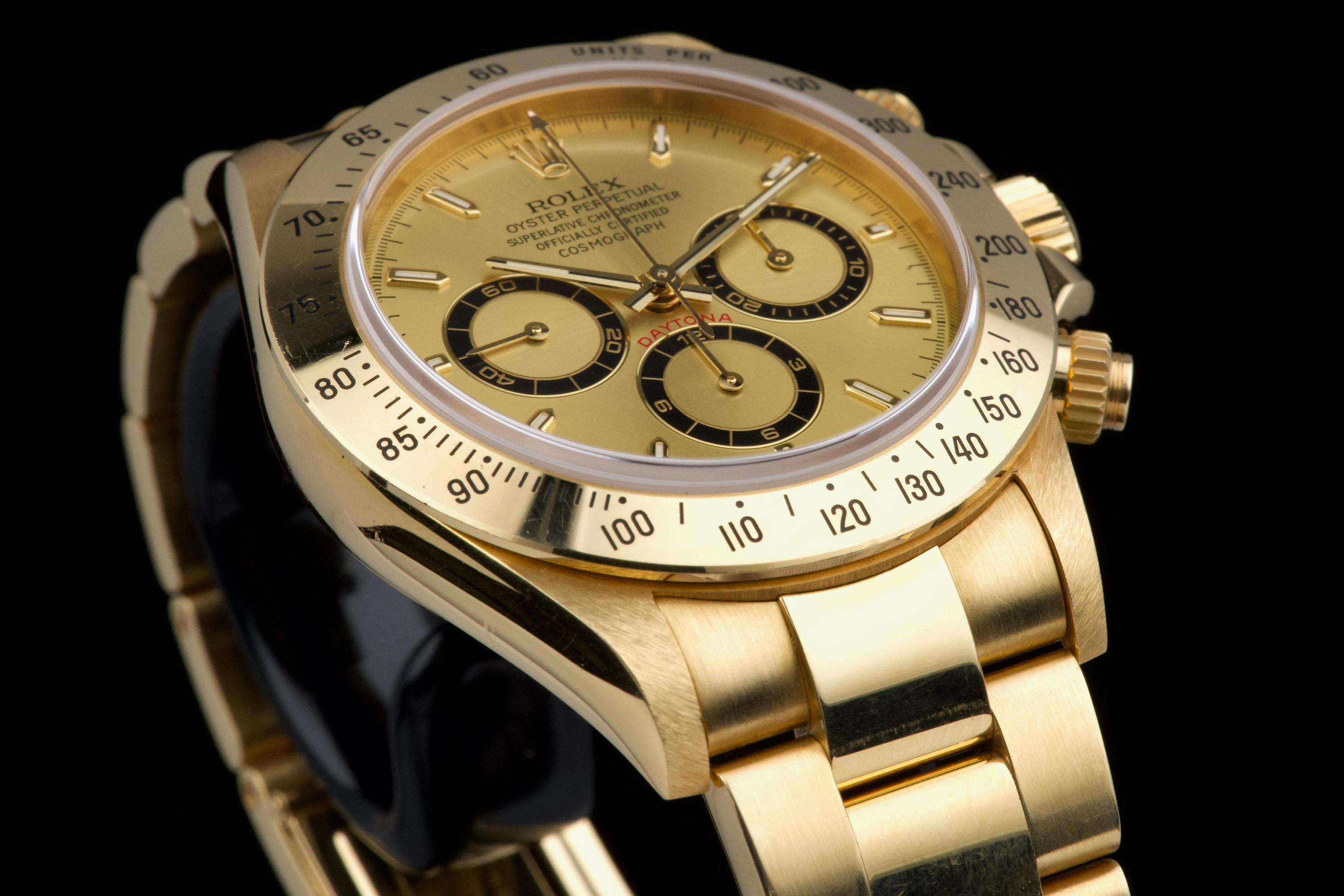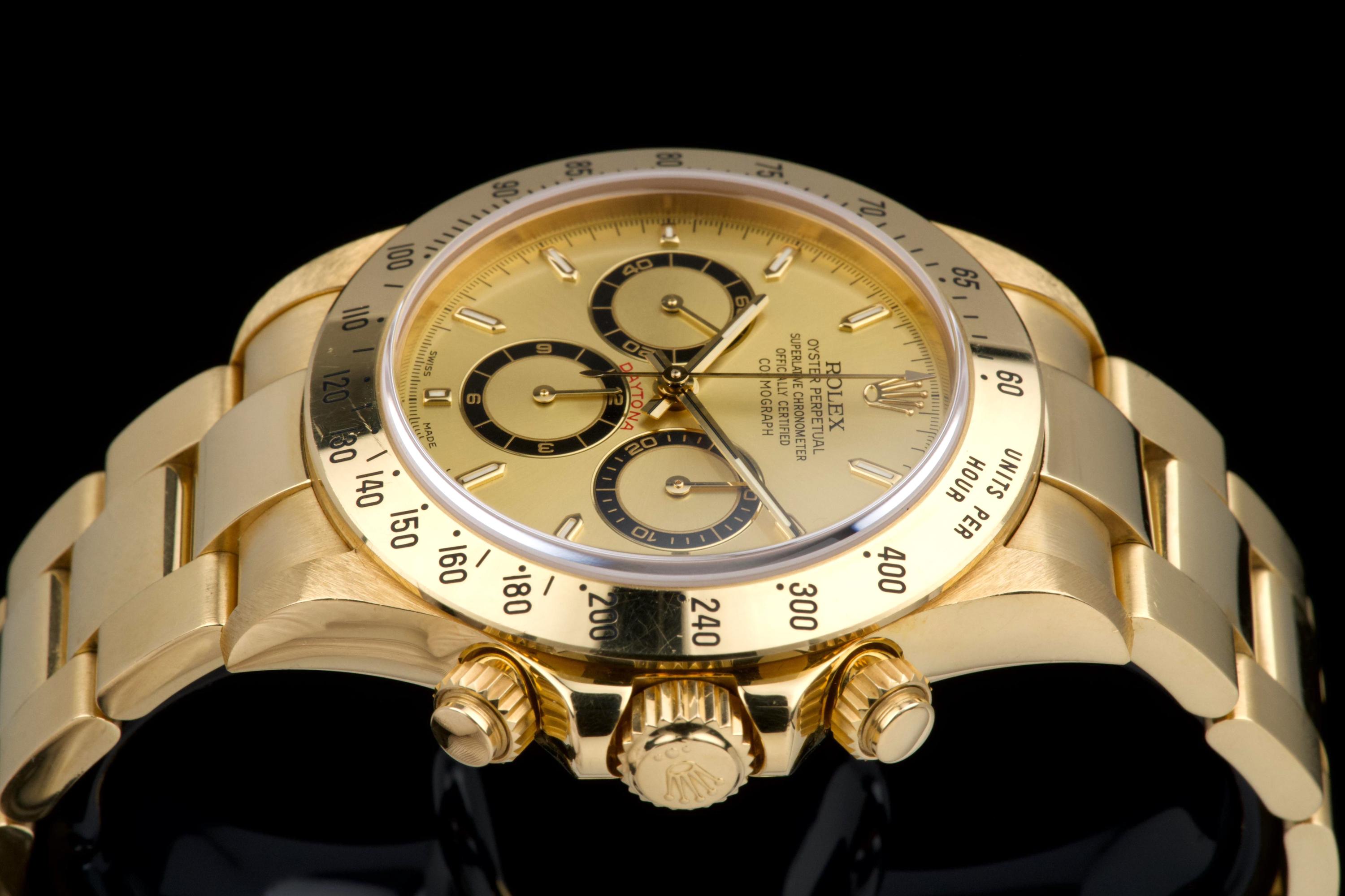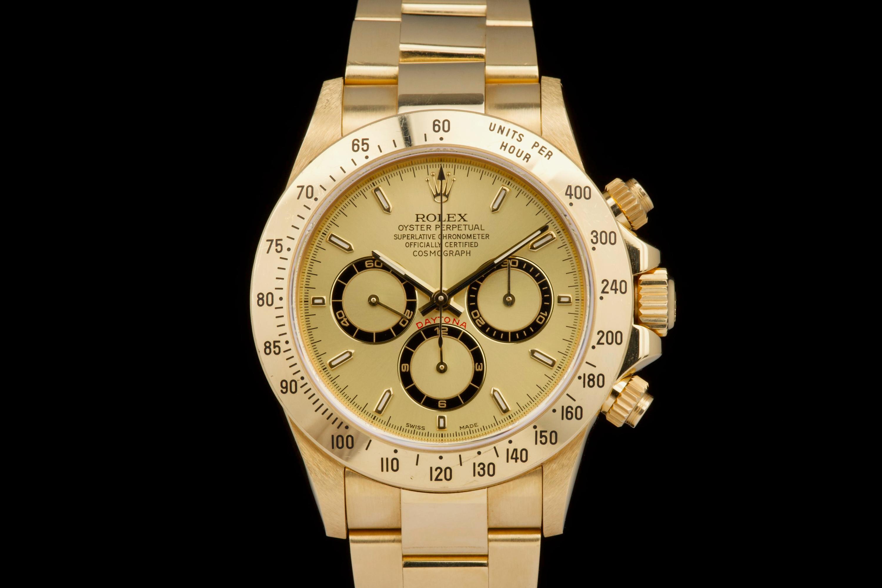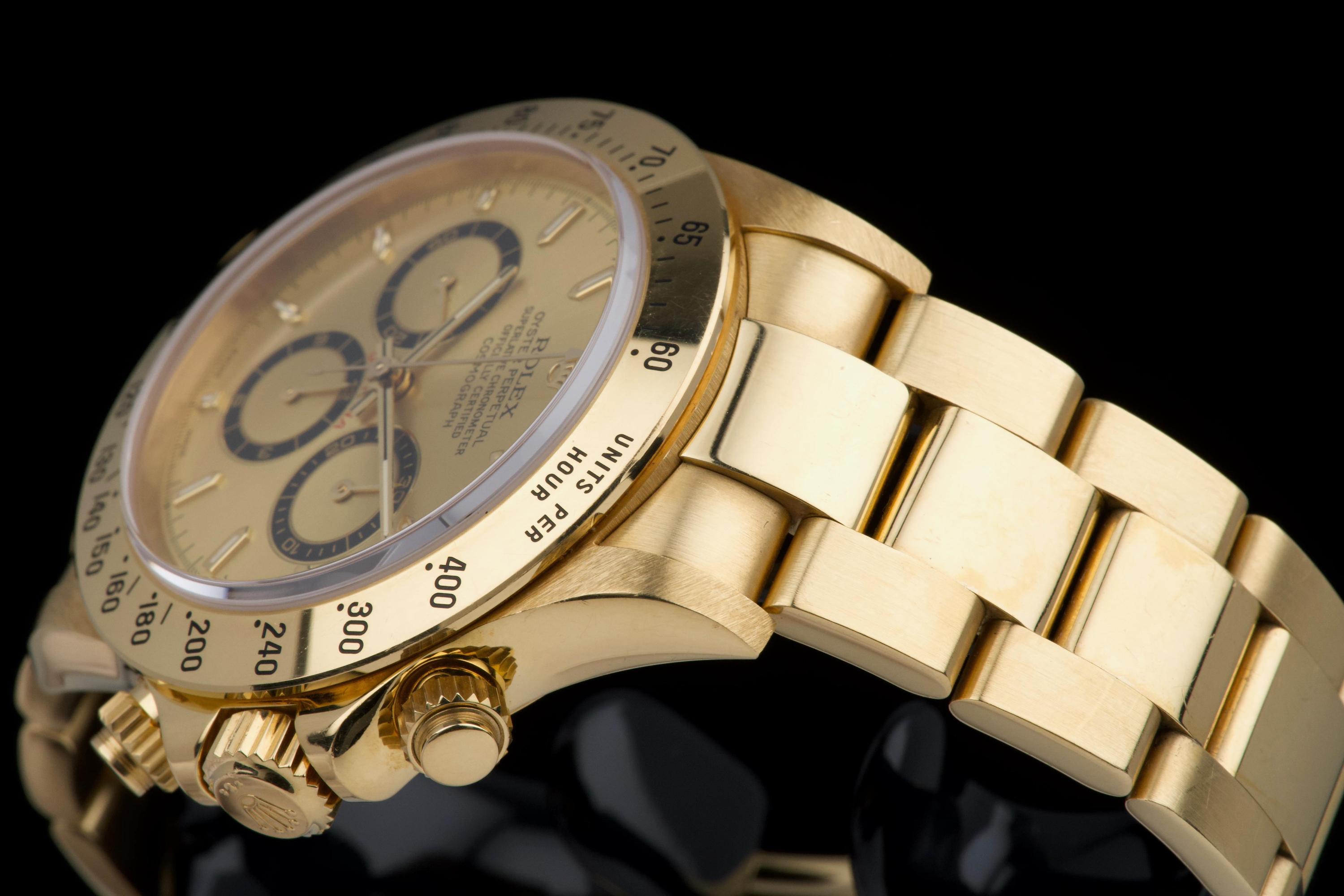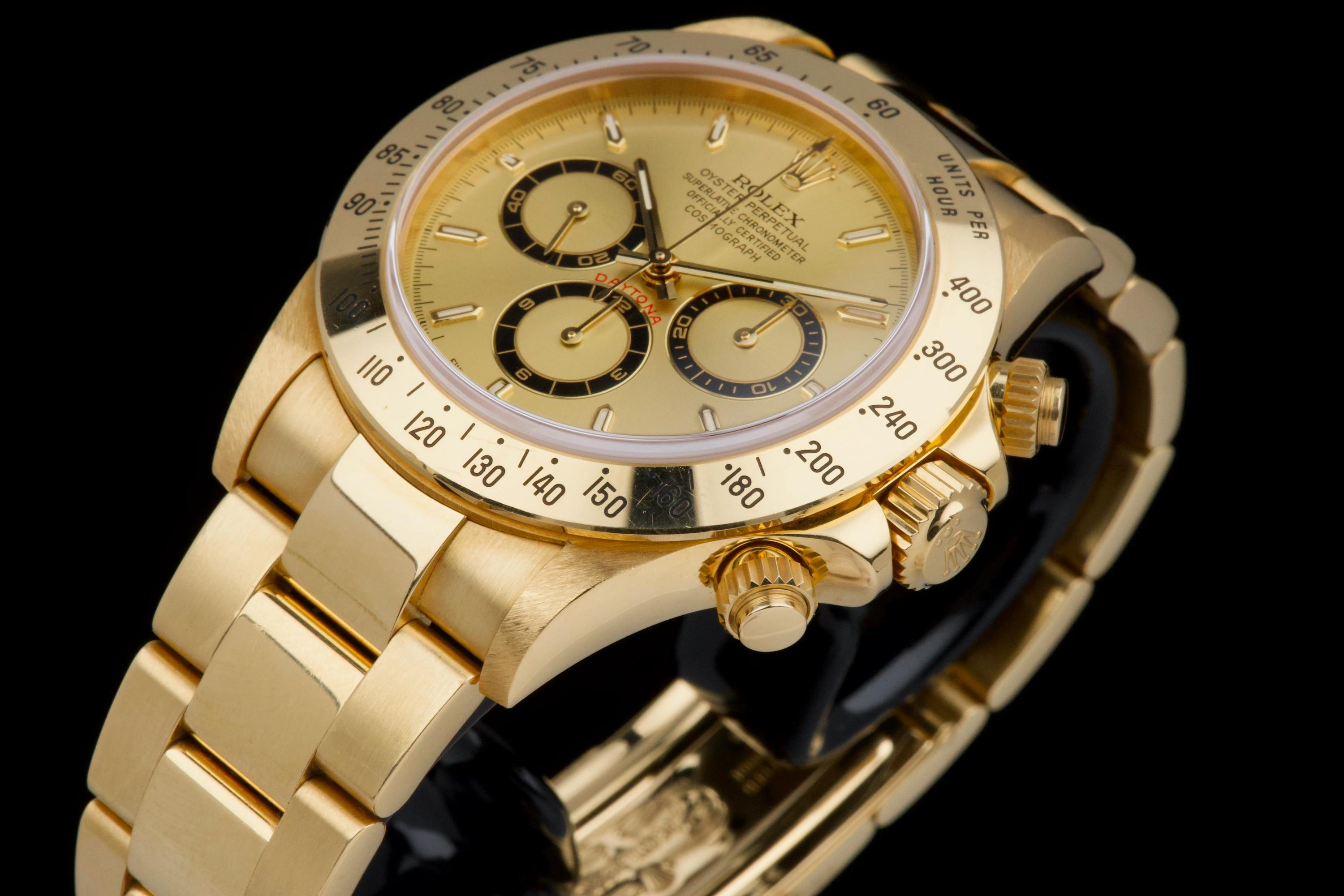 The present Rolex Cosmograph Daytona reference 16528, dating to 2000 and bearing an A-serial, is an exceptional and remarkably well-preserved example offered here as a complete full set. Executed in 18K yellow gold, this watch stands out for its outstanding originality and unpolished condition—attributes that are increasingly rare for Daytonas of this era. The case is unpolished and remains in superb overall condition, showing only minimal signs of wear consistent with careful use. Importantly, the original green Rolex sticker is still present on the caseback, a strong indicator of the watch’s preservation. The bezel is likewise in excellent condition and has never been polished, retaining crisp definition and sharp edges. The watch is fitted with its original champagne luminova dial, preserved in excellent condition, and paired with matching original hands. The harmonious tone of the dial and hands, combined with the warmth of the yellow-gold case, gives the watch a particularly elegant and cohesive appearance. At its heart beats the celebrated Rolex calibre 4030, based on the legendary Zenith El Primero chronograph movement—one of the most respected automatic chronograph calibres ever produced, extensively reworked by Rolex to meet its own exacting standards. The original yellow-gold Oyster bracelet shows no stretch whatsoever, an outstanding and highly desirable feature. The clasp bears the correct code U11, consistent with the production period. While no service history accompanies the watch, it is running correctly at the time of cataloguing. Delivered as a full set, this unpolished Daytona 16528 represents a rare opportunity to acquire a late-production El Primero-powered Daytona in exceptional, near-time-capsule condition, combining strong originality, minimal wear, and complete accessories—an ideal example for the discerning collector.